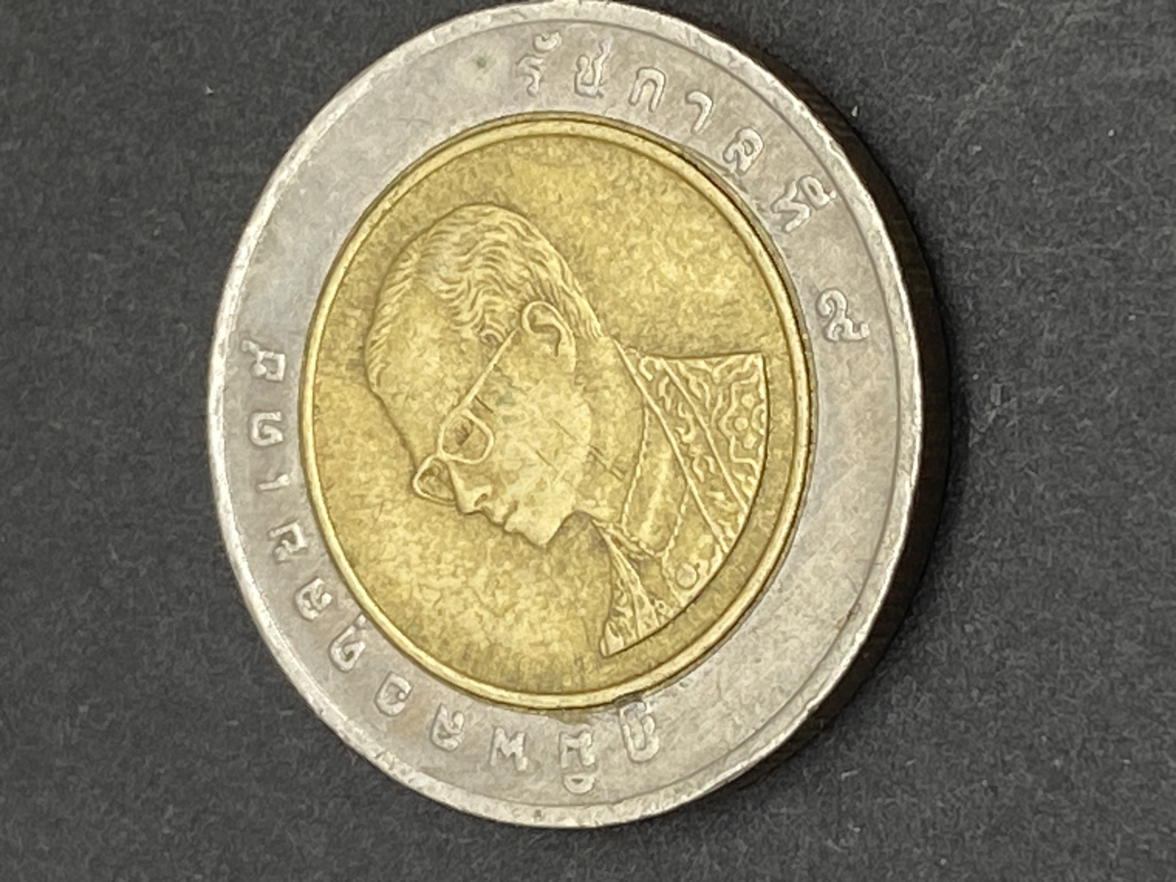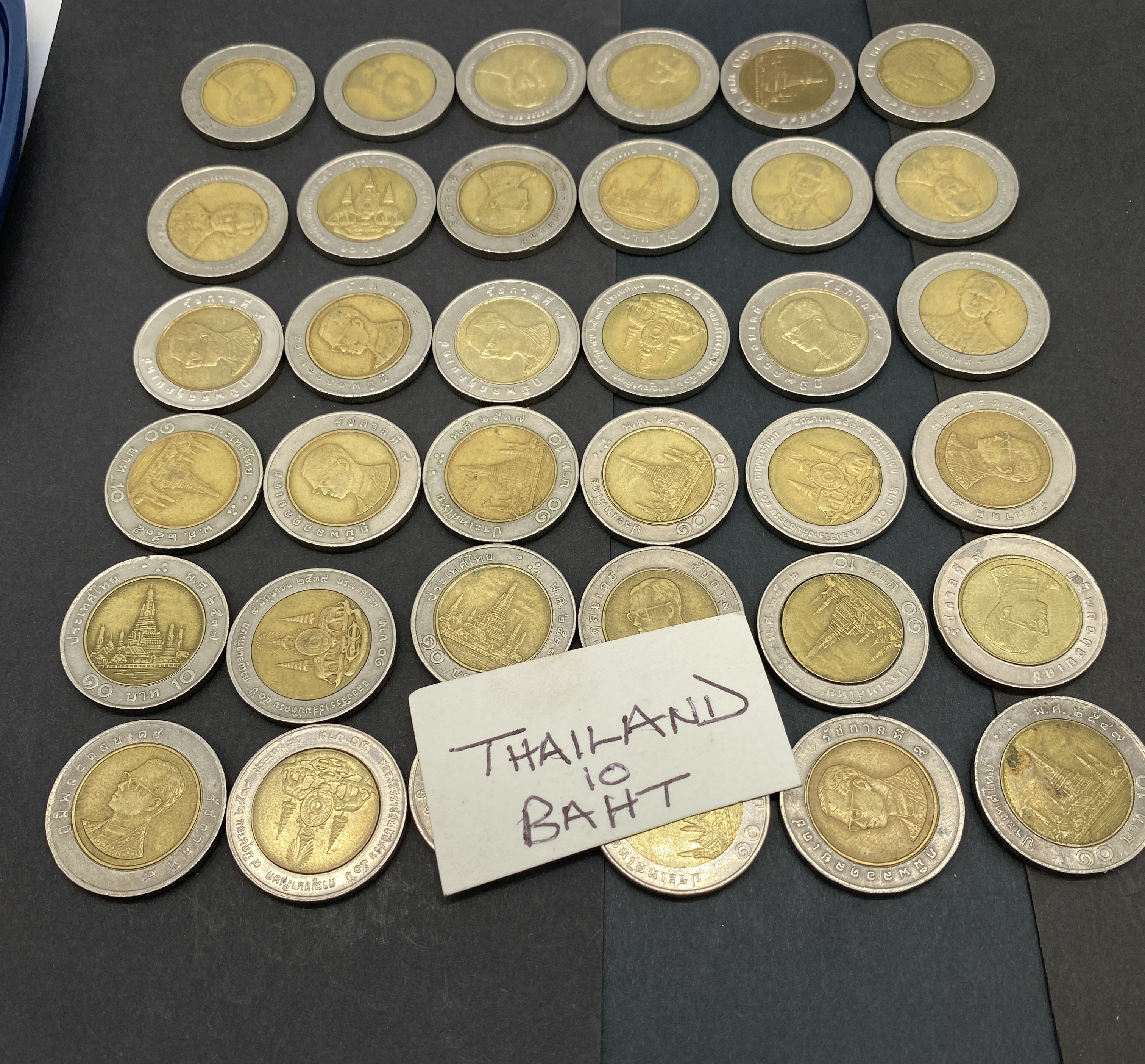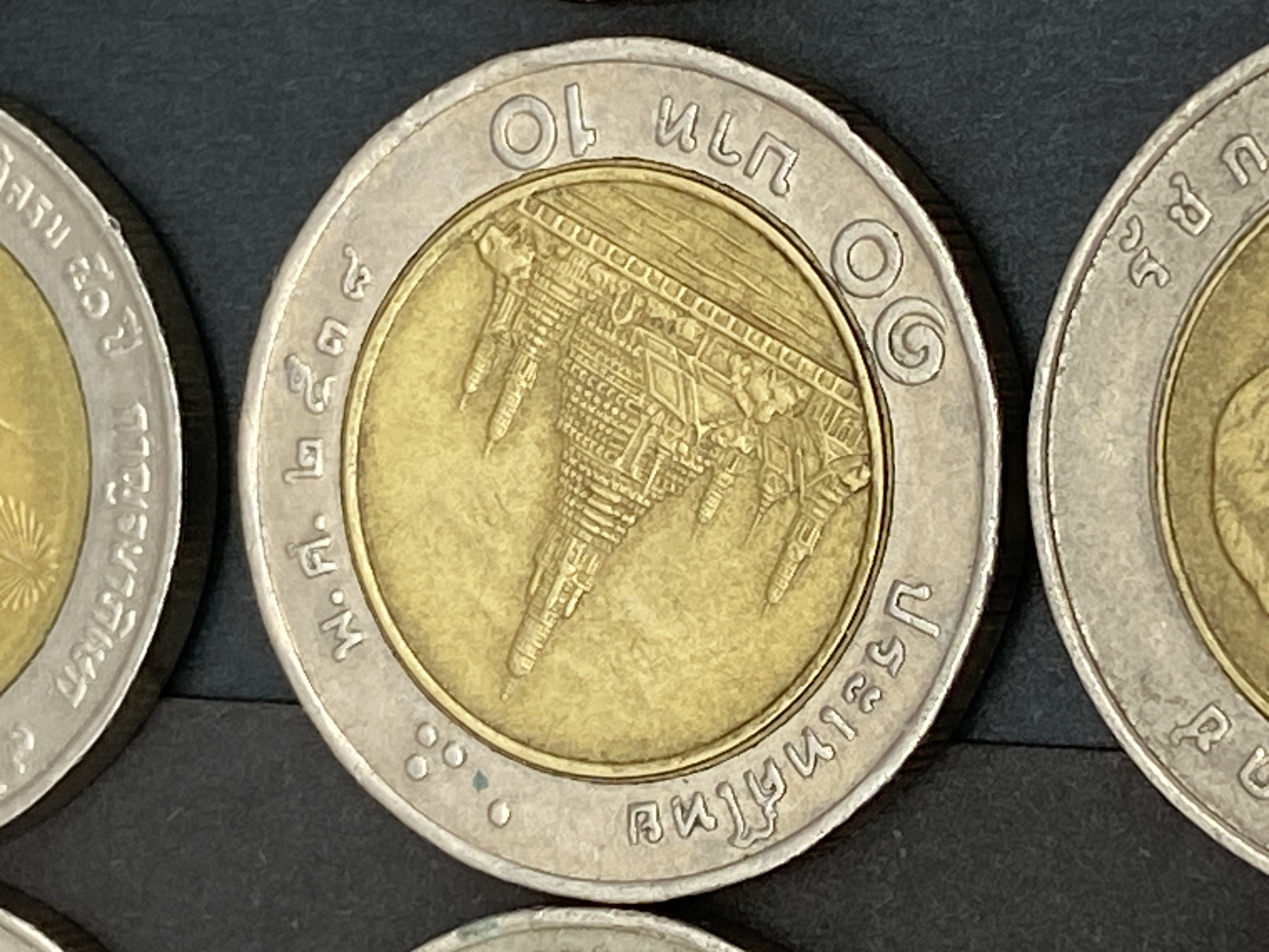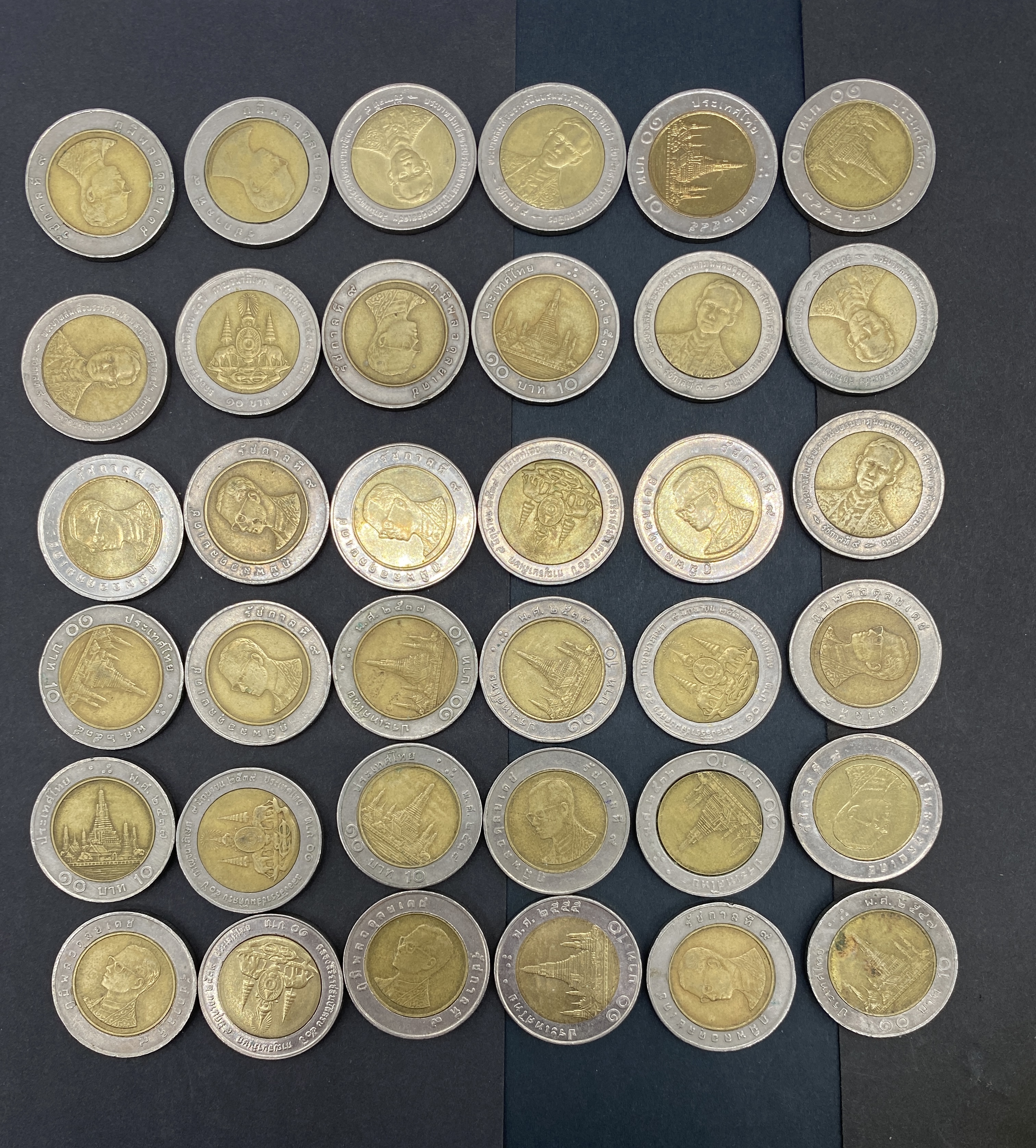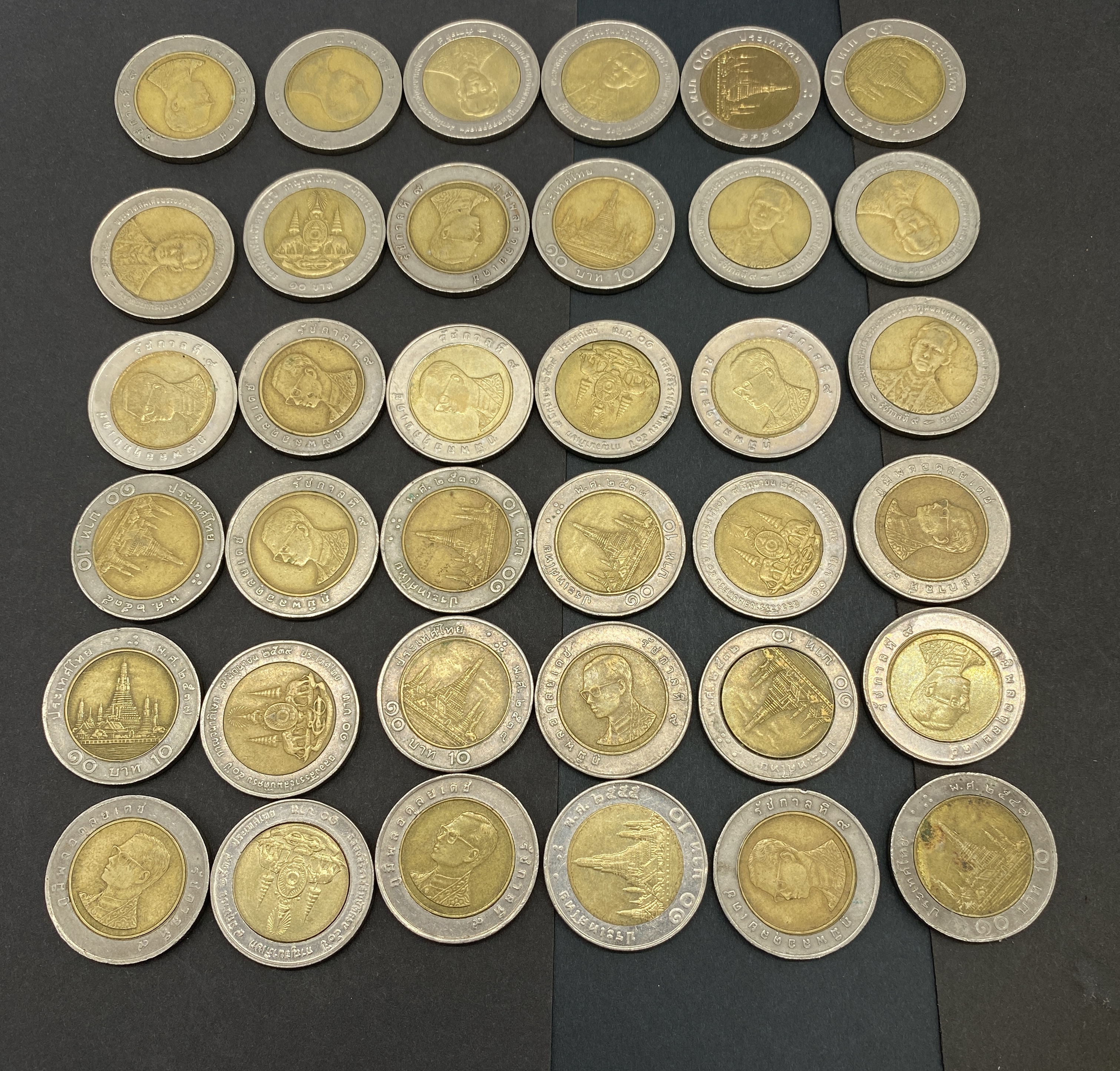 A collection of Thai 10 baht bimetallic coins featuring various designs.