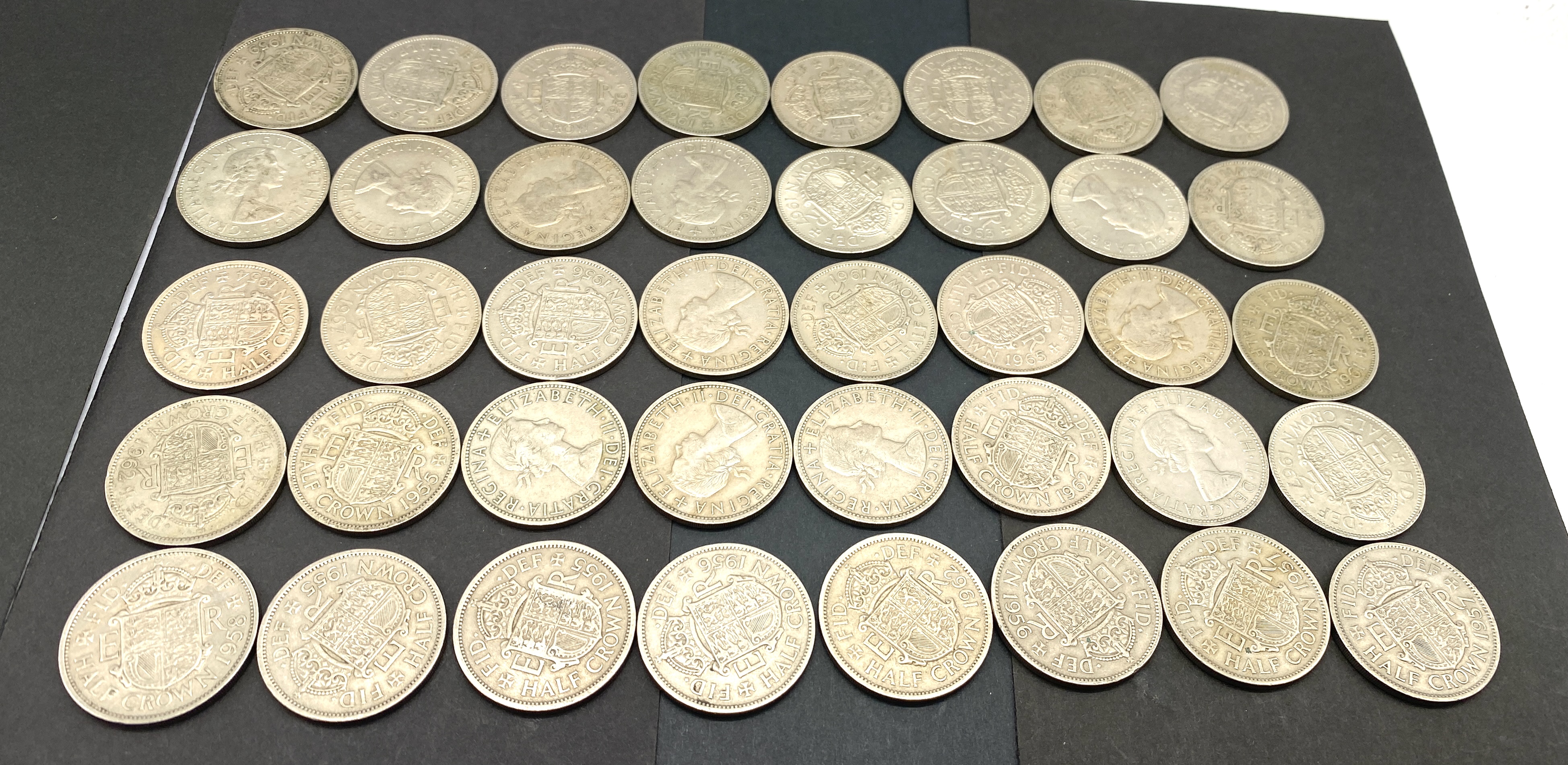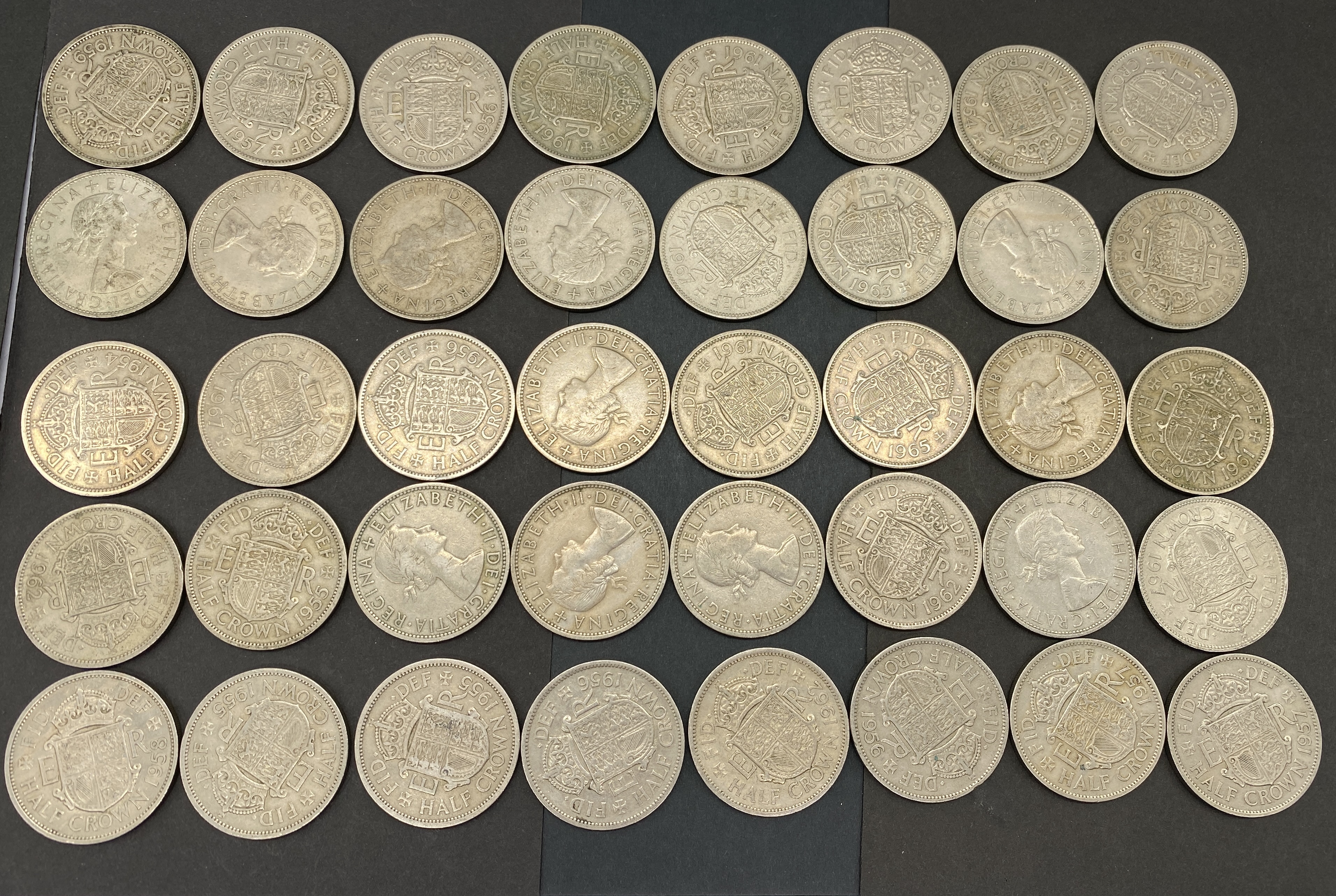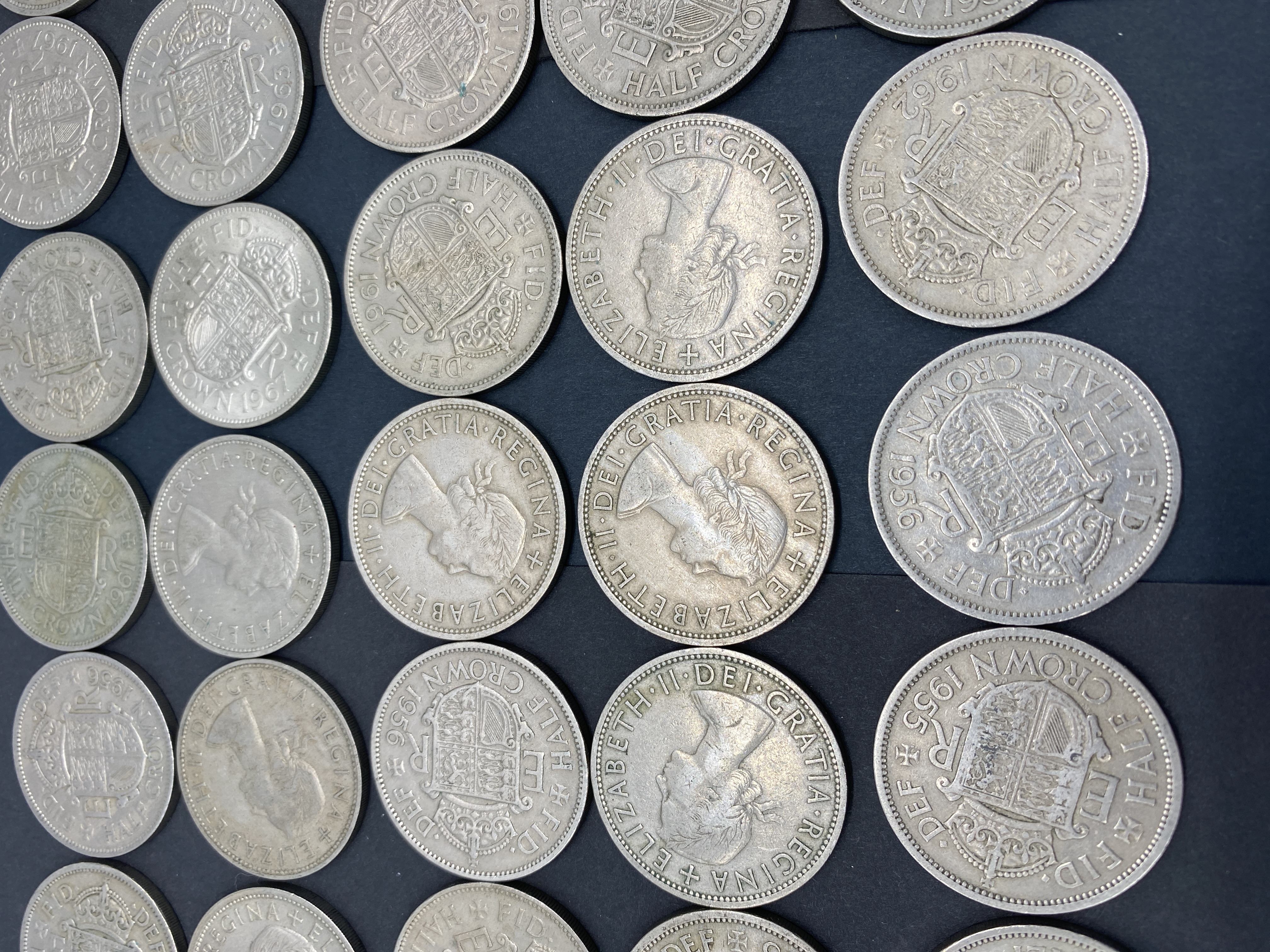 A collection of British half-crown coins featuring Queen Elizabeth II.