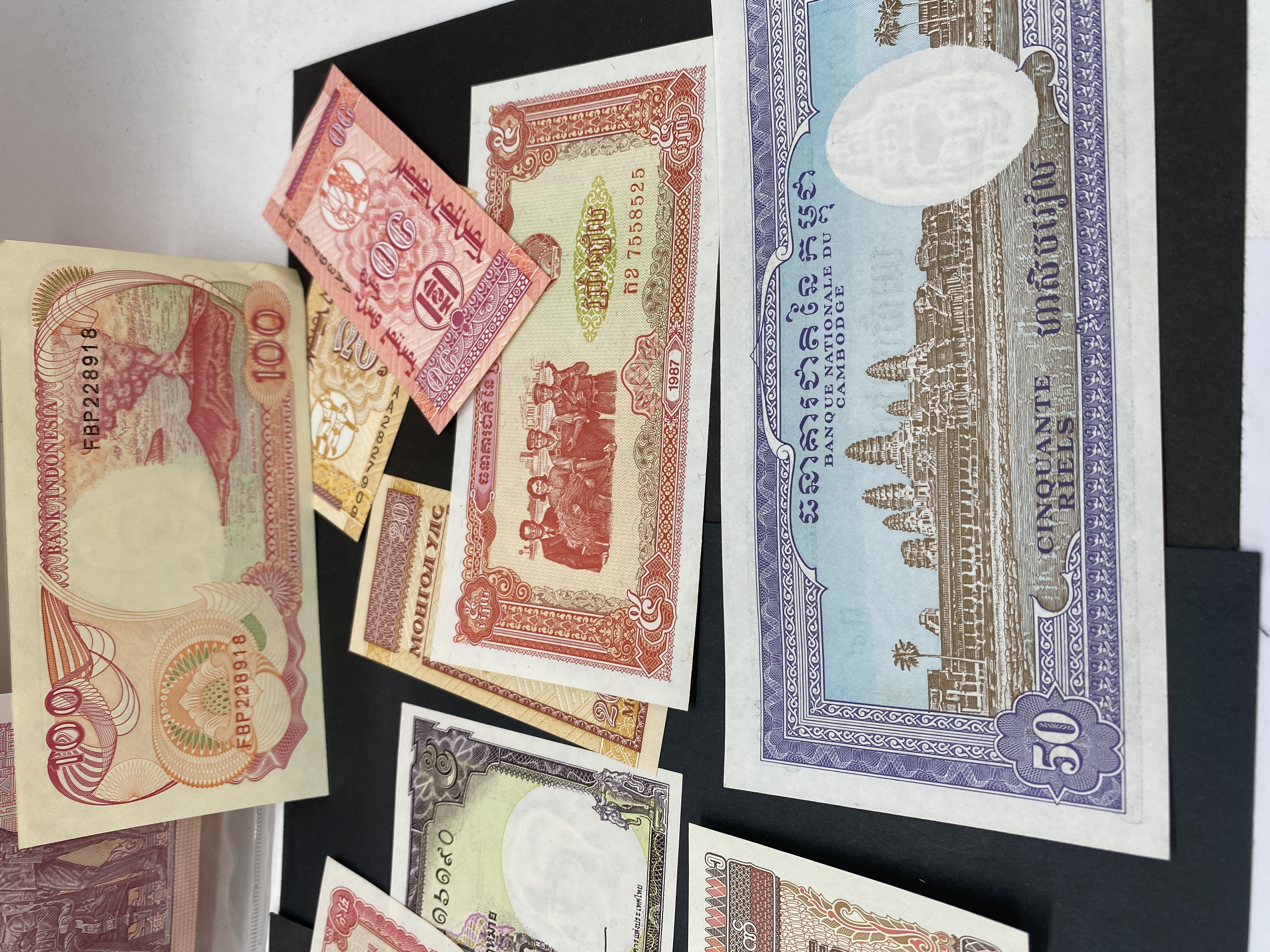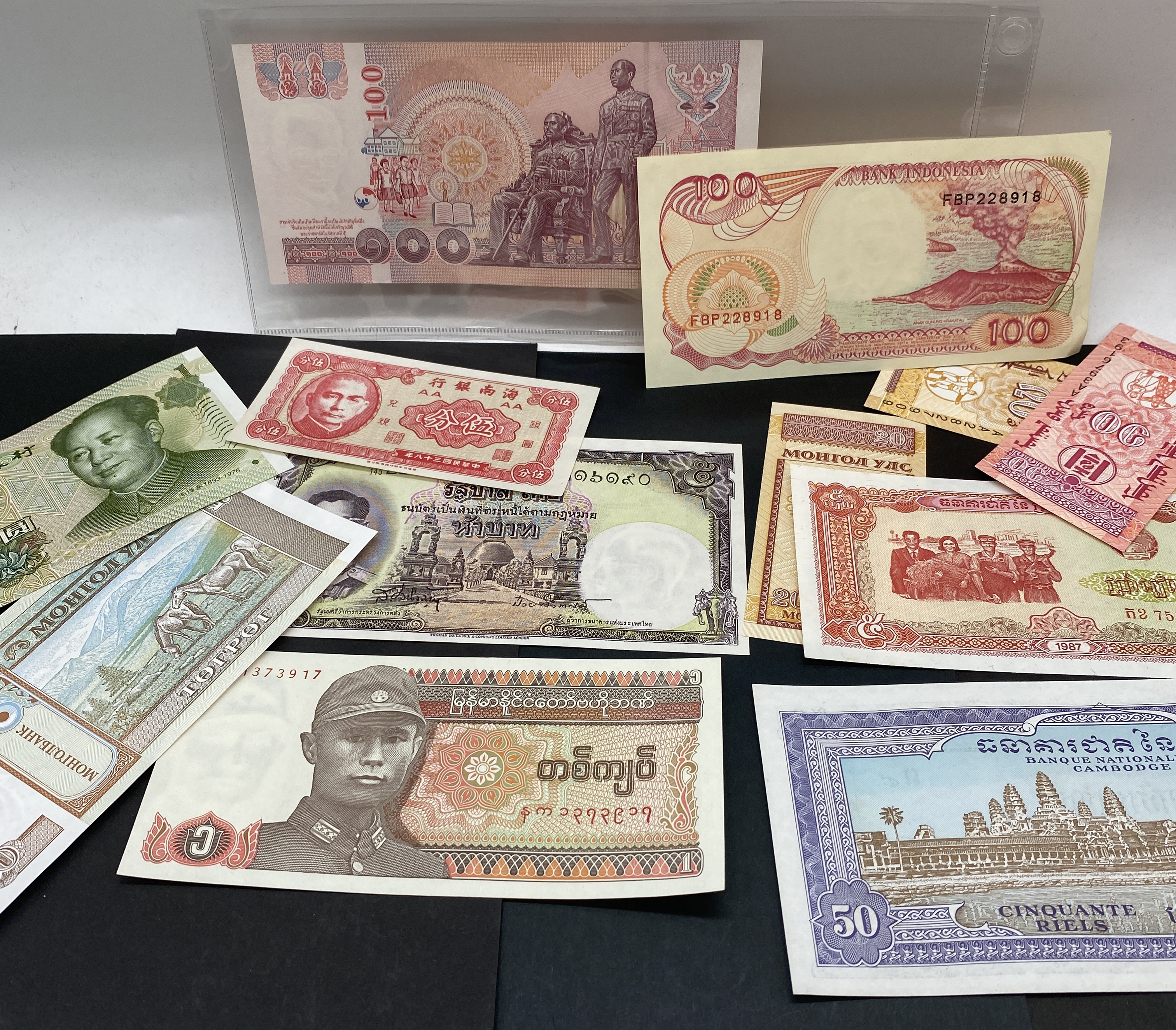 A collection of various banknotes, including those from Myanmar (Burma), and other countries.