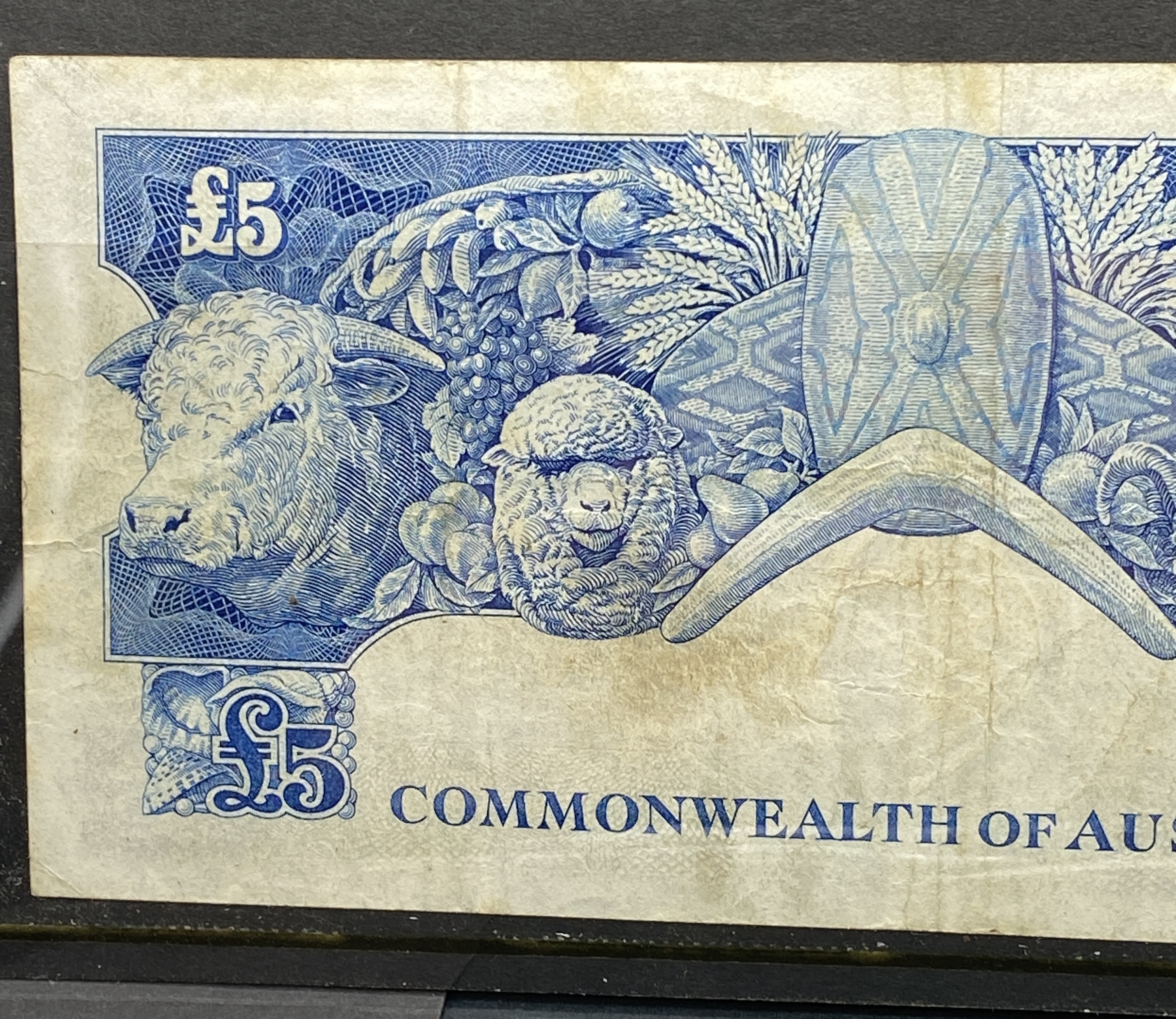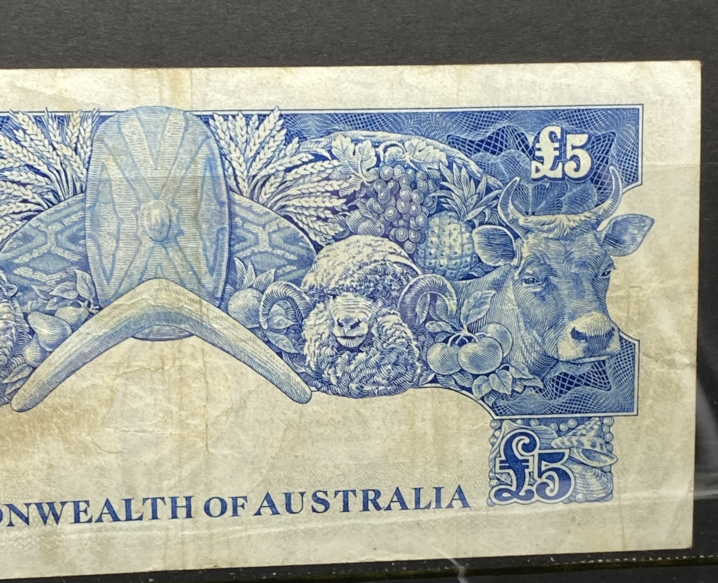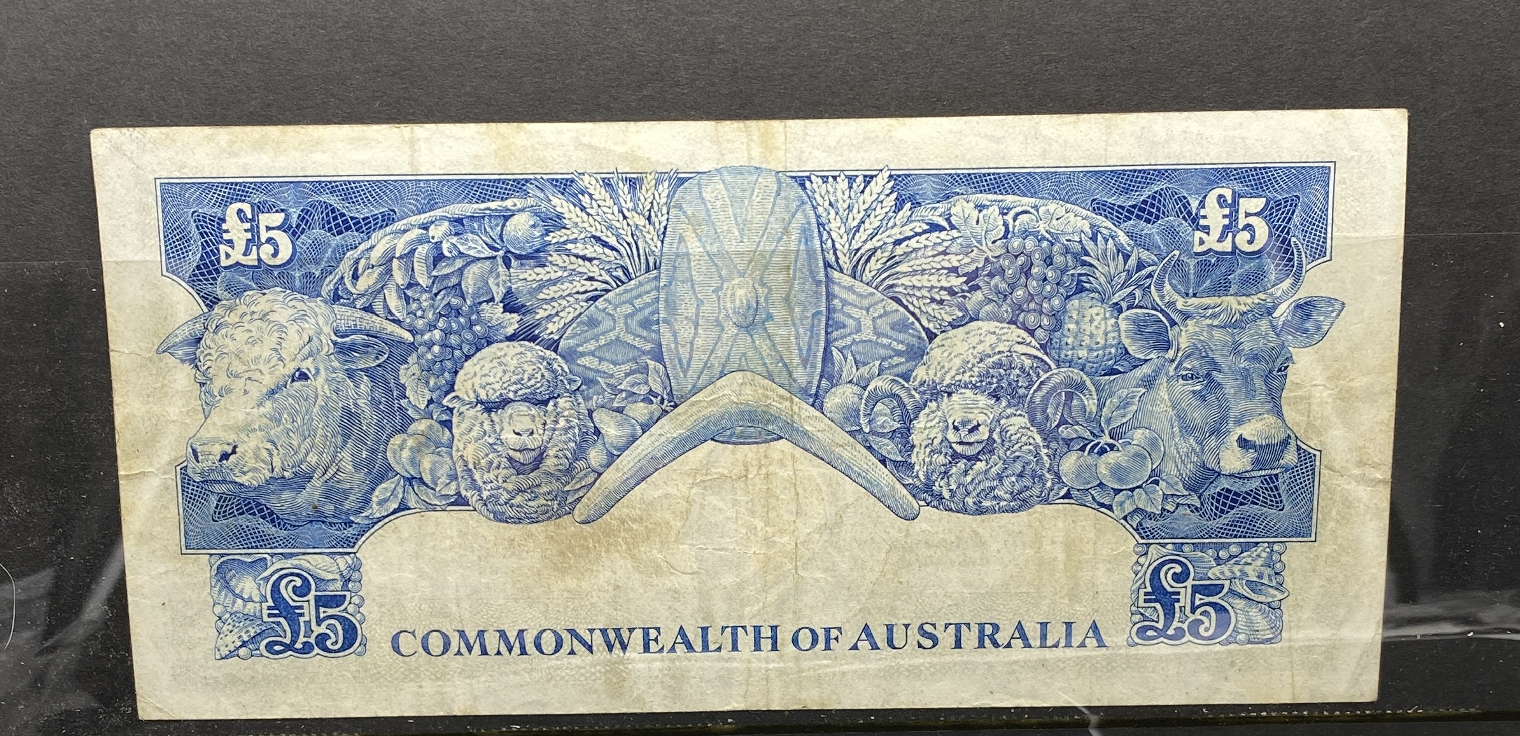 Australian five-pound banknote from 1960-1965, featuring a portrait and agricultural imagery.