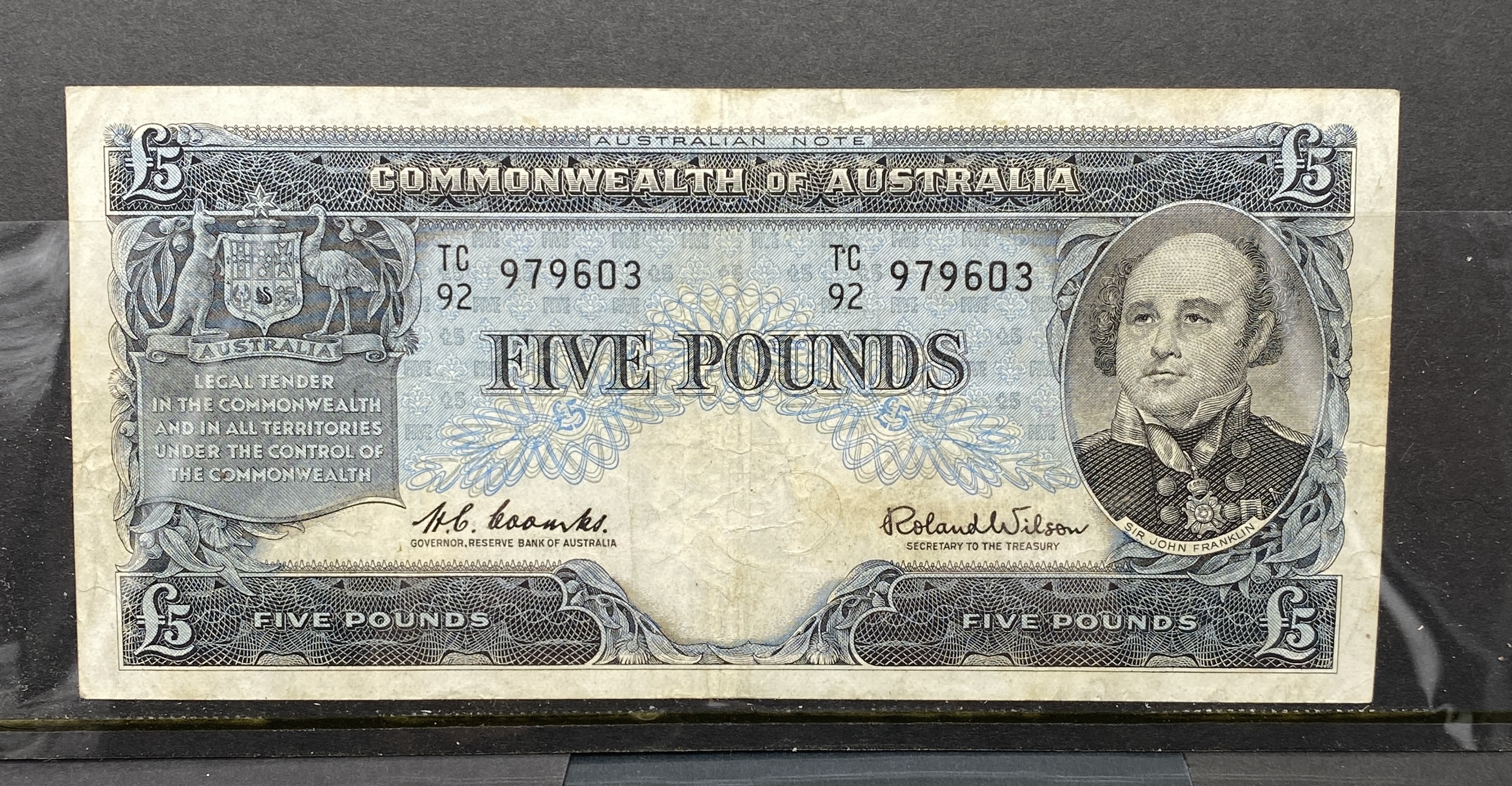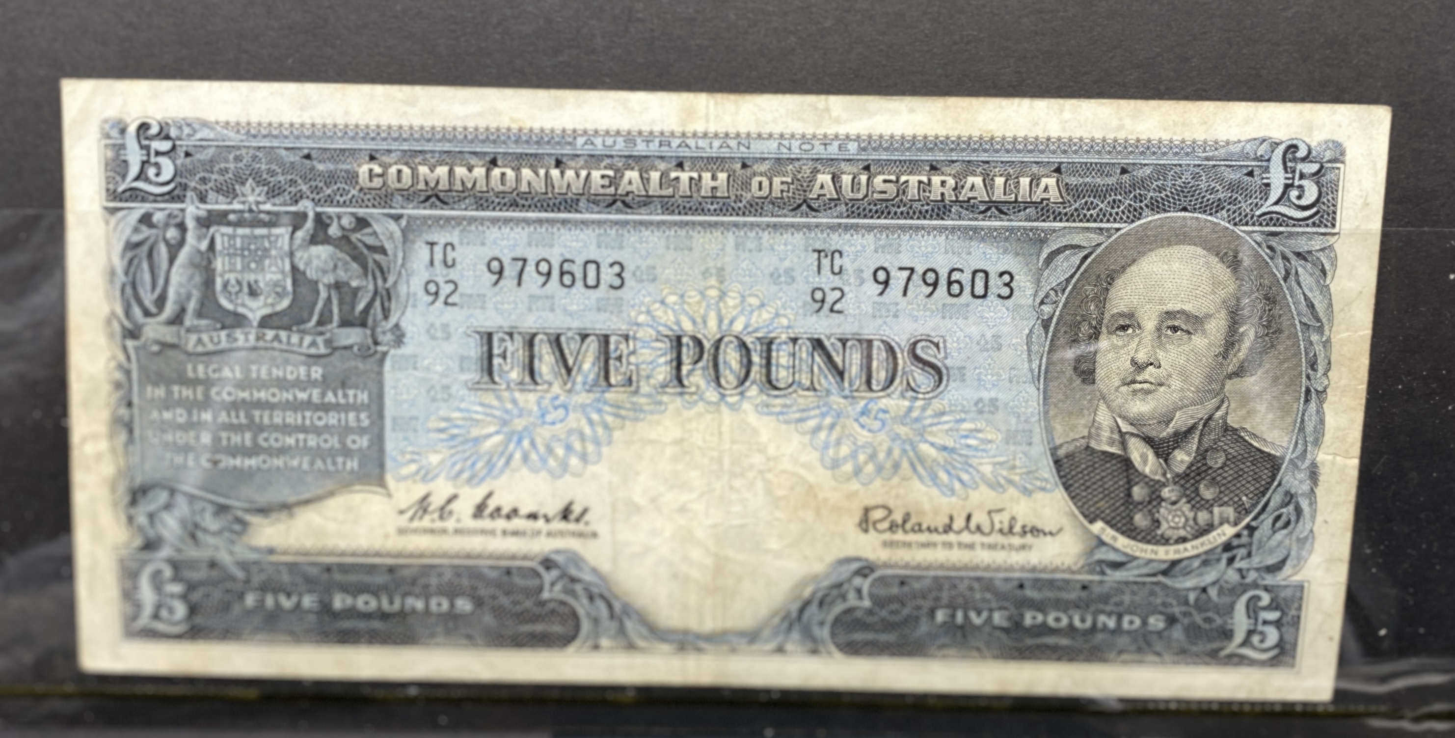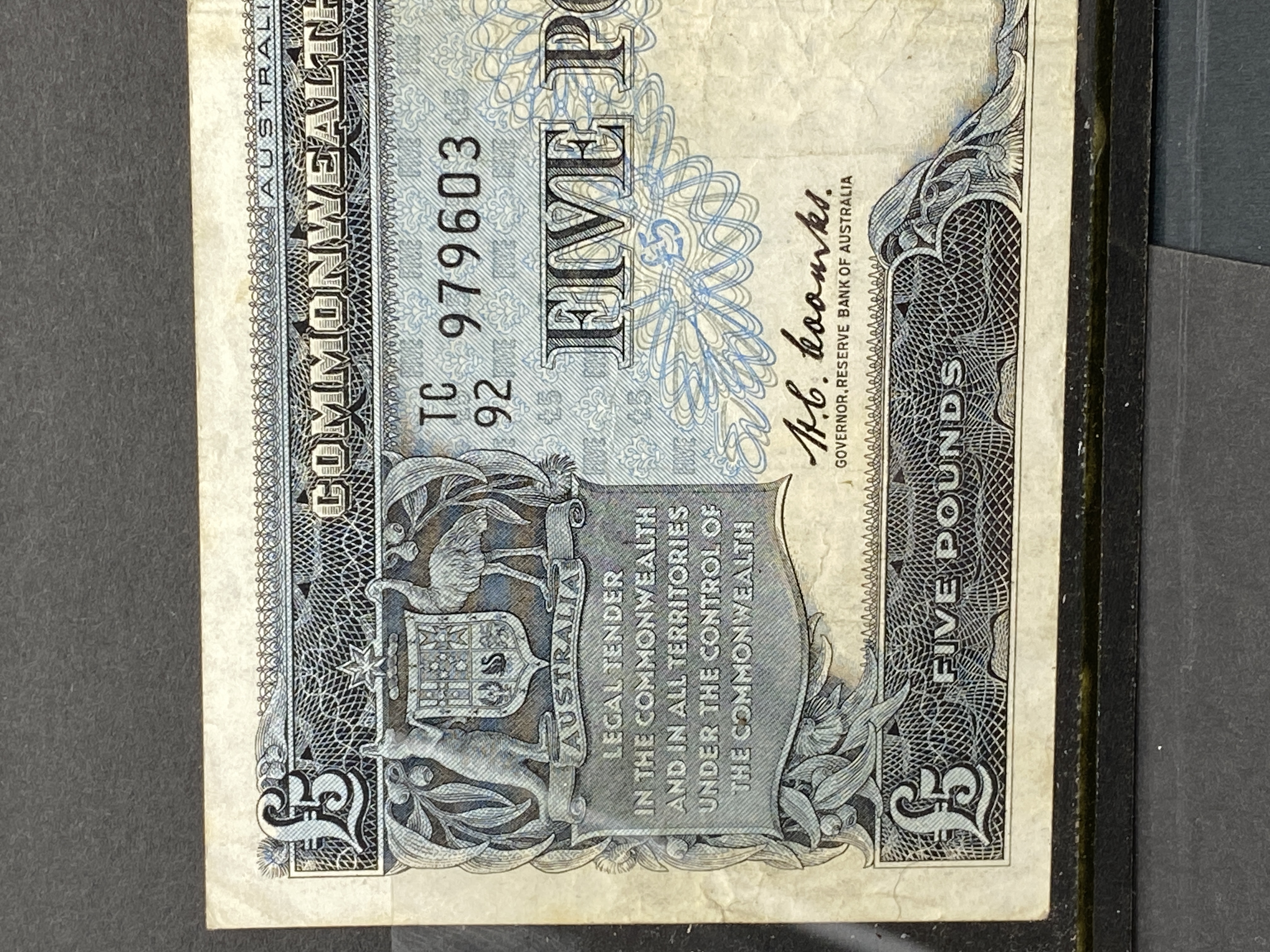 Australian five-pound banknote from 1960-1965, featuring a portrait and agricultural imagery.