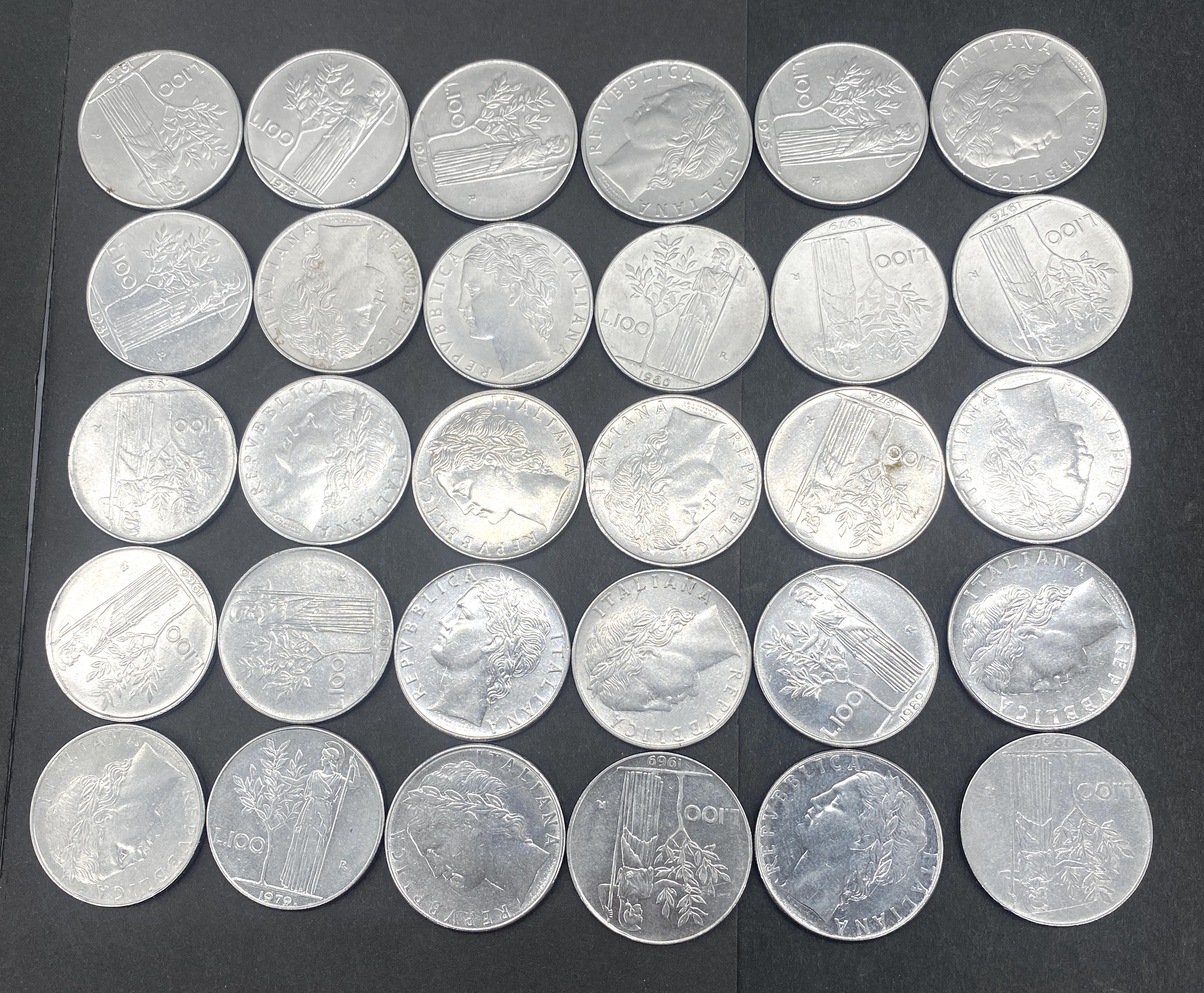A collection of twenty-four silver-colored Italian 100 Lire coins.