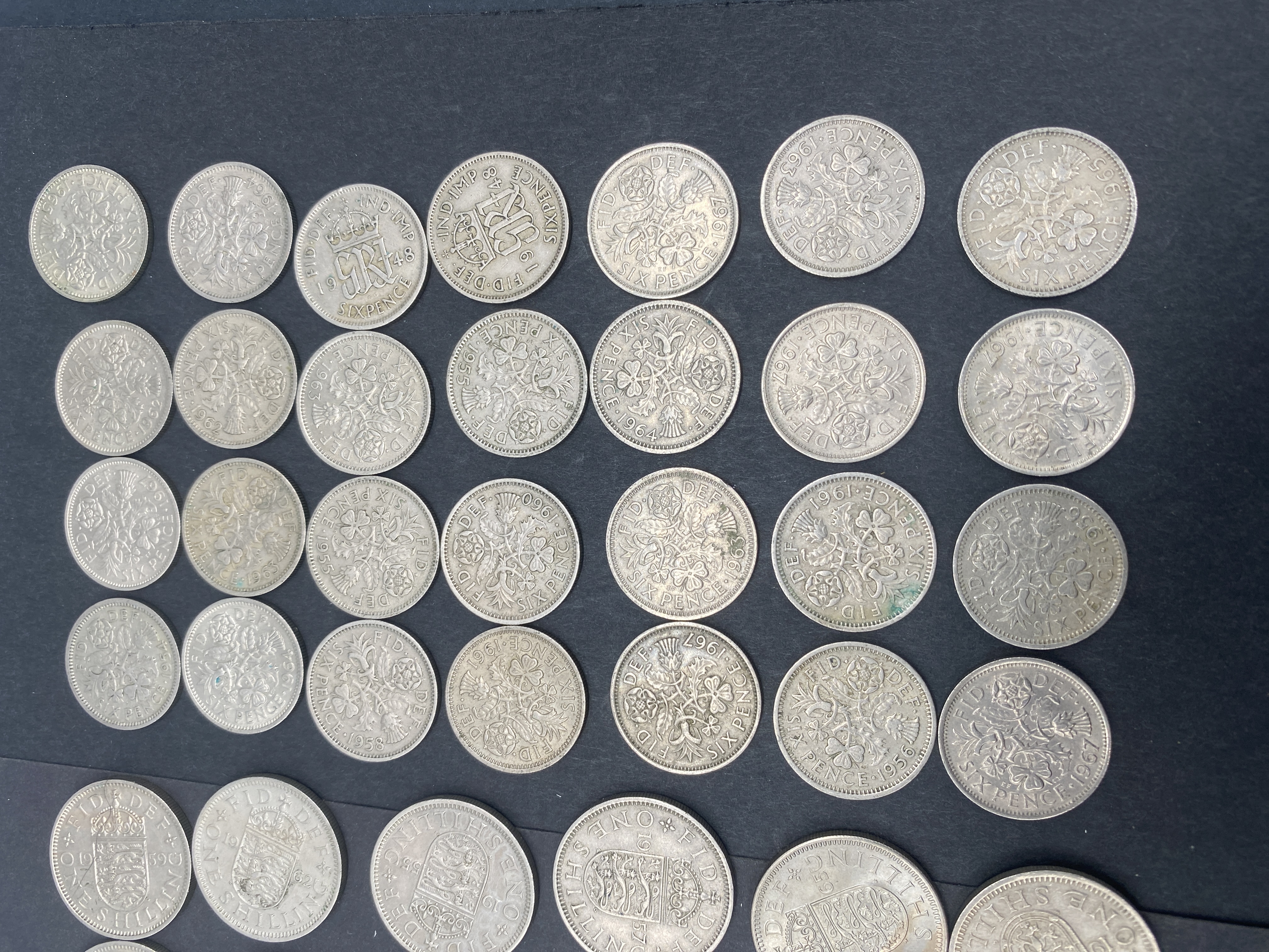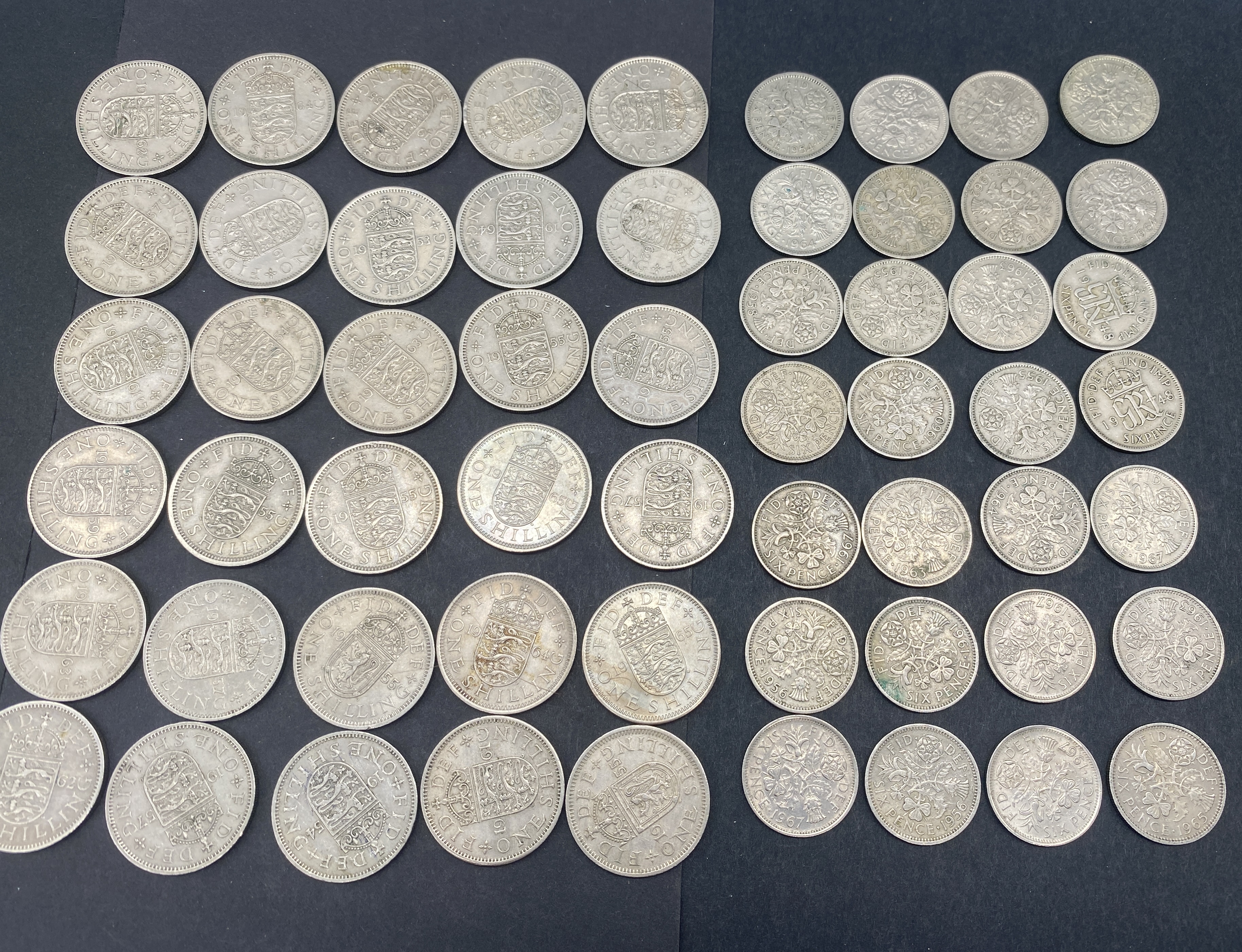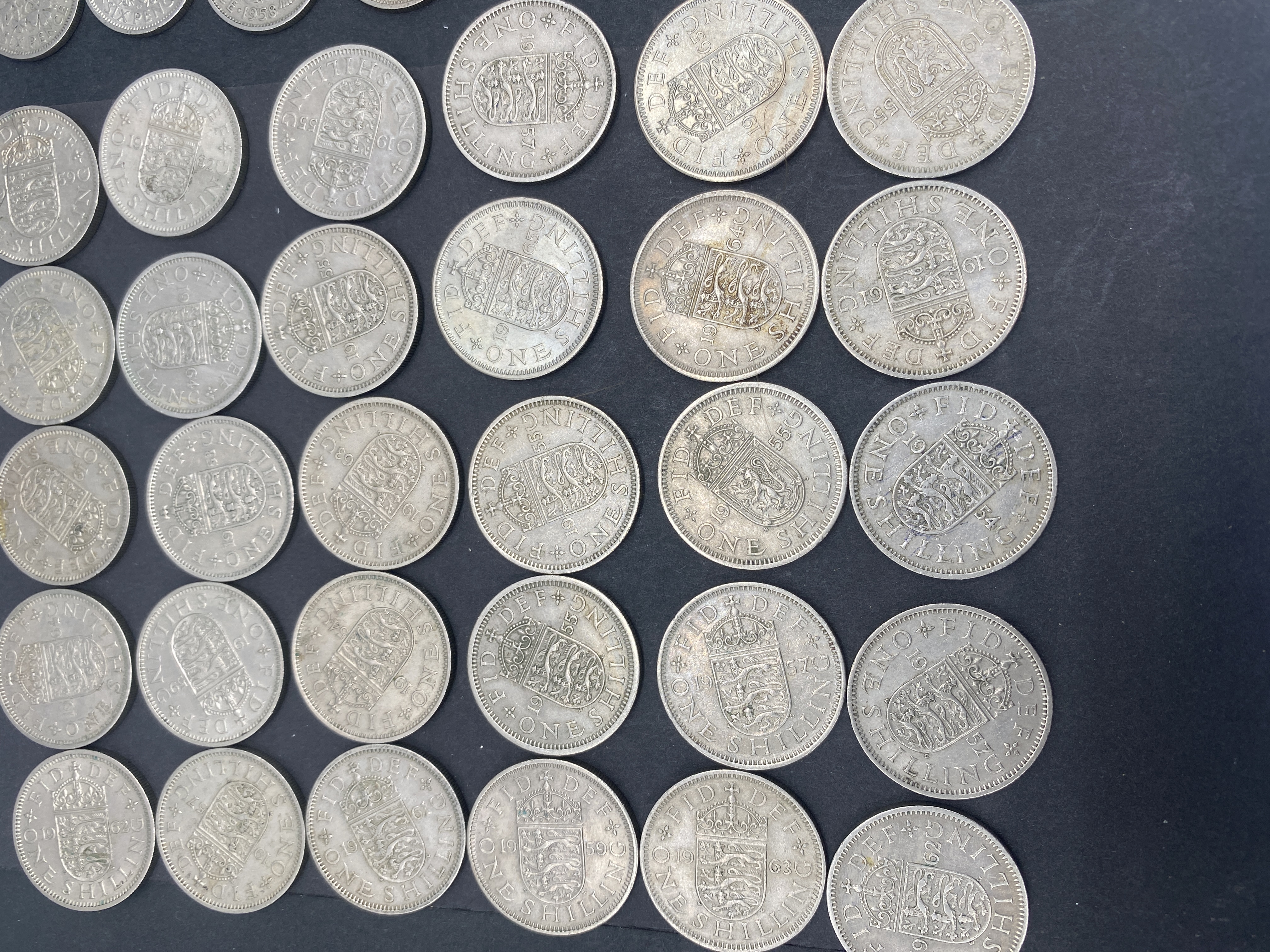 A collection of British one-shilling coins.
