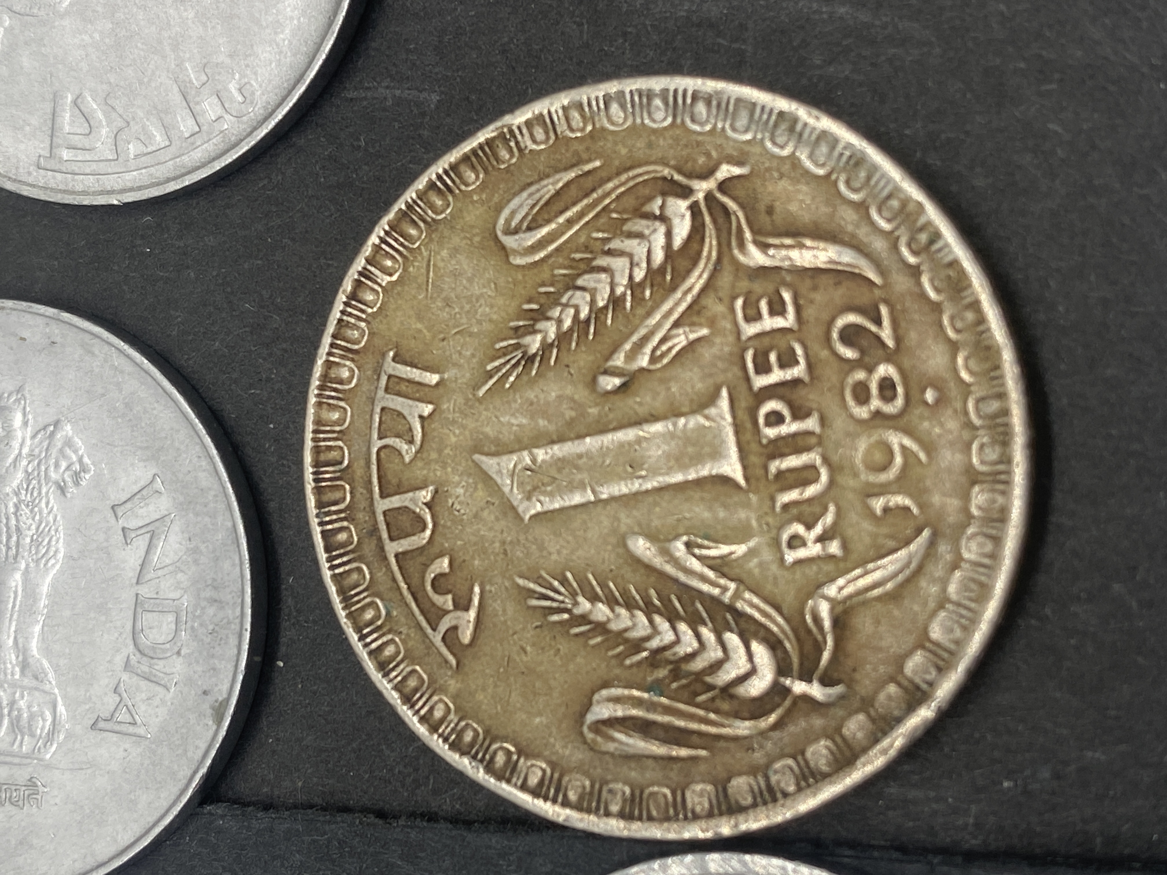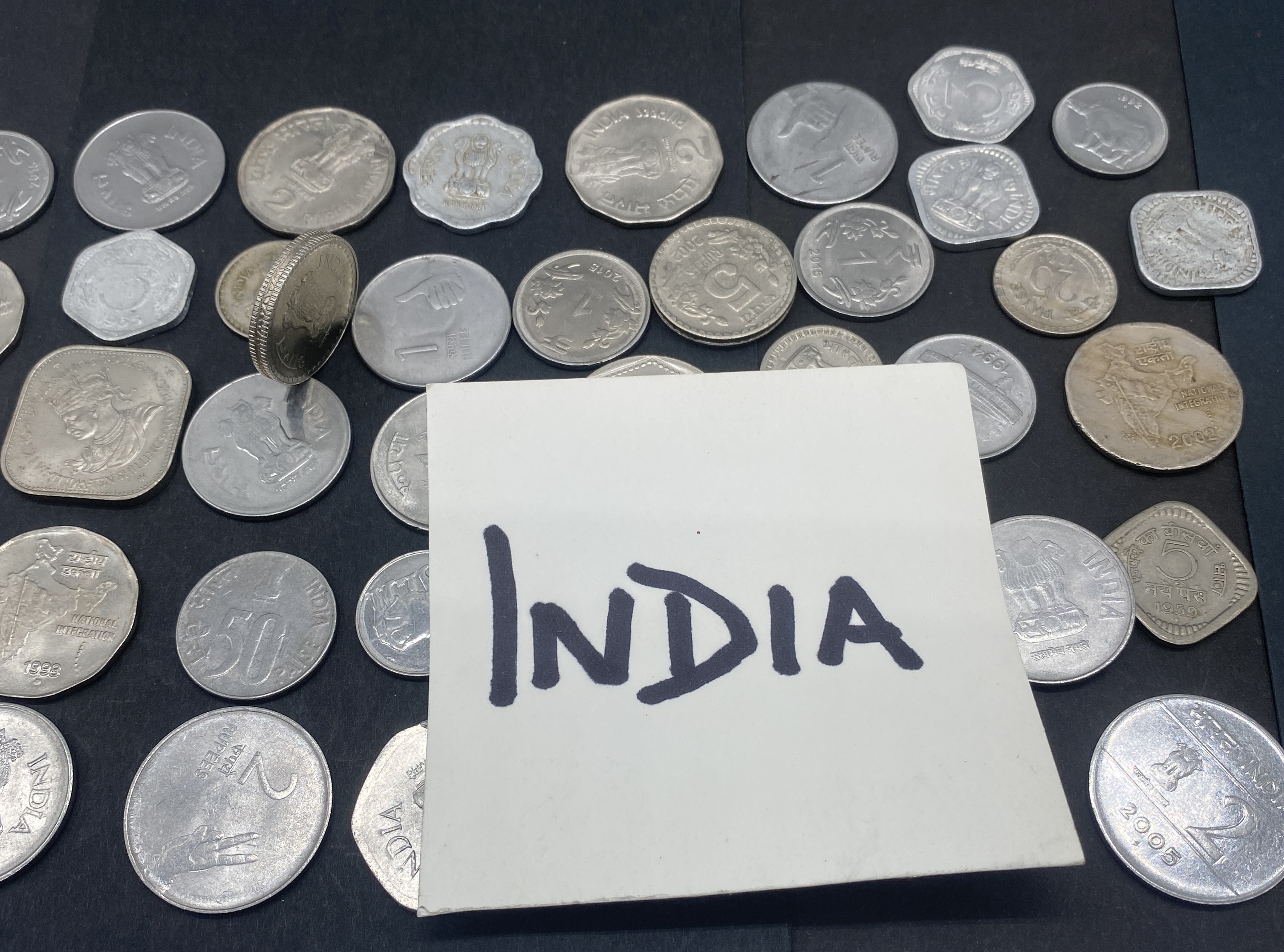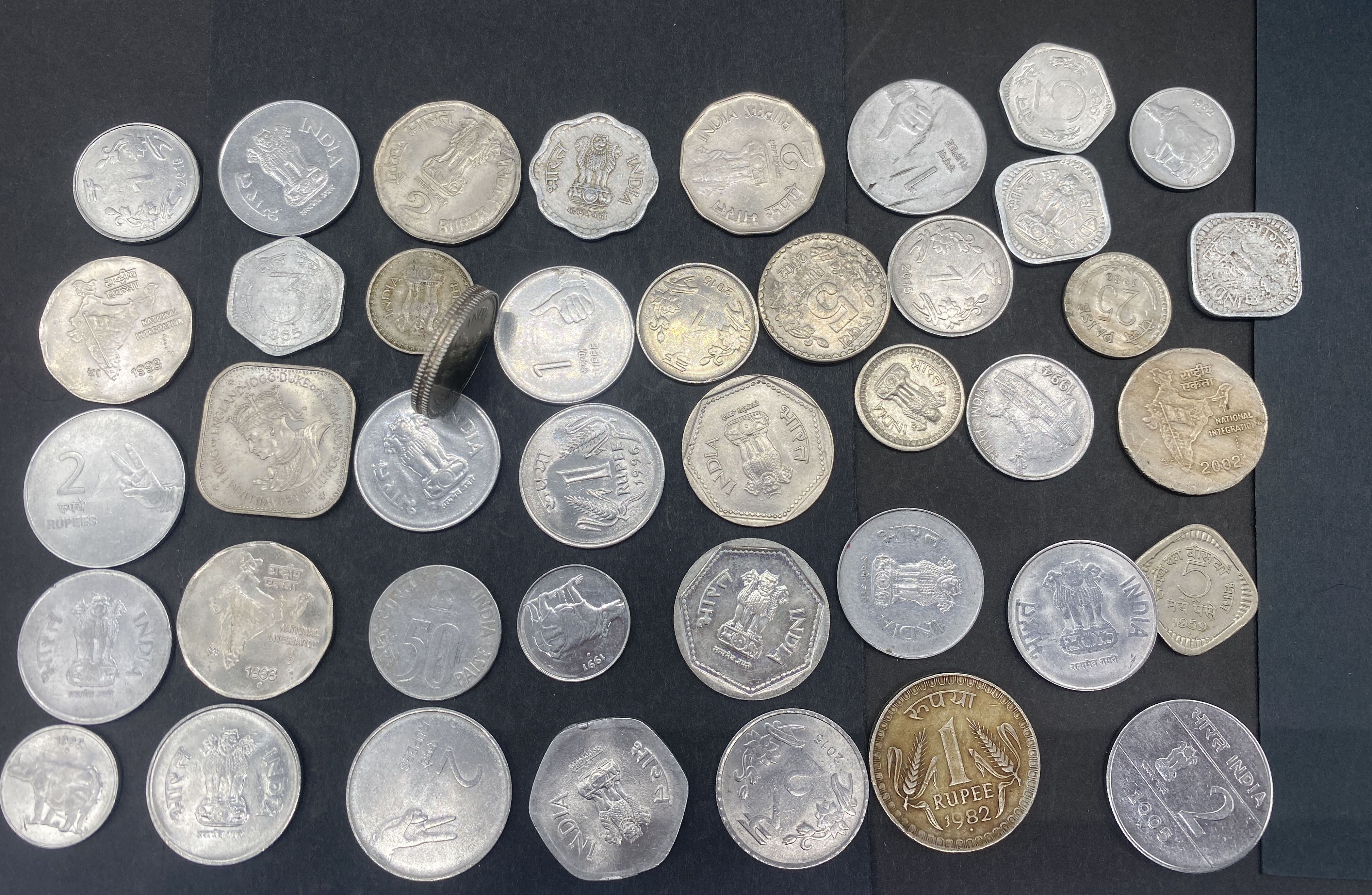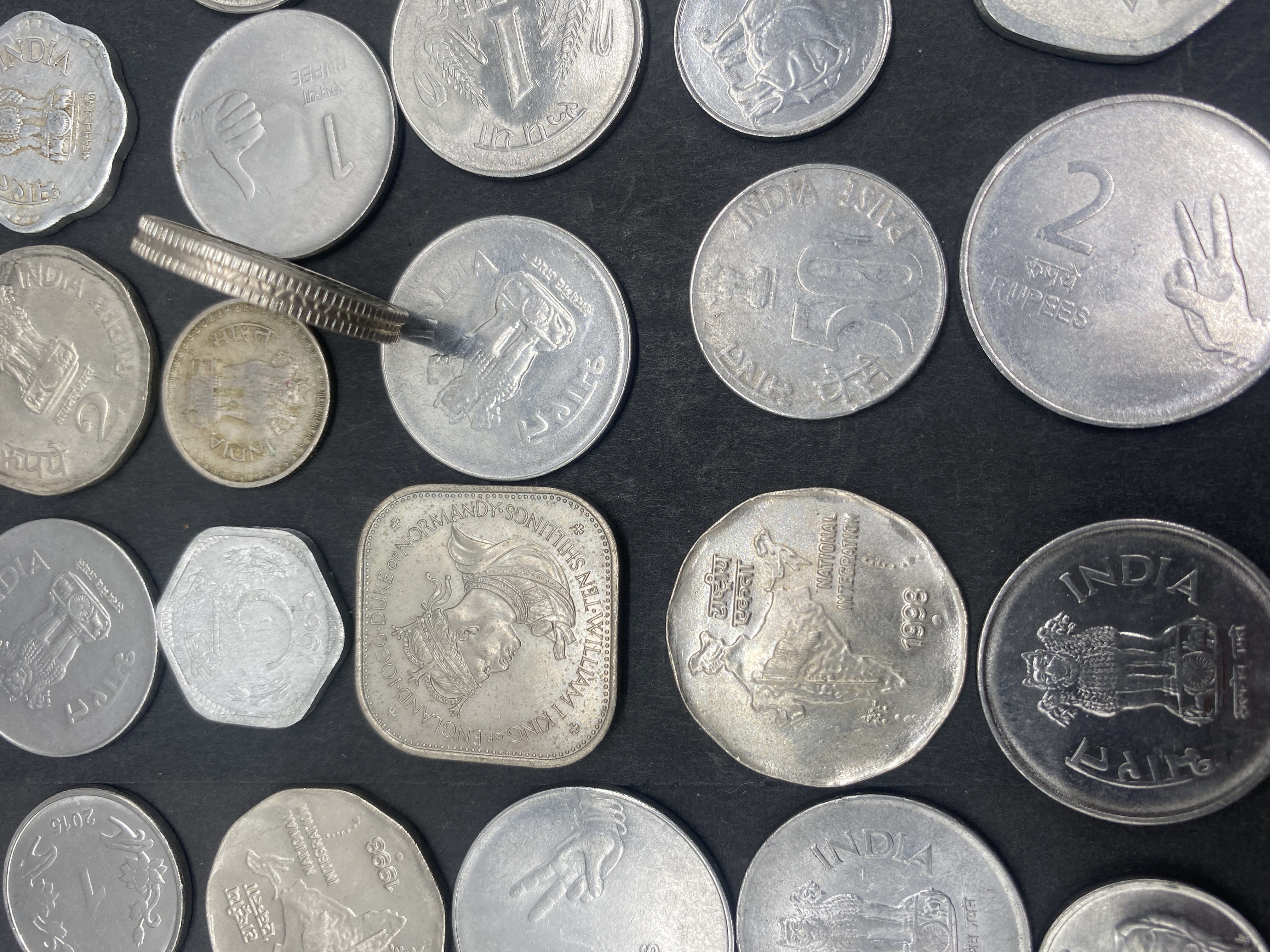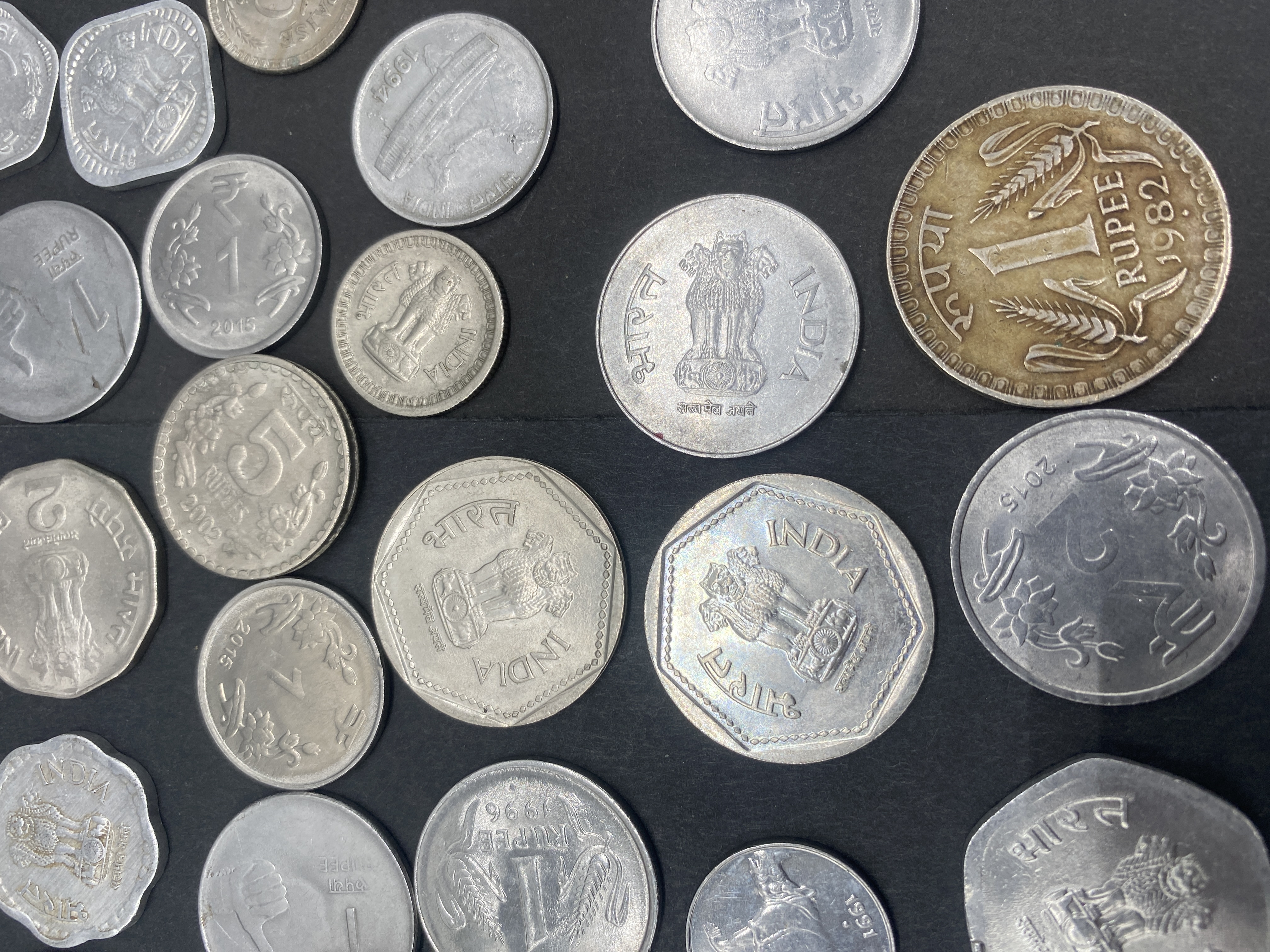 A collection of various silver and gold-colored Indian rupee coins.