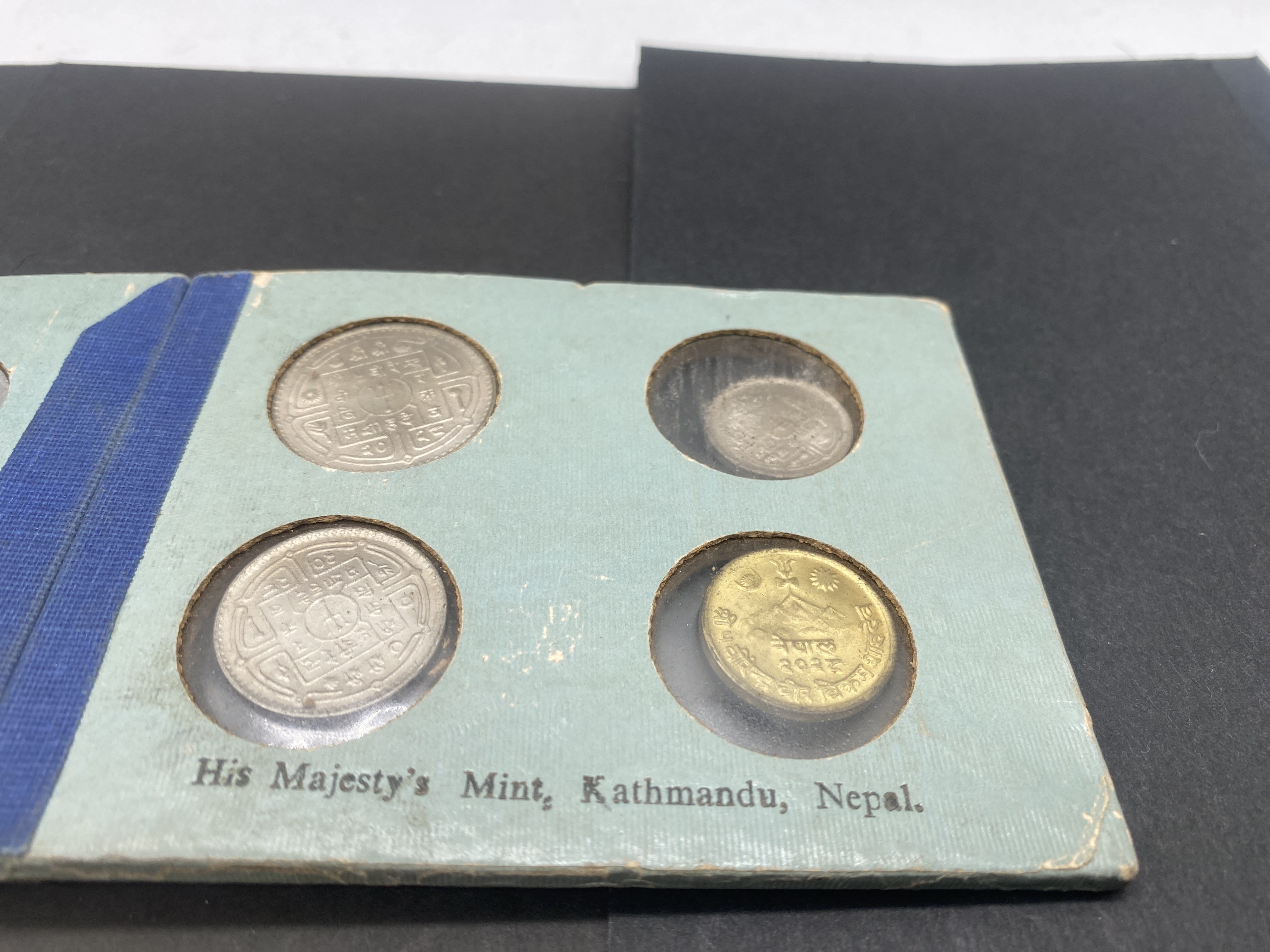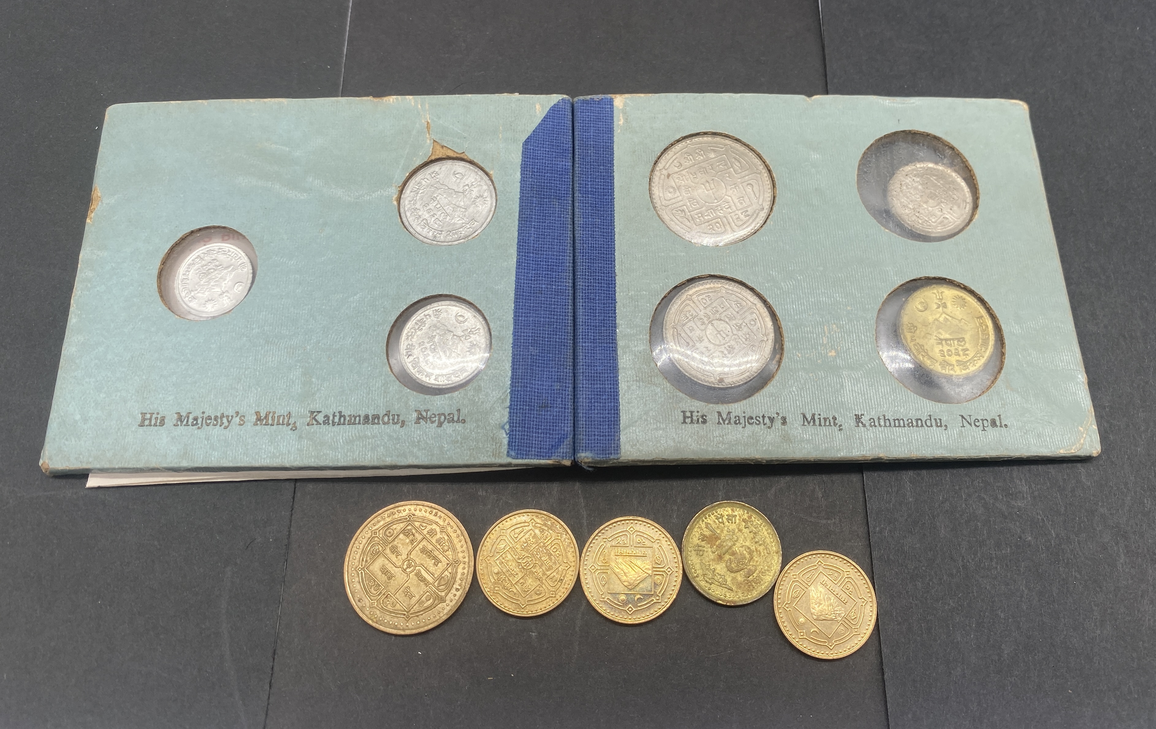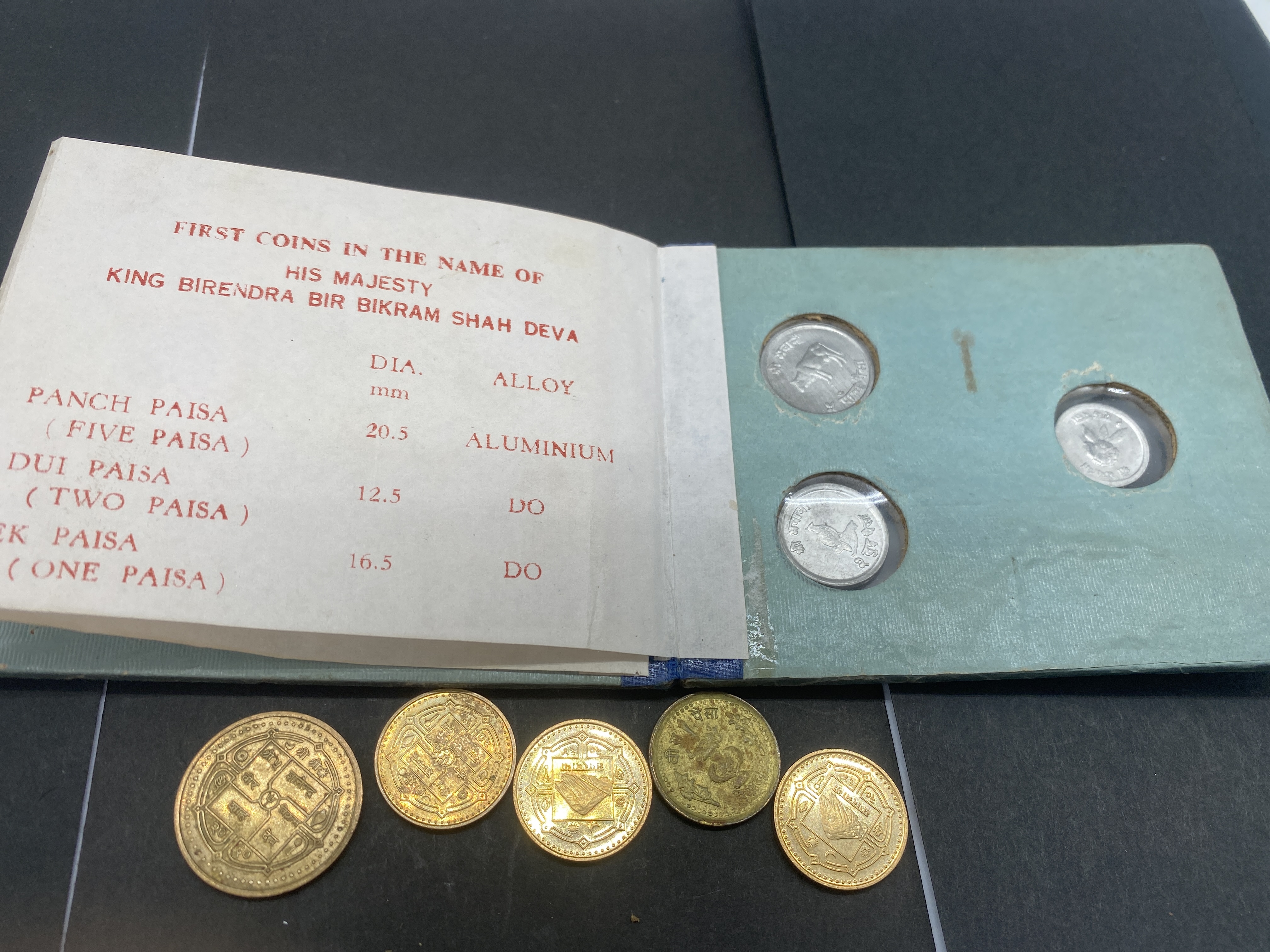 Teal coin album containing Nepalese silver and gold coins, including a set from King Birendra Bir Bikram Shah Deva.