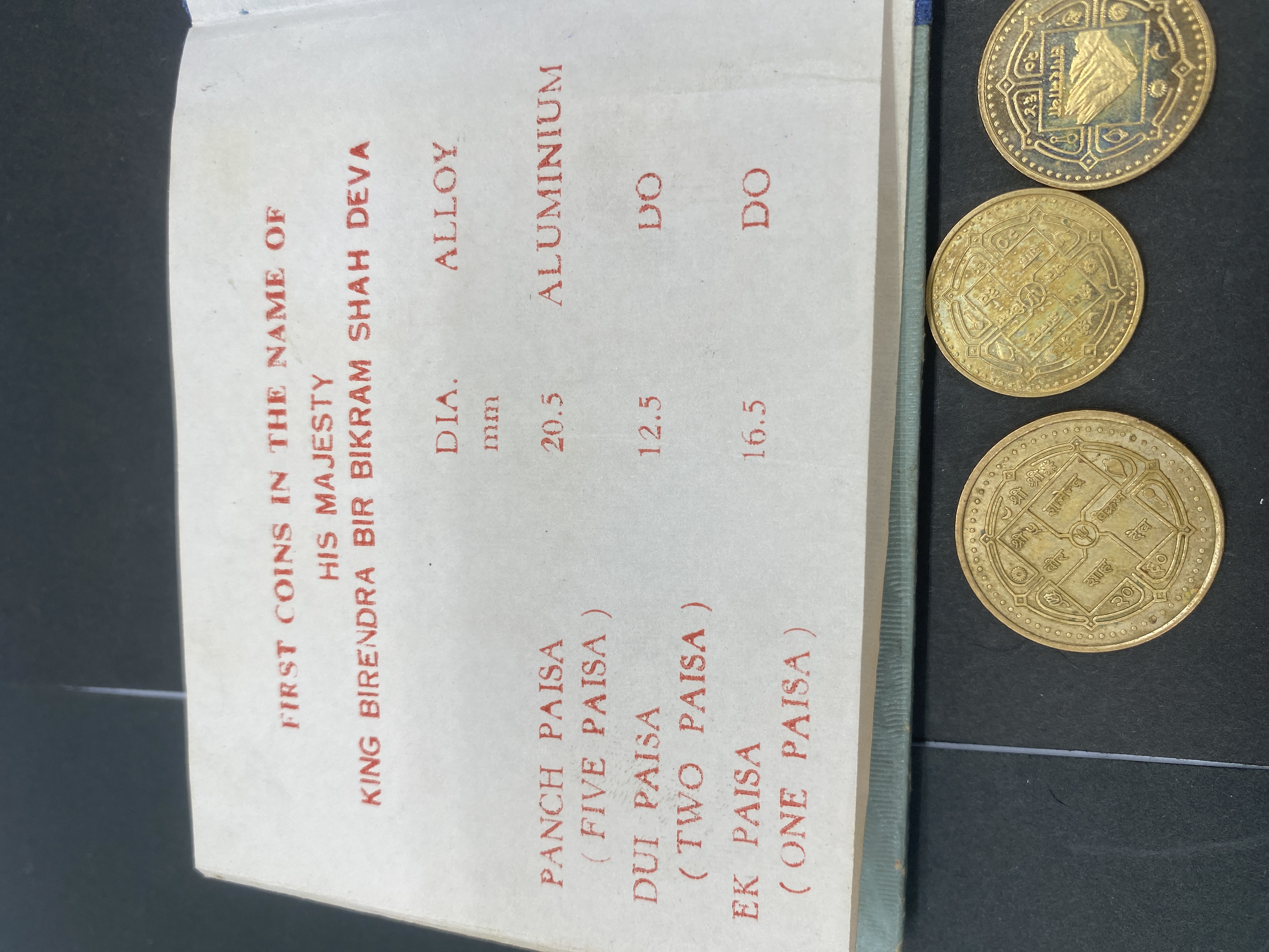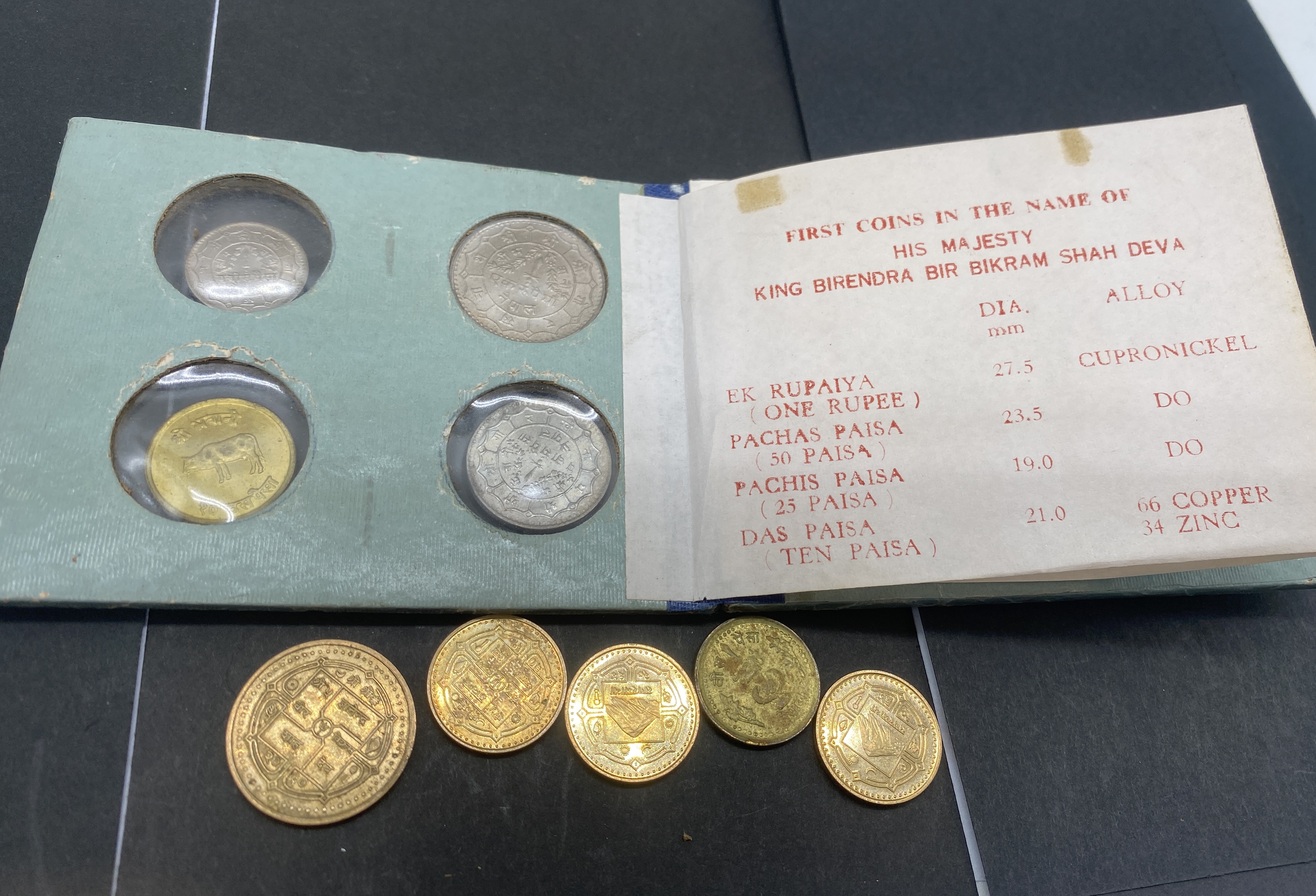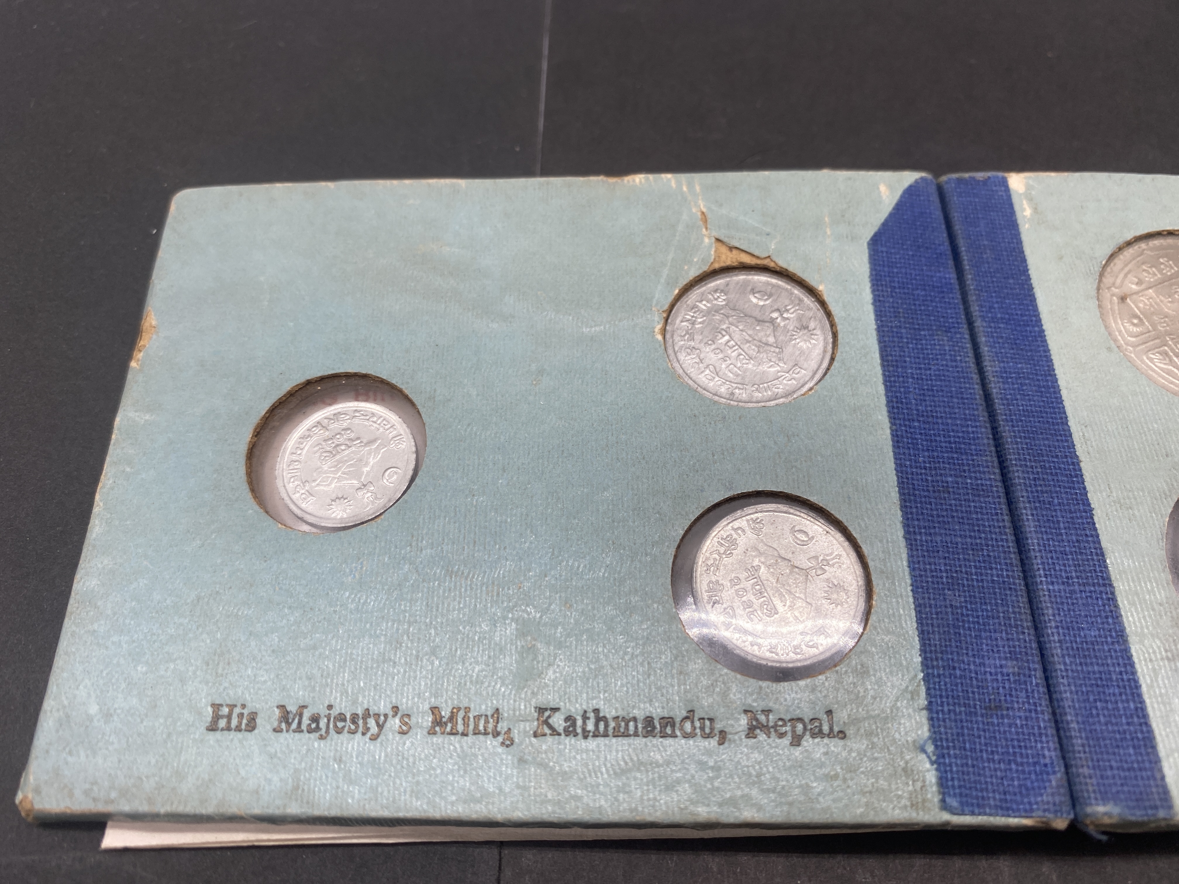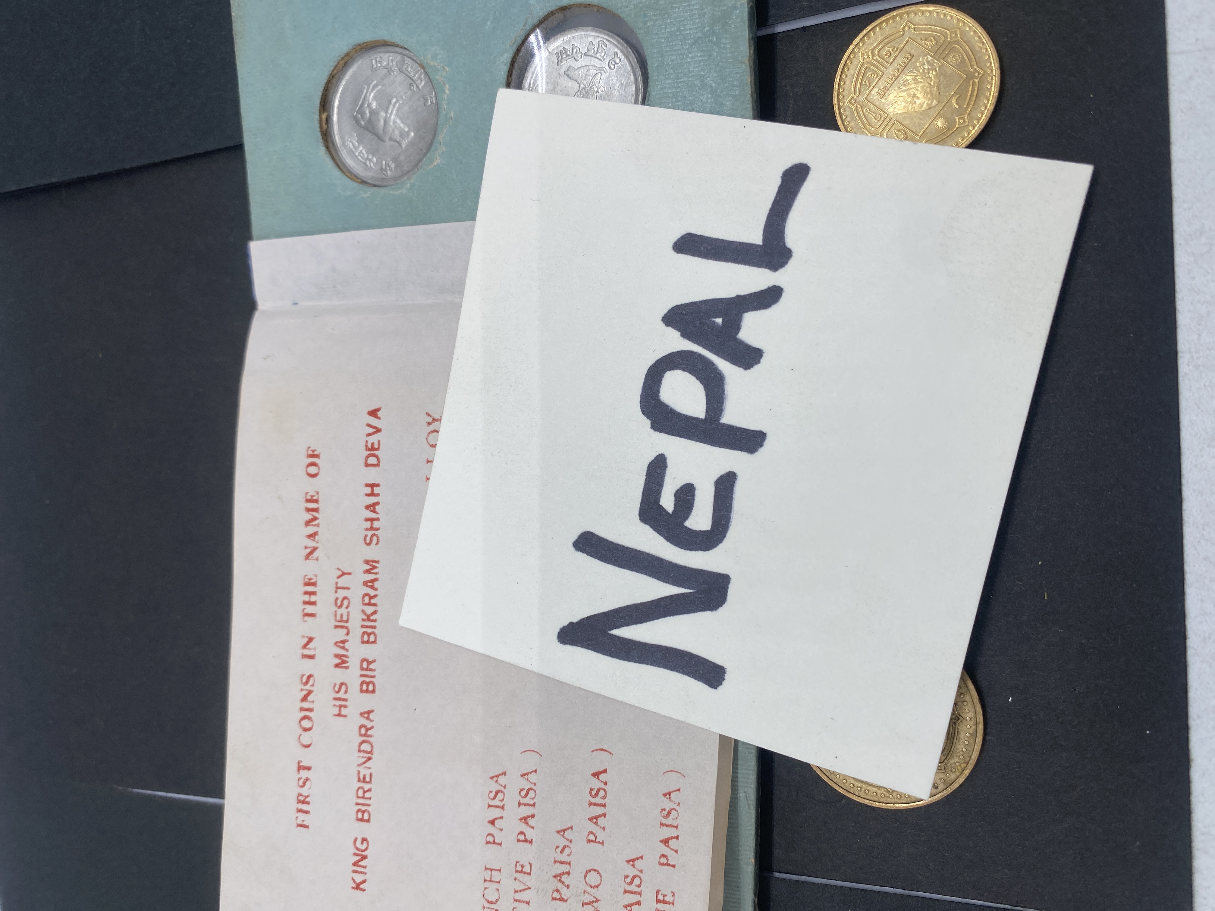 Teal coin album containing Nepalese silver and gold coins, including a set from King Birendra Bir Bikram Shah Deva.