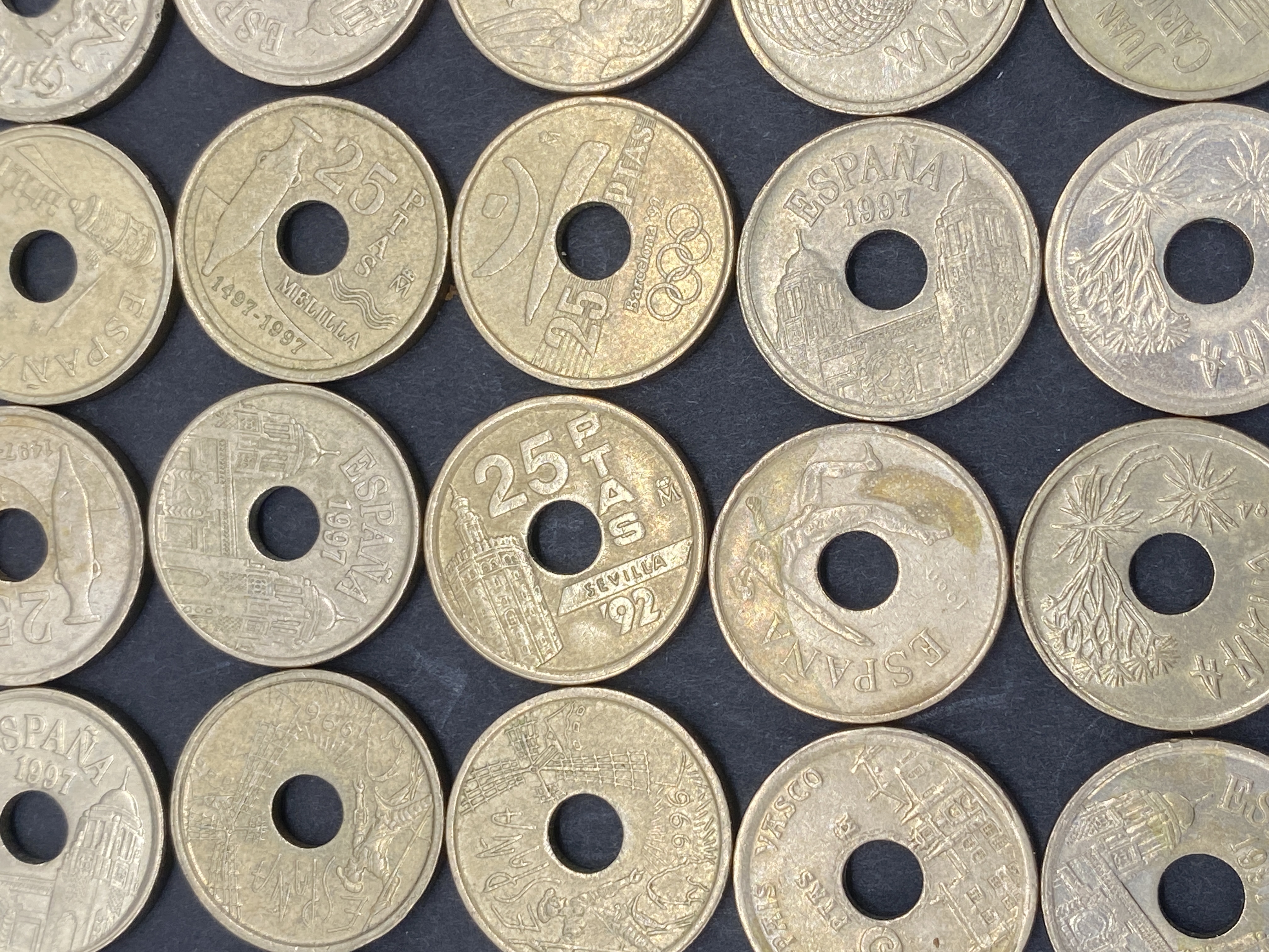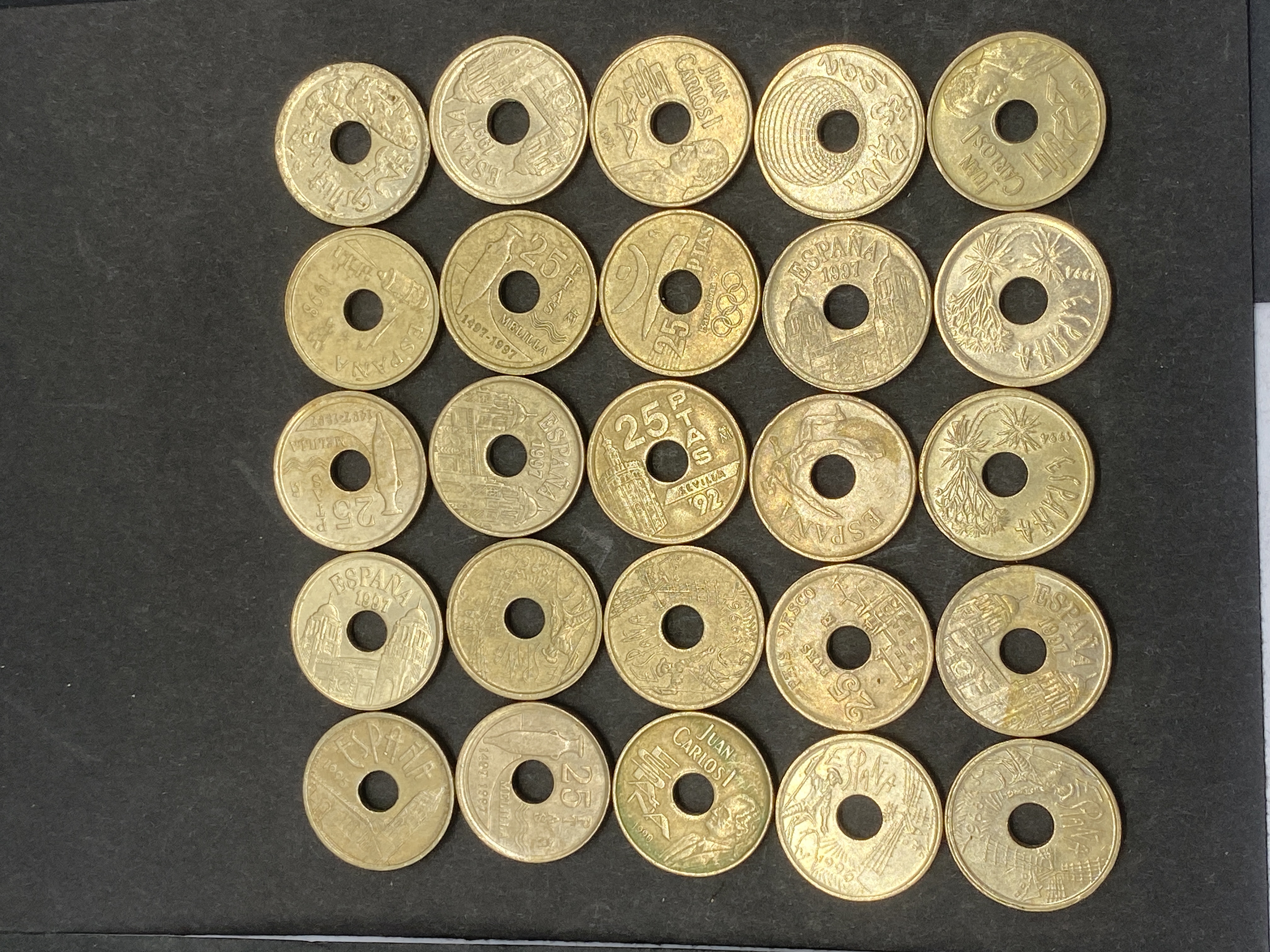 Twenty-five gold-colored Spanish 25 pesetas coins are arranged in a grid.