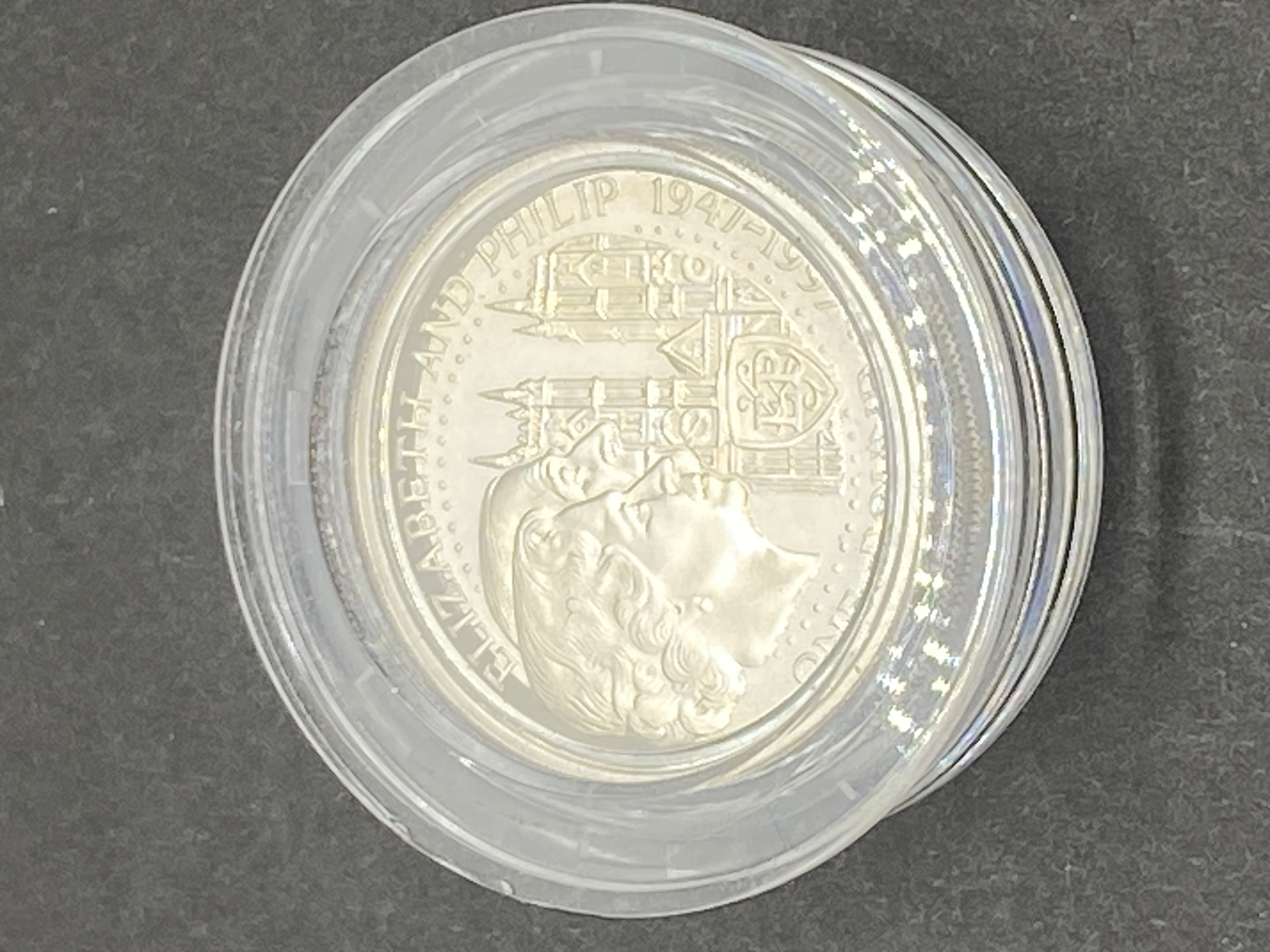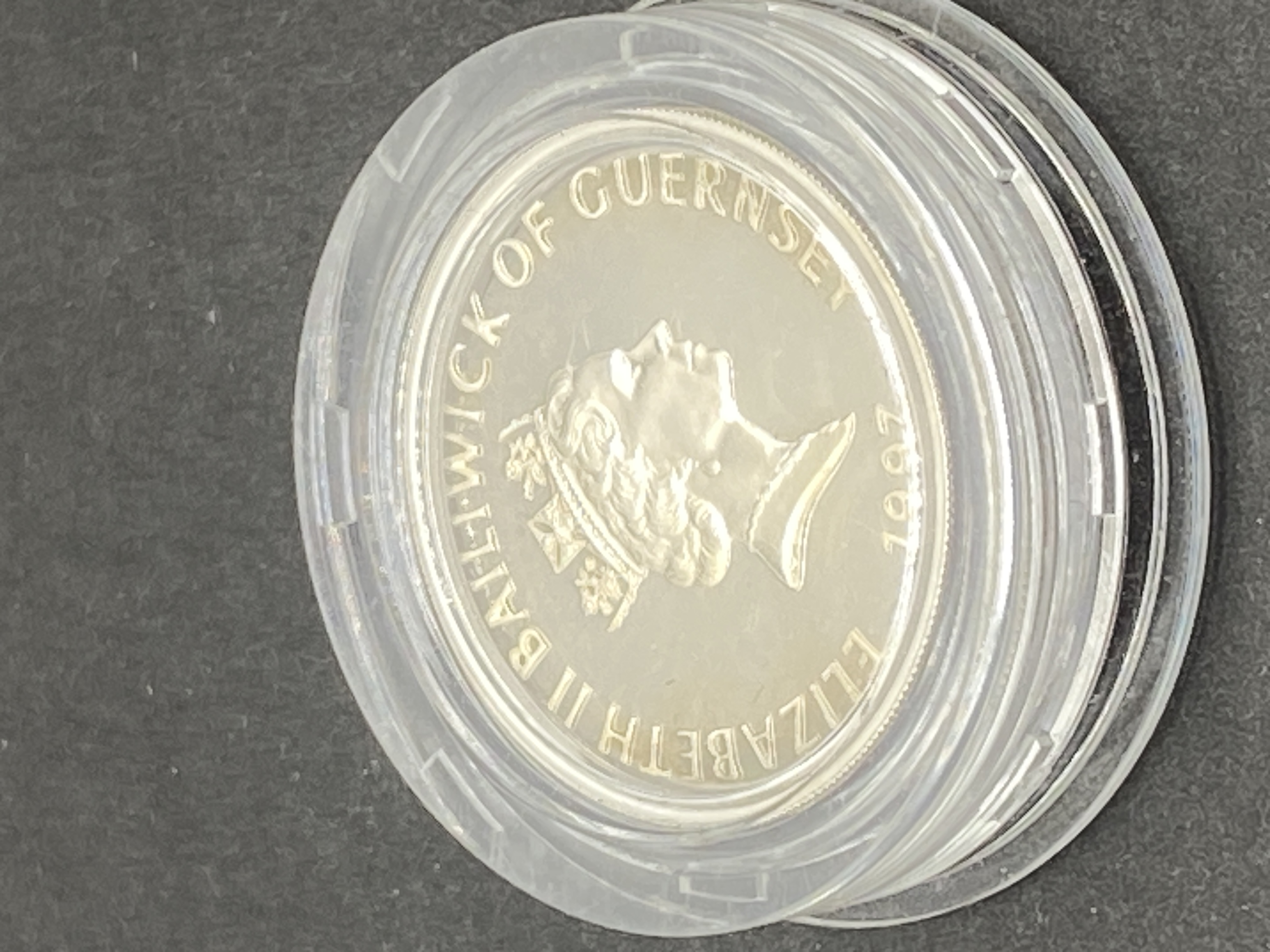 Silver proof commemorative coin depicting Queen Elizabeth II and dated 1997.