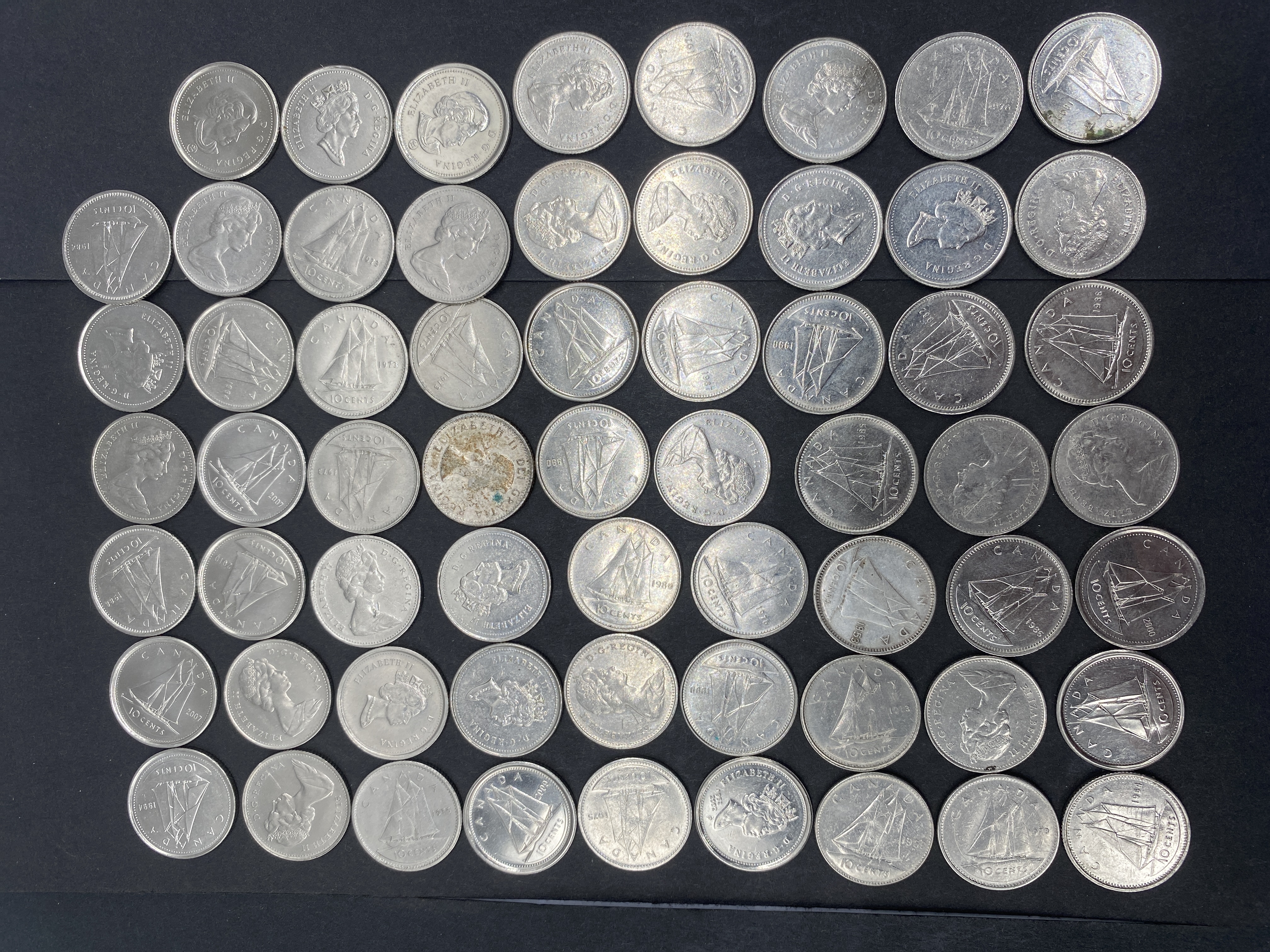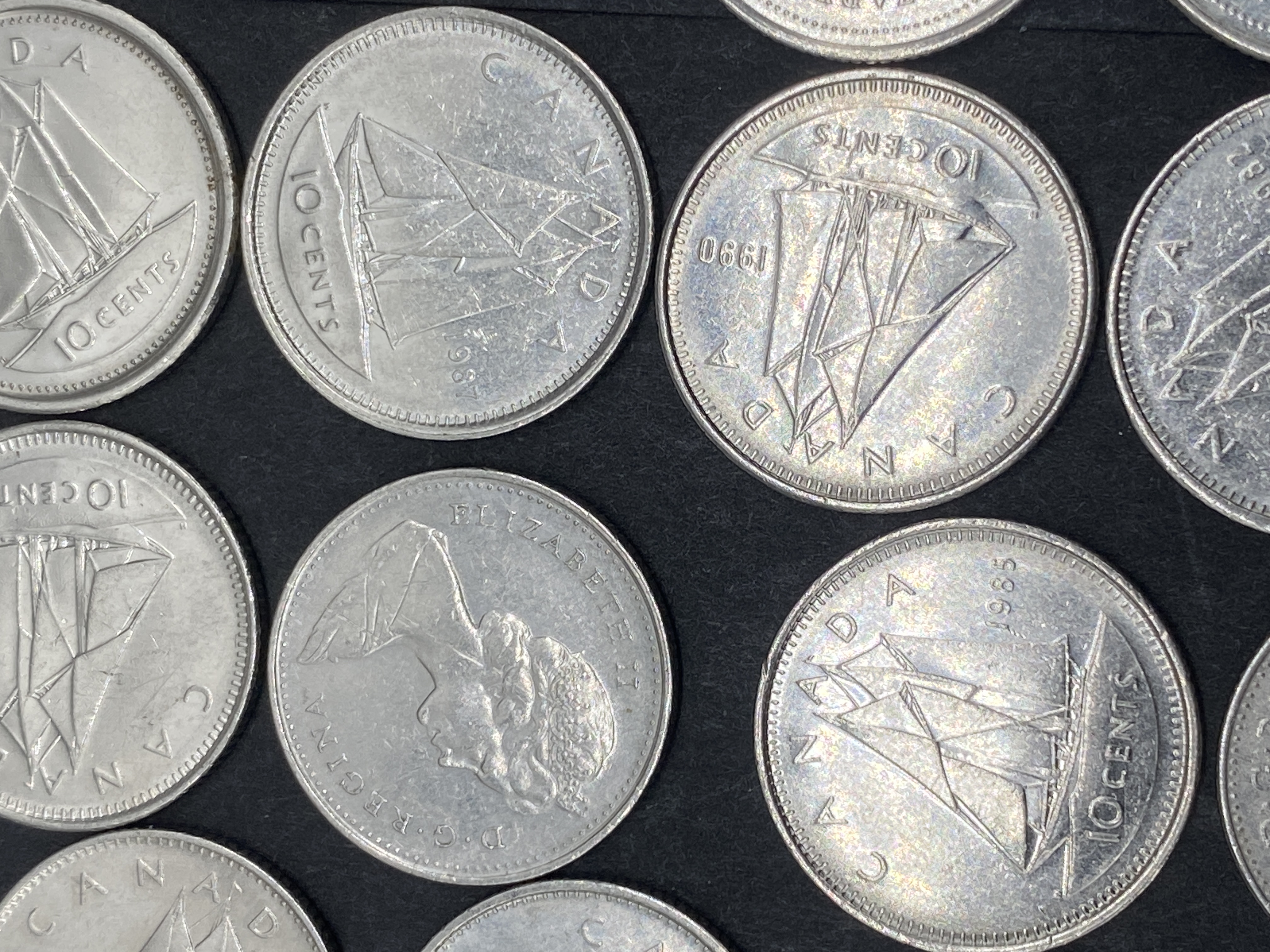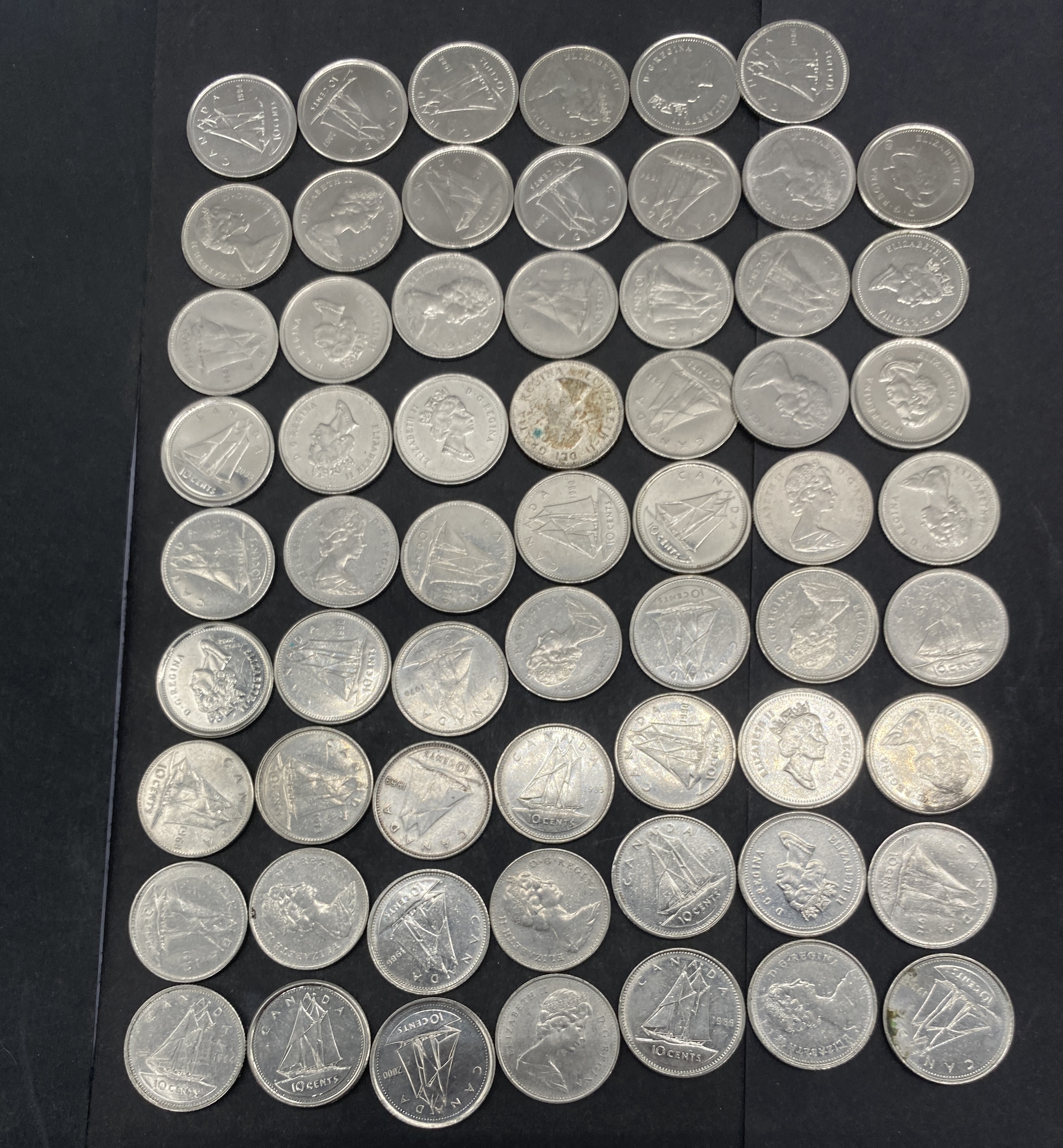 A collection of Canadian 10 cent coins featuring both the Bluenose schooner and Queen Elizabeth II.