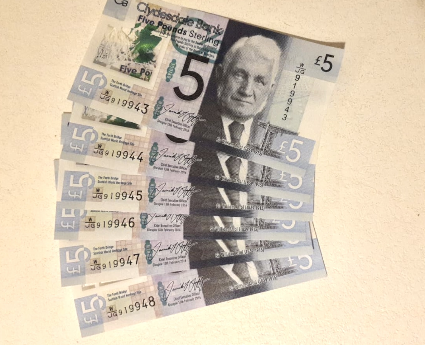 A consecutive run of seven uncirculated Clydesdale Bank £5 polymer banknotes featuring the Forth Bridge and a portrait of Sir William Arrol.