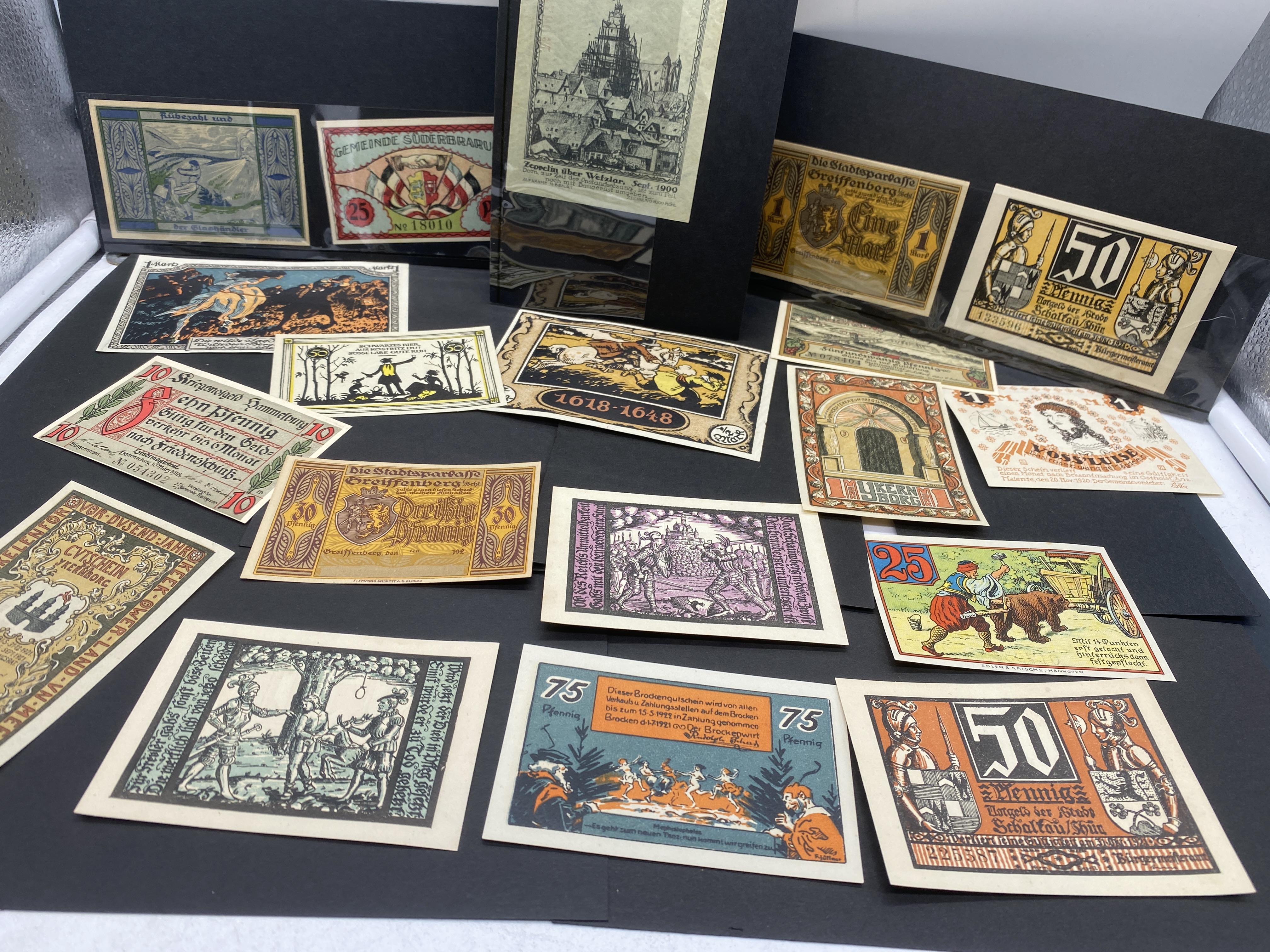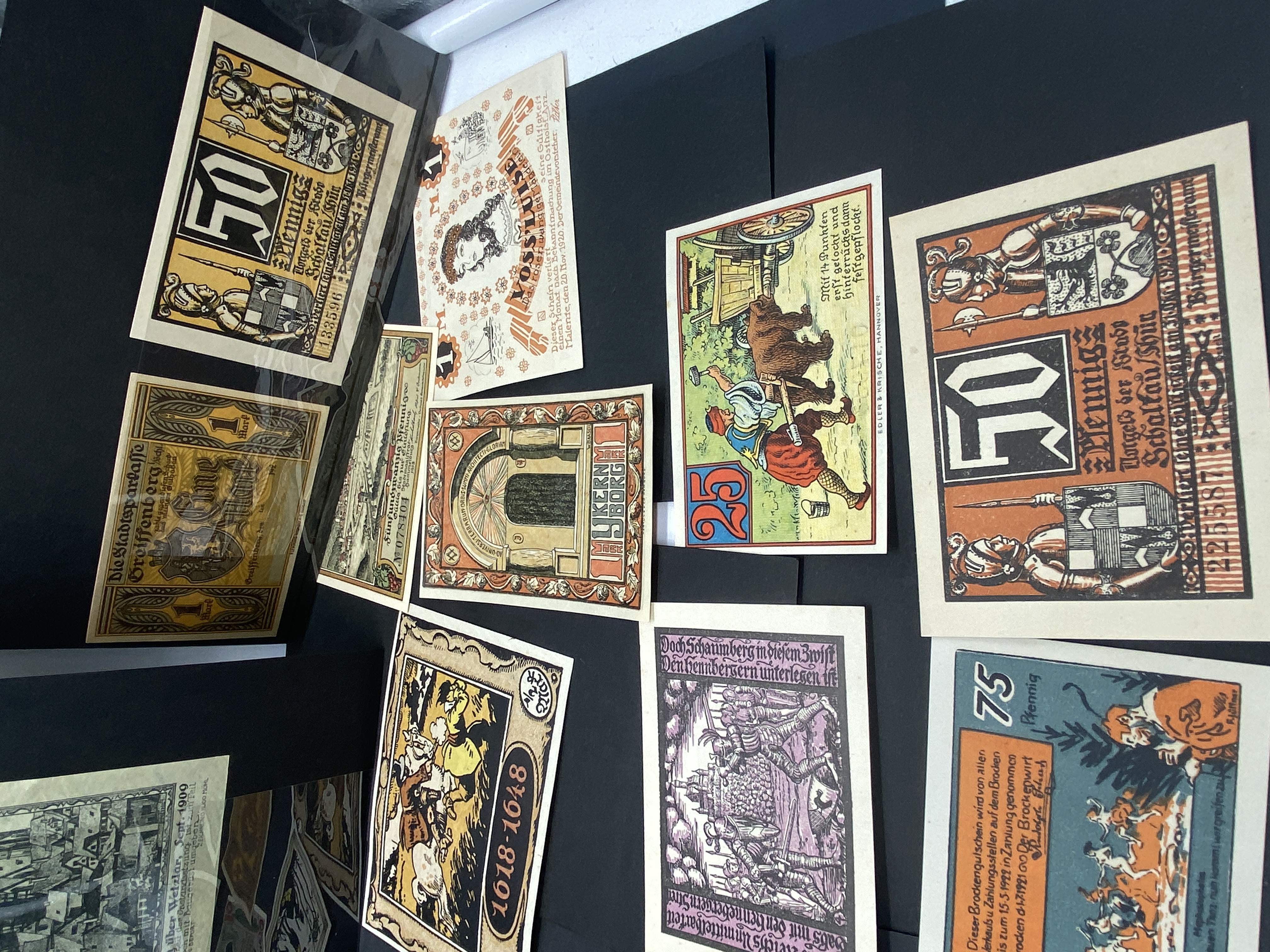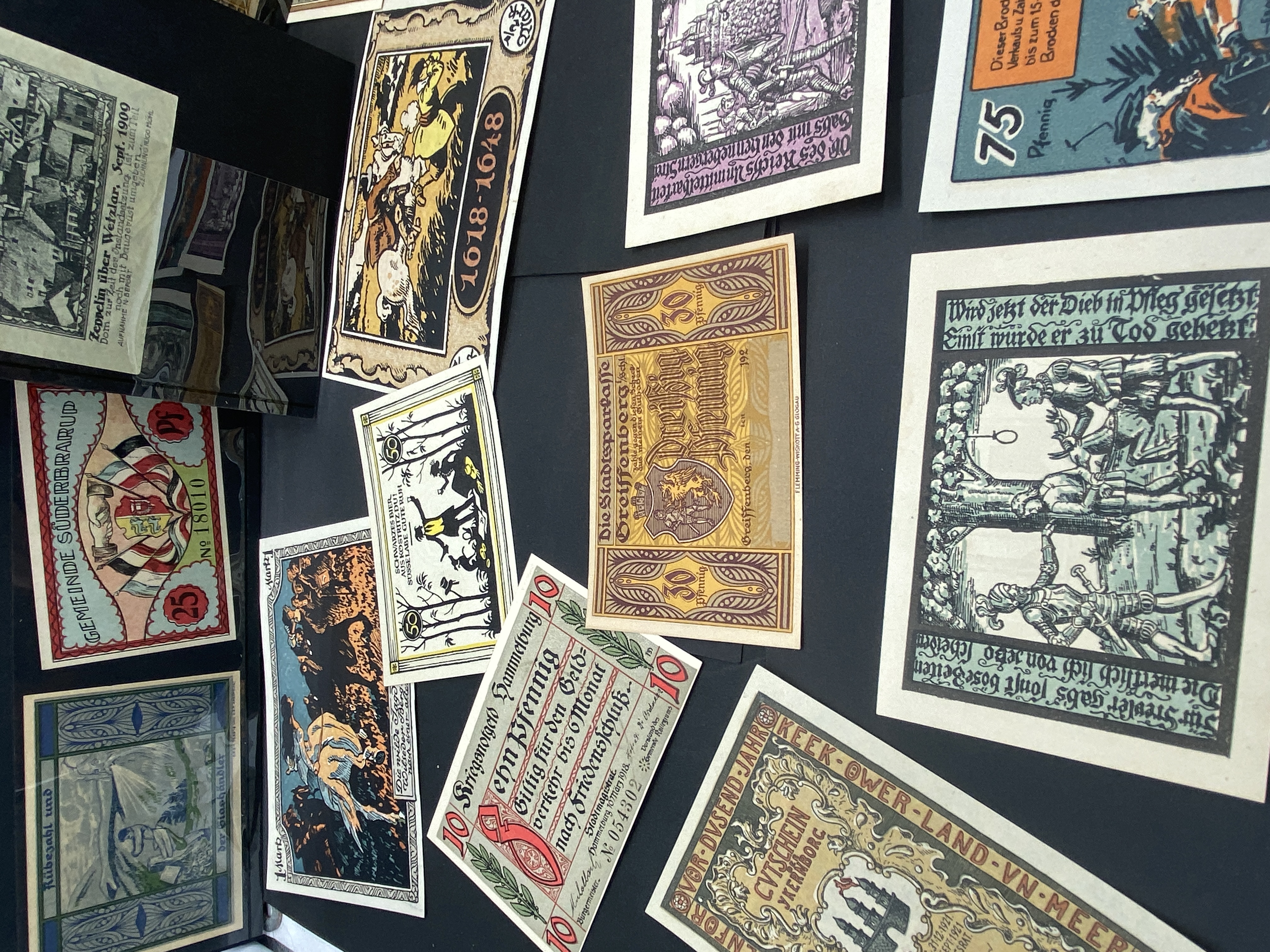 A collection of various colorful German Notgeld banknotes.