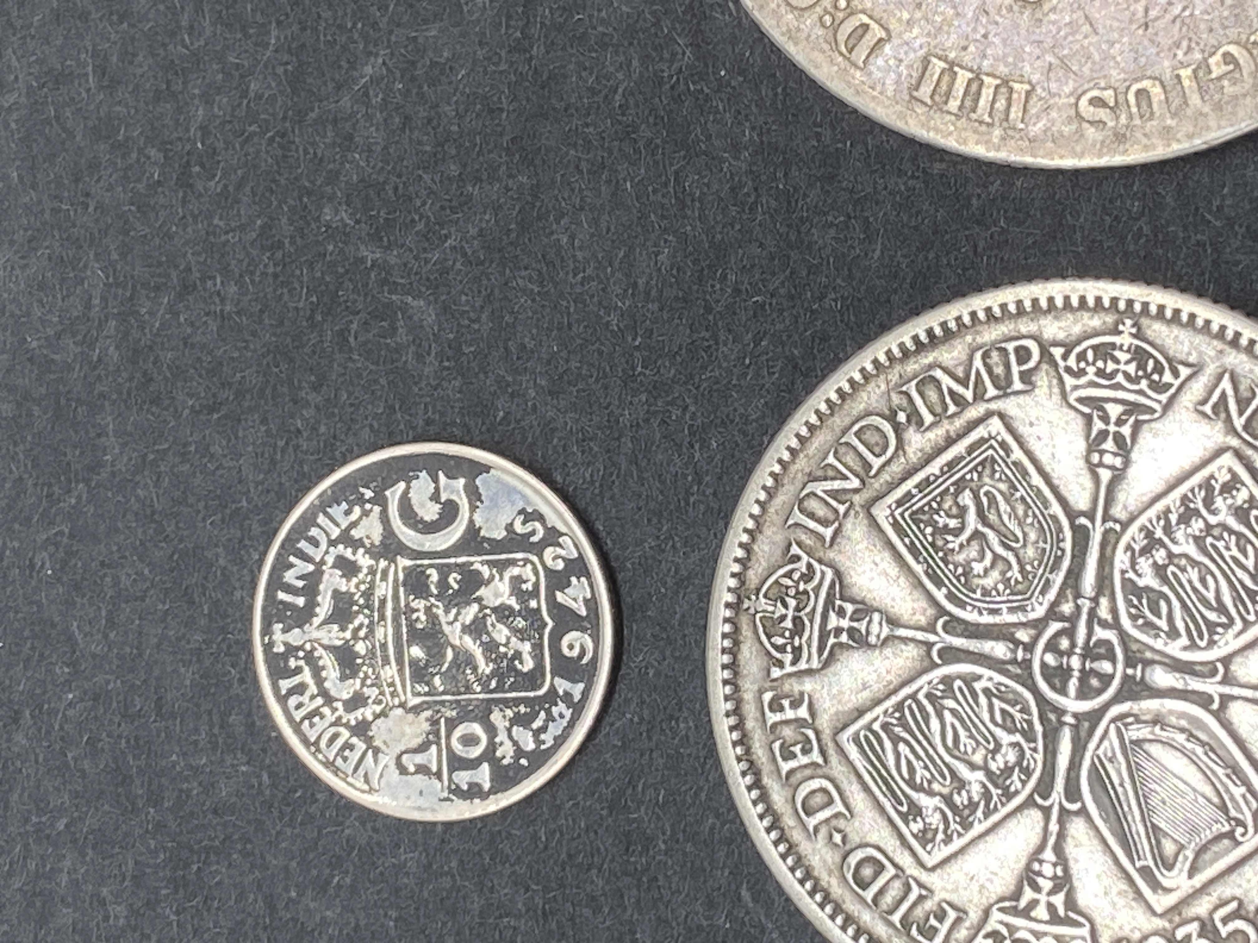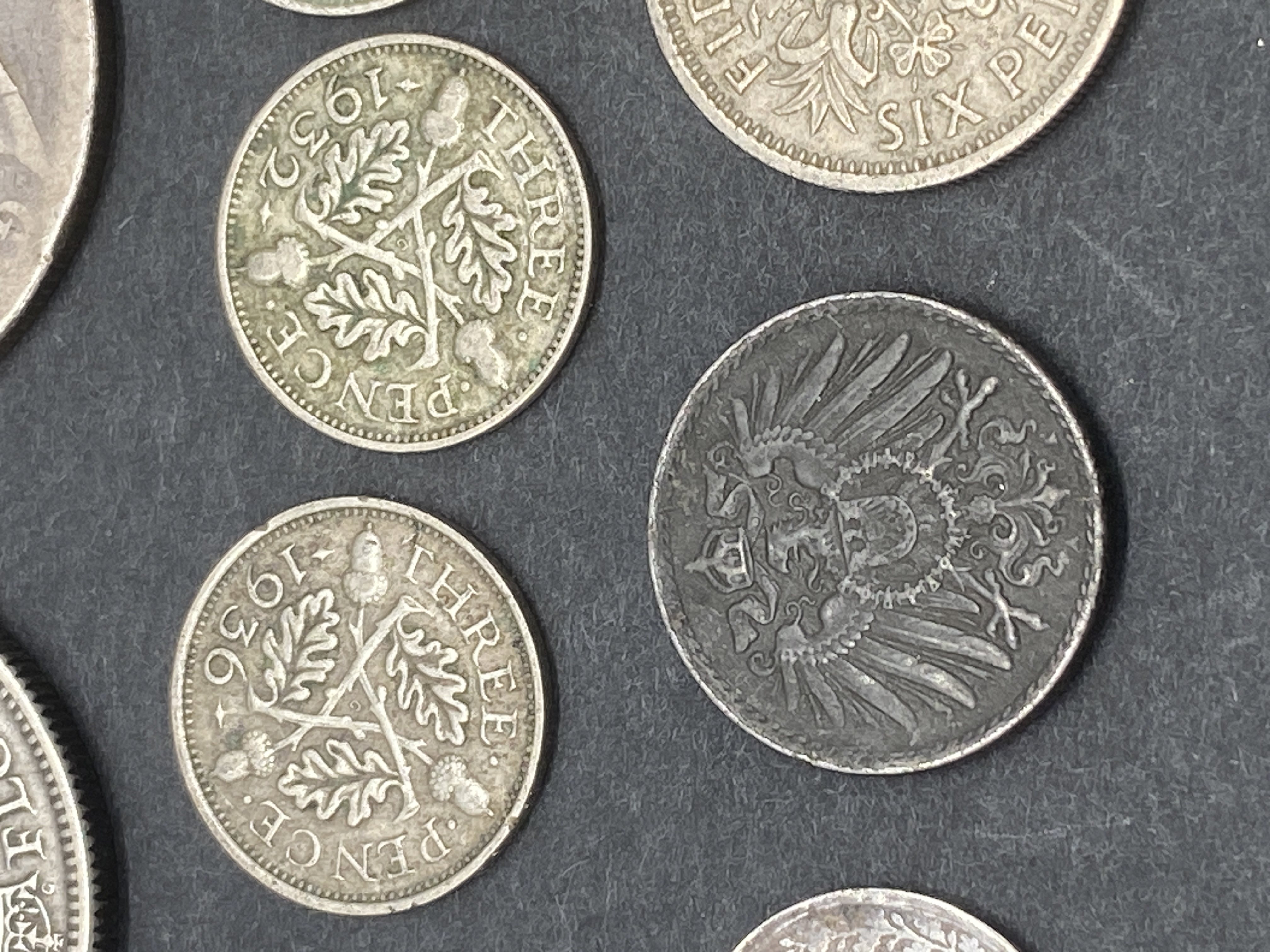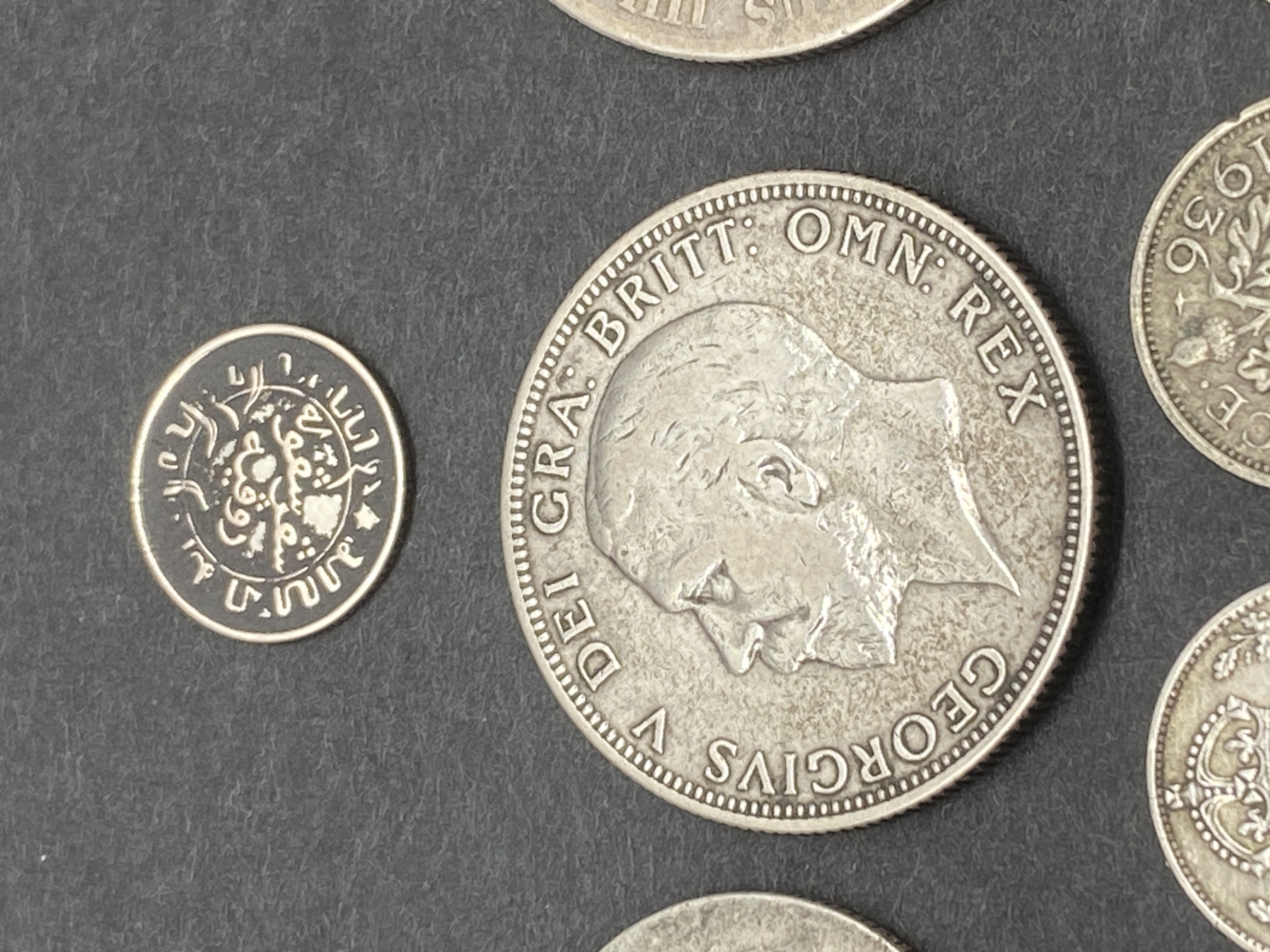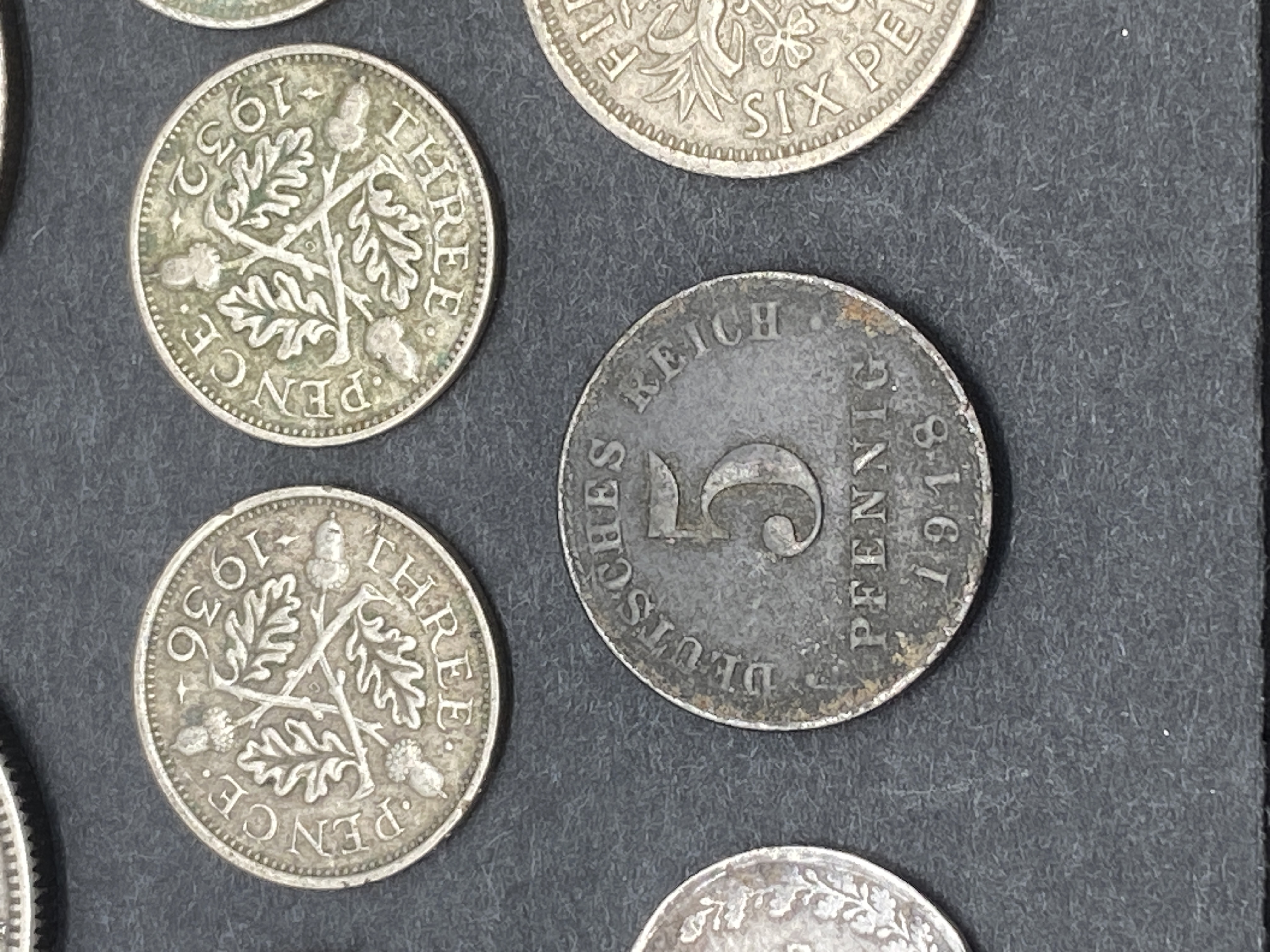 A collection of British silver florins, shillings, and threepence, along with German silver coins.