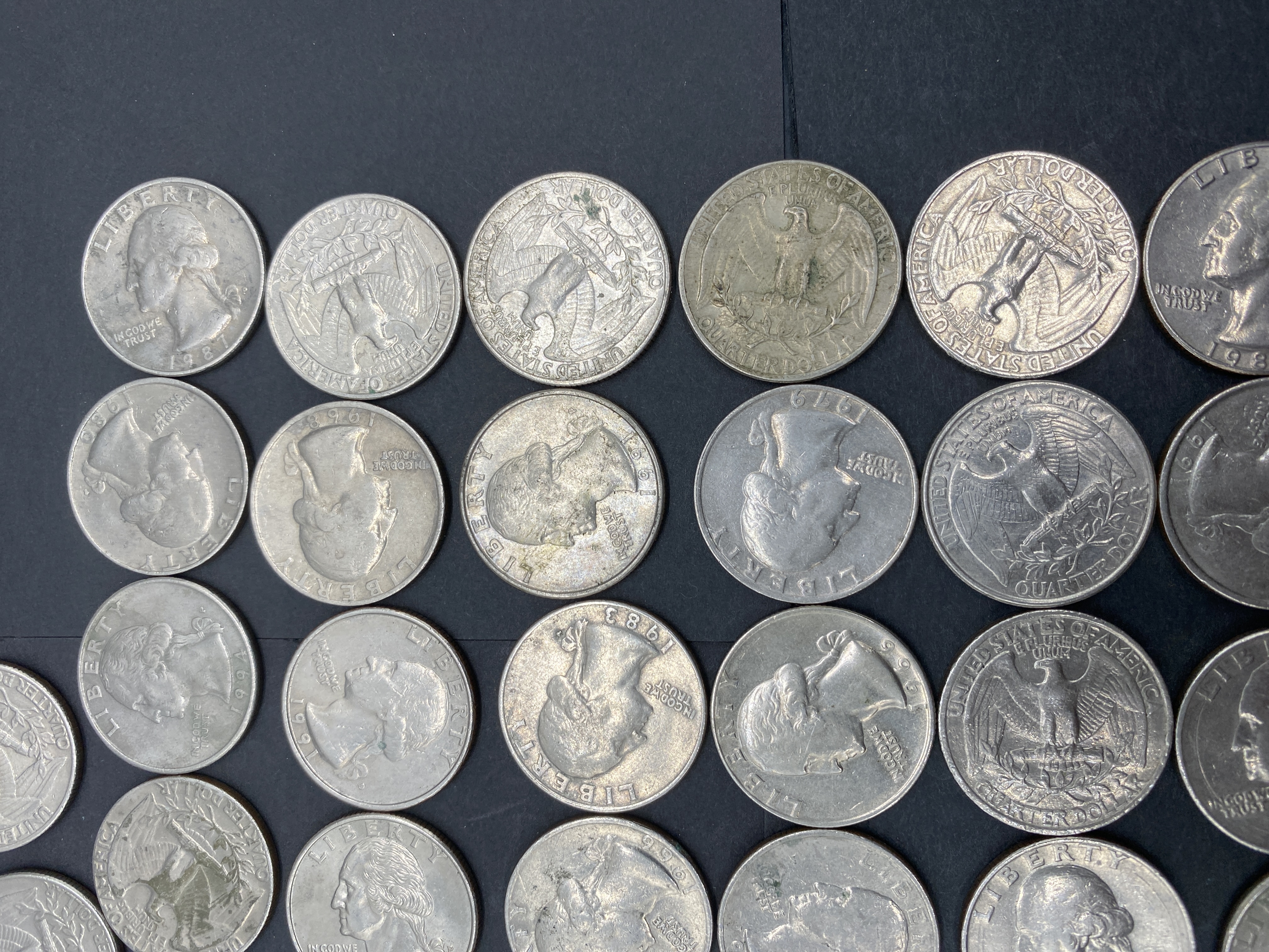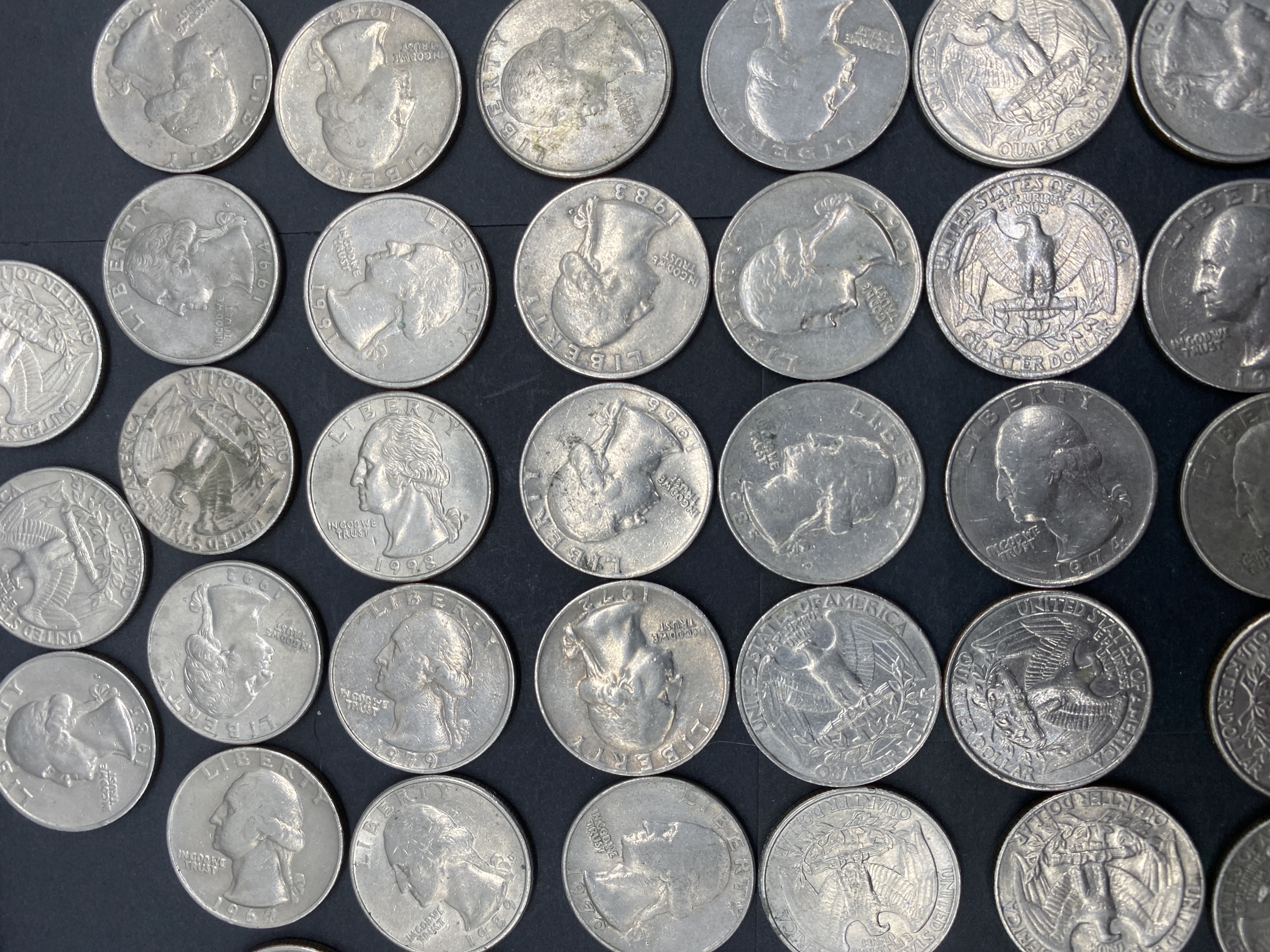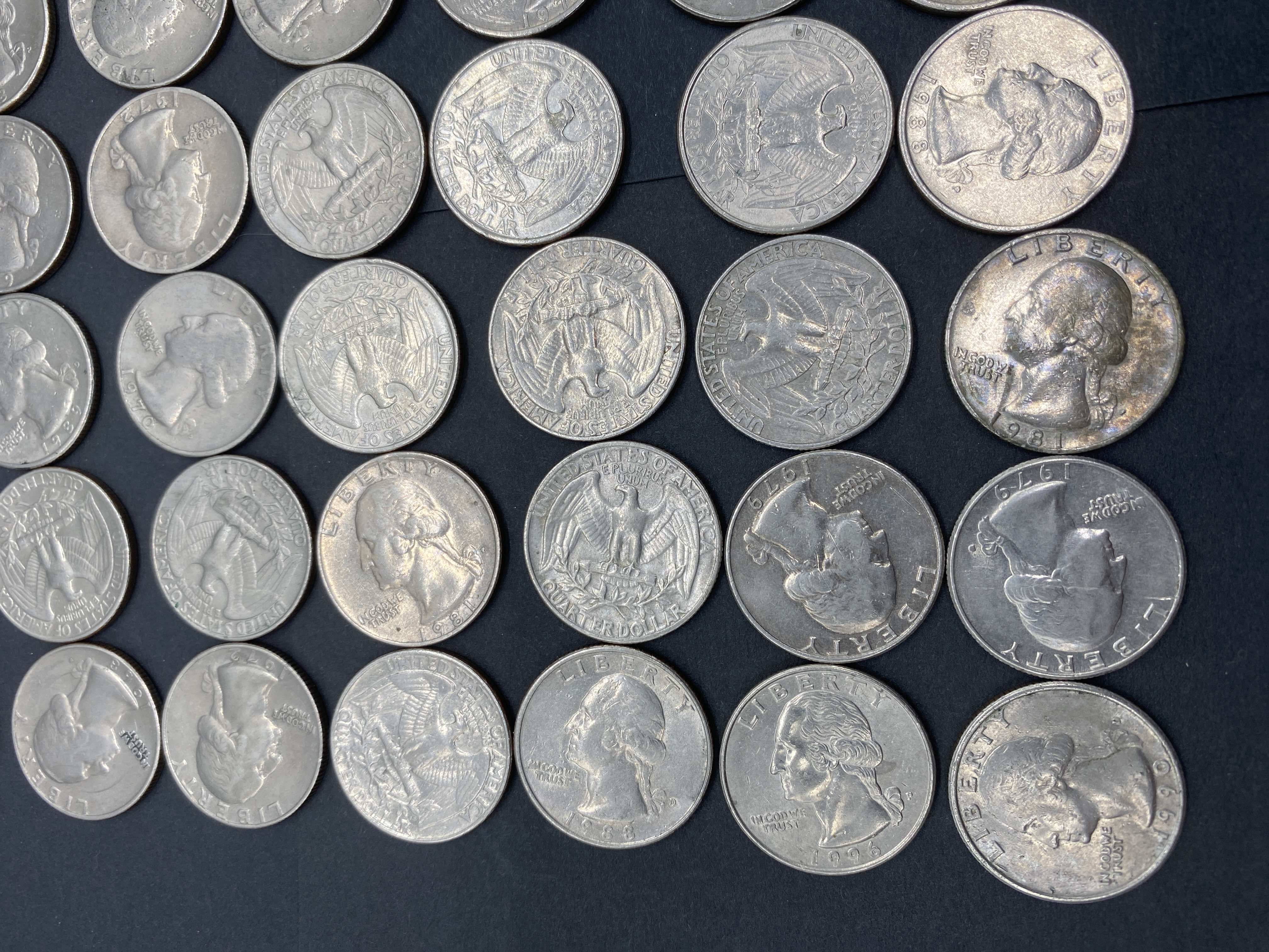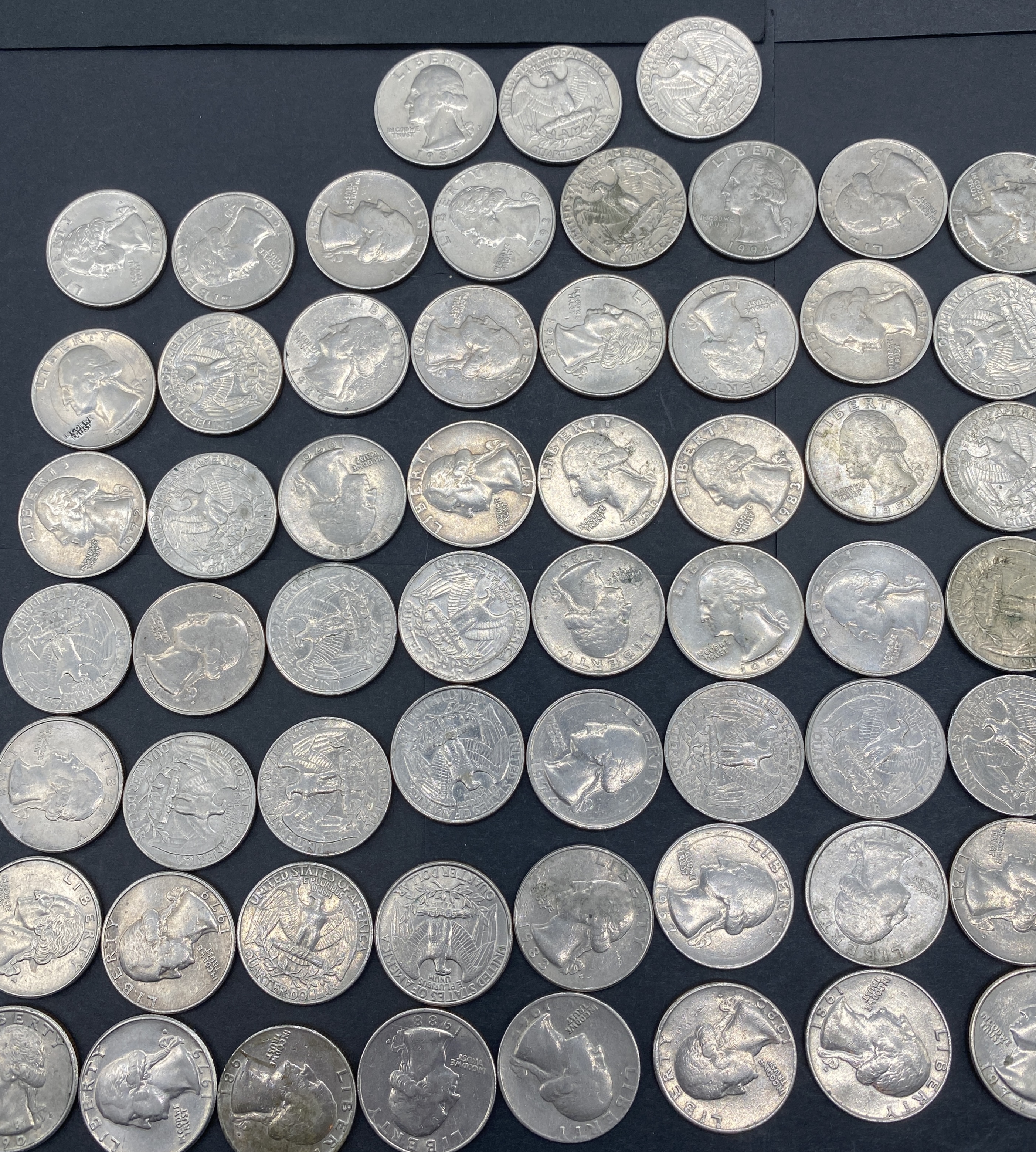 A collection of circulated Washington silver quarters of various dates.