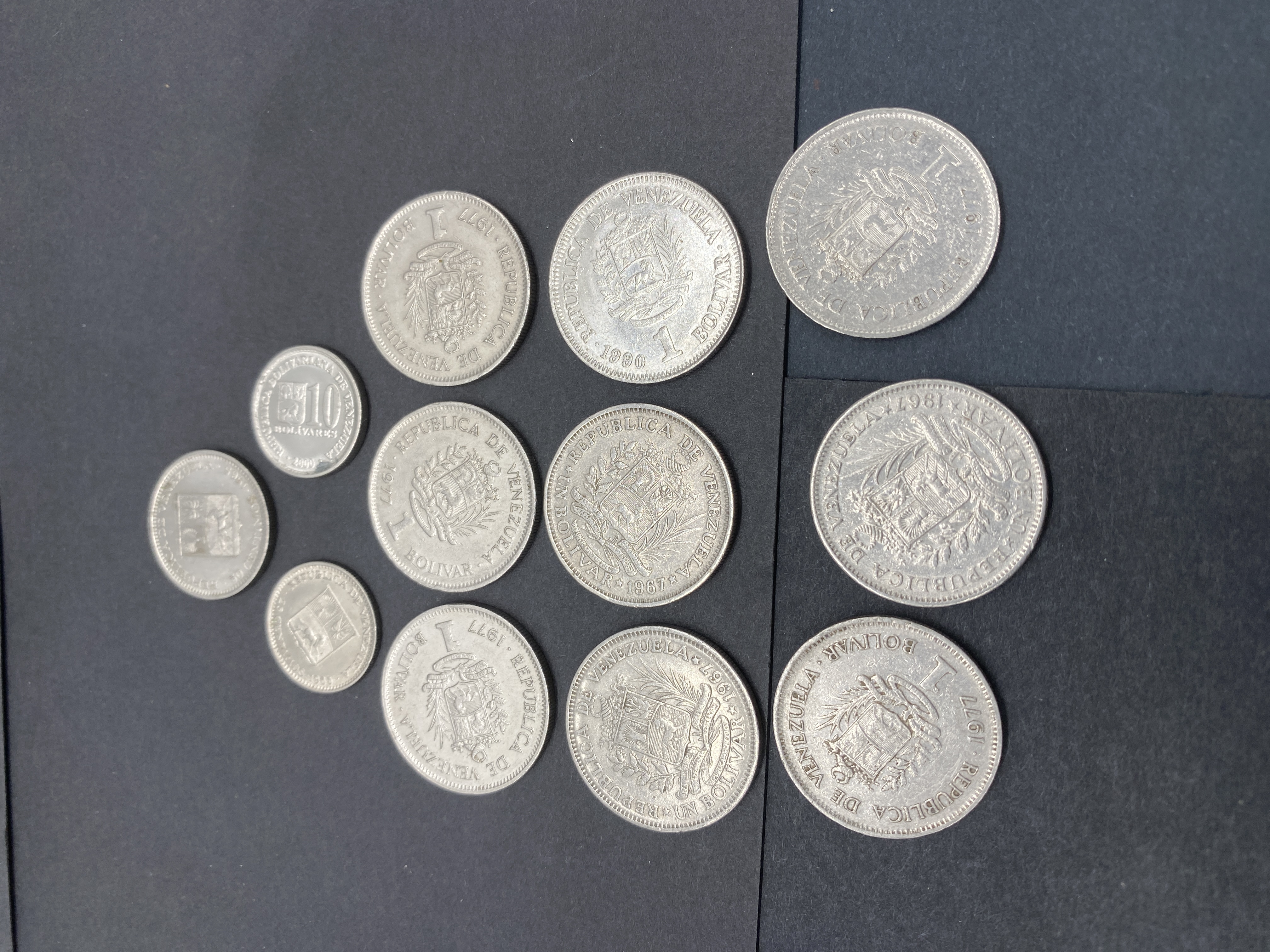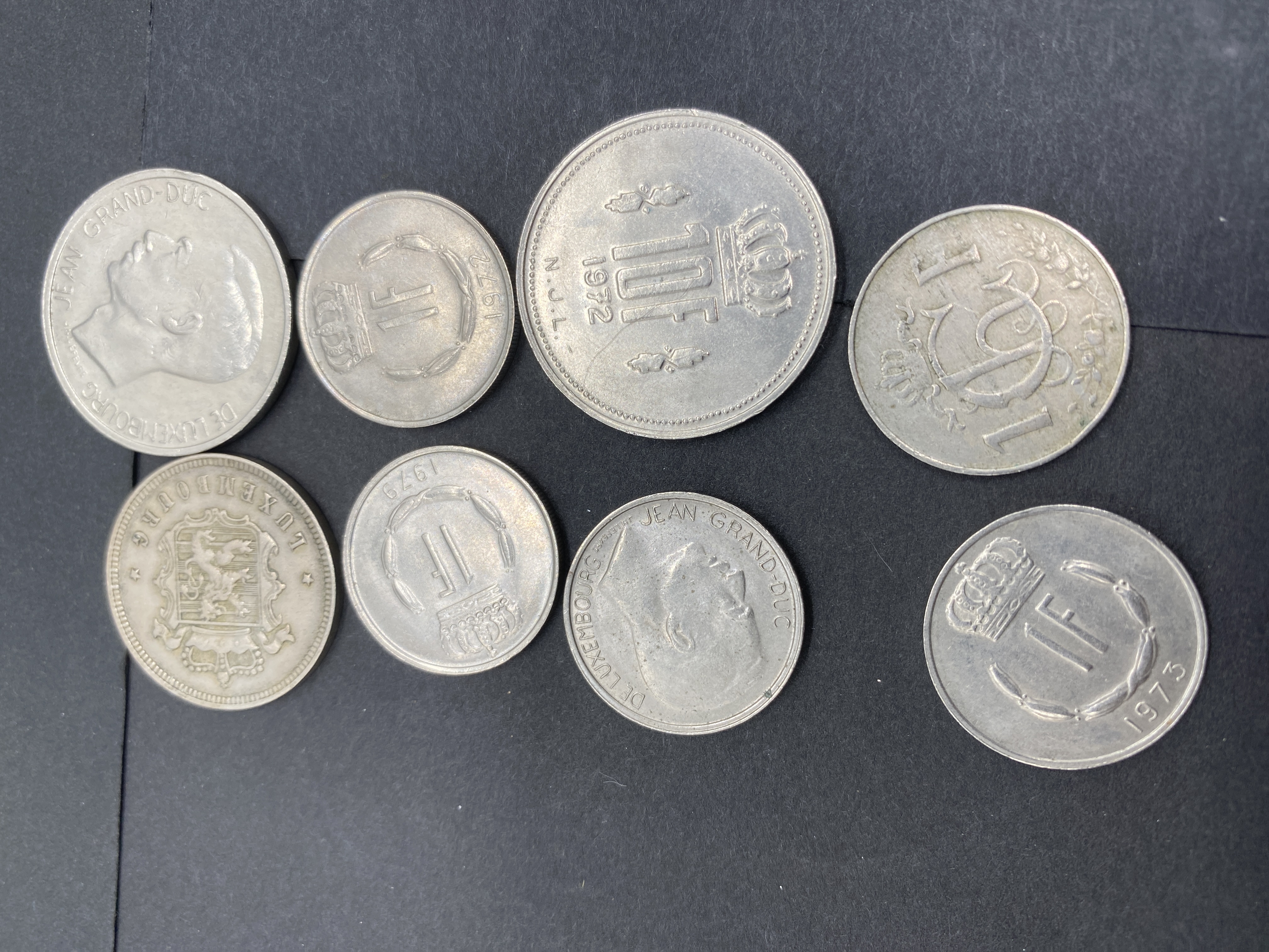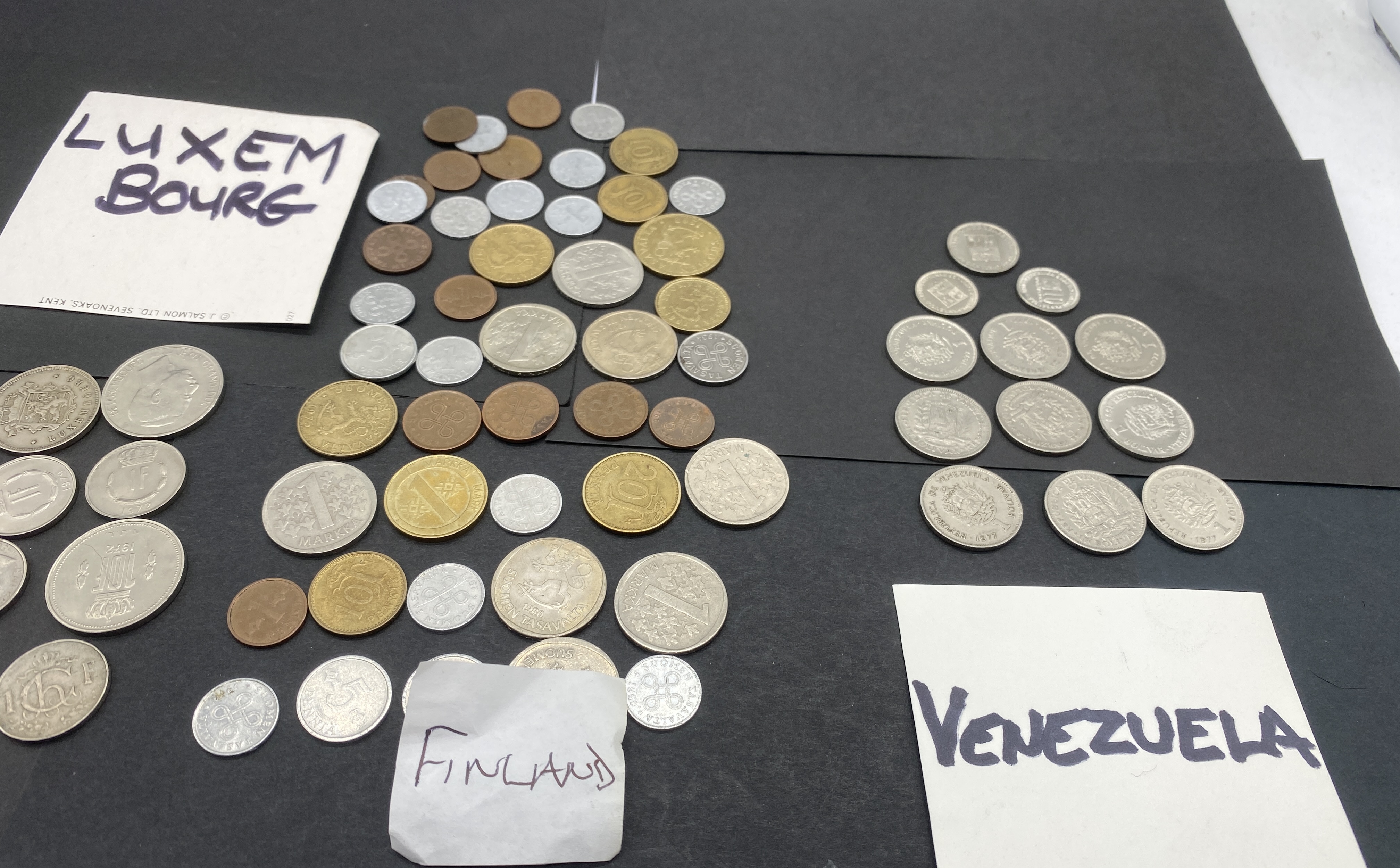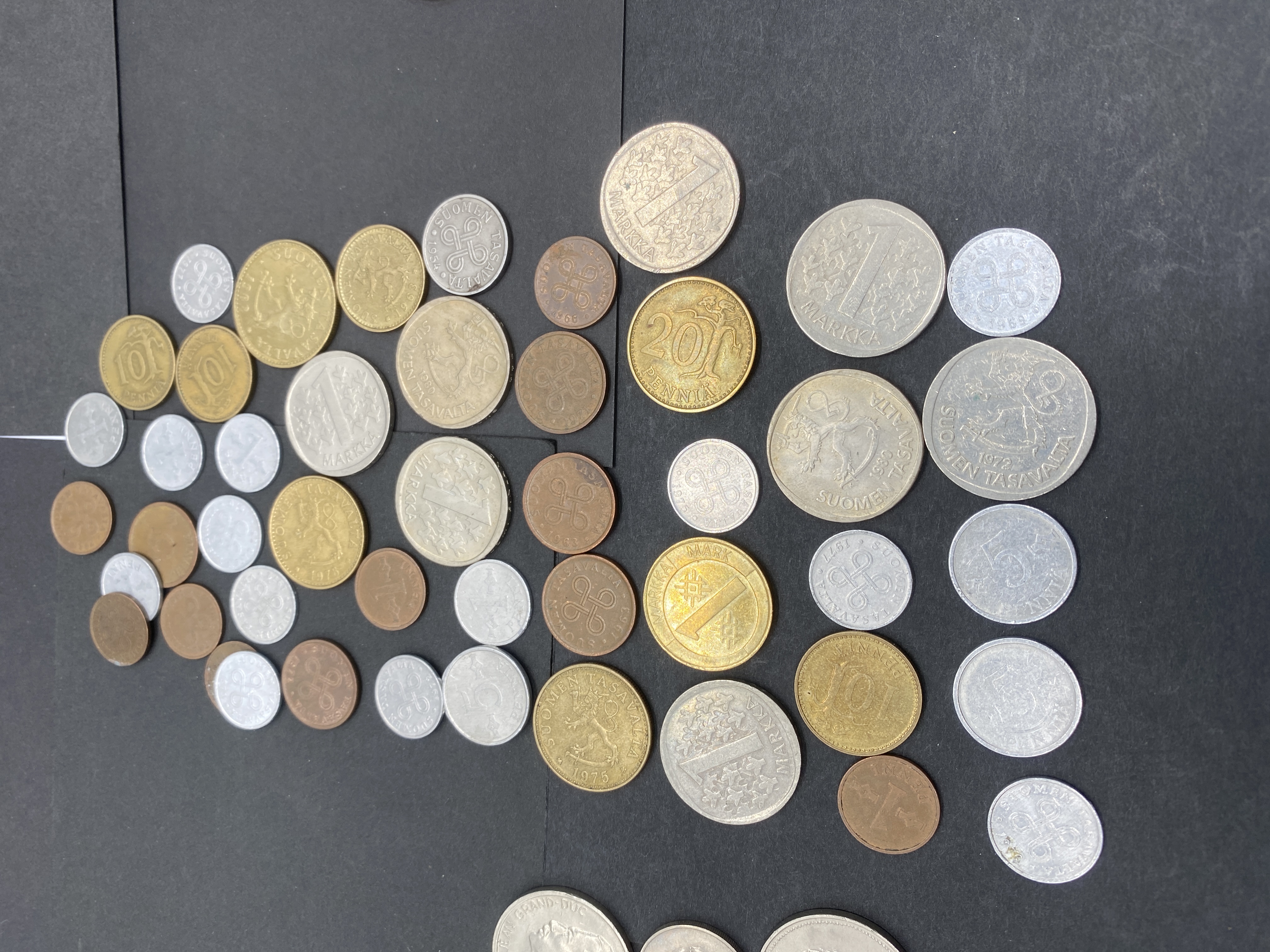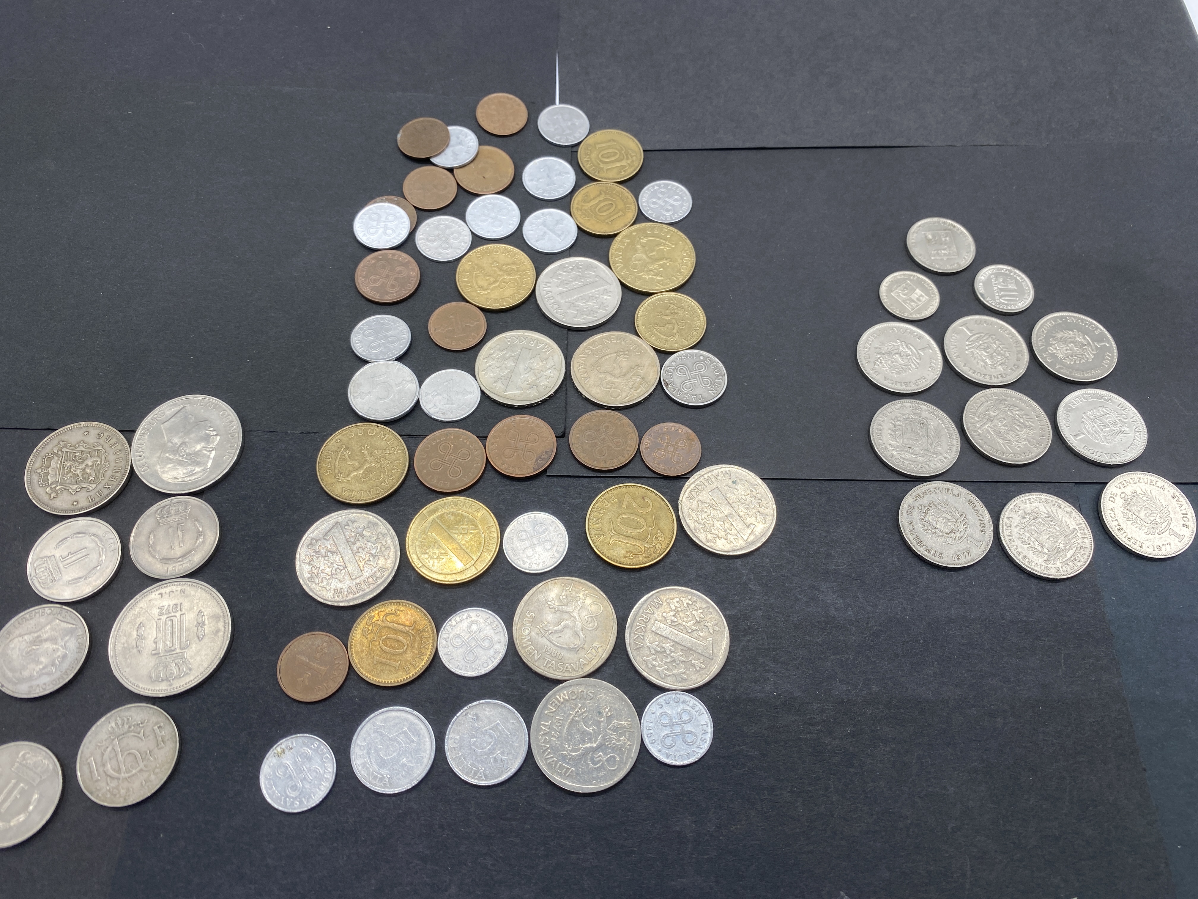 Collection of assorted vintage silver and gold-colored coins from Luxembourg, Finland, and Venezuela.