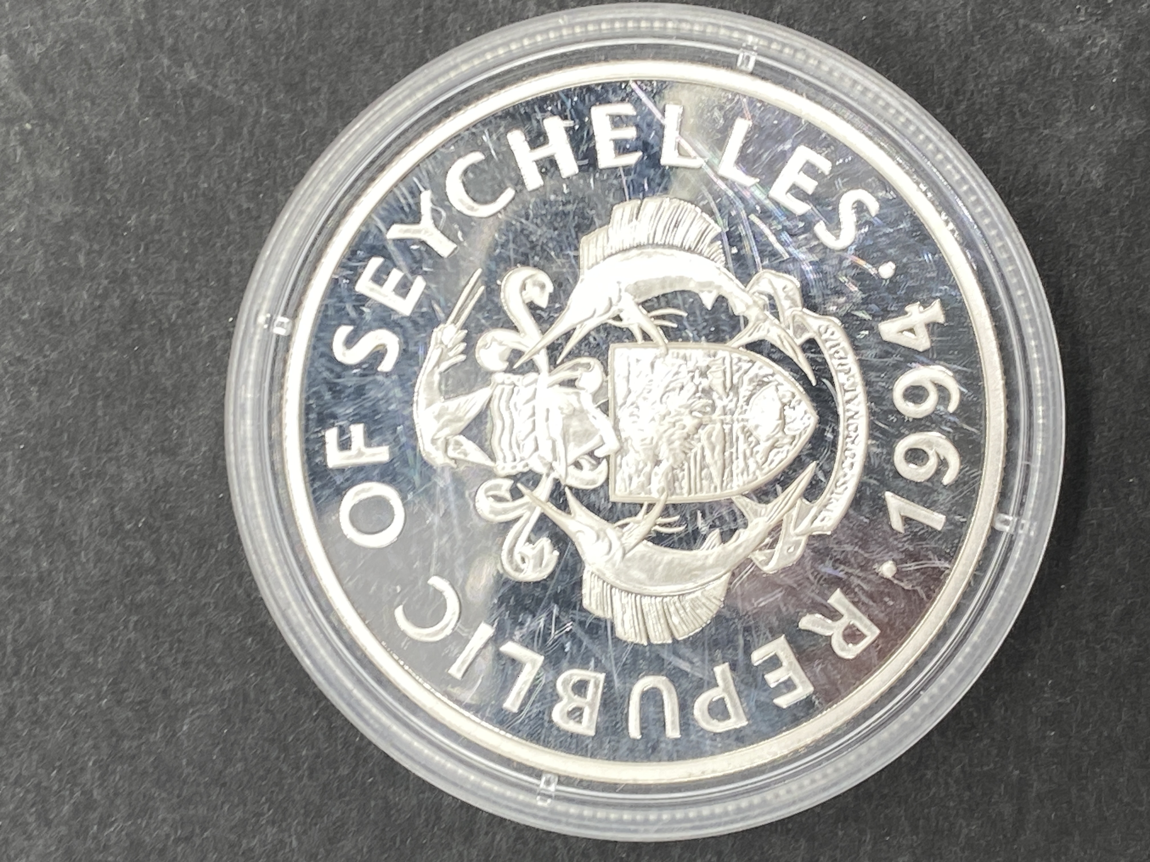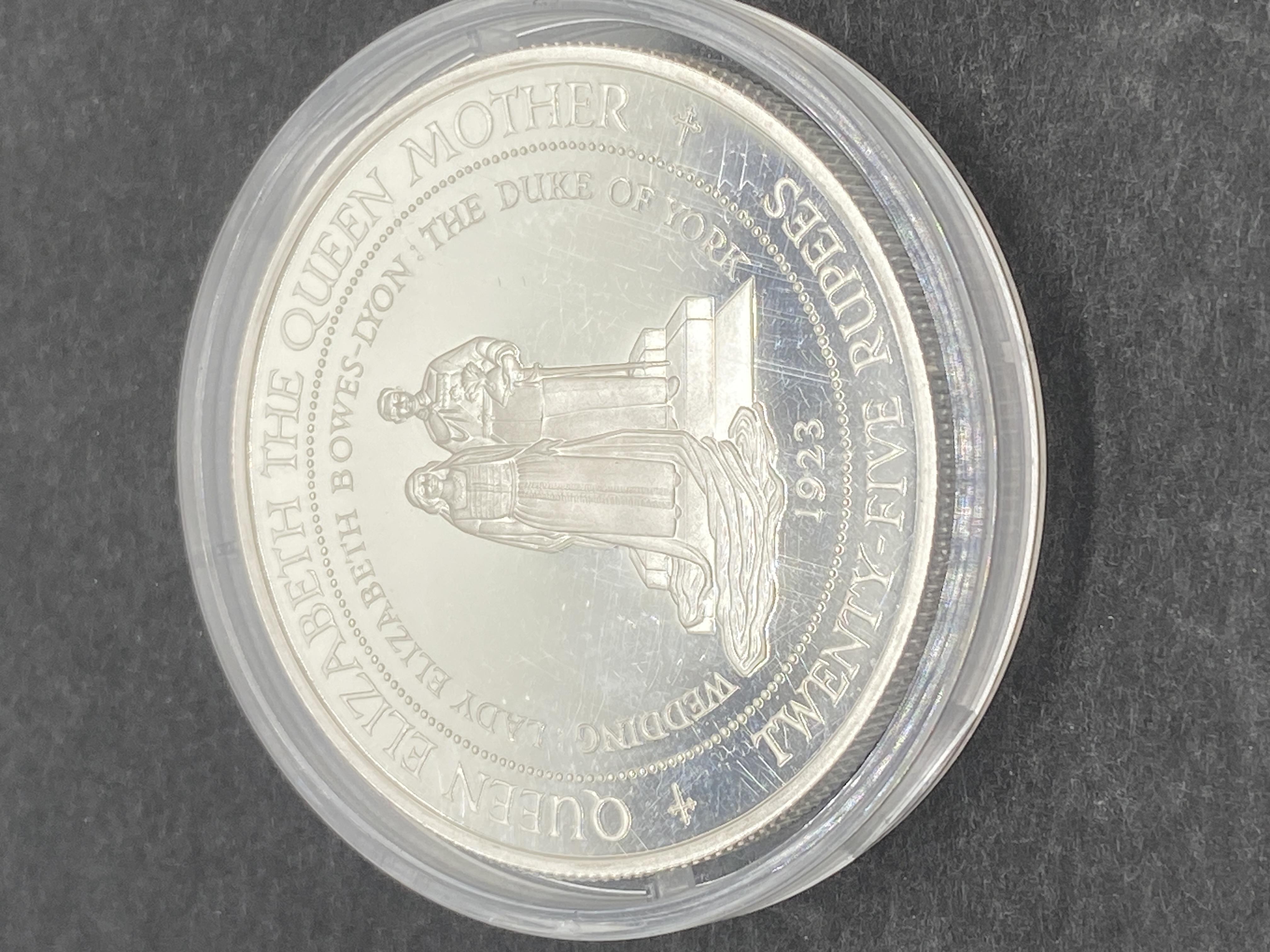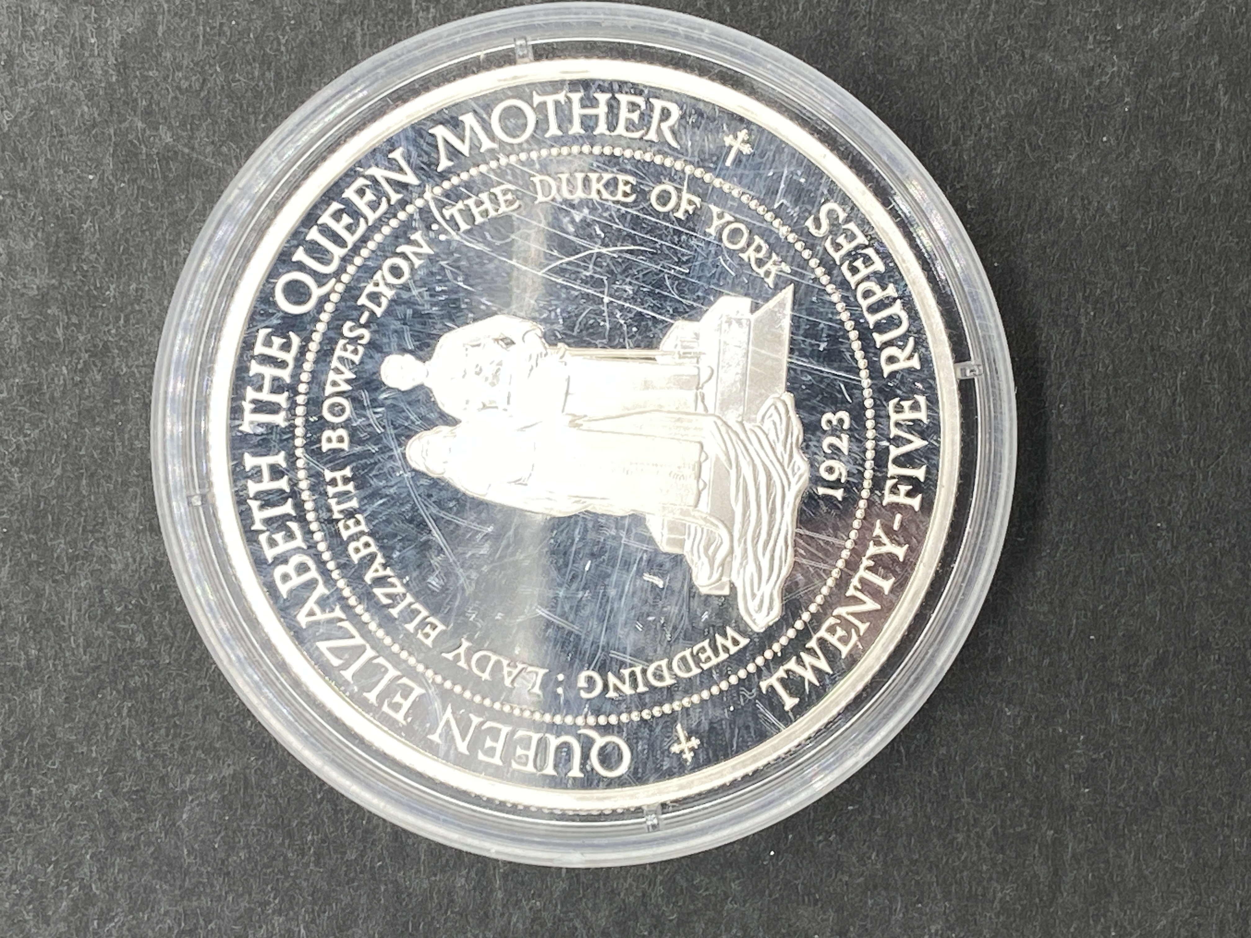 A 1994 Seychelles silver proof commemorative coin featuring Queen Elizabeth Bowes-Lyon and the Duke of York’s wedding in 1923.