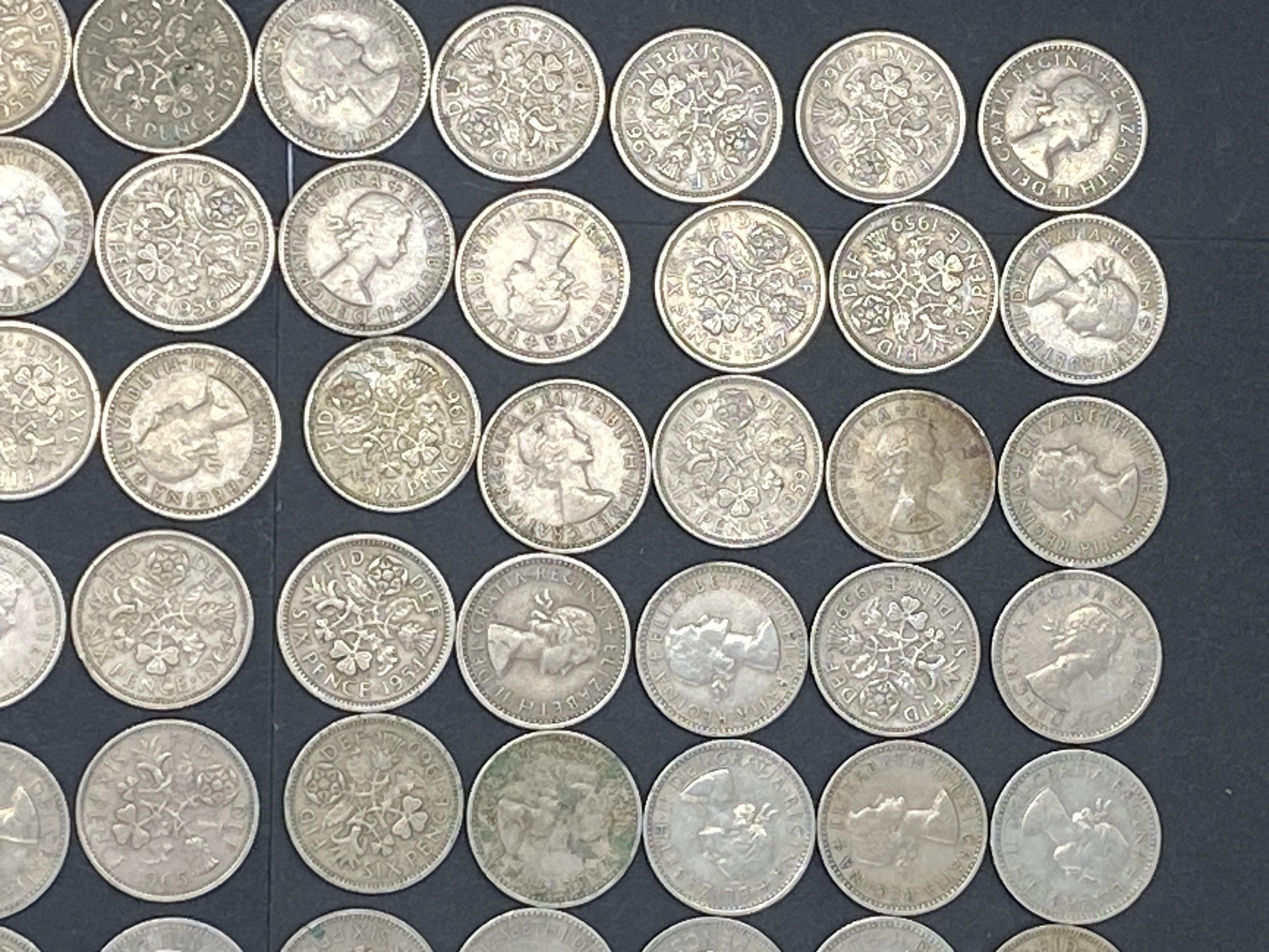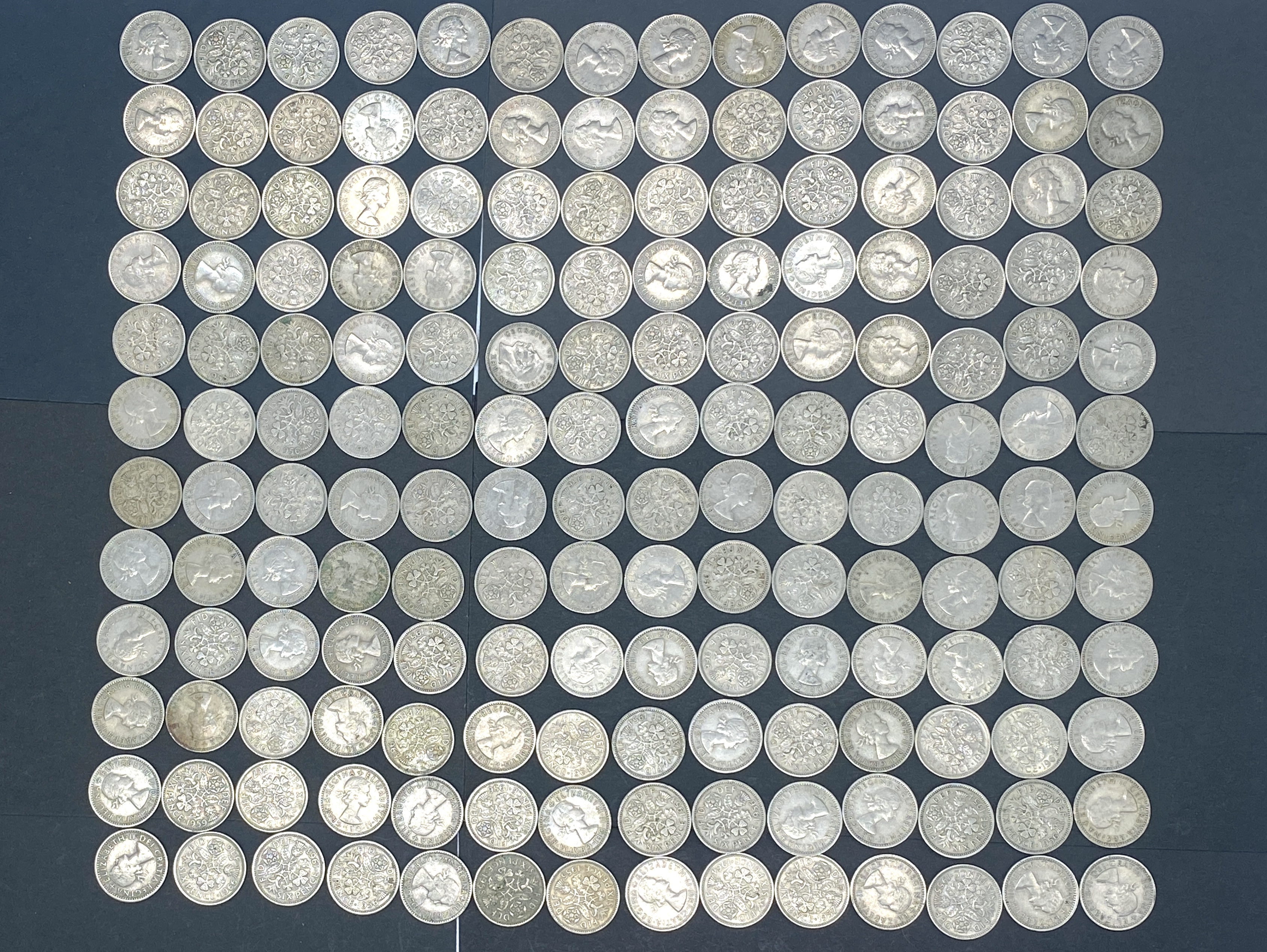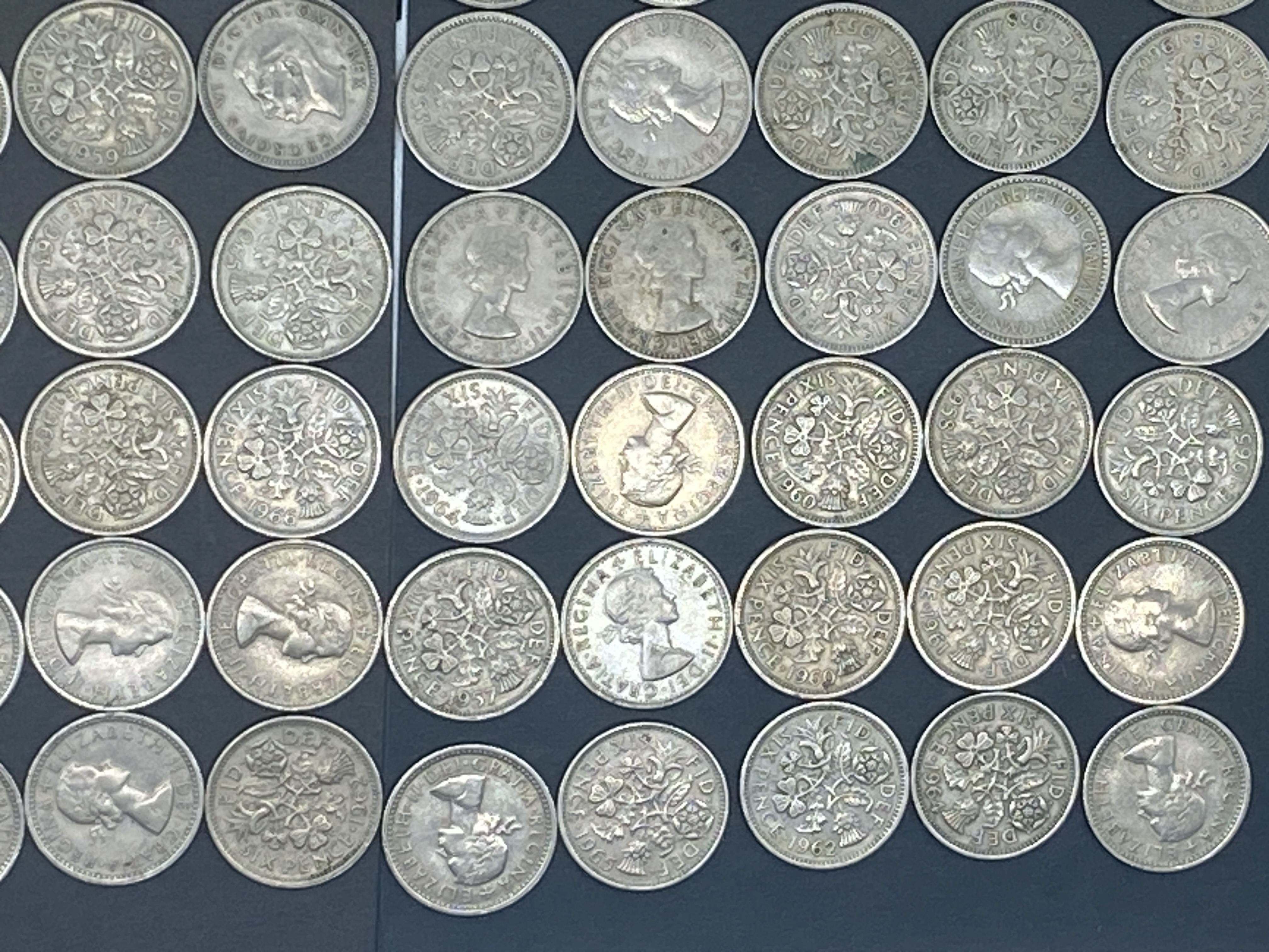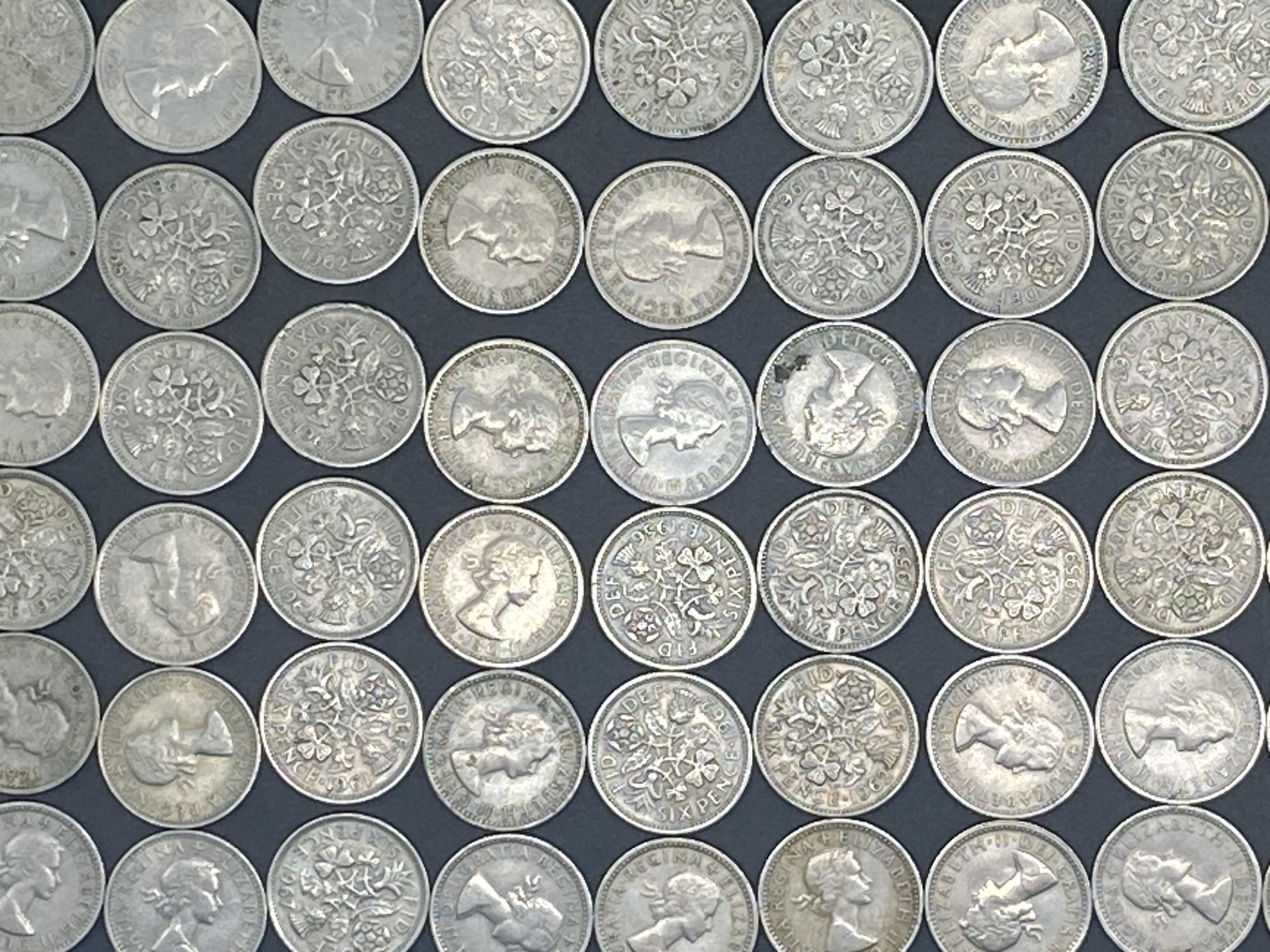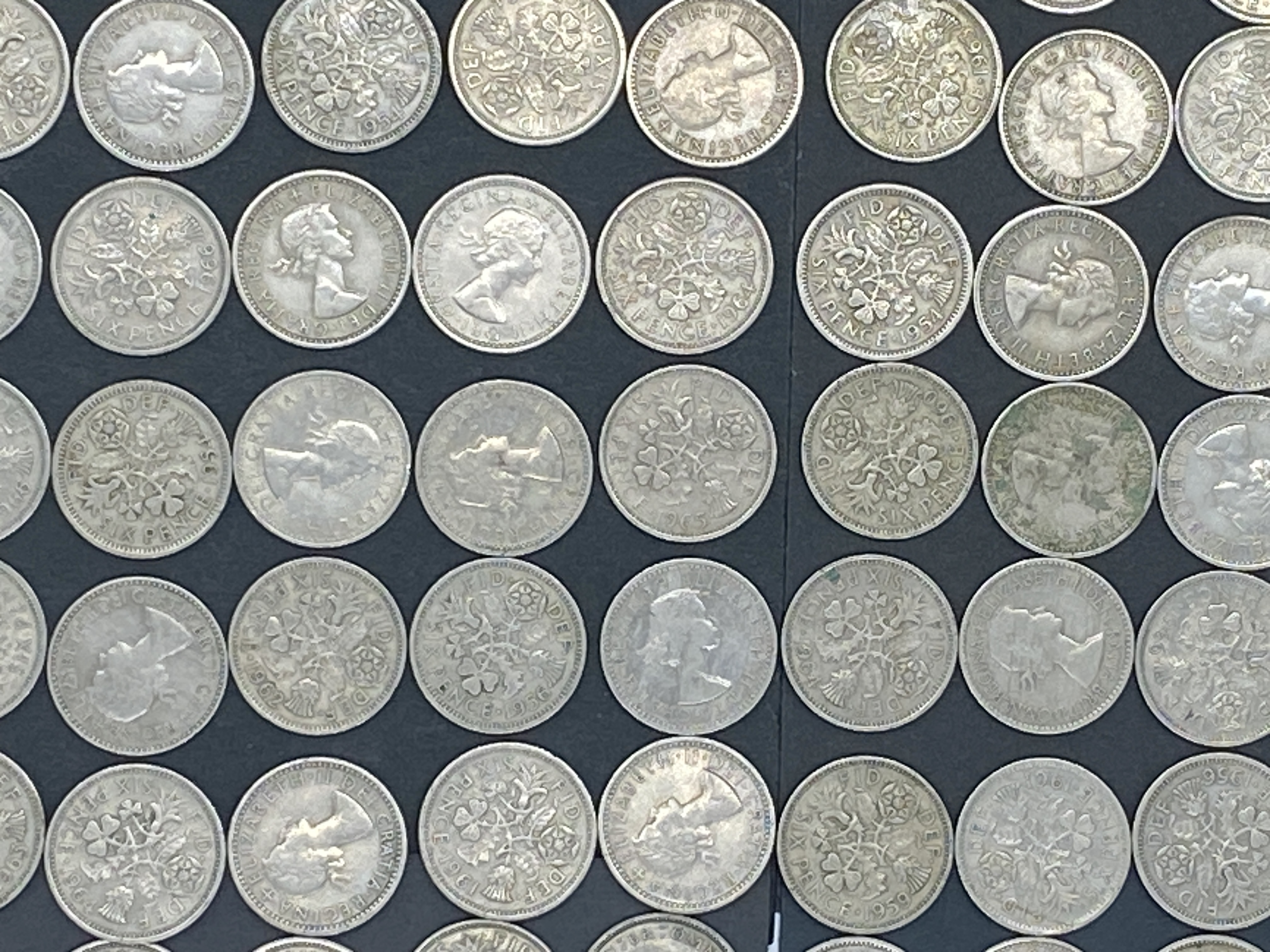A collection of silver Irish shillings featuring Queen Elizabeth II and a floral design.