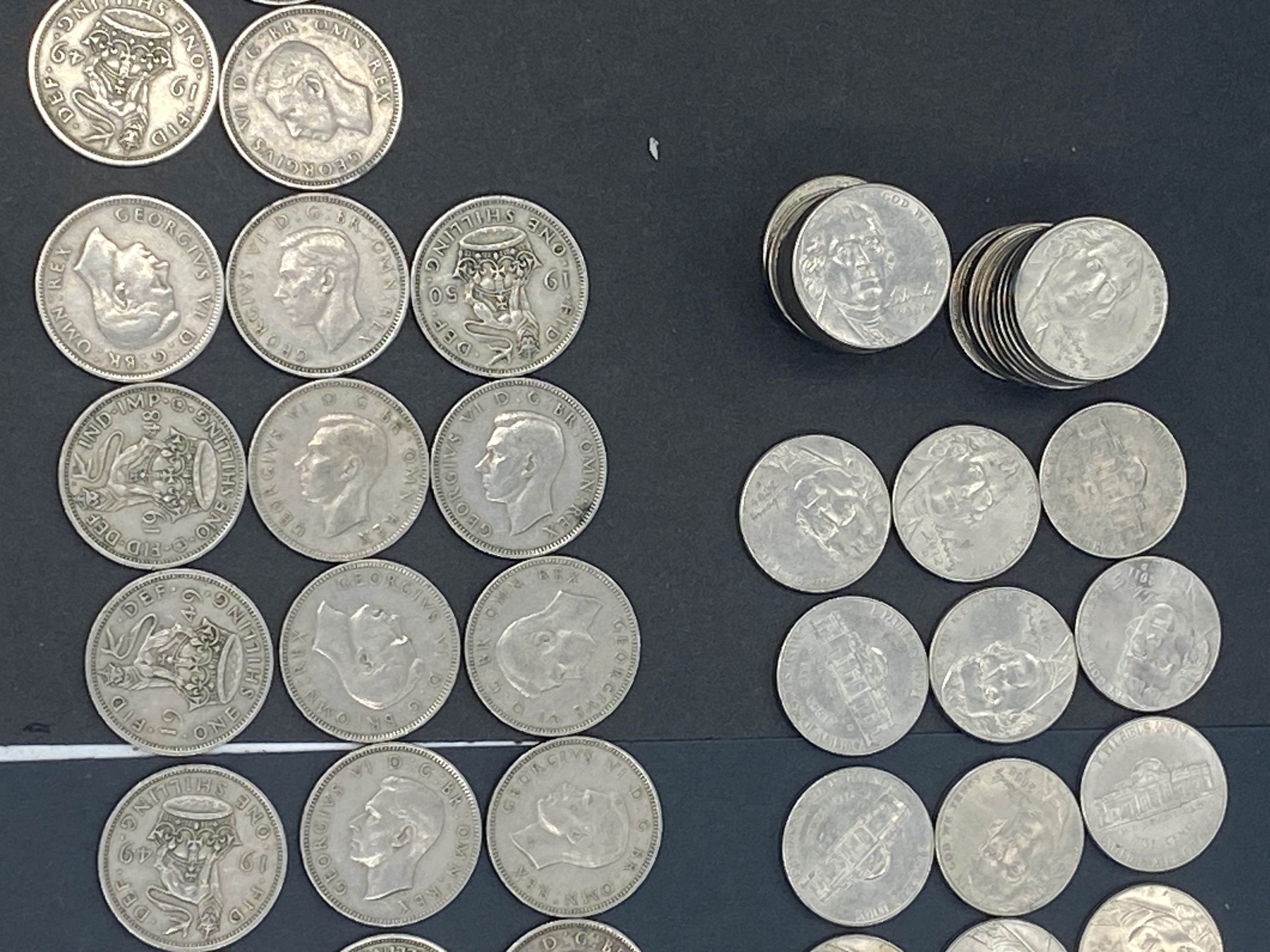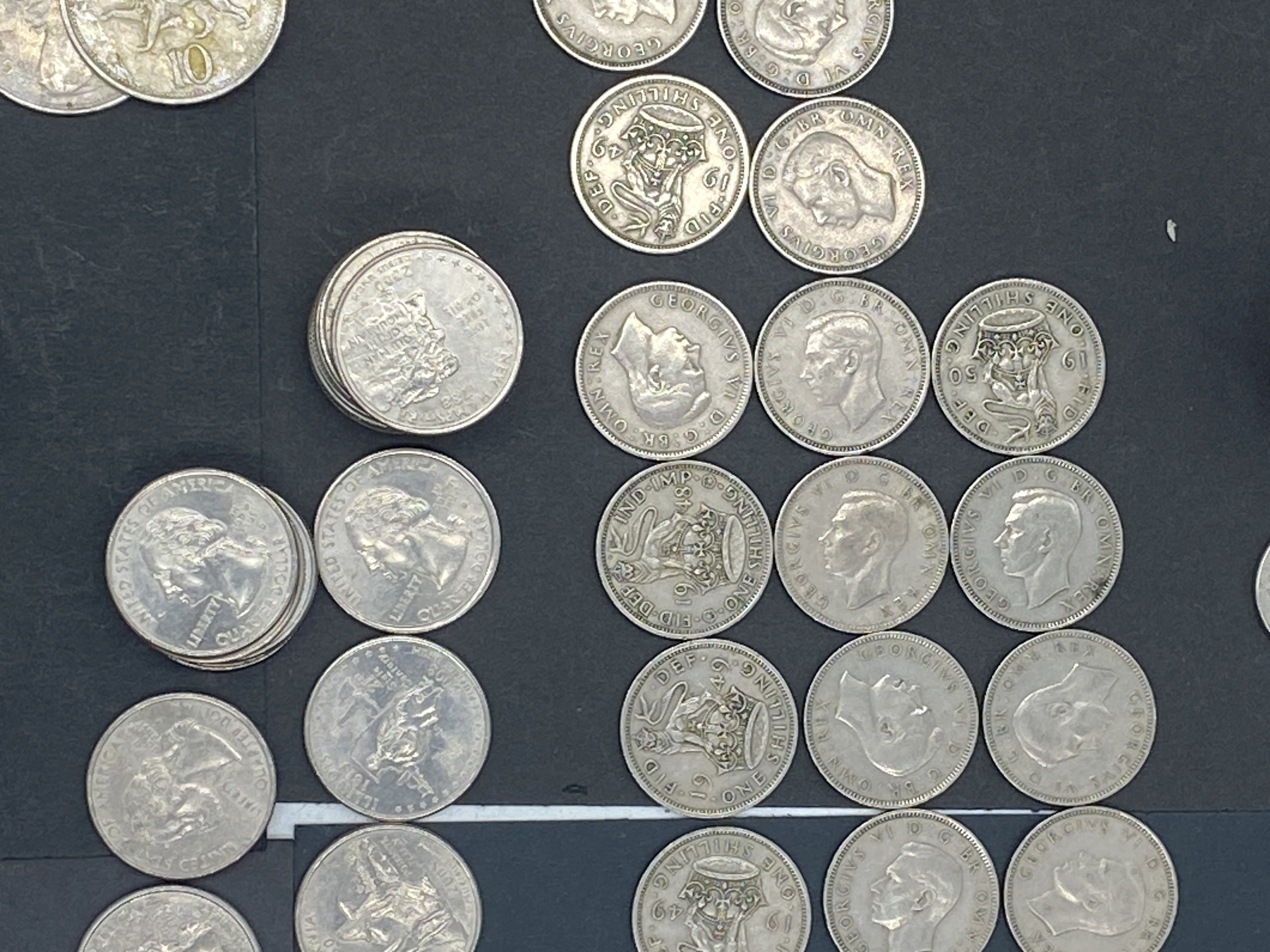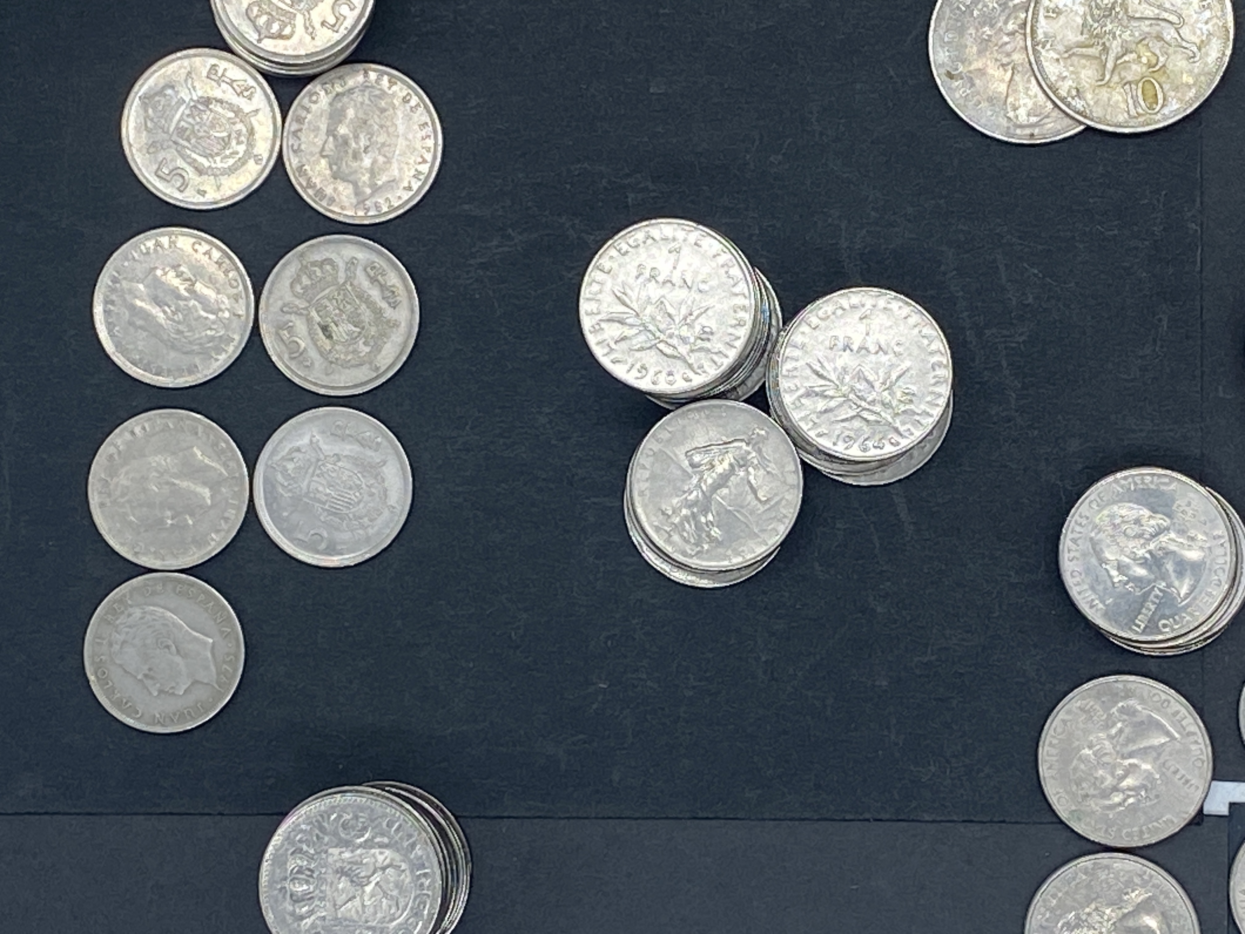 A collection of various silver-colored coins, including US and foreign currency.