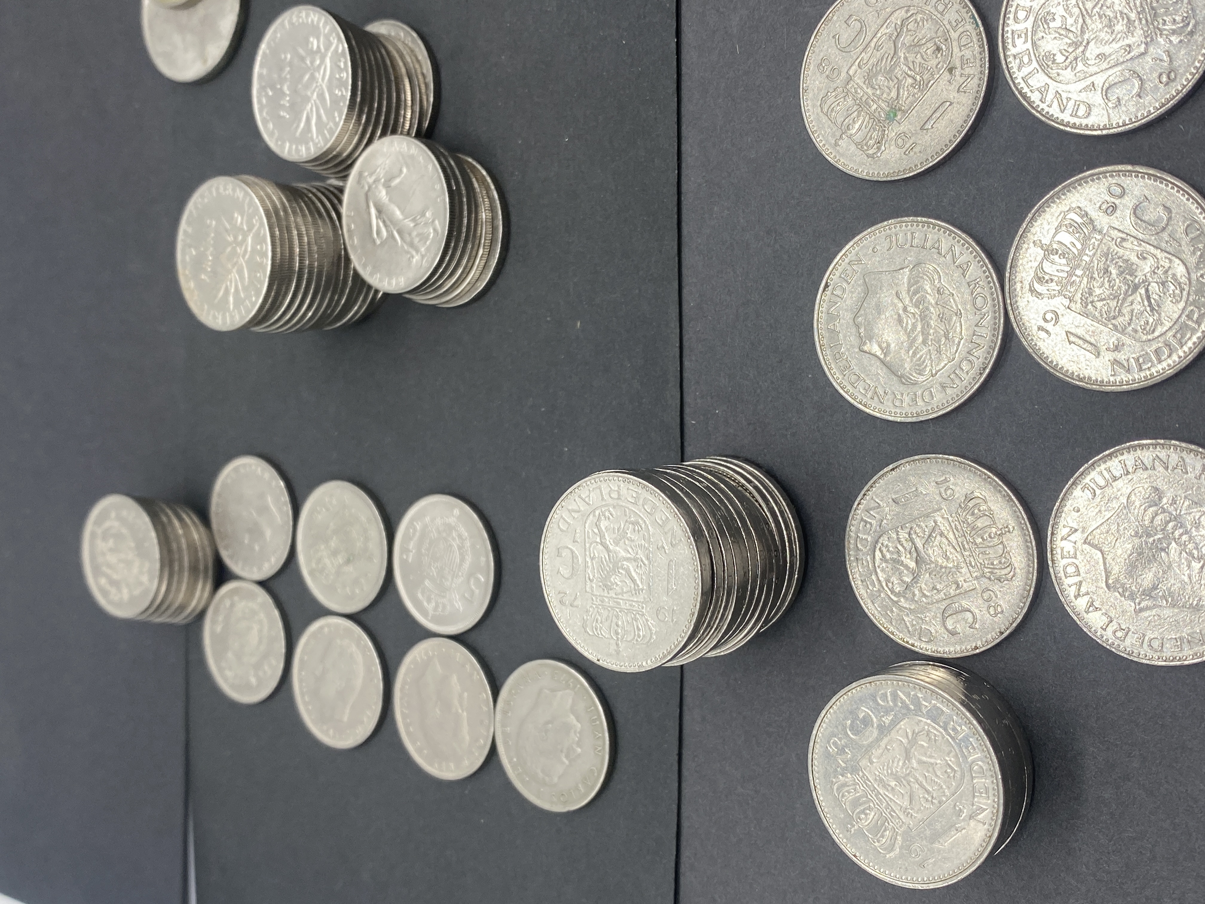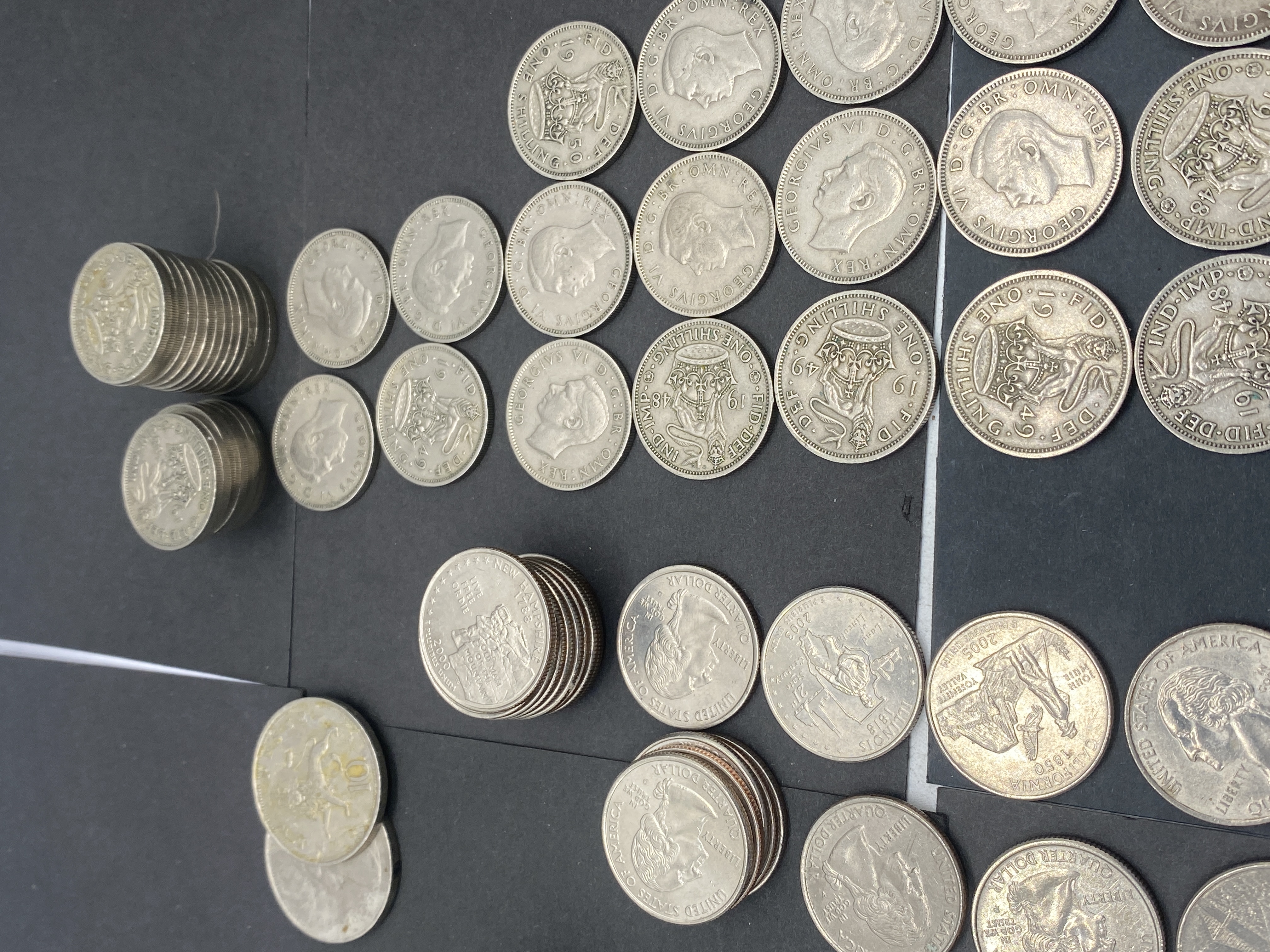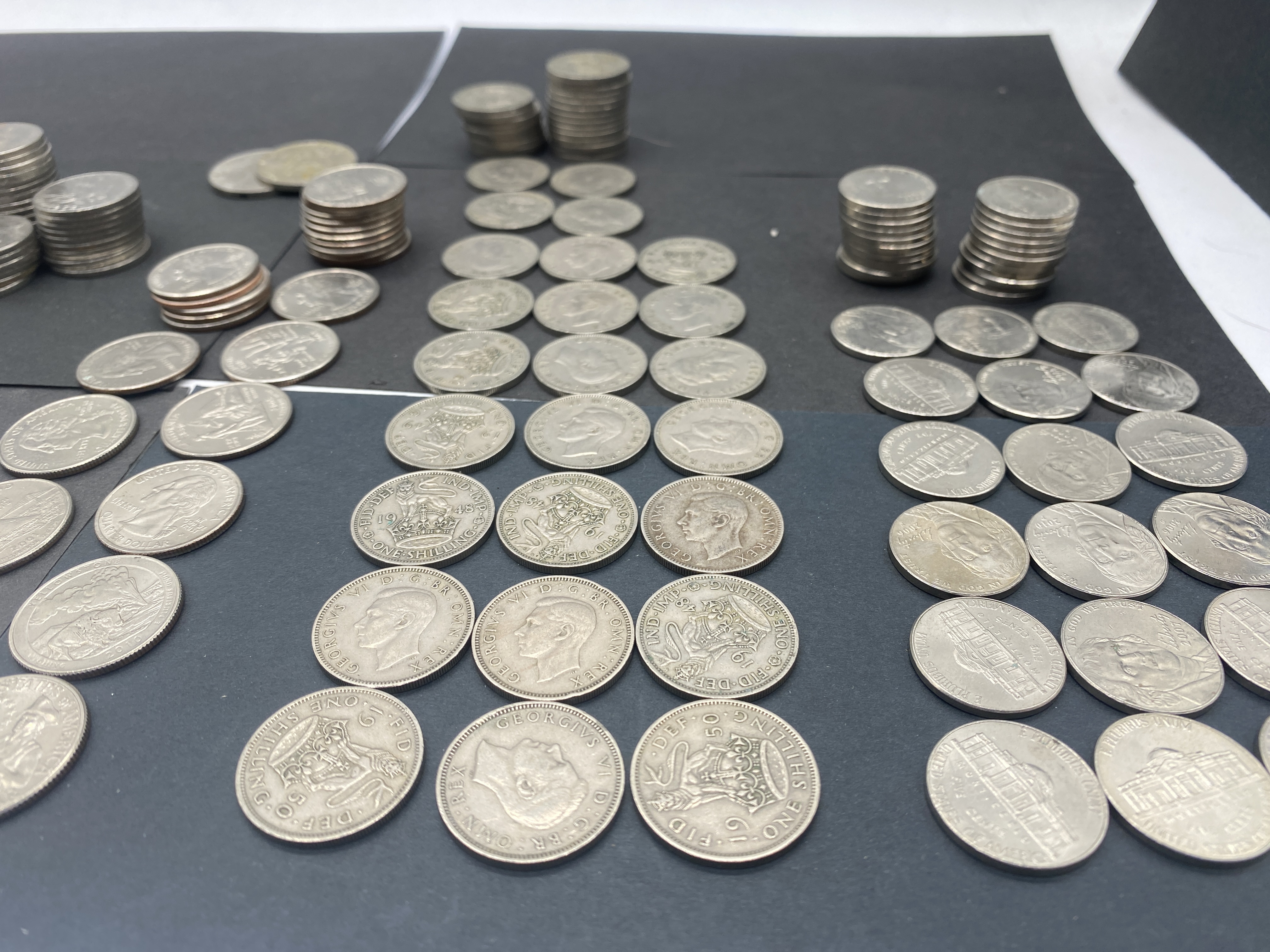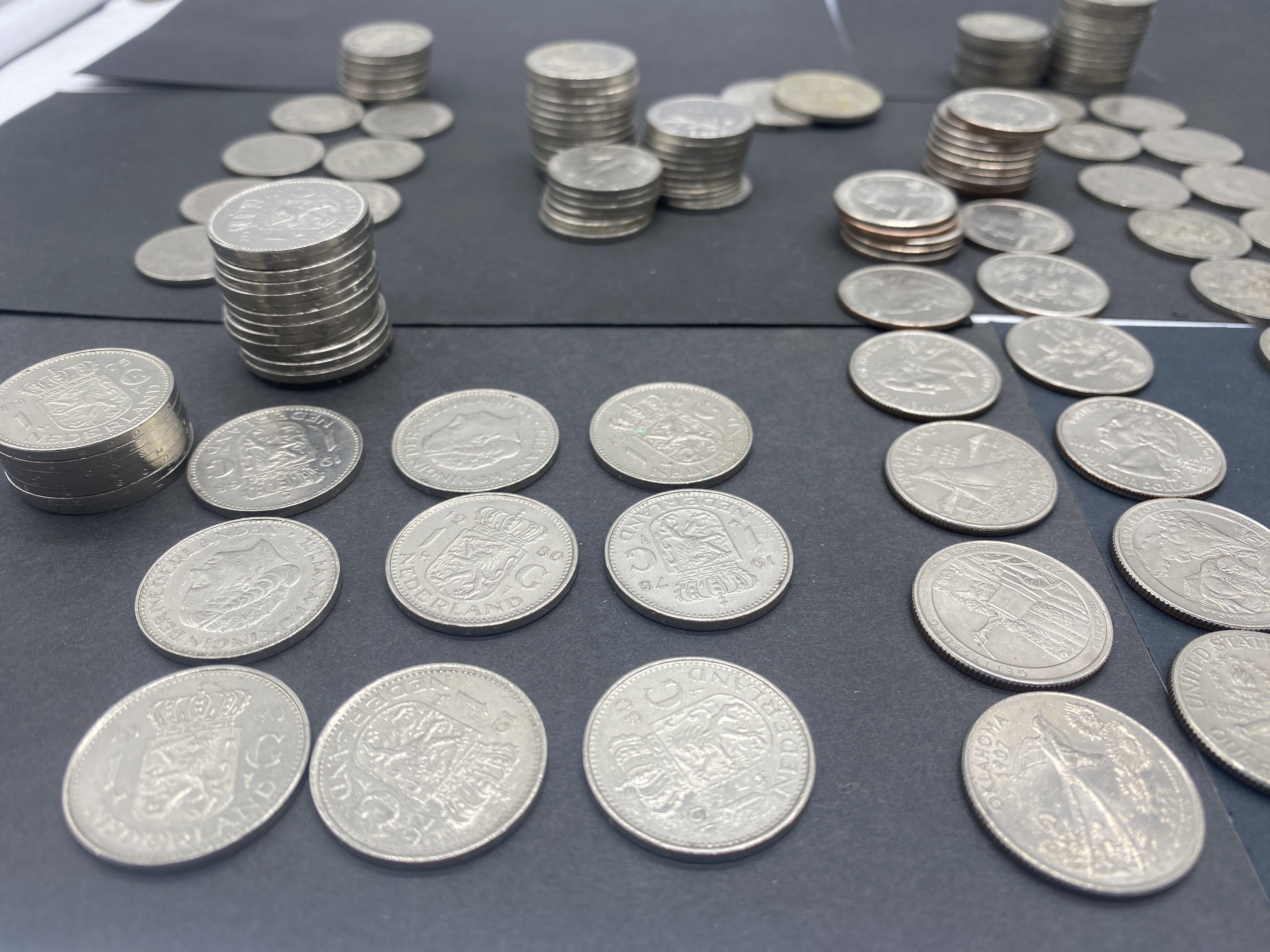 A collection of various silver-colored coins, including US and foreign currency.