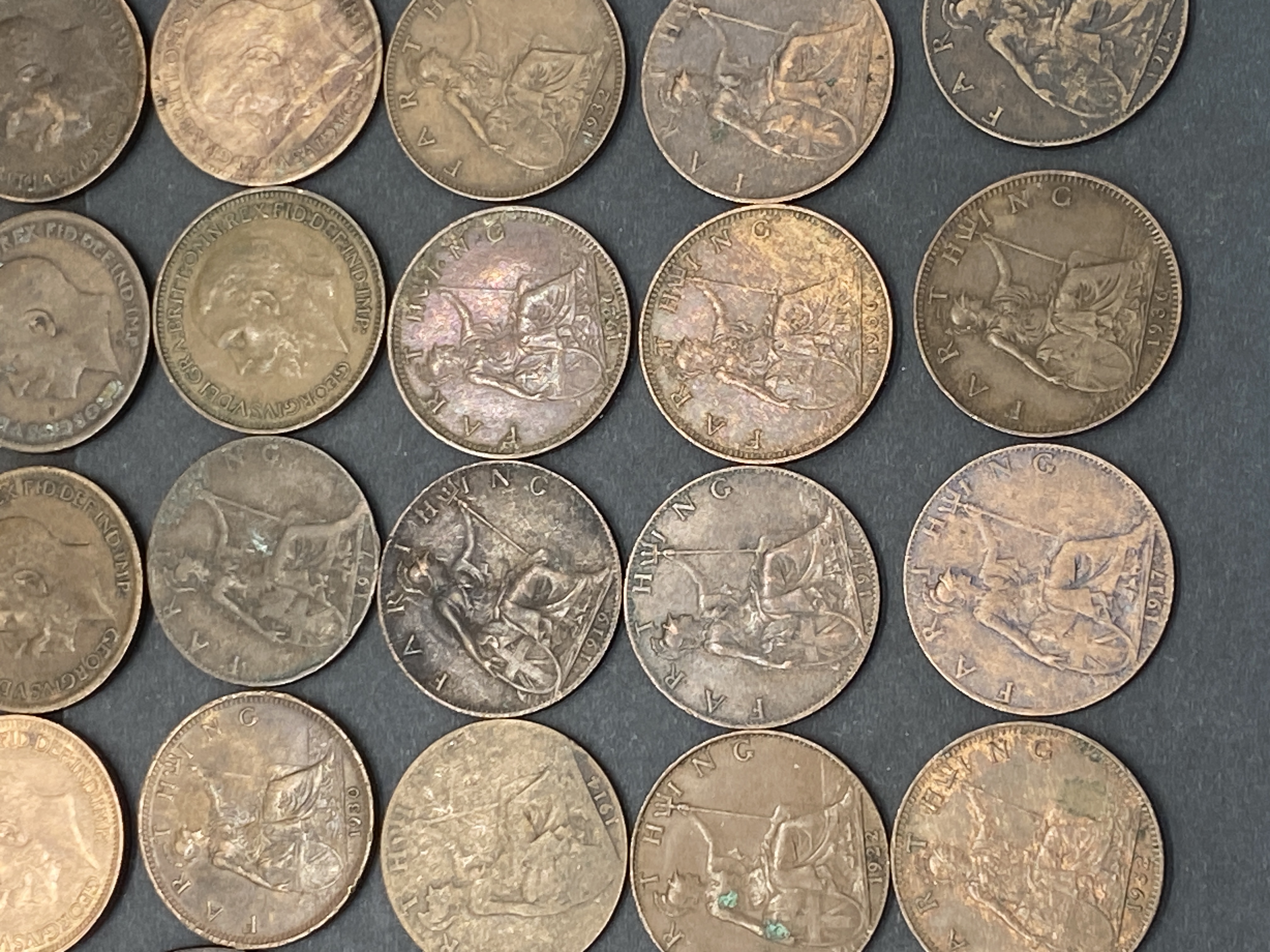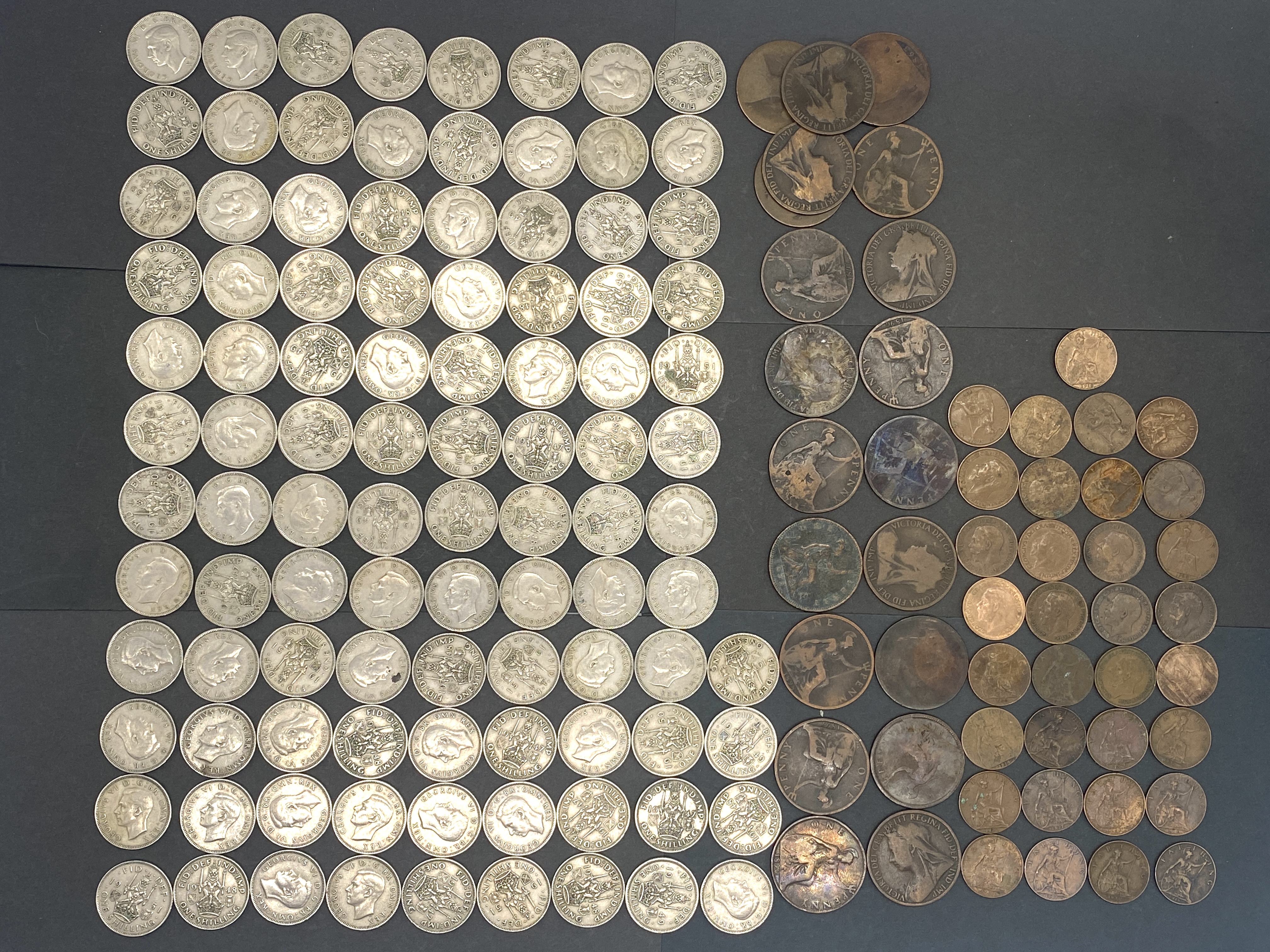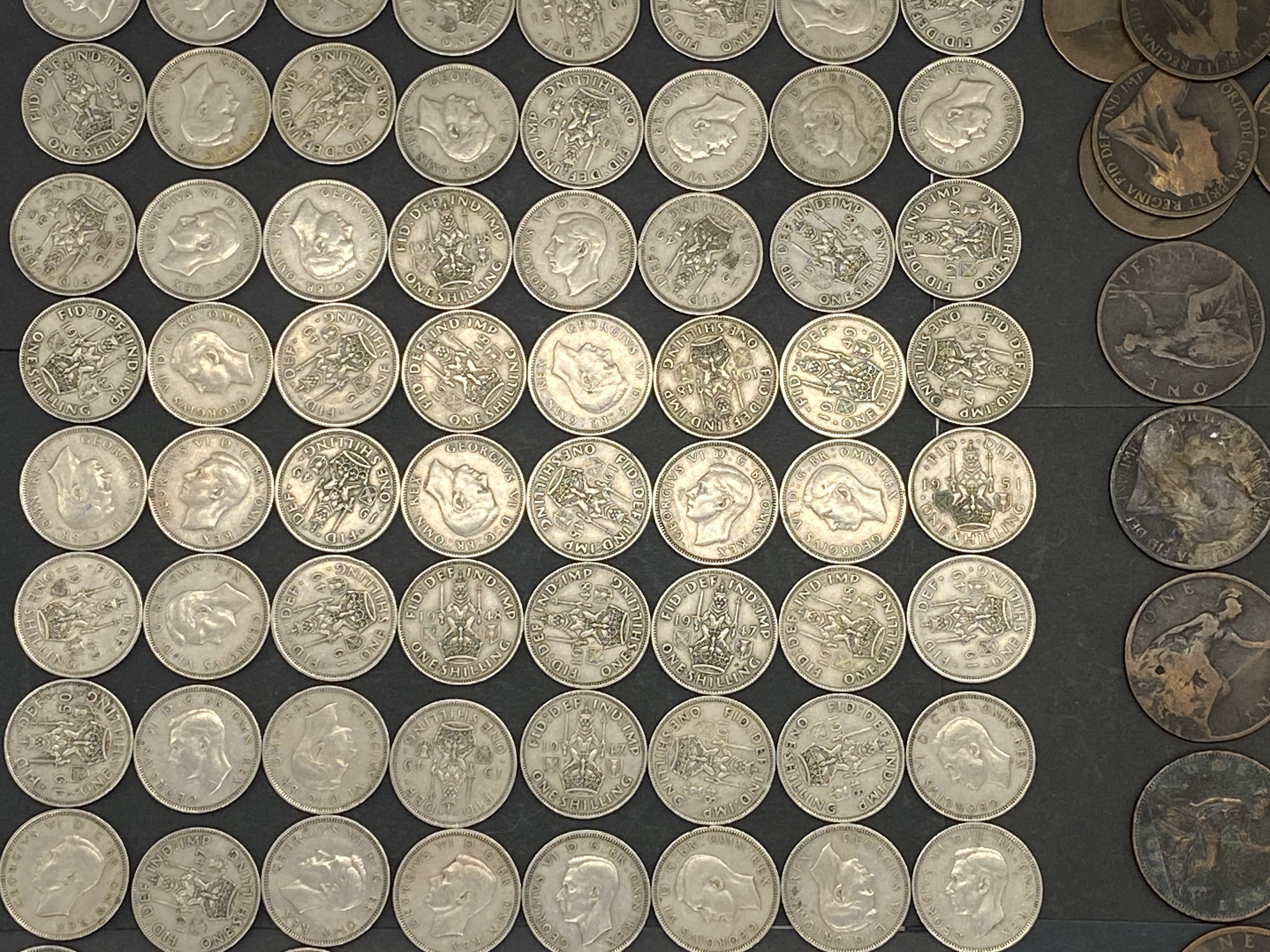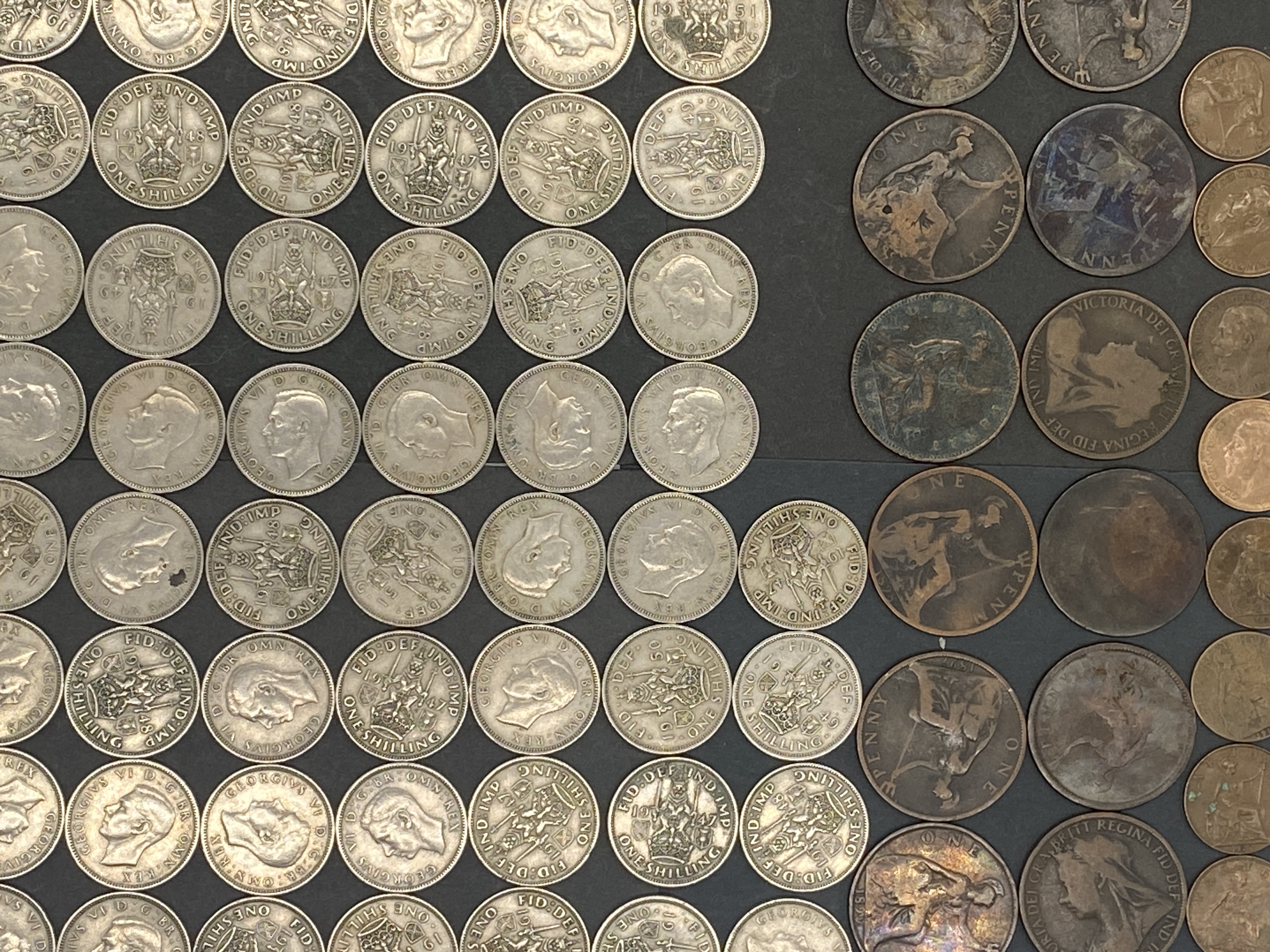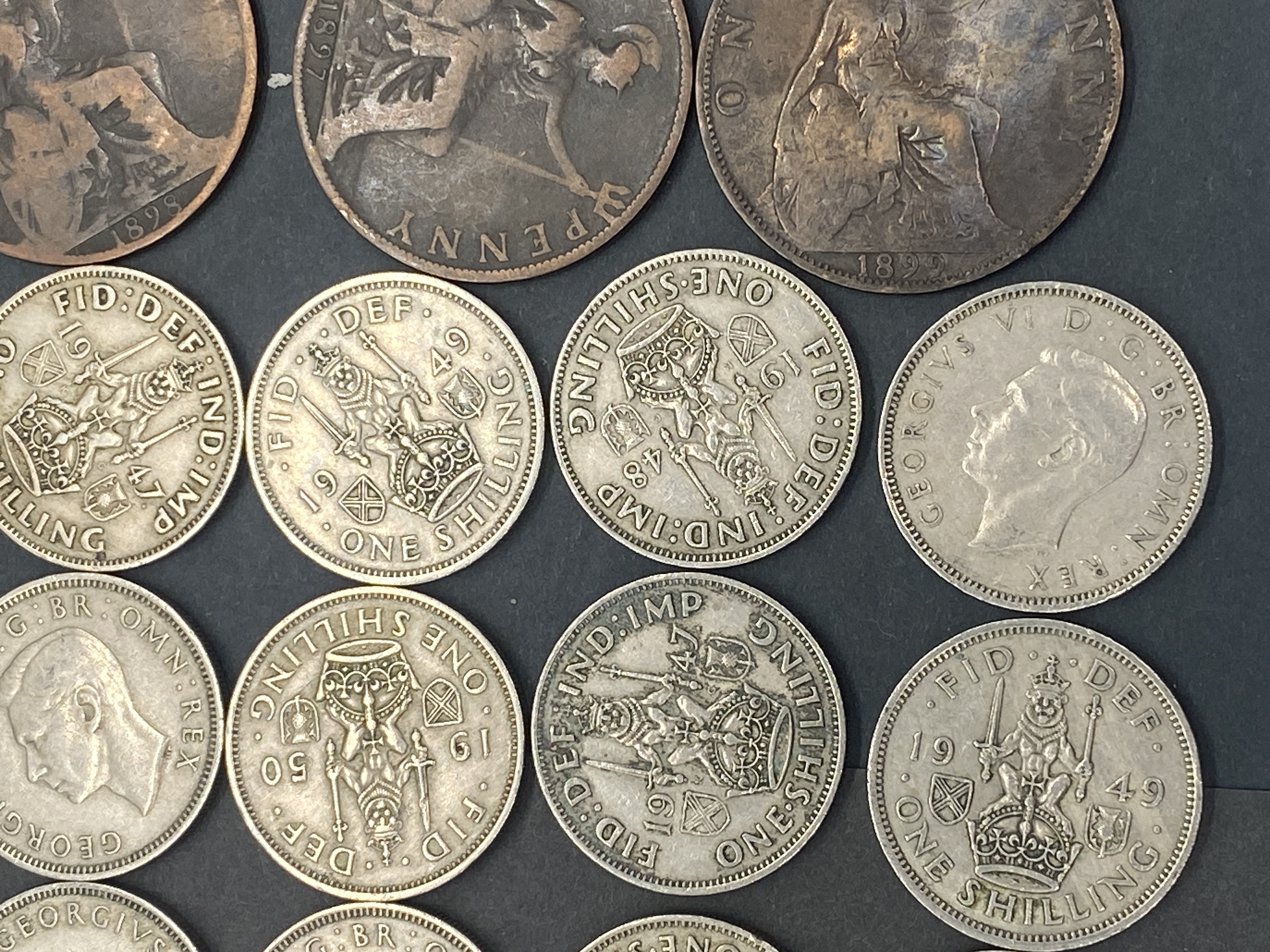 A collection of British silver shillings and bronze/copper pence.