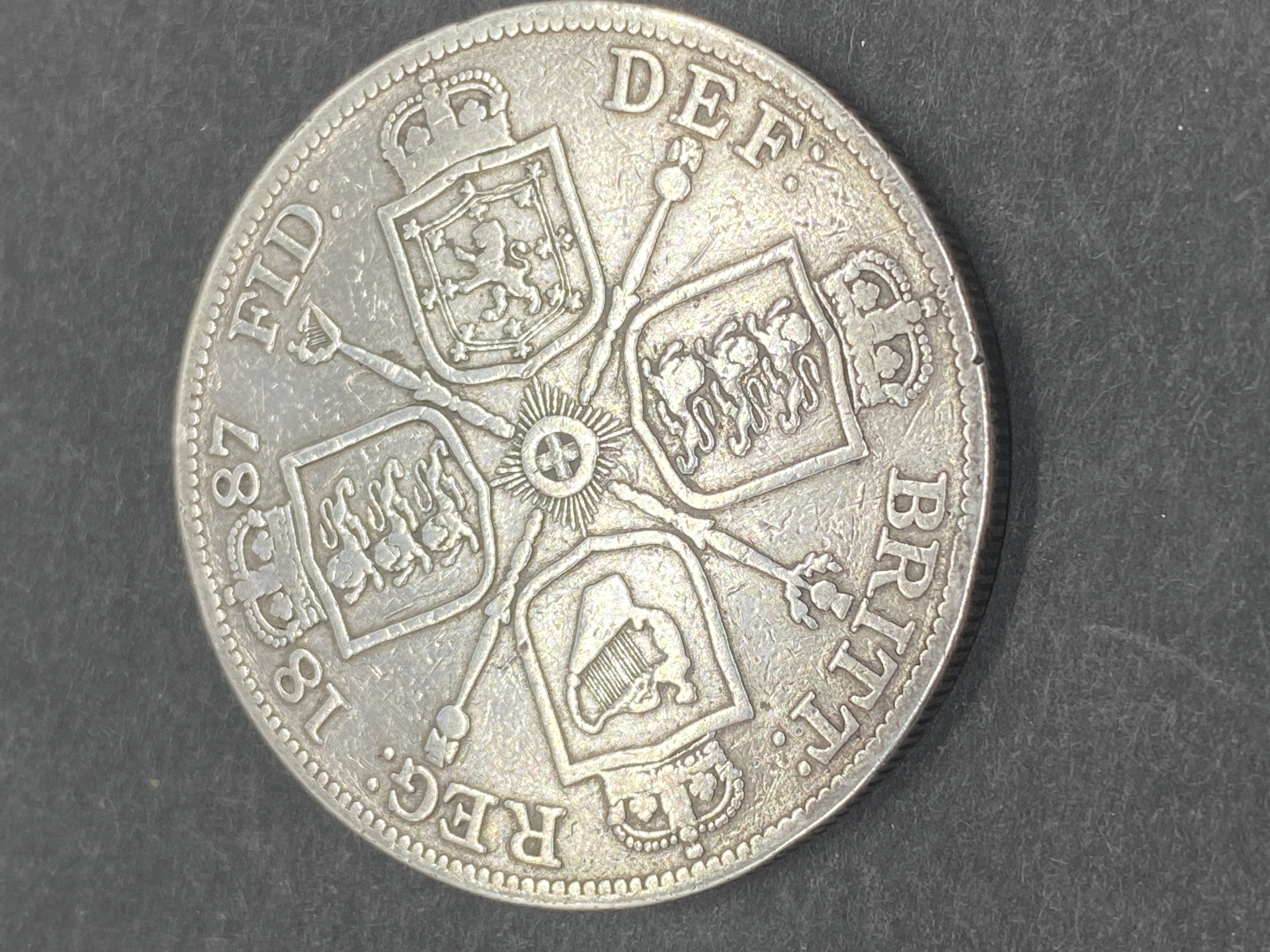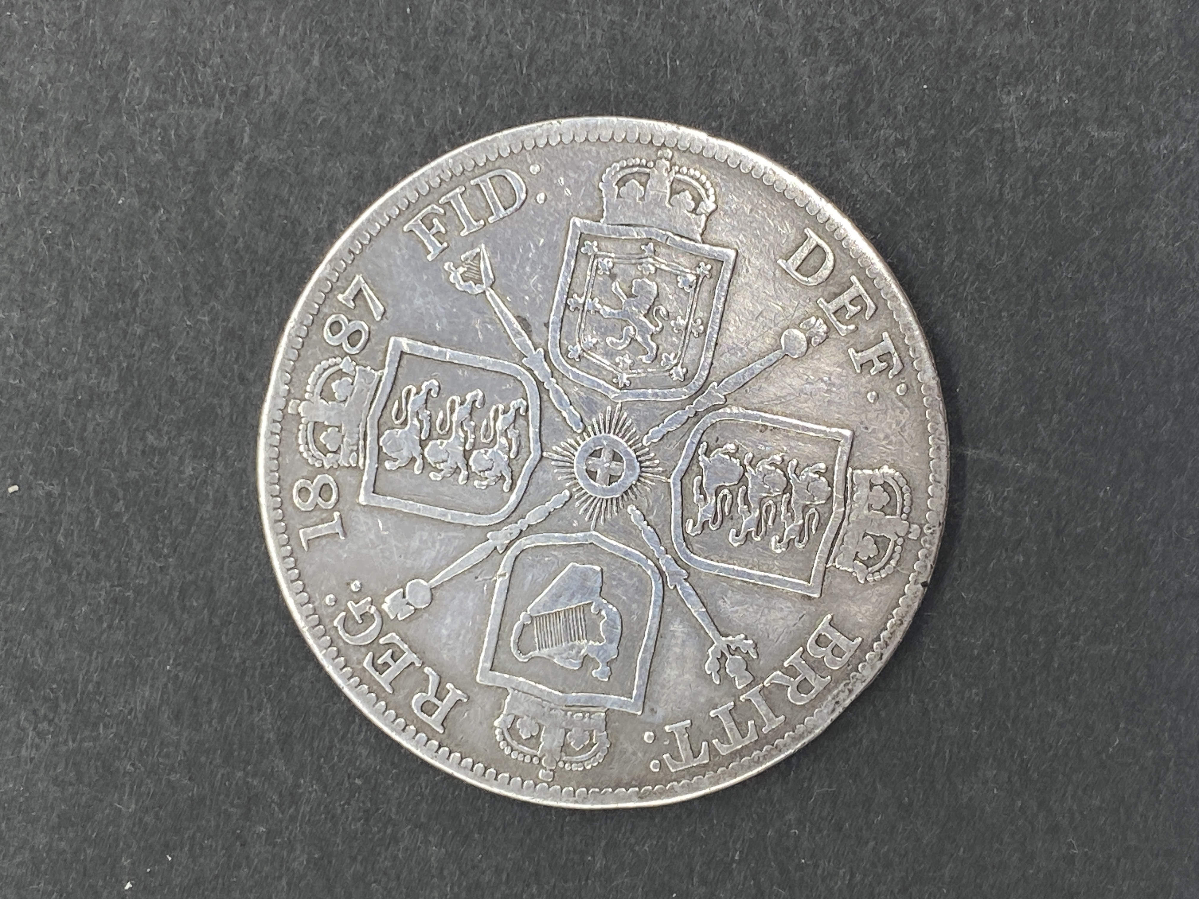 Silver double florin coin from 1887, featuring Queen Victoria.