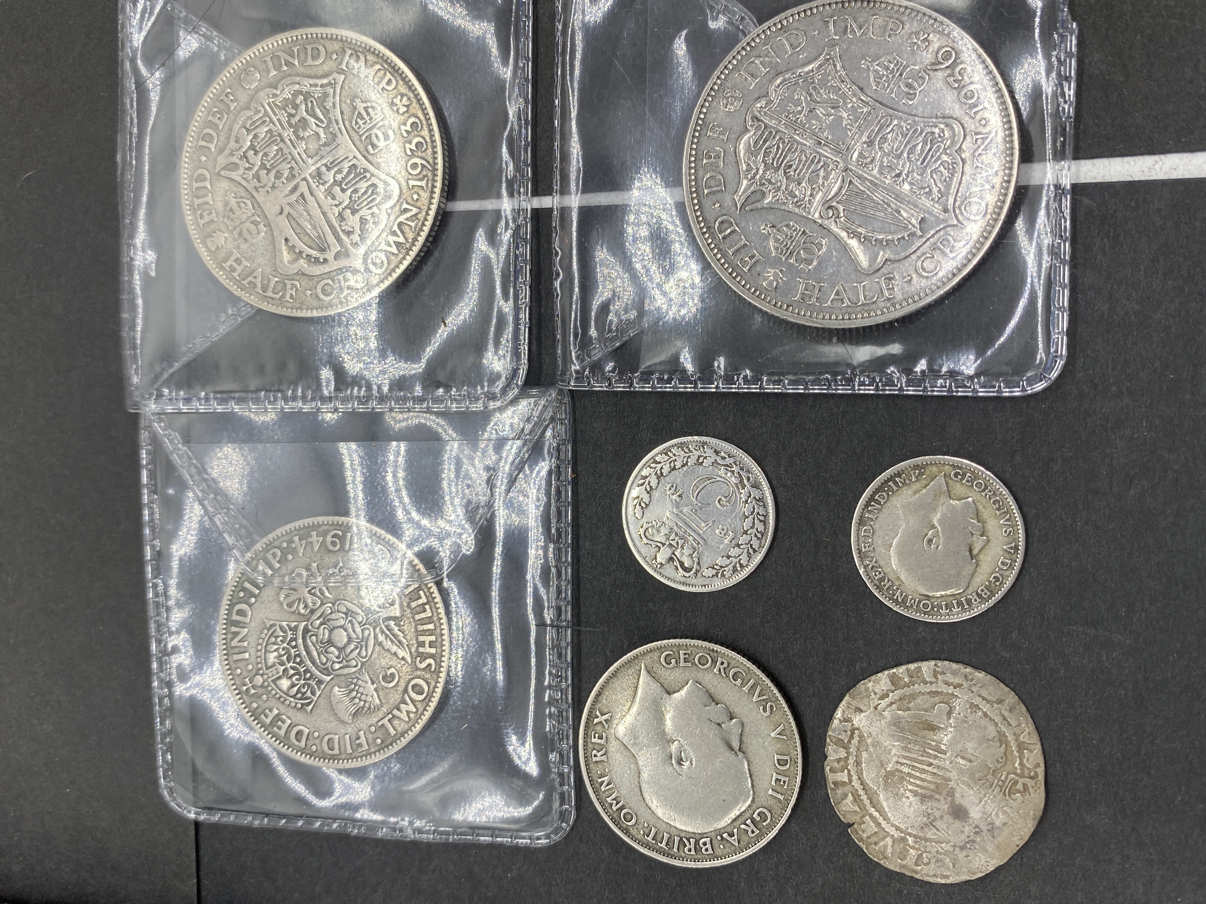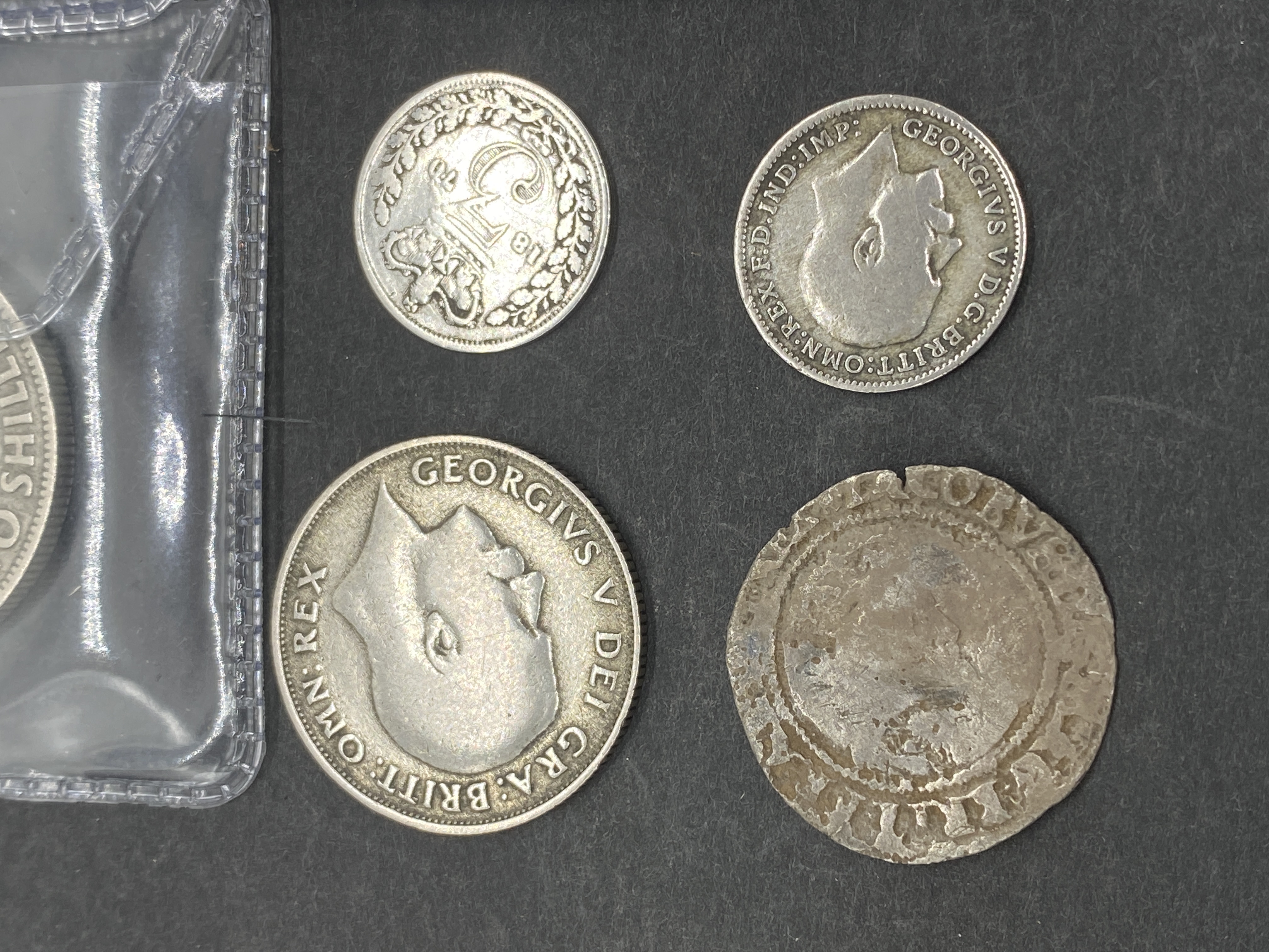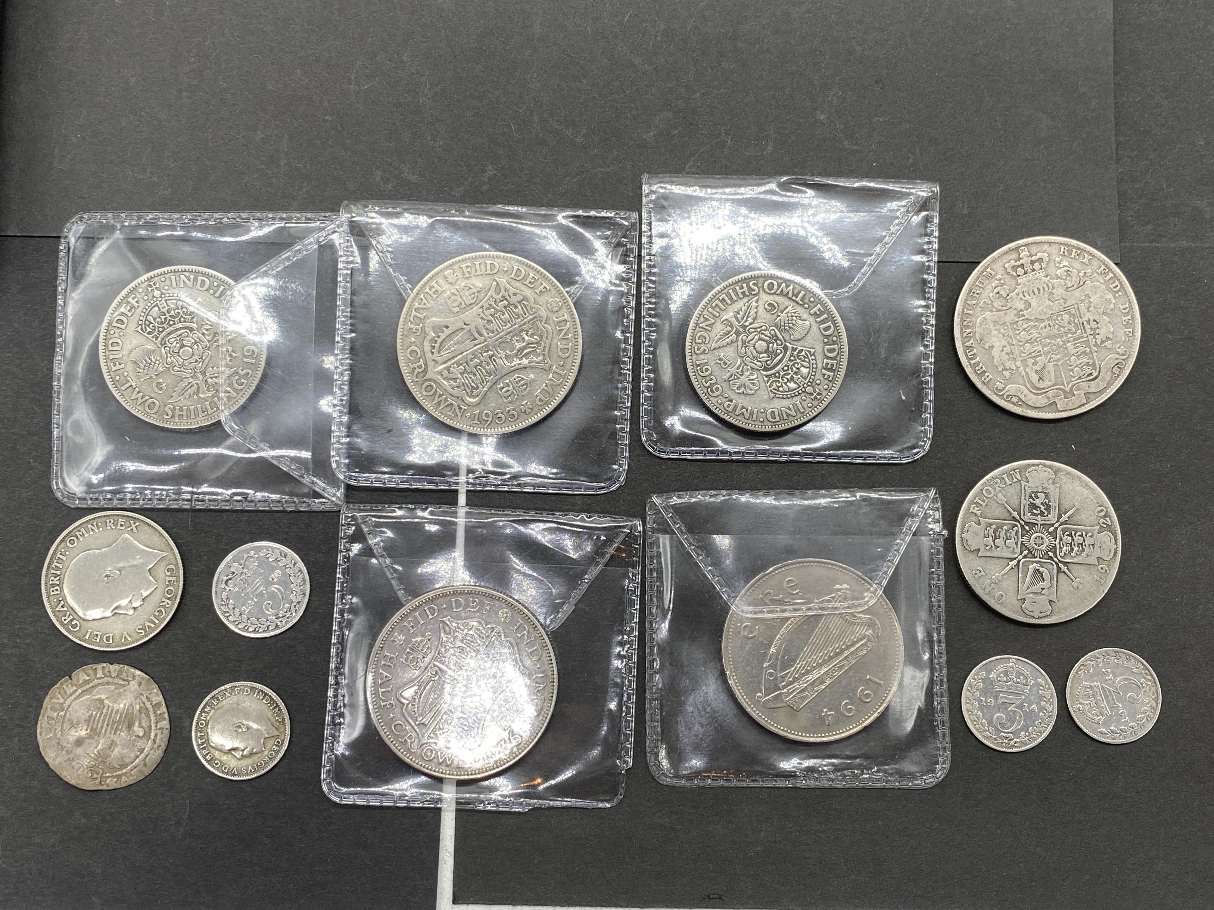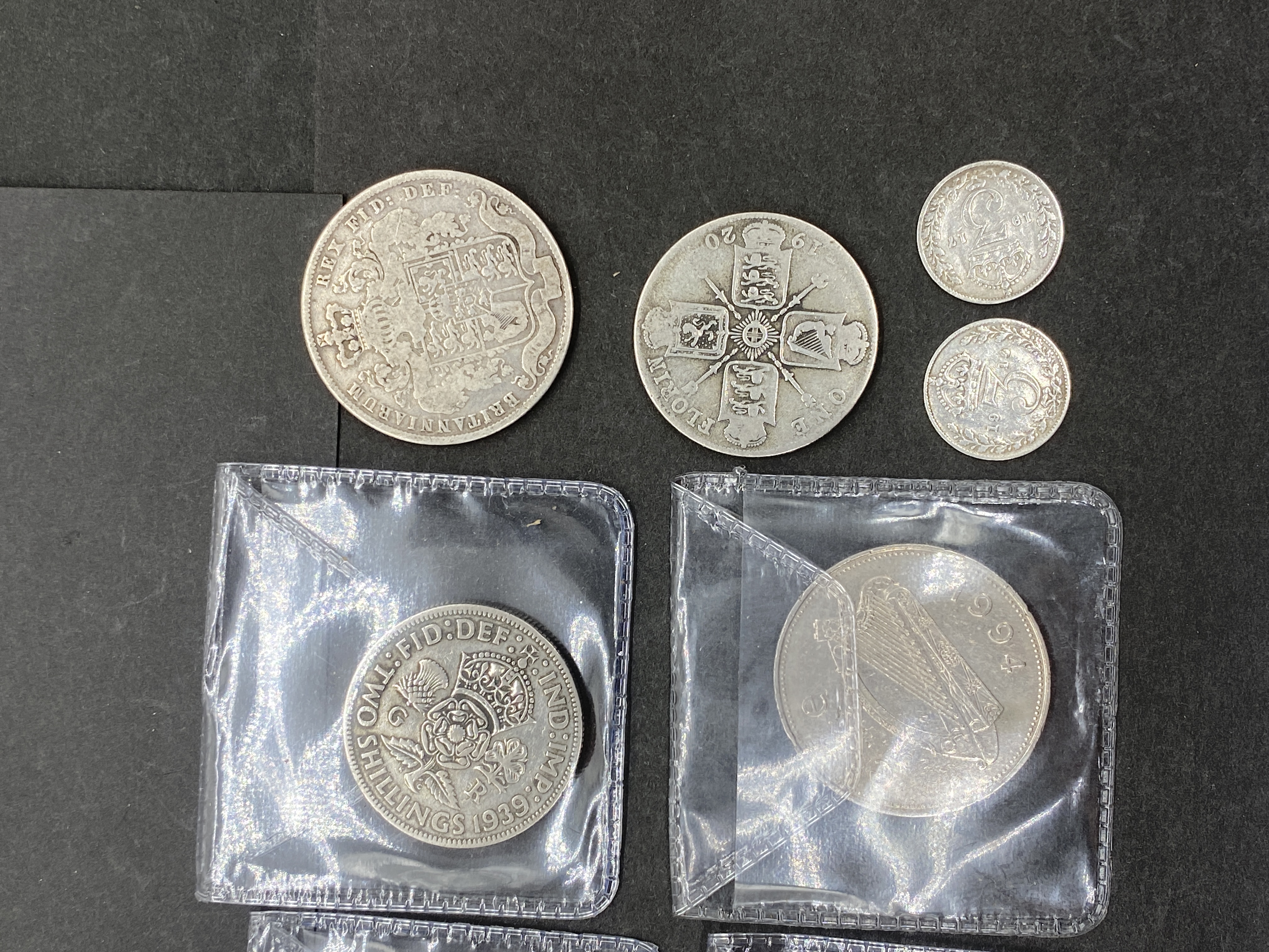A collection of various silver coins, including British and other world coins, some in protective sleeves.