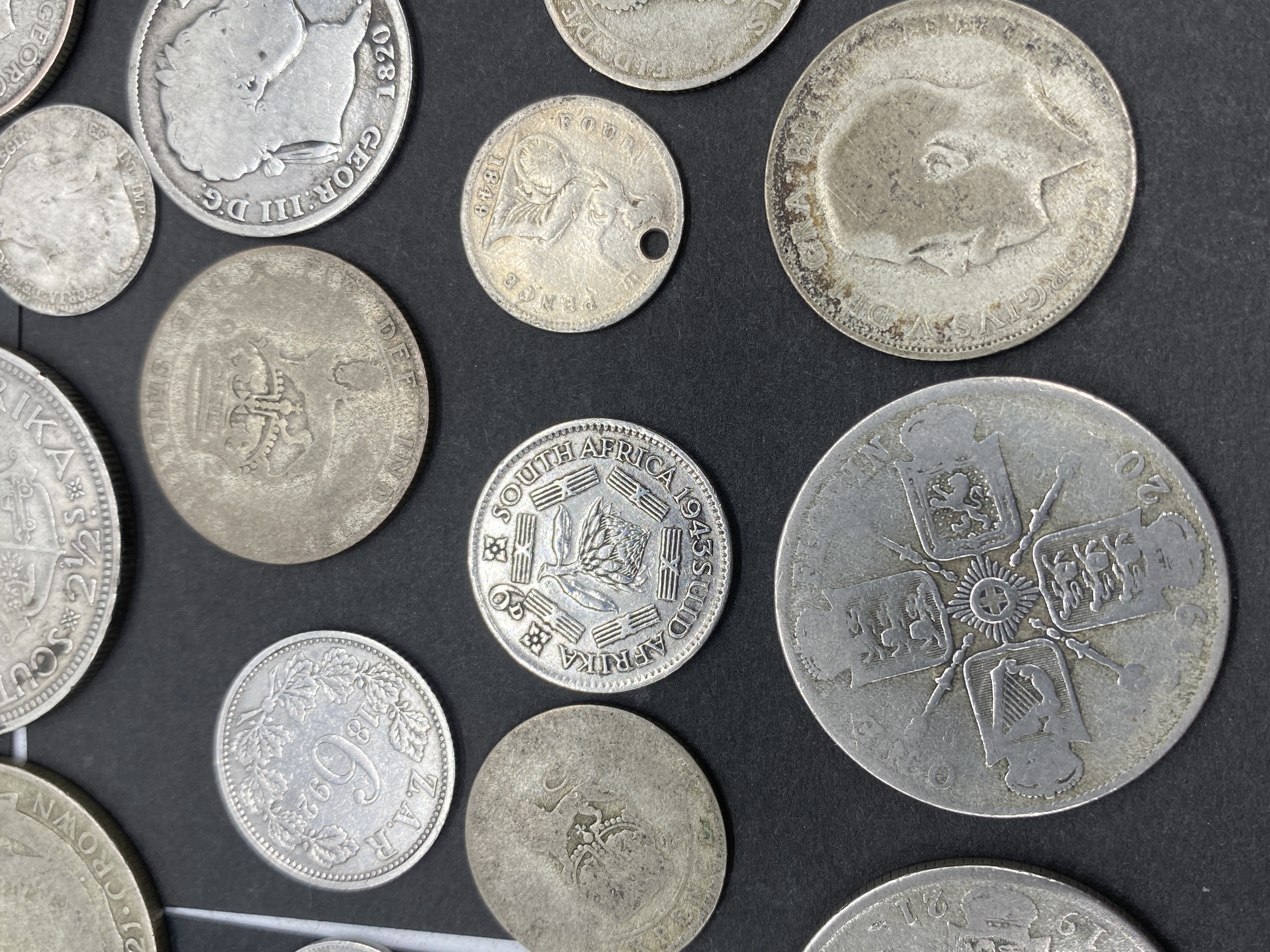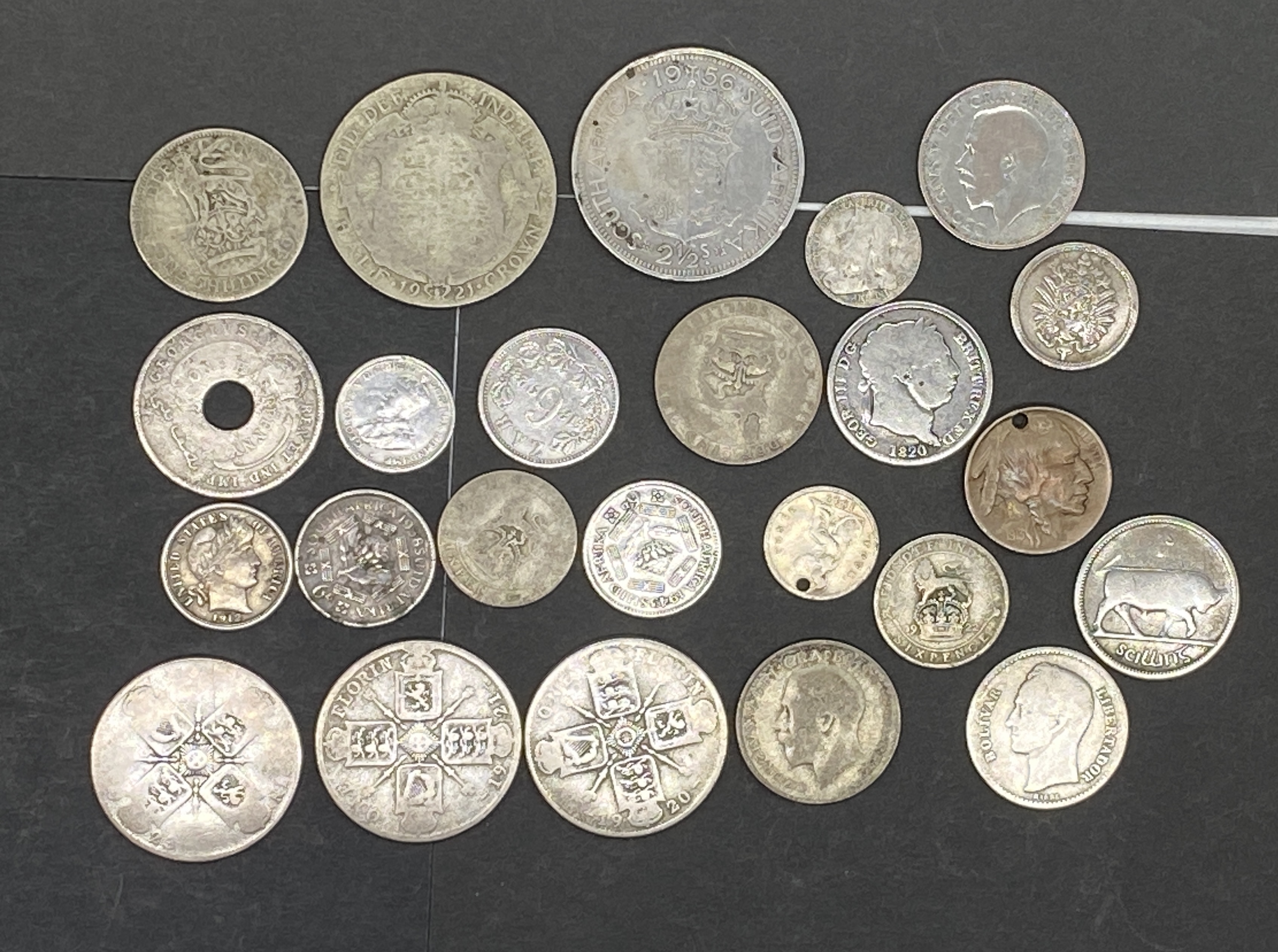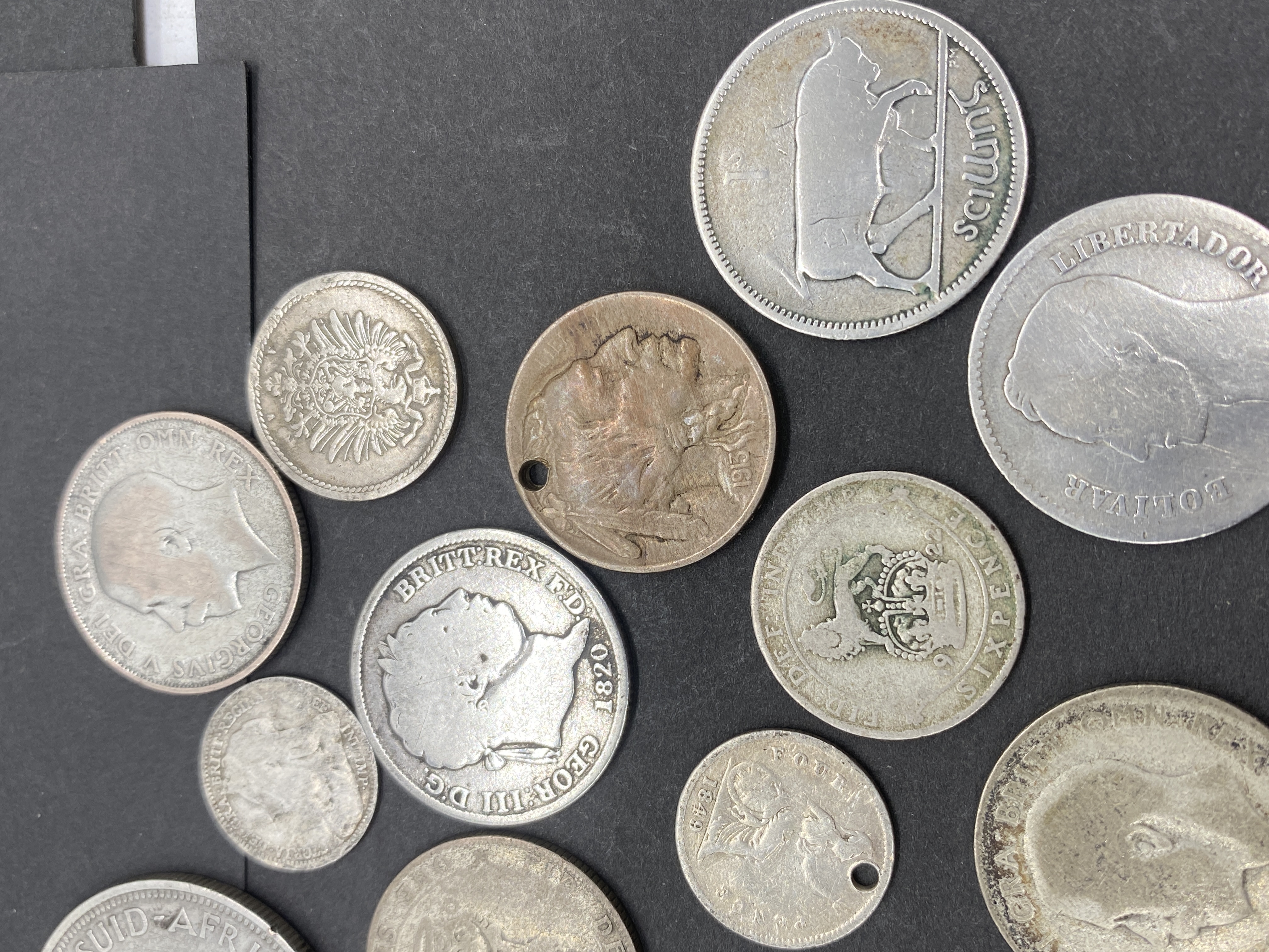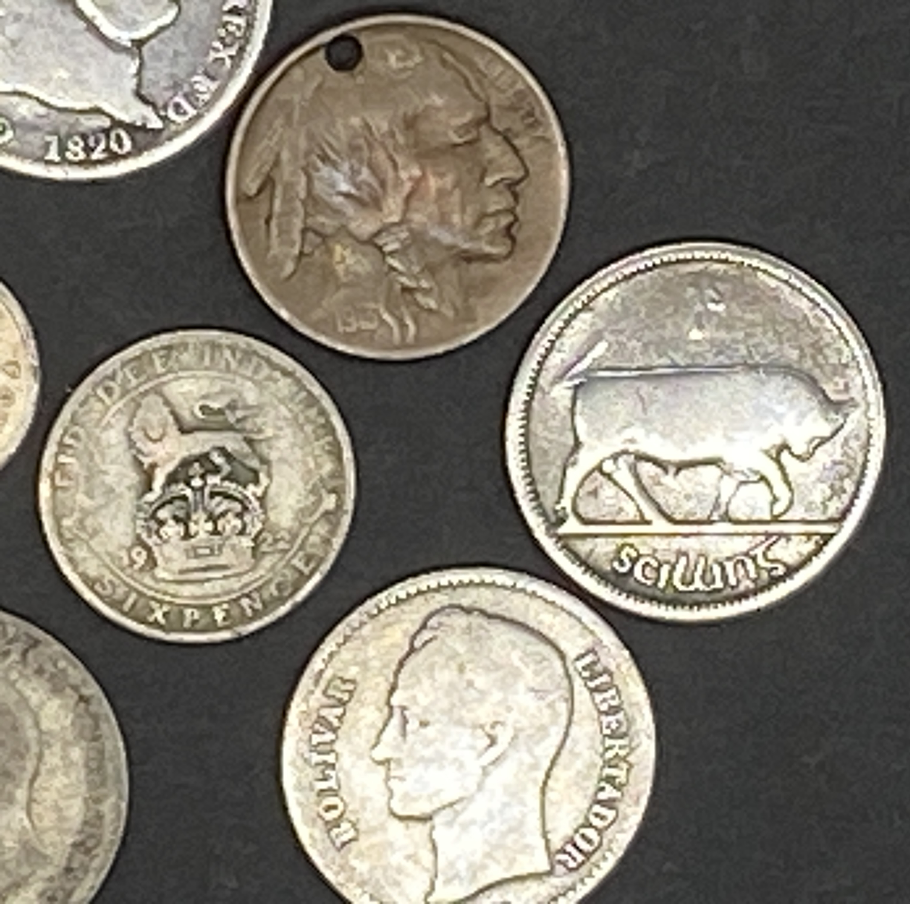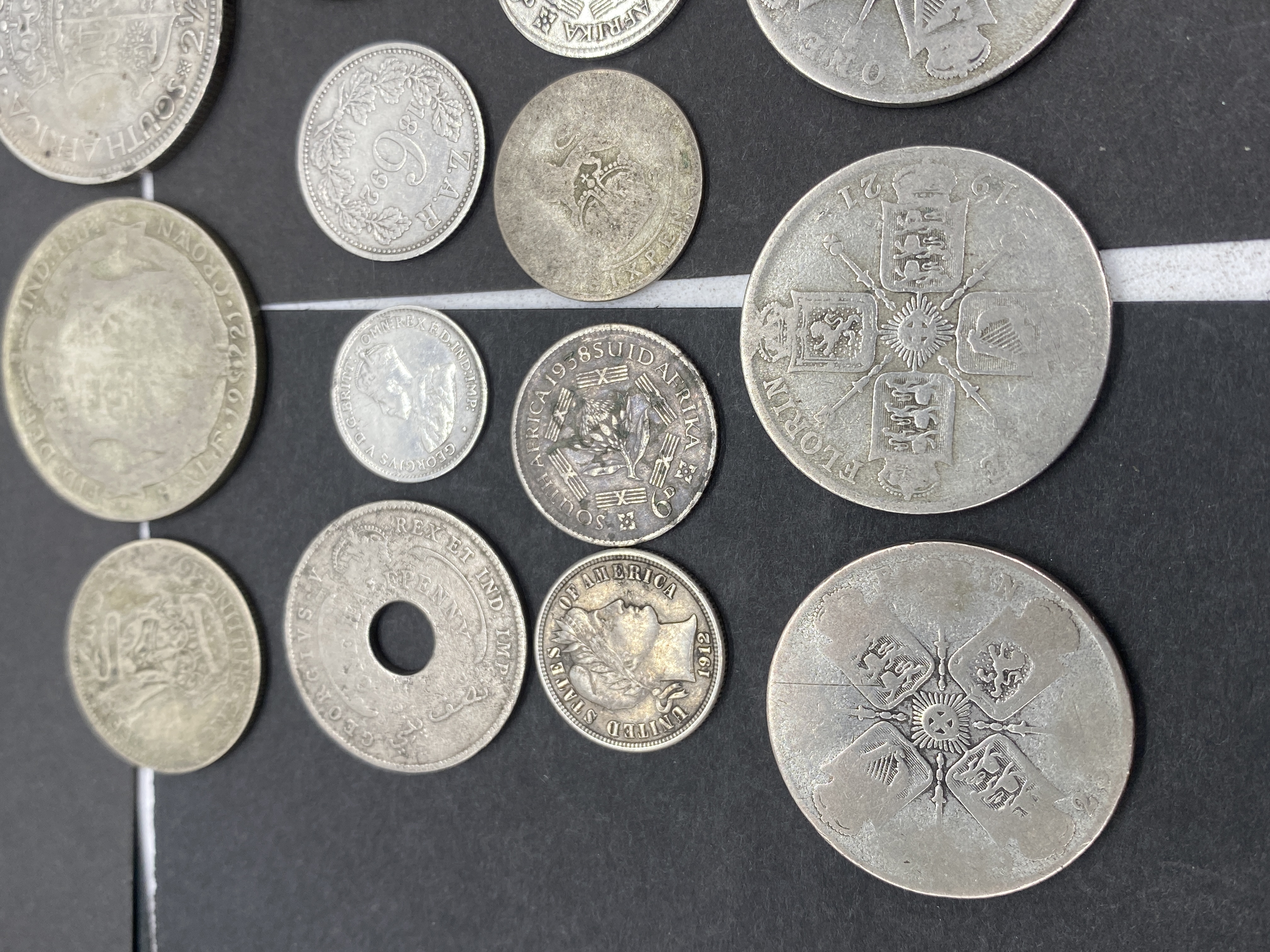 A collection of various silver world coins.
