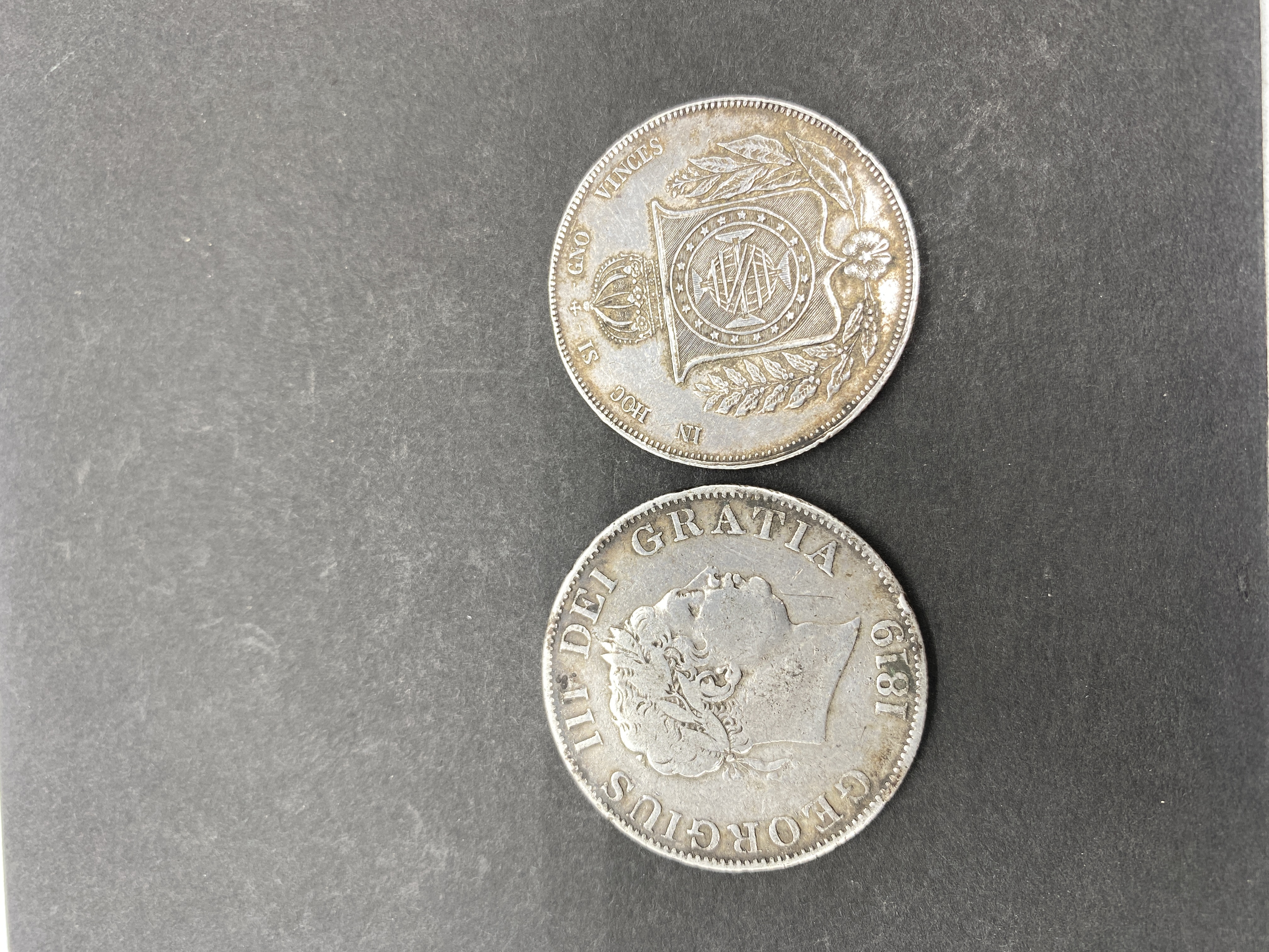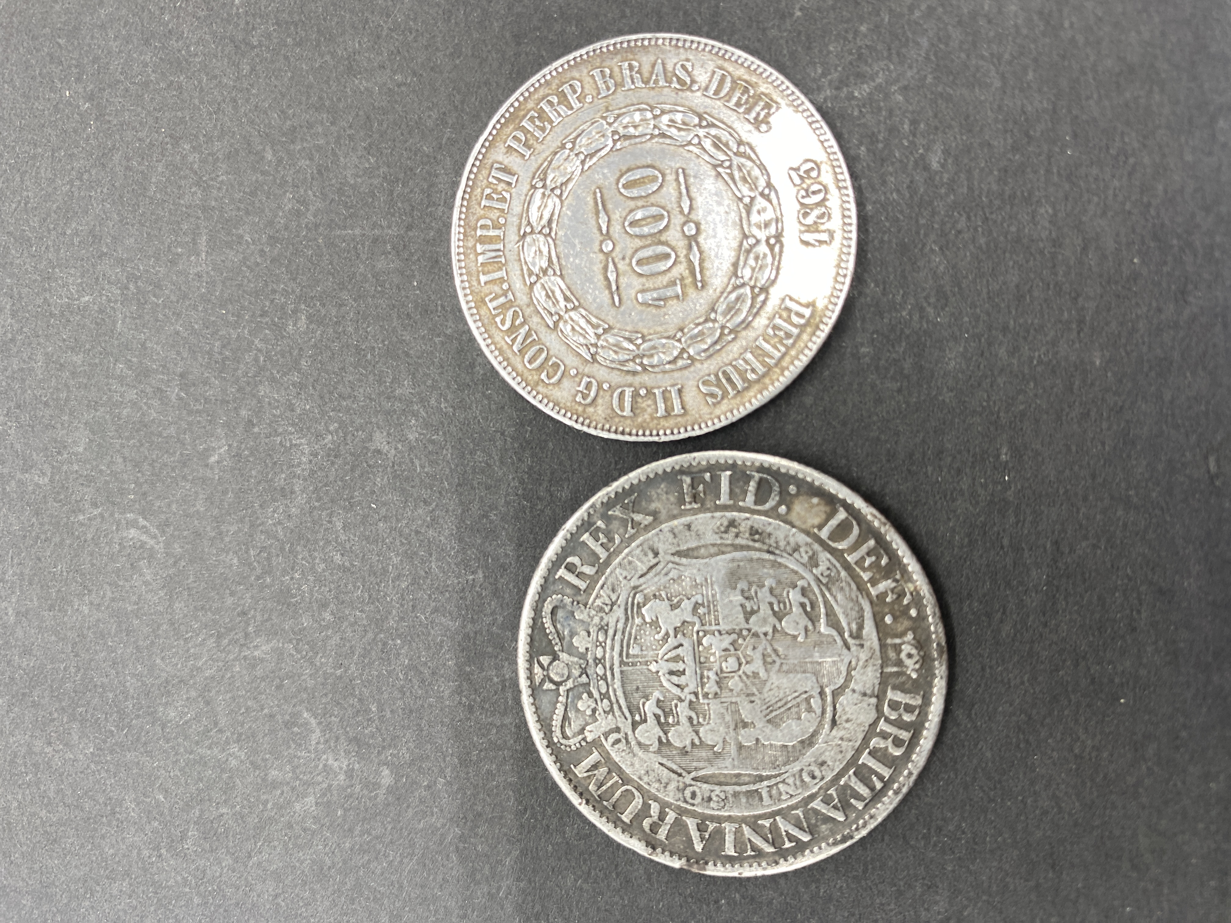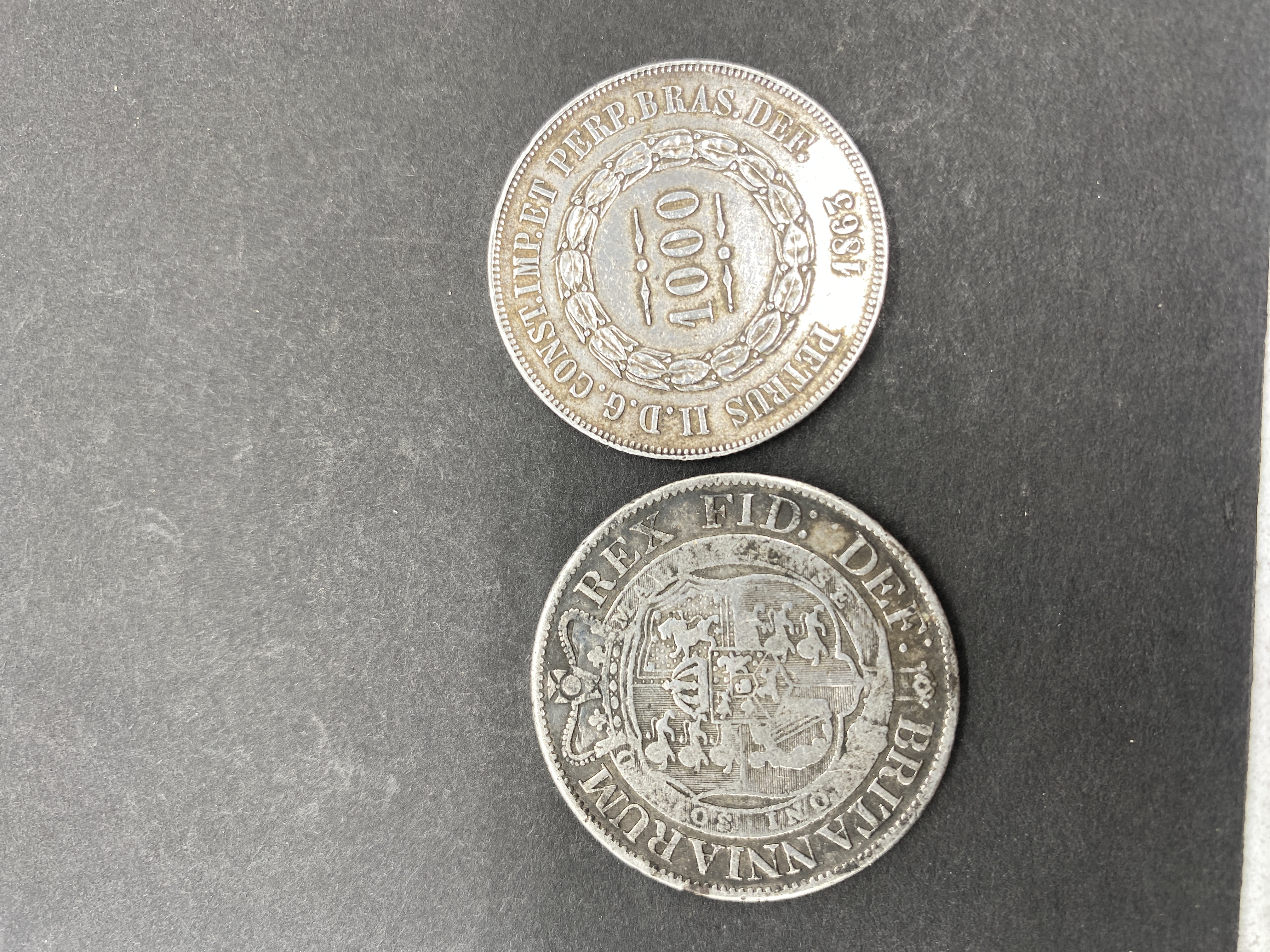 Two silver Brazilian coins, one dated 1863 with 1000 Reis and the other dated 1857.