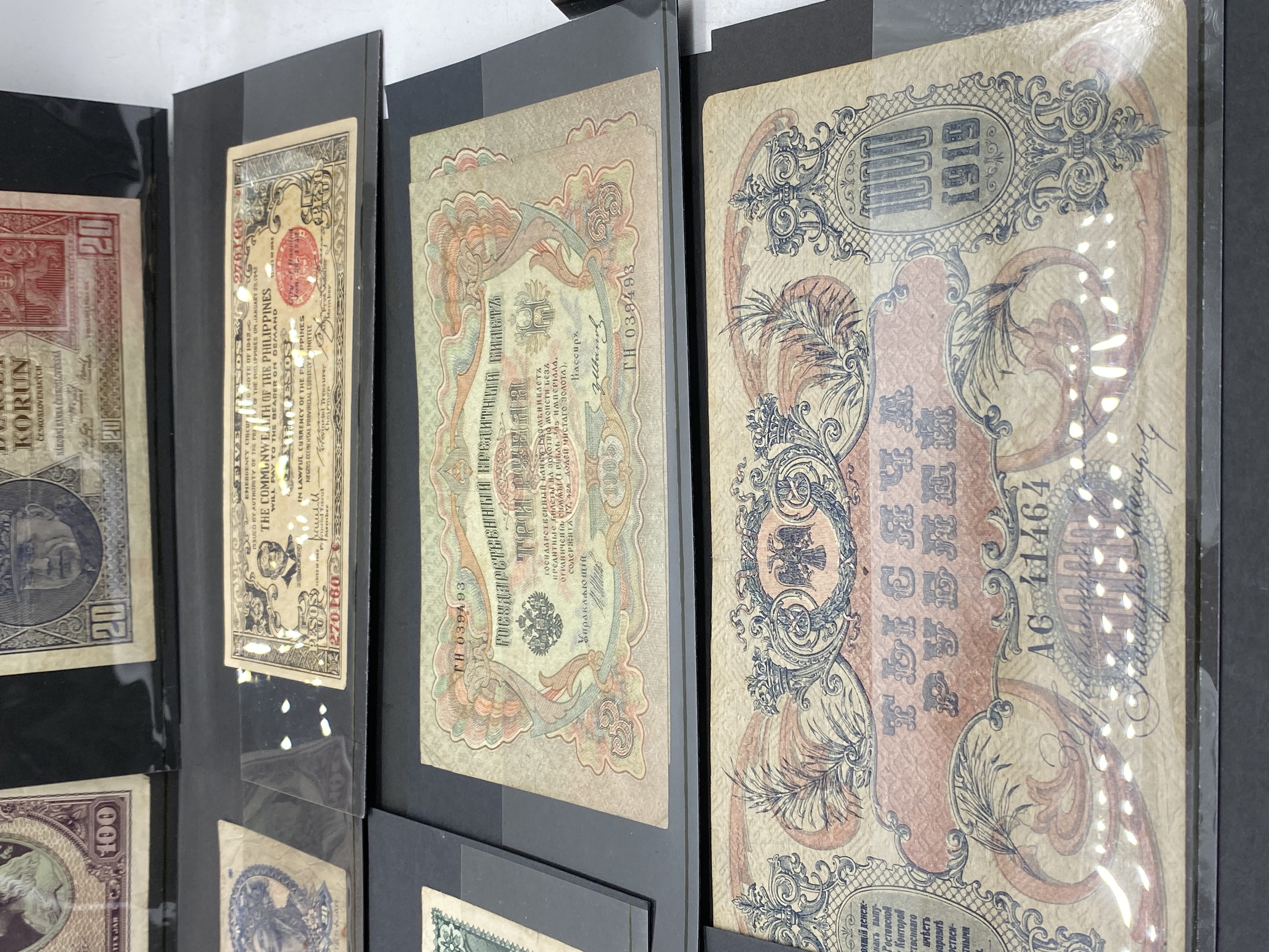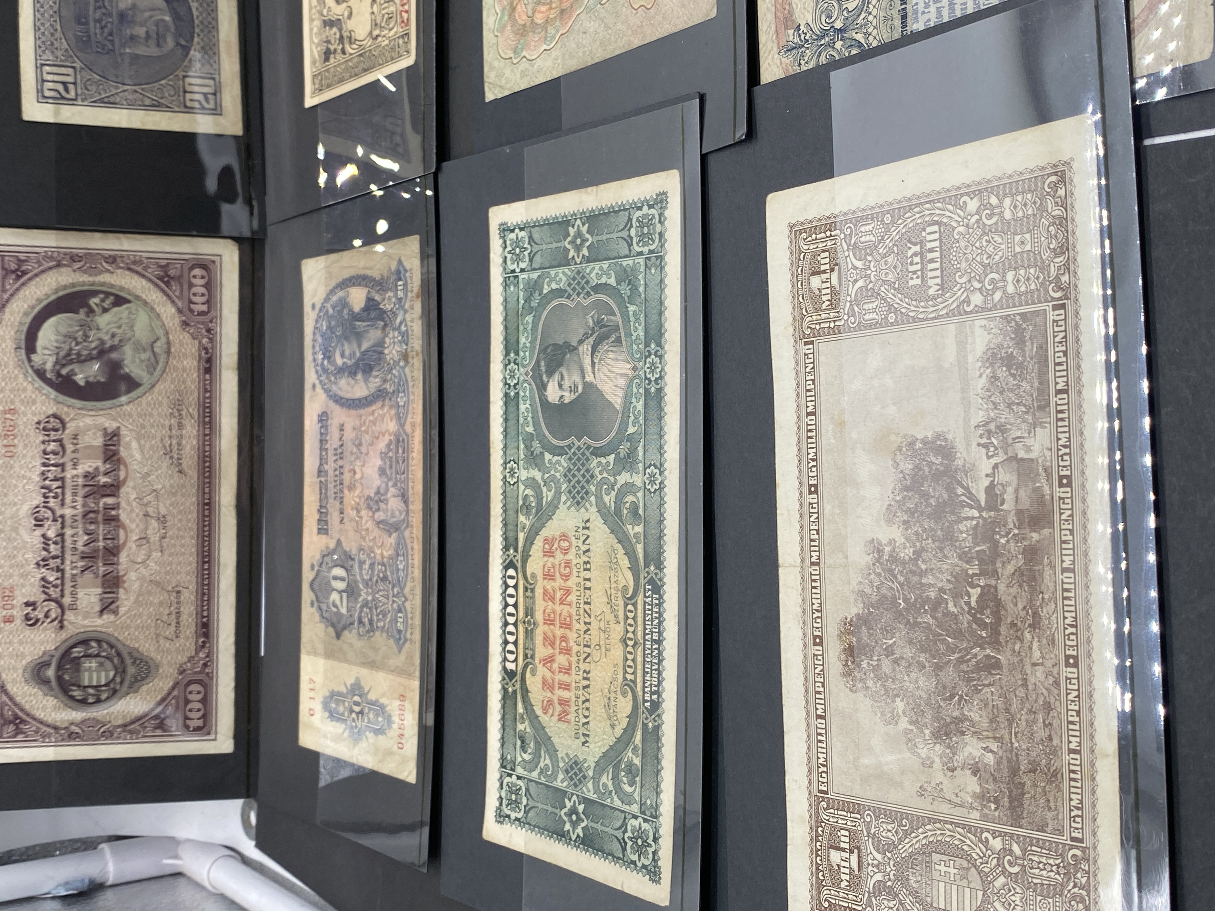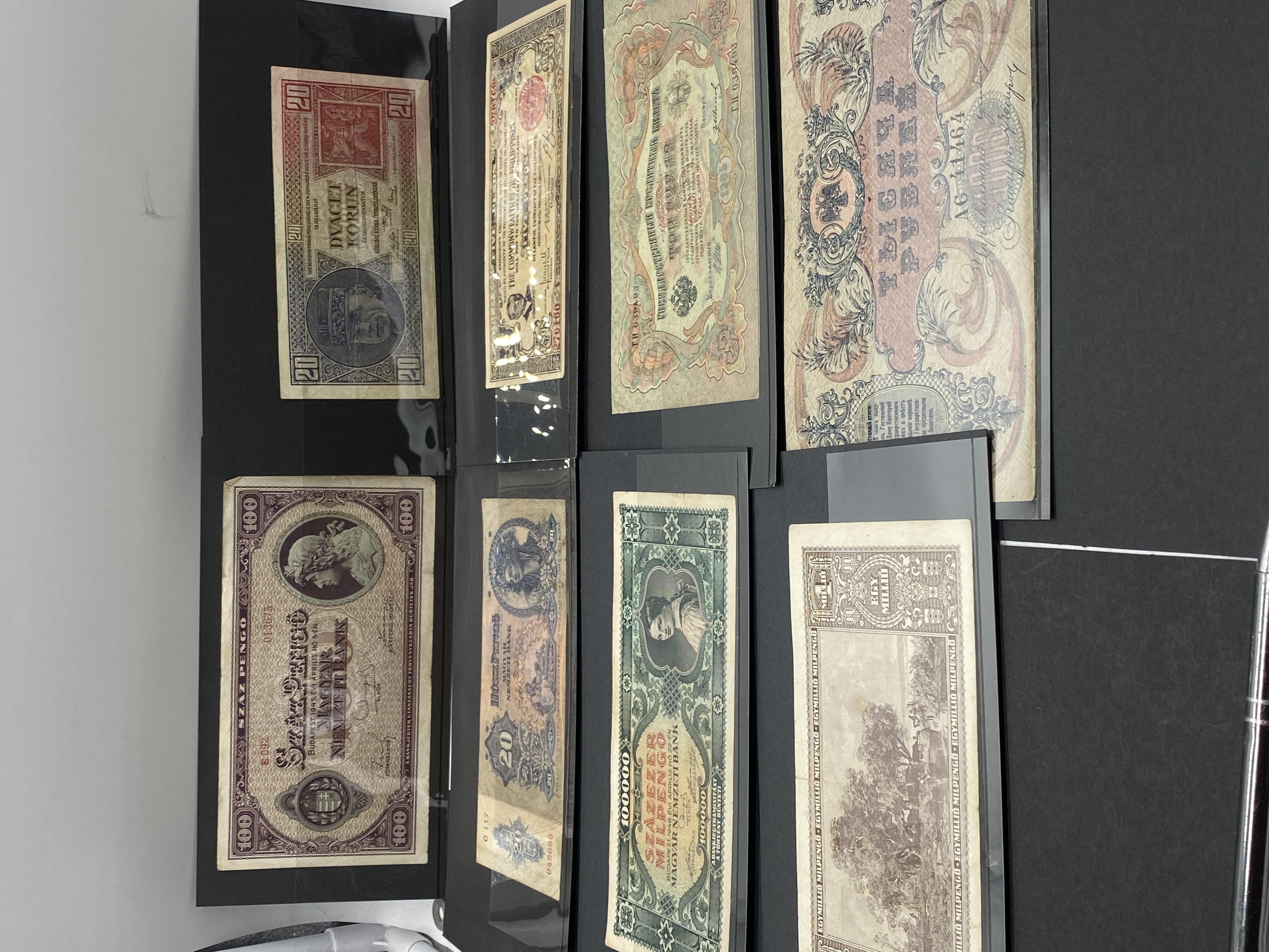 A collection of various vintage banknotes from different countries.