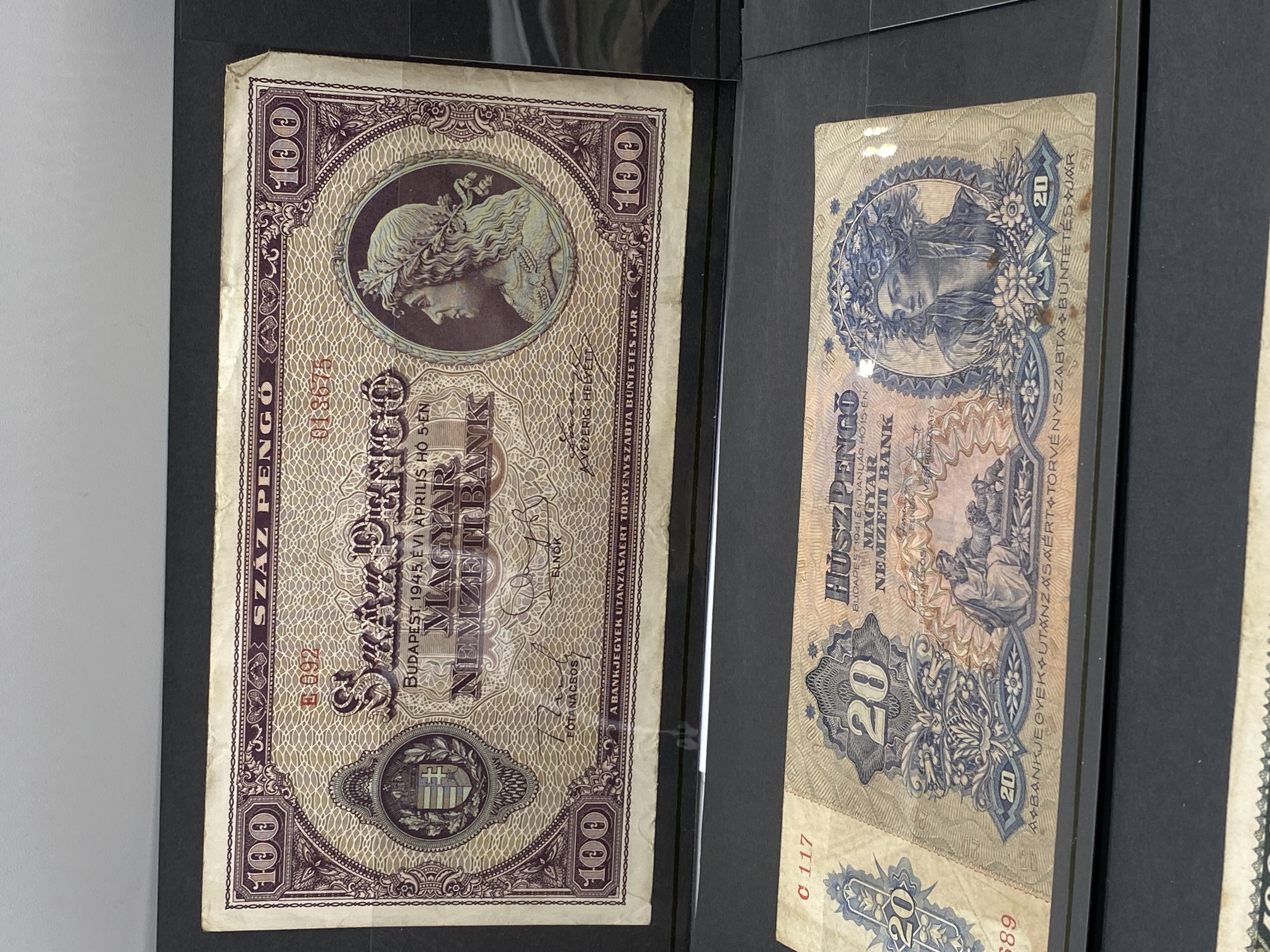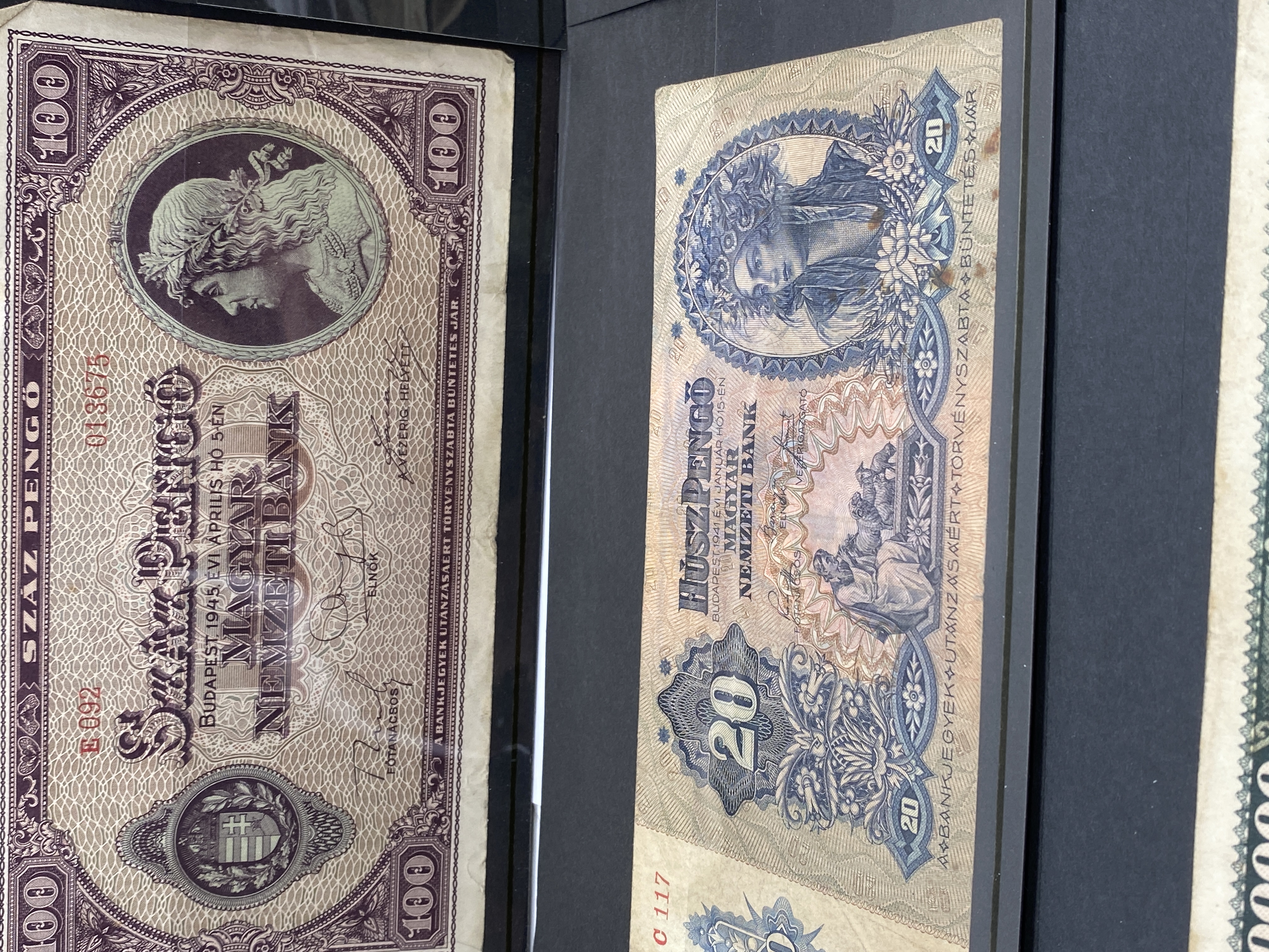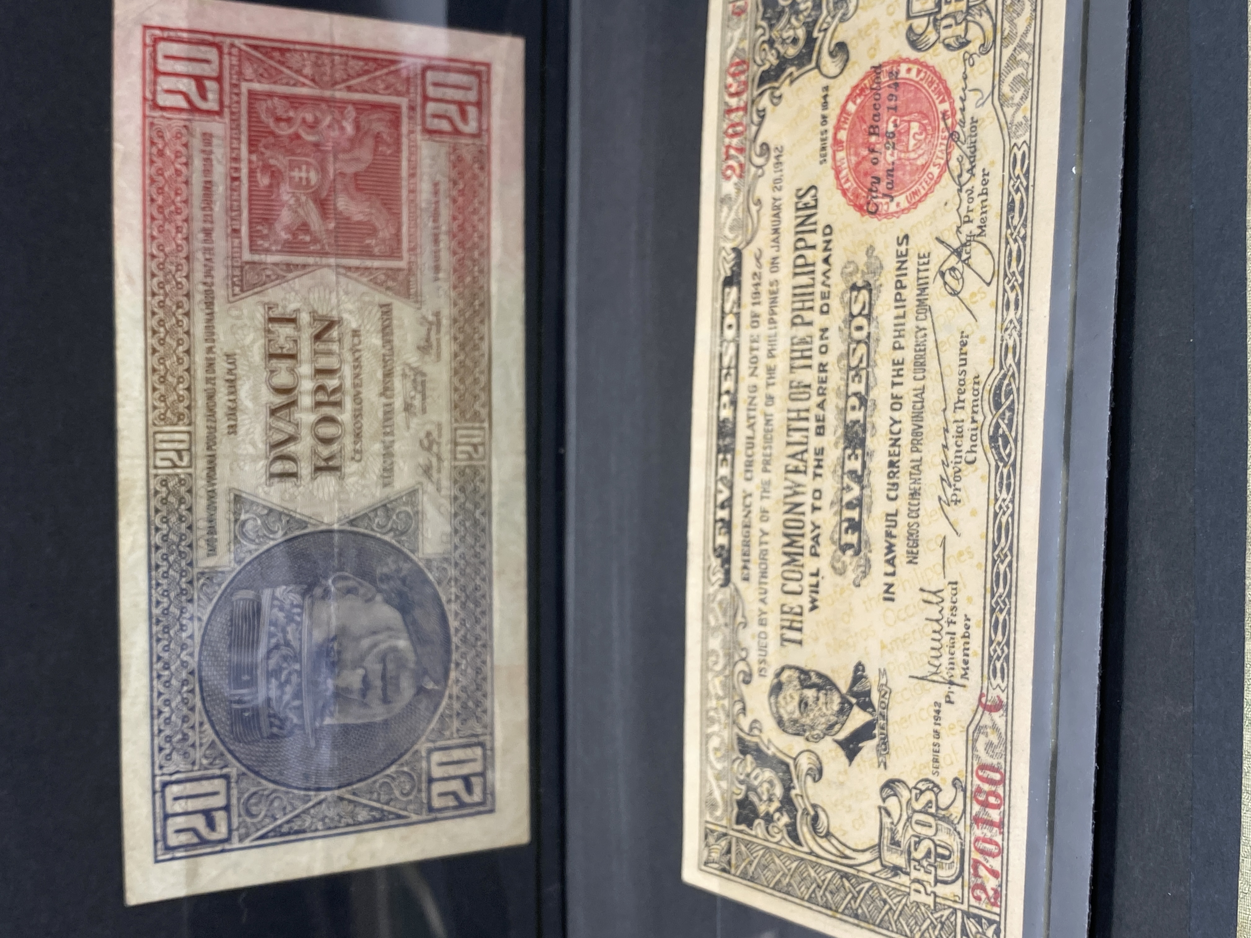 A collection of various vintage banknotes from different countries.
