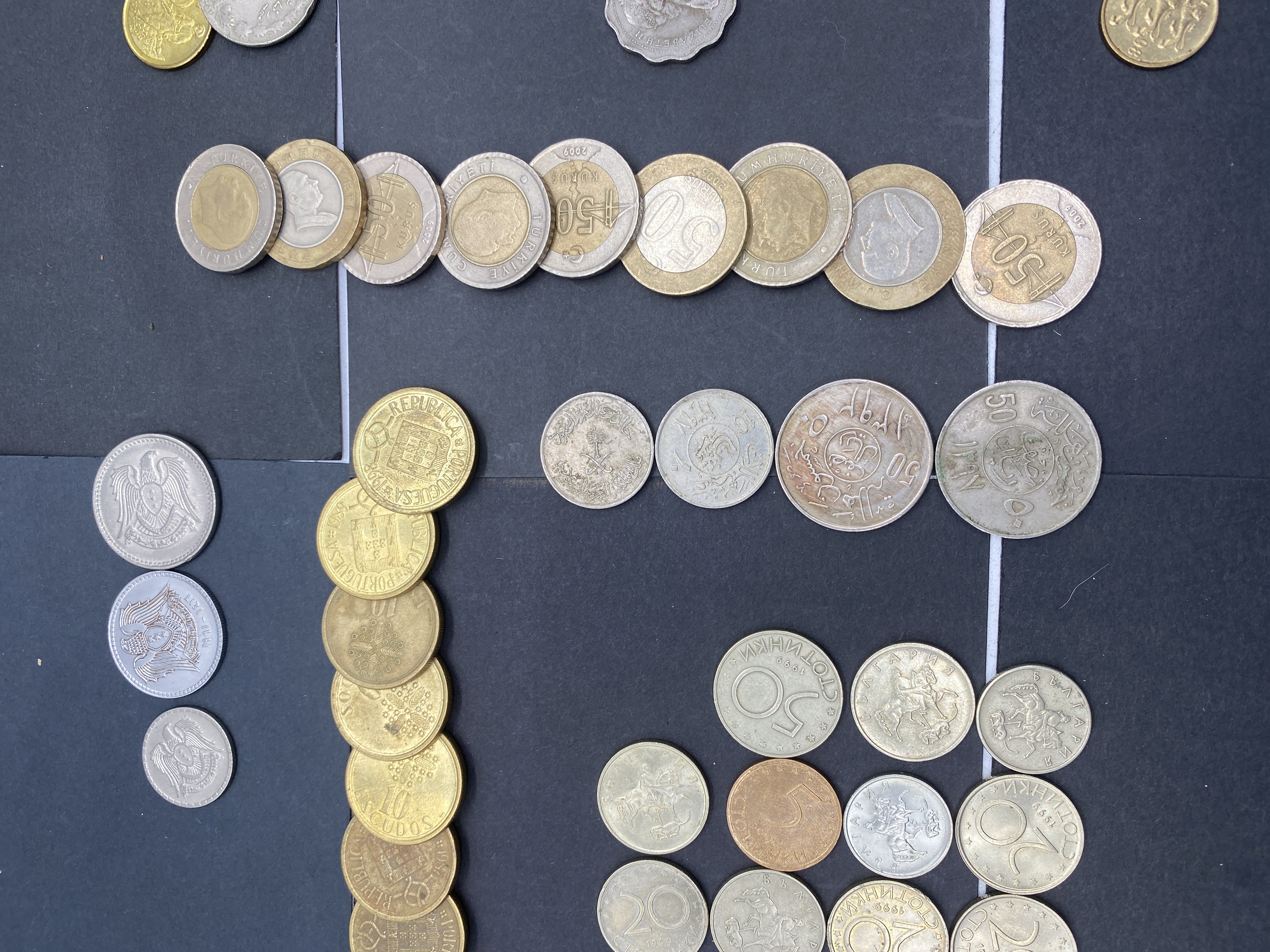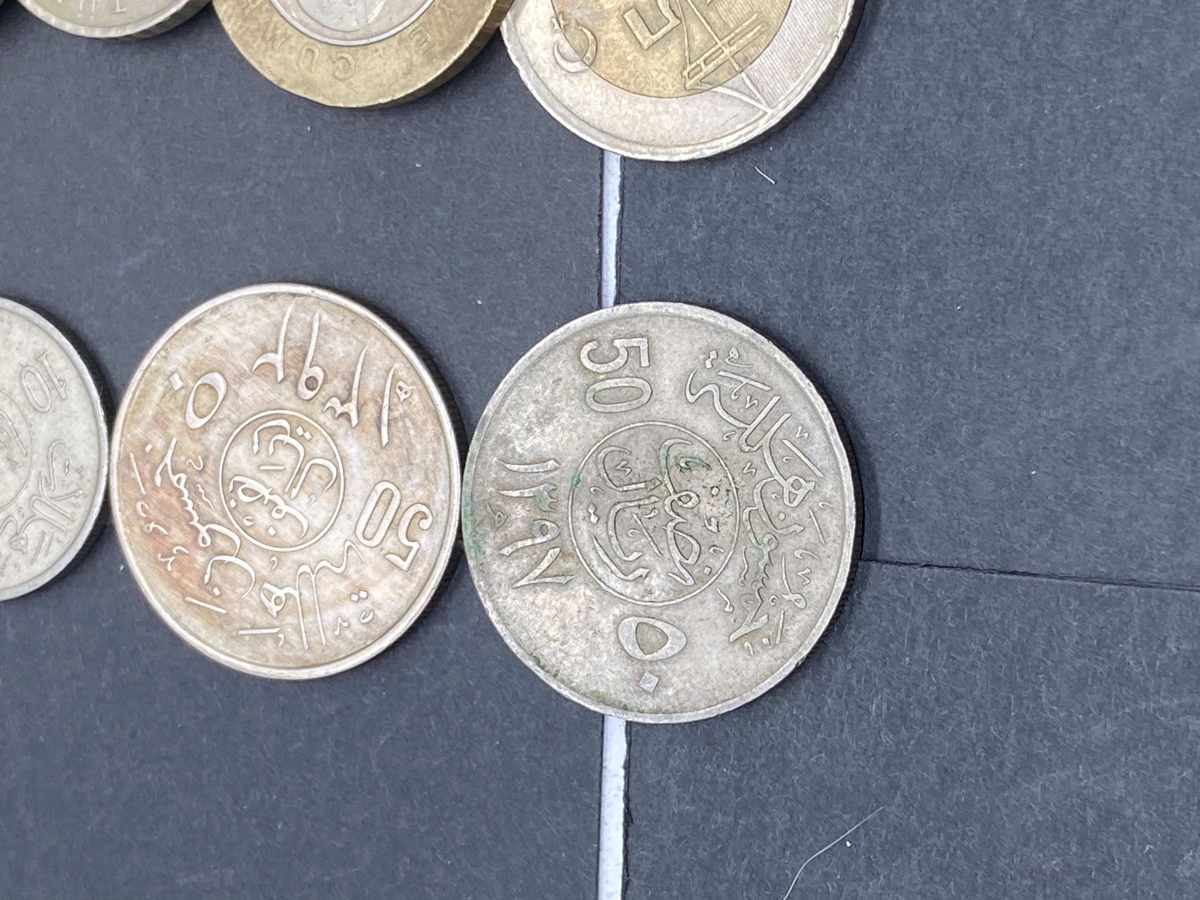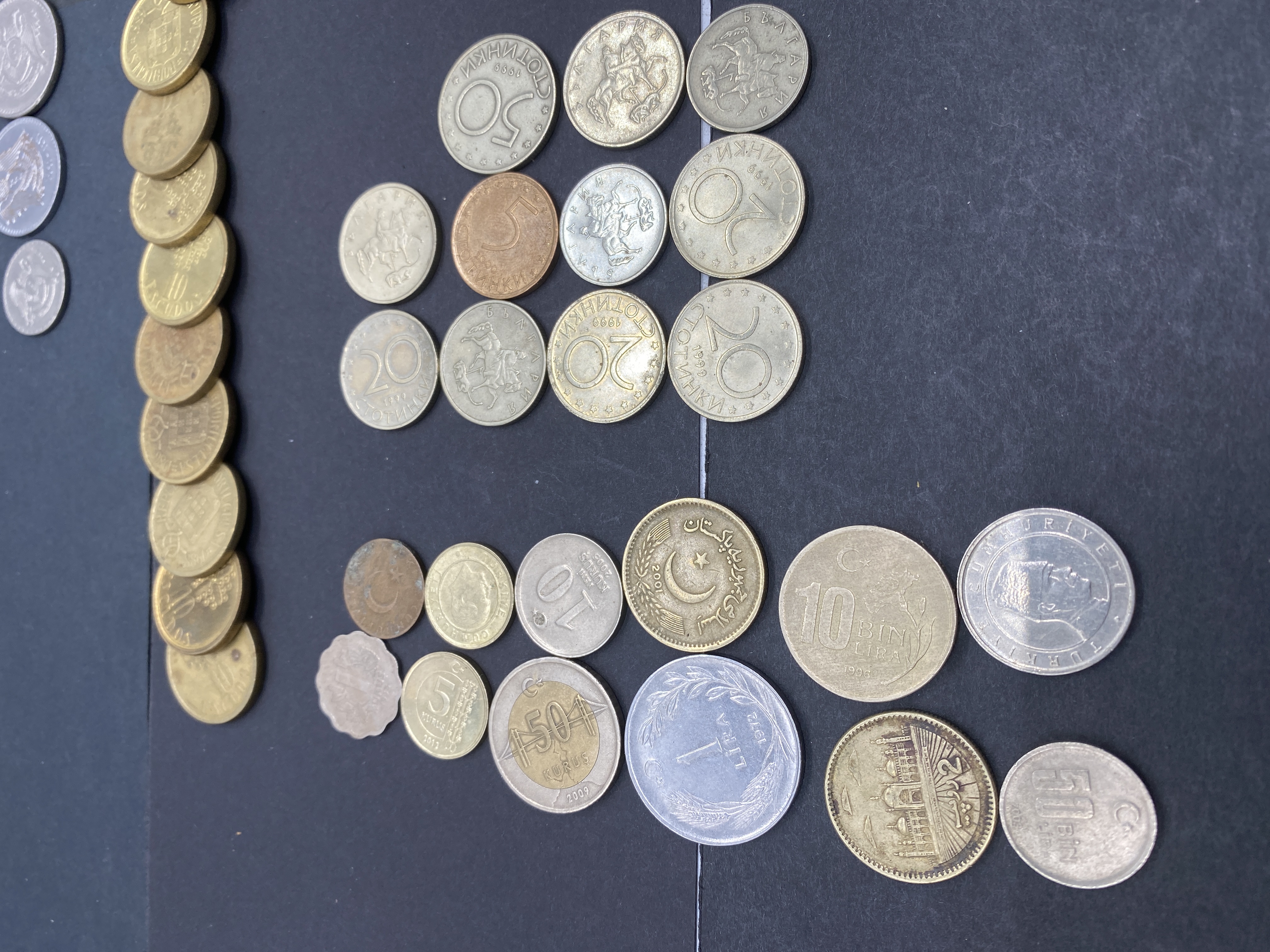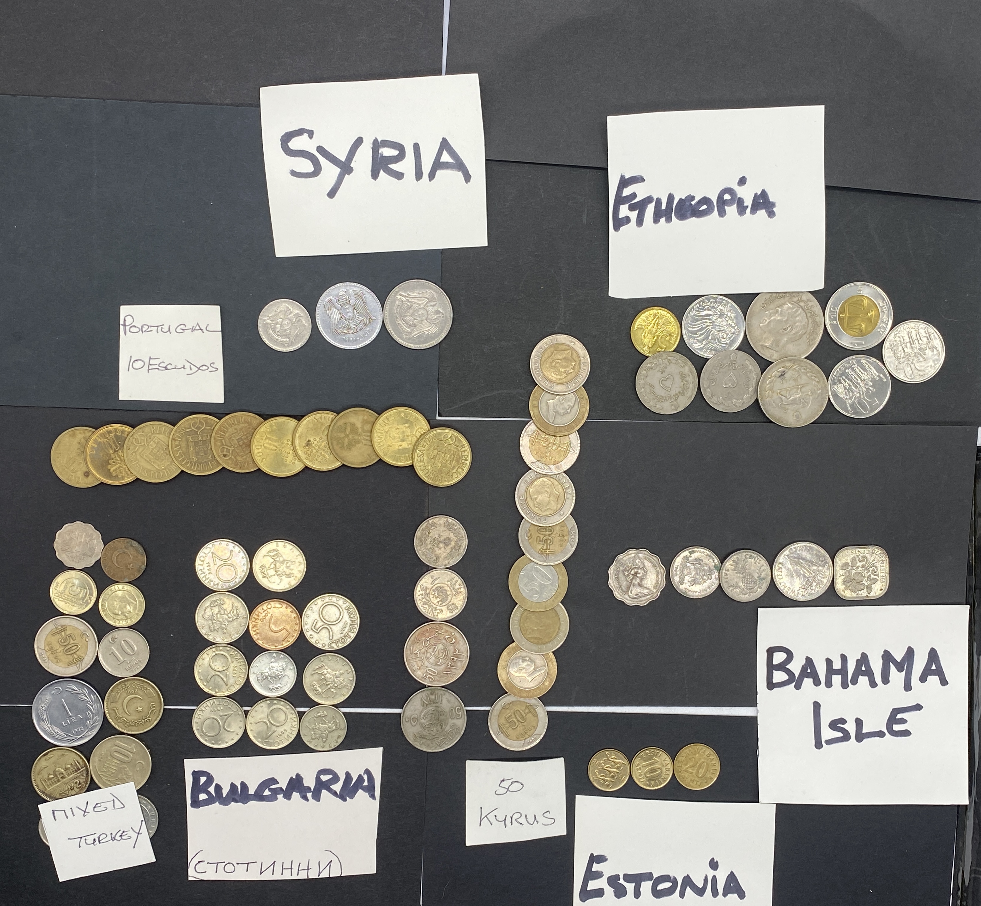A collection of various silver and gold-colored coins from different countries including Syria, Ethiopia, Portugal, Bulgaria, Cyprus, Estonia, Bahama Isle, and Turkey.