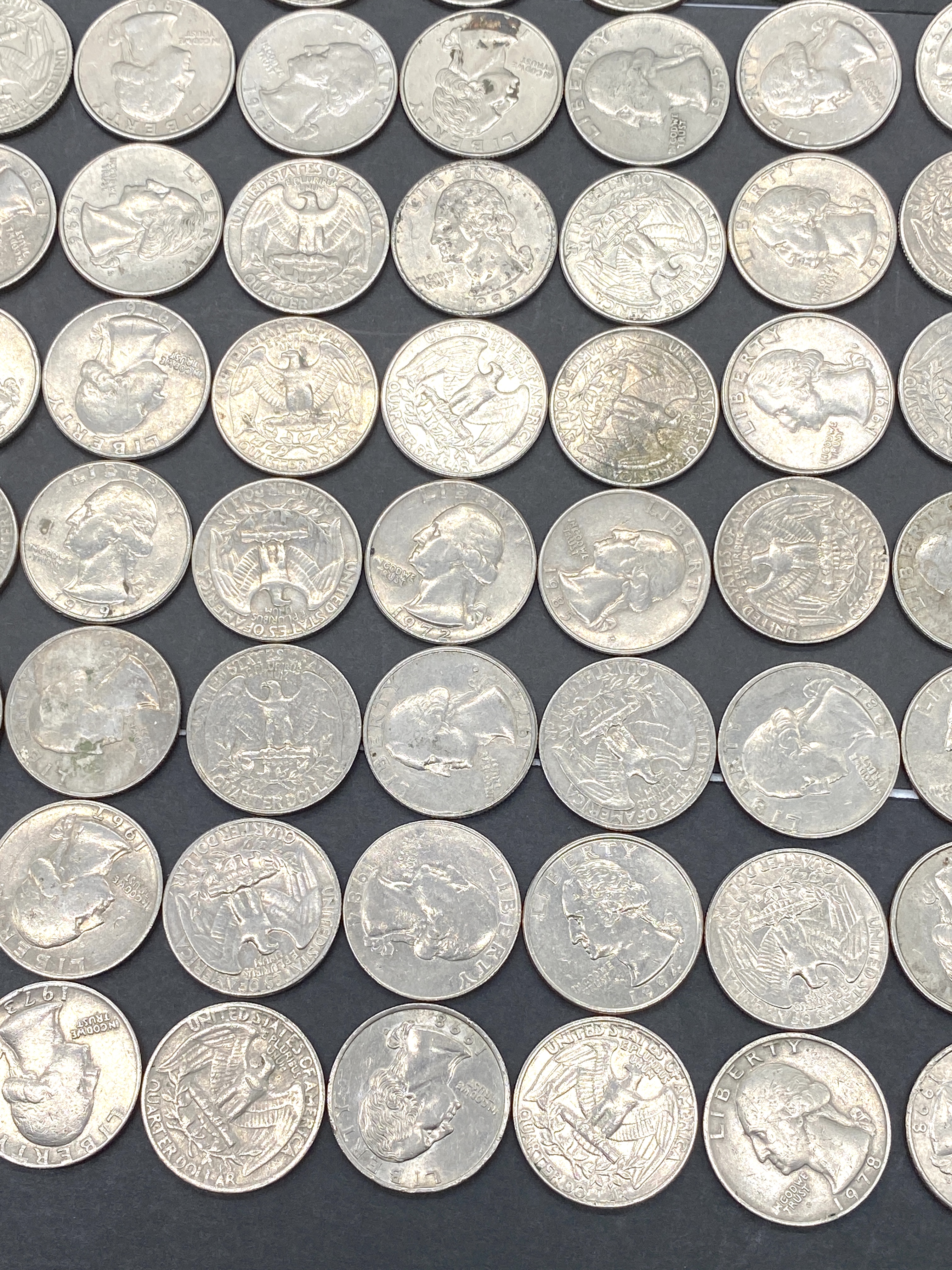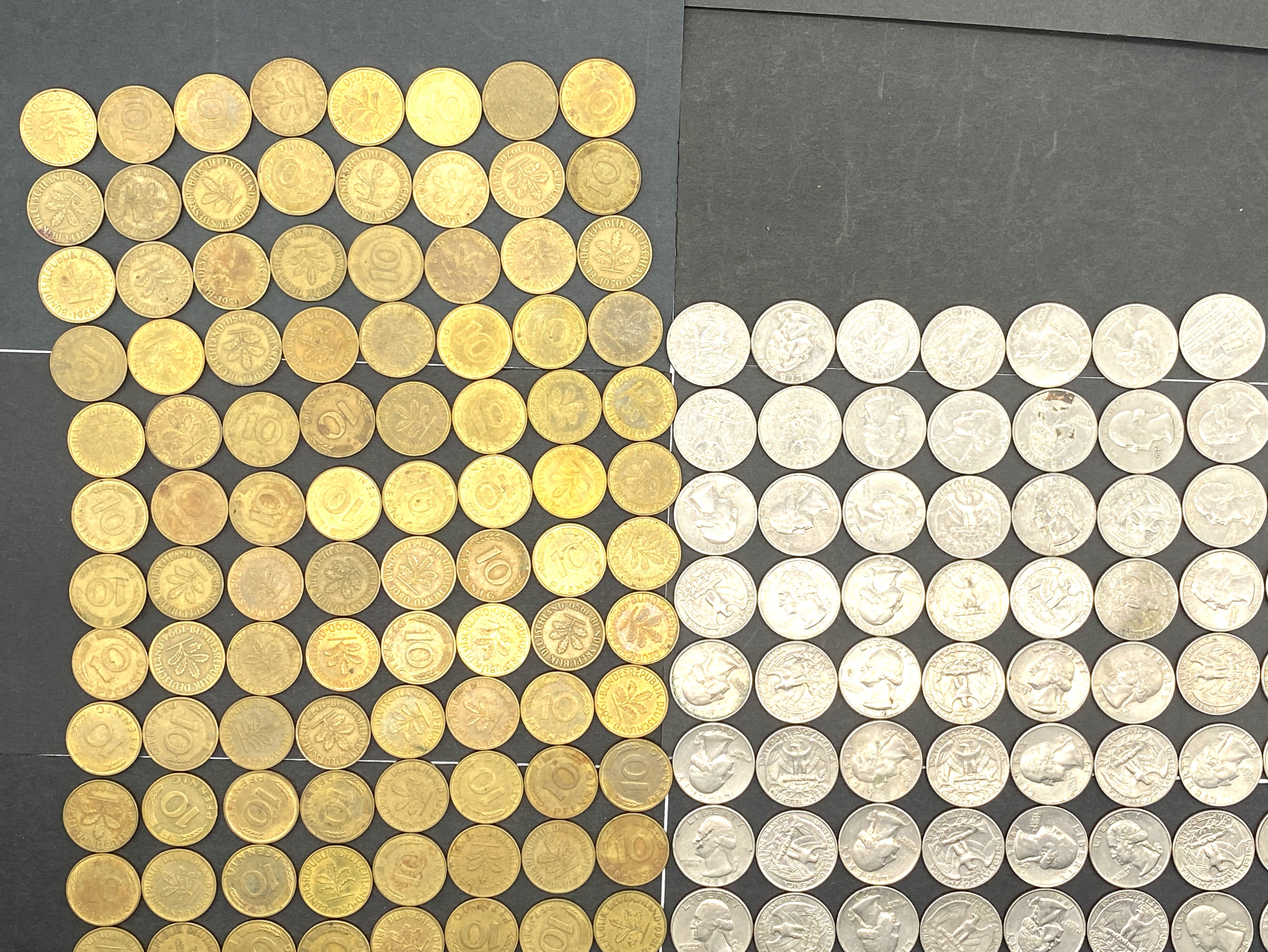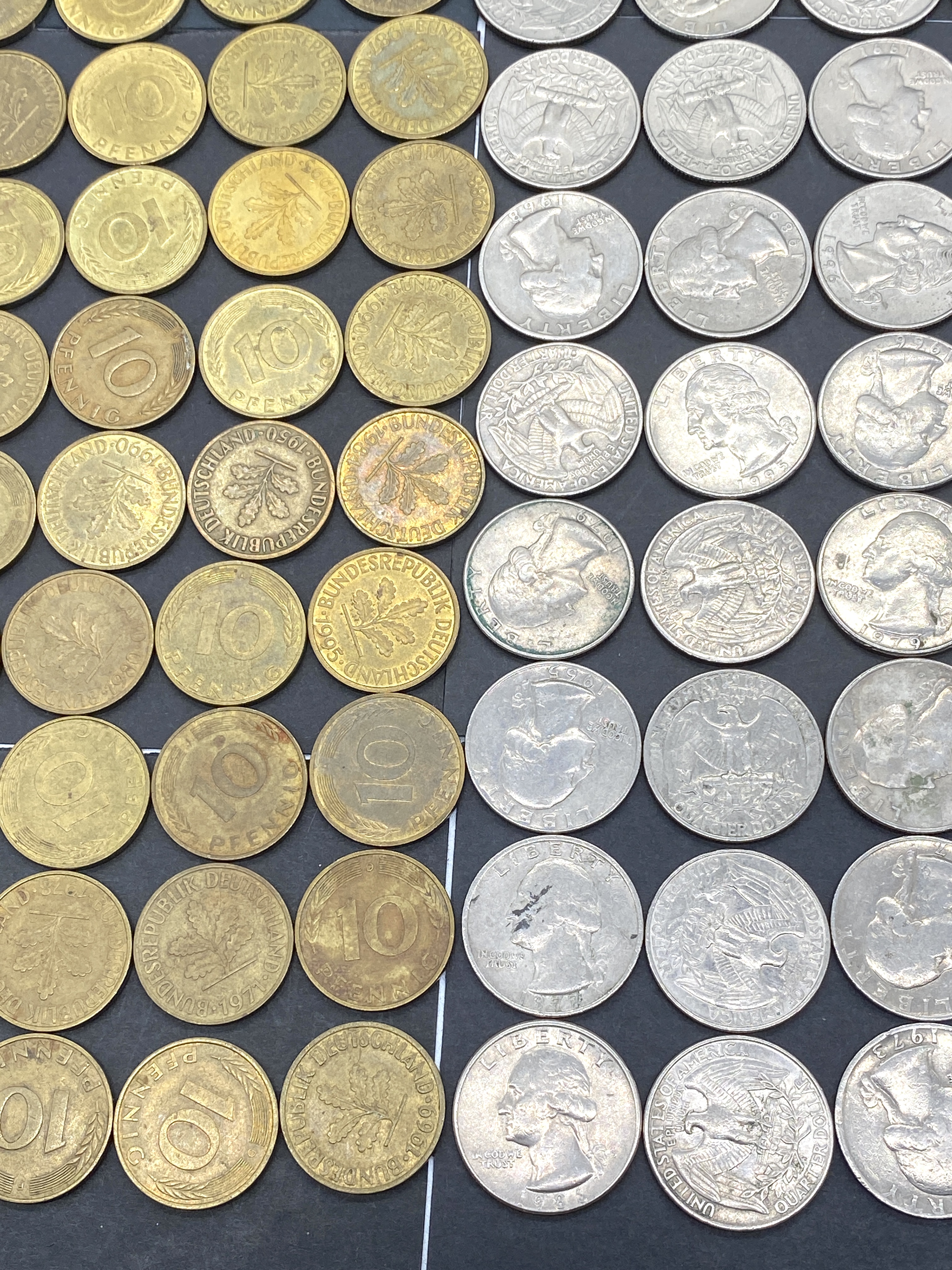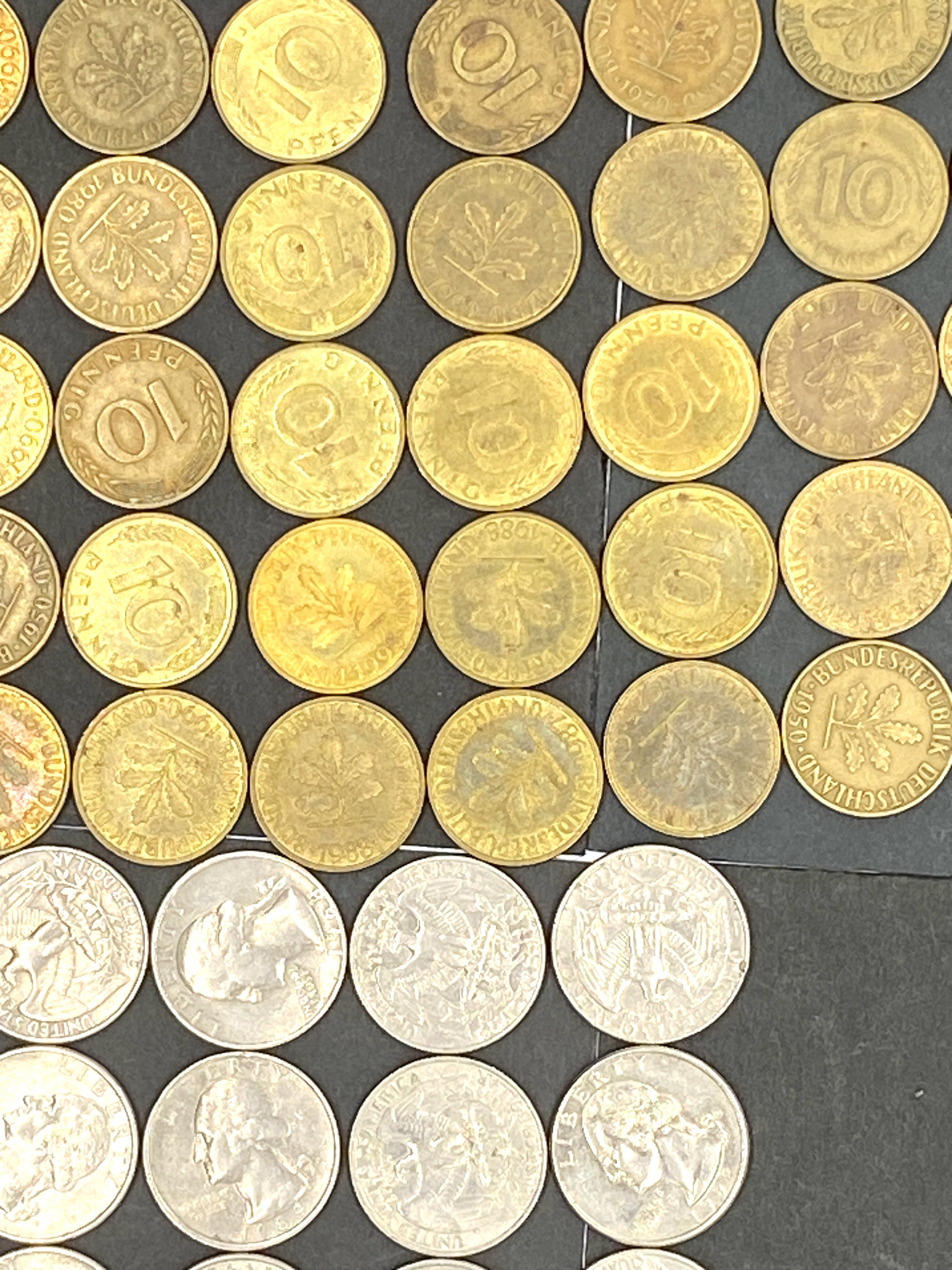 A collection of various German and US coins.