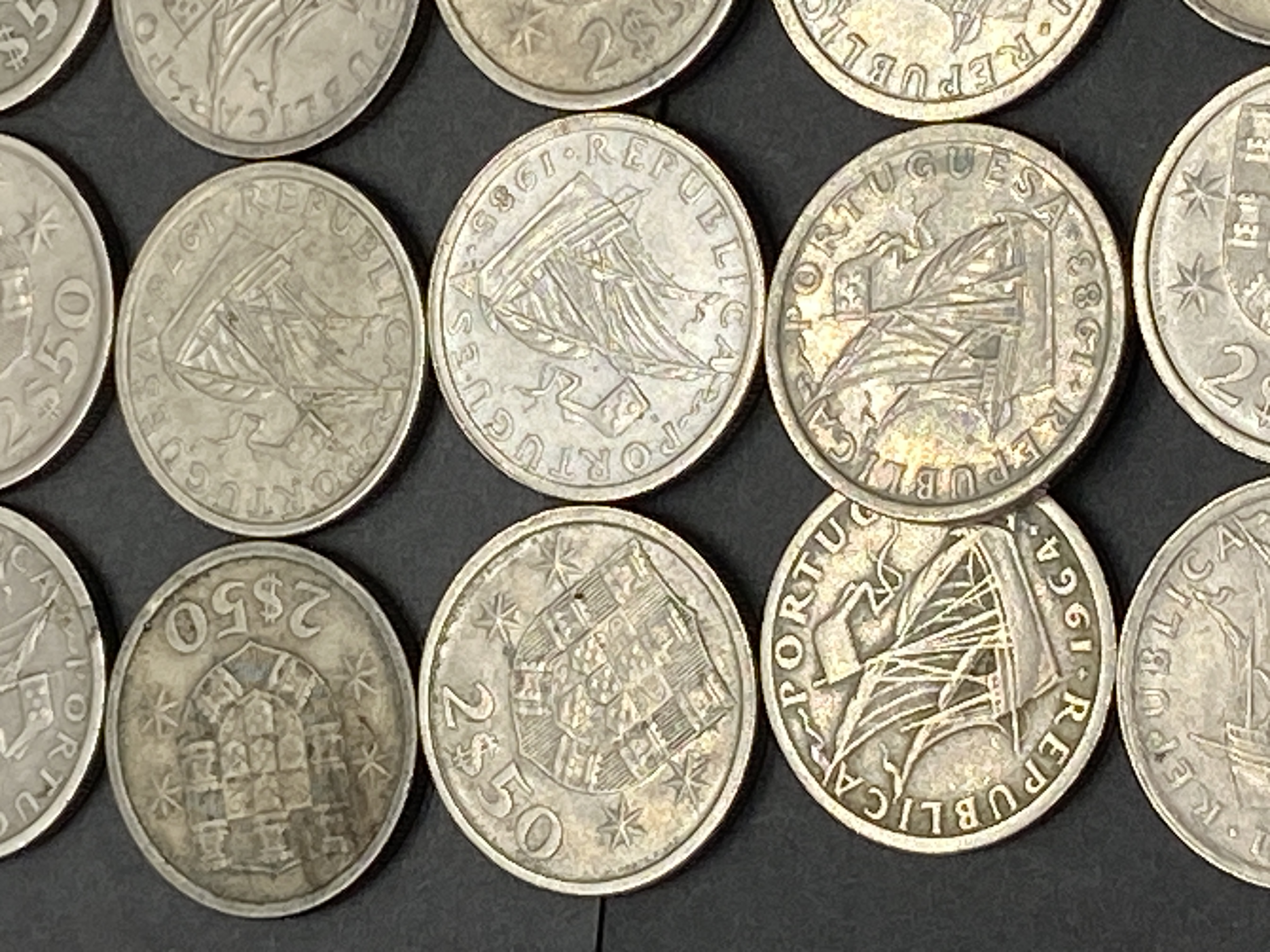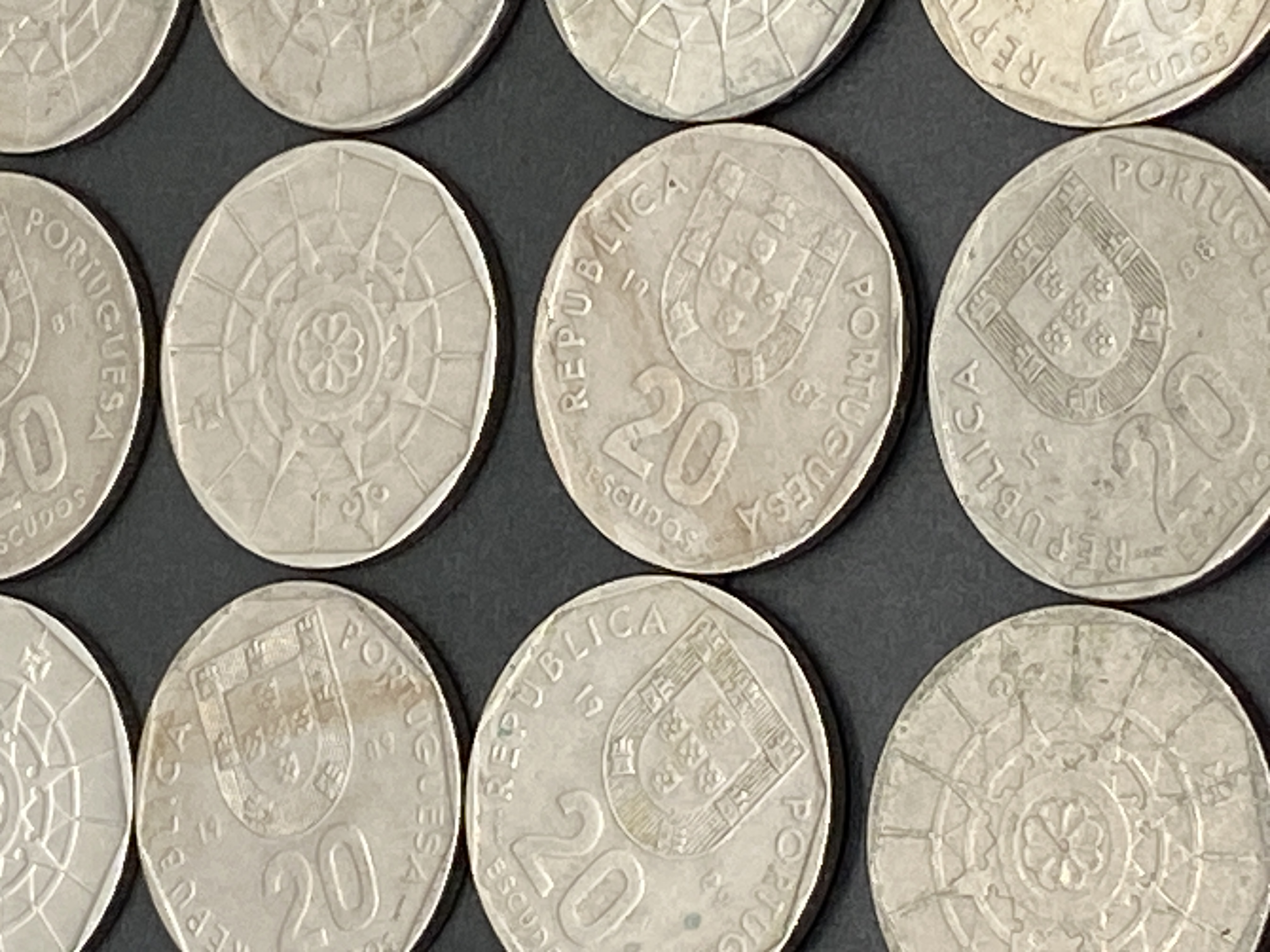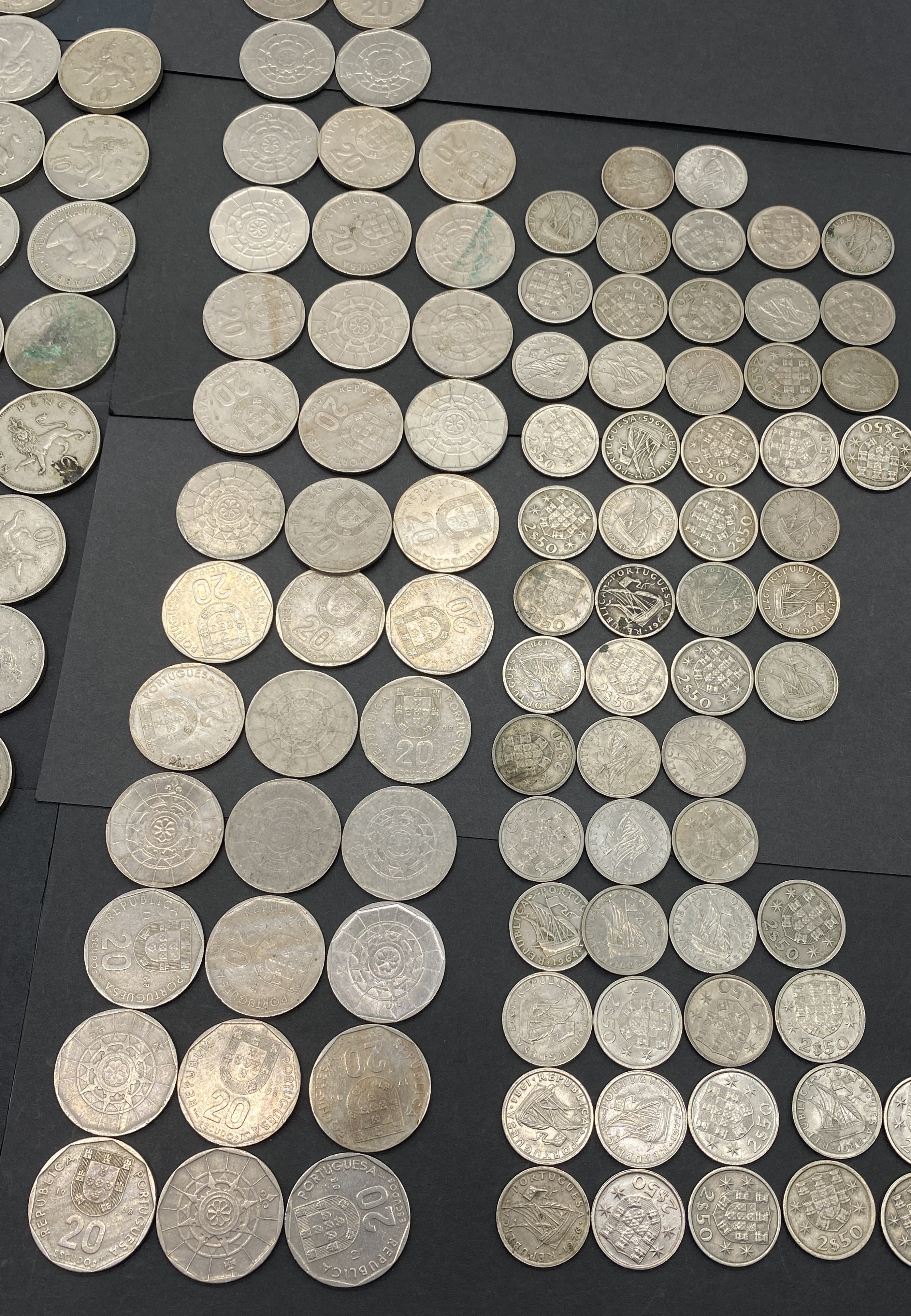 A collection of silver and gold Portuguese Escudo coins.