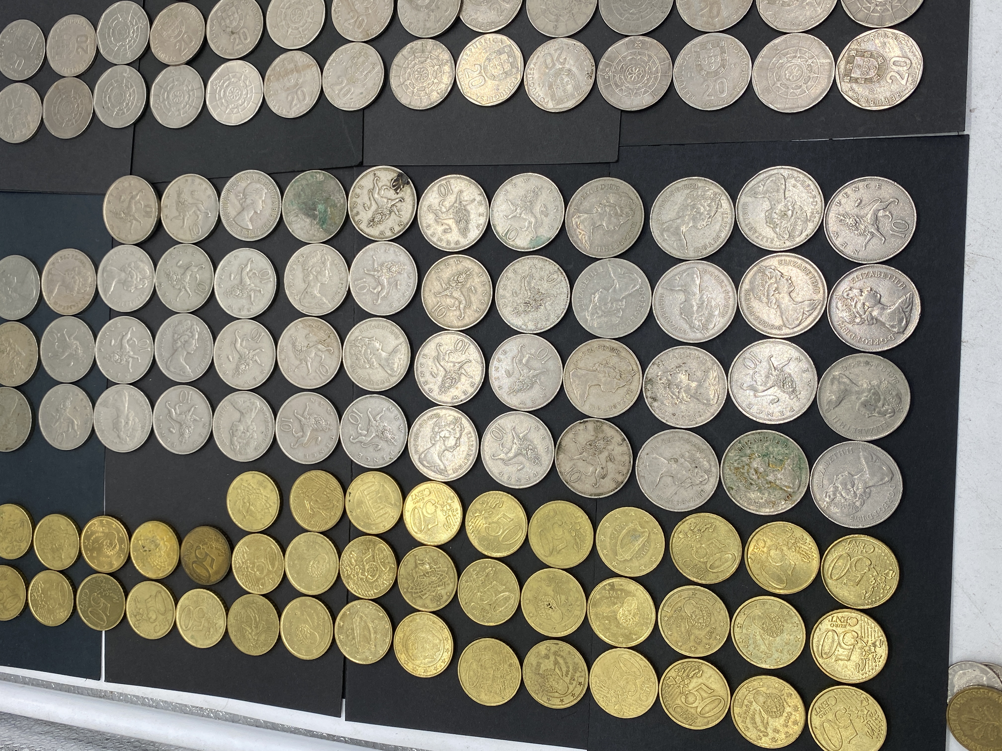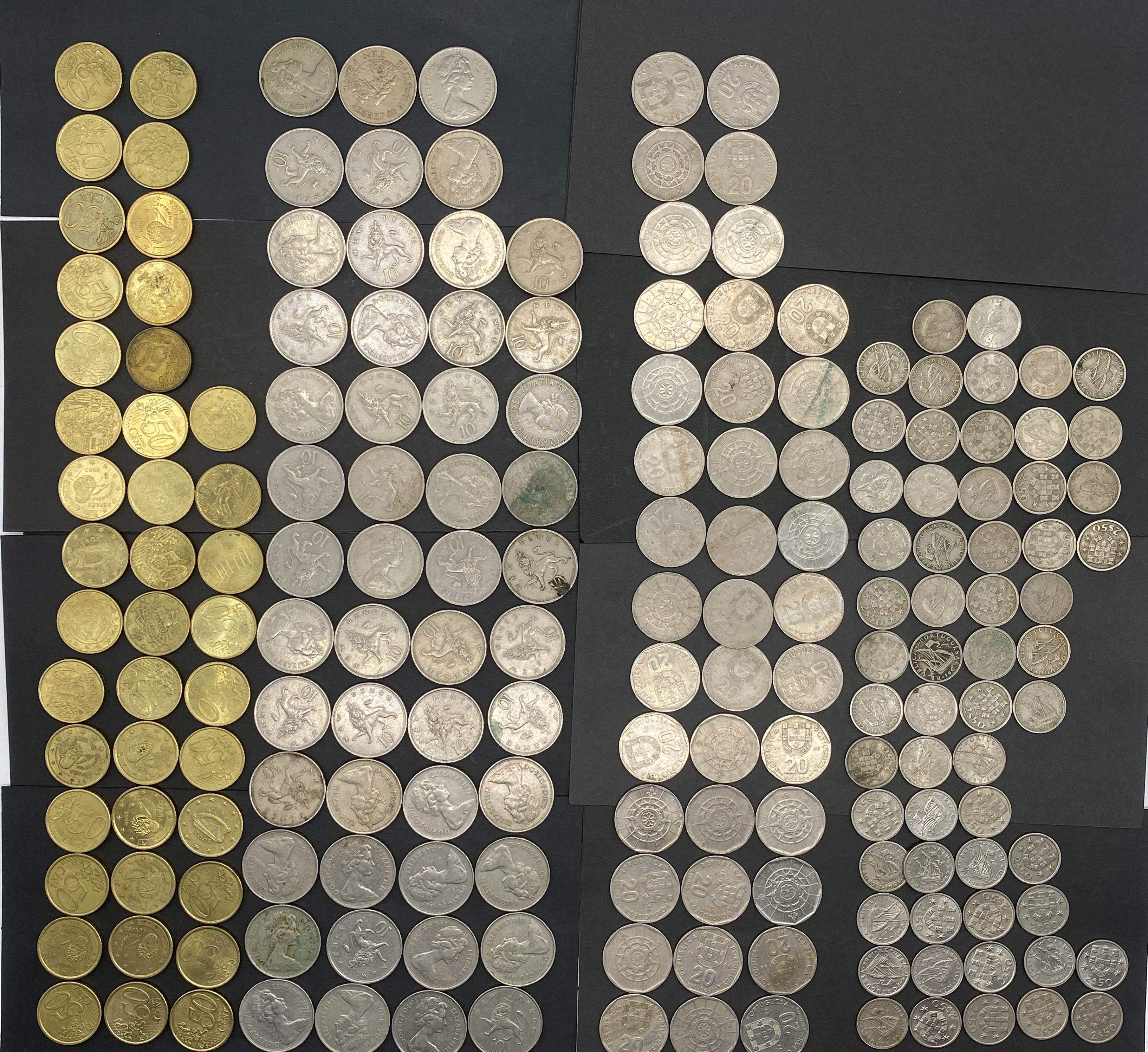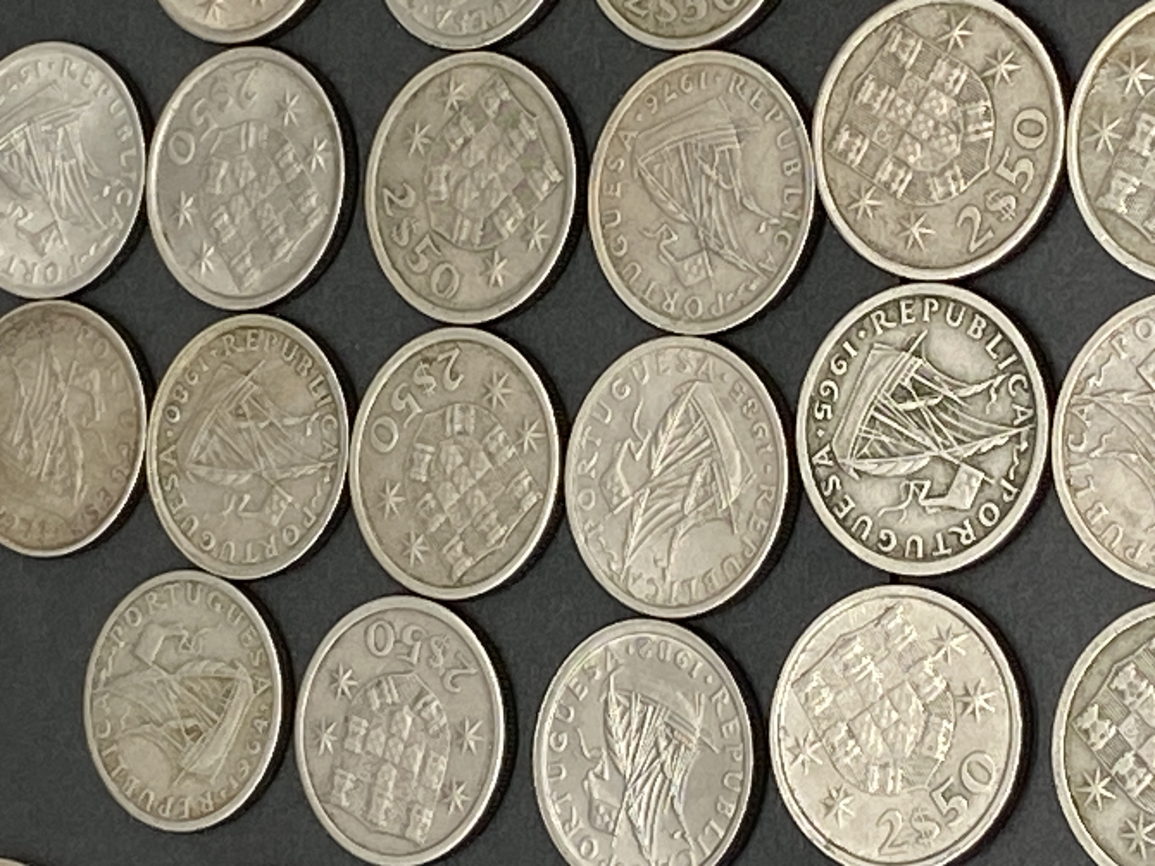 A collection of silver and gold Portuguese Escudo coins.