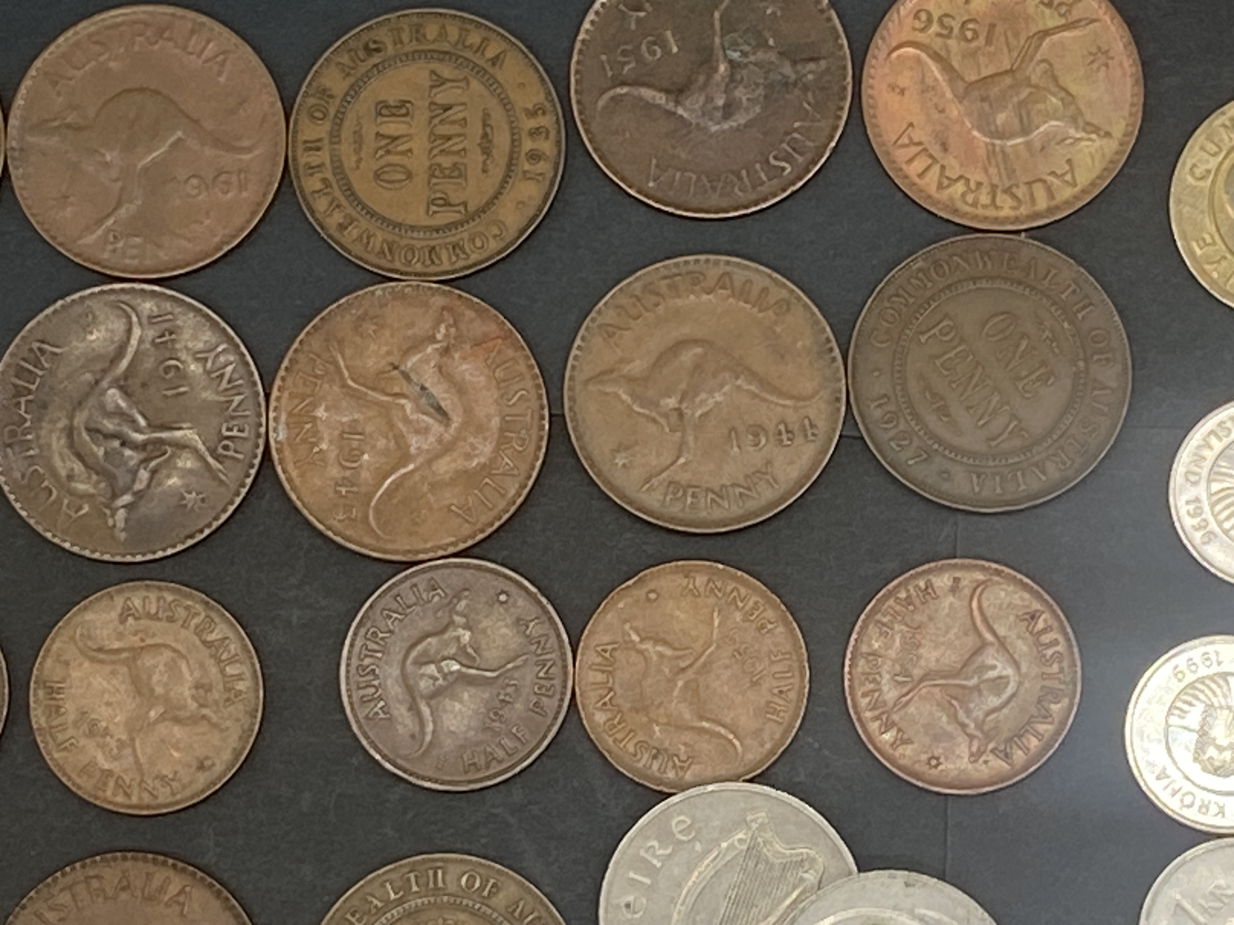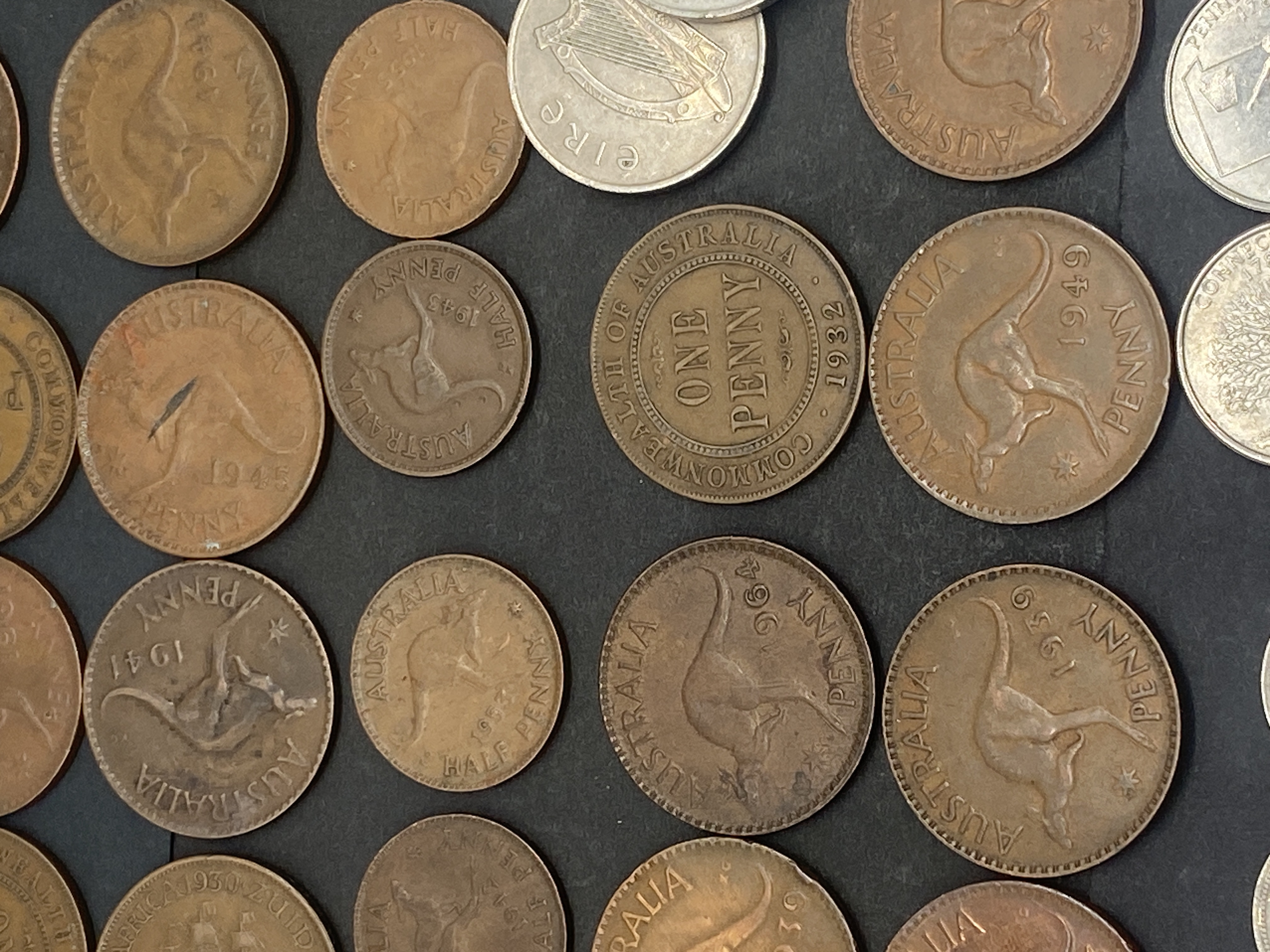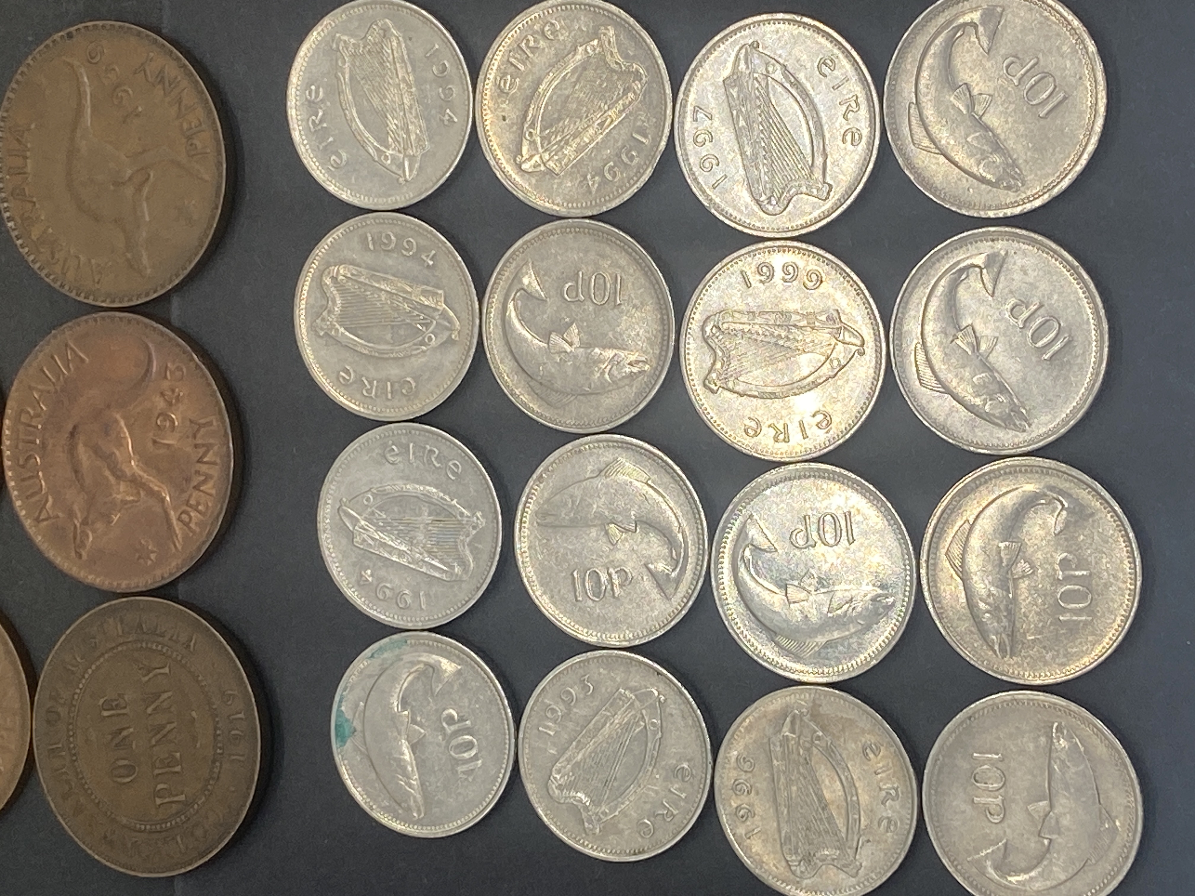 A collection of assorted bronze and silver coins including Australian, Irish, and other world coins.