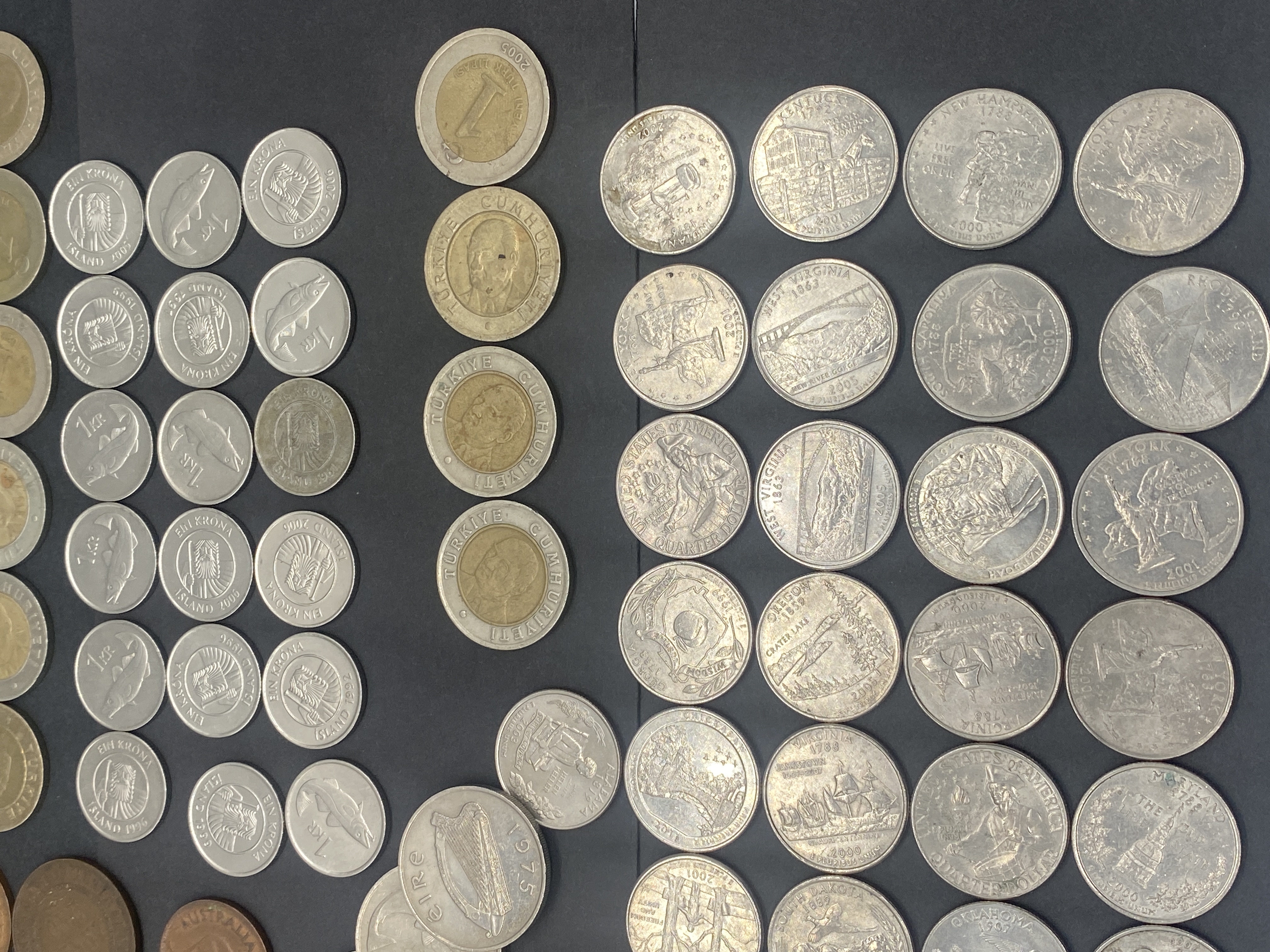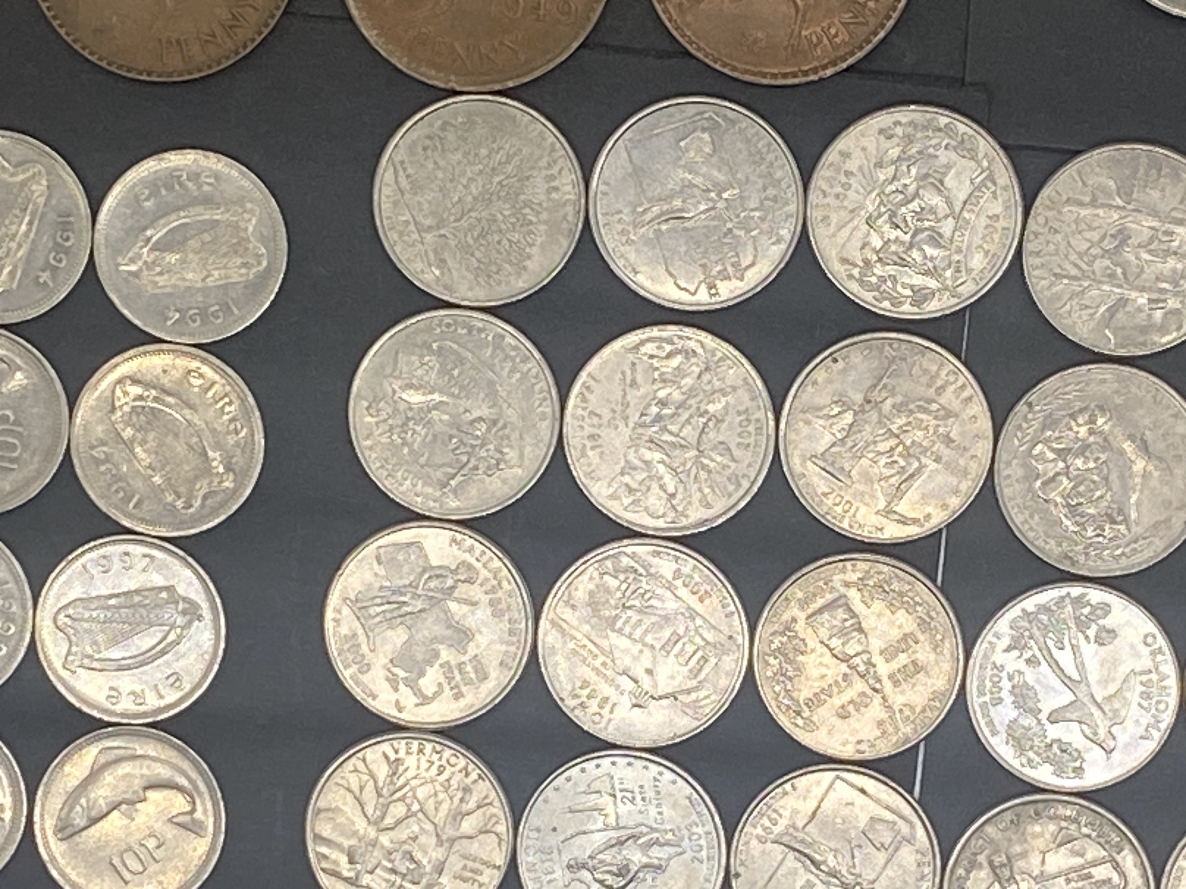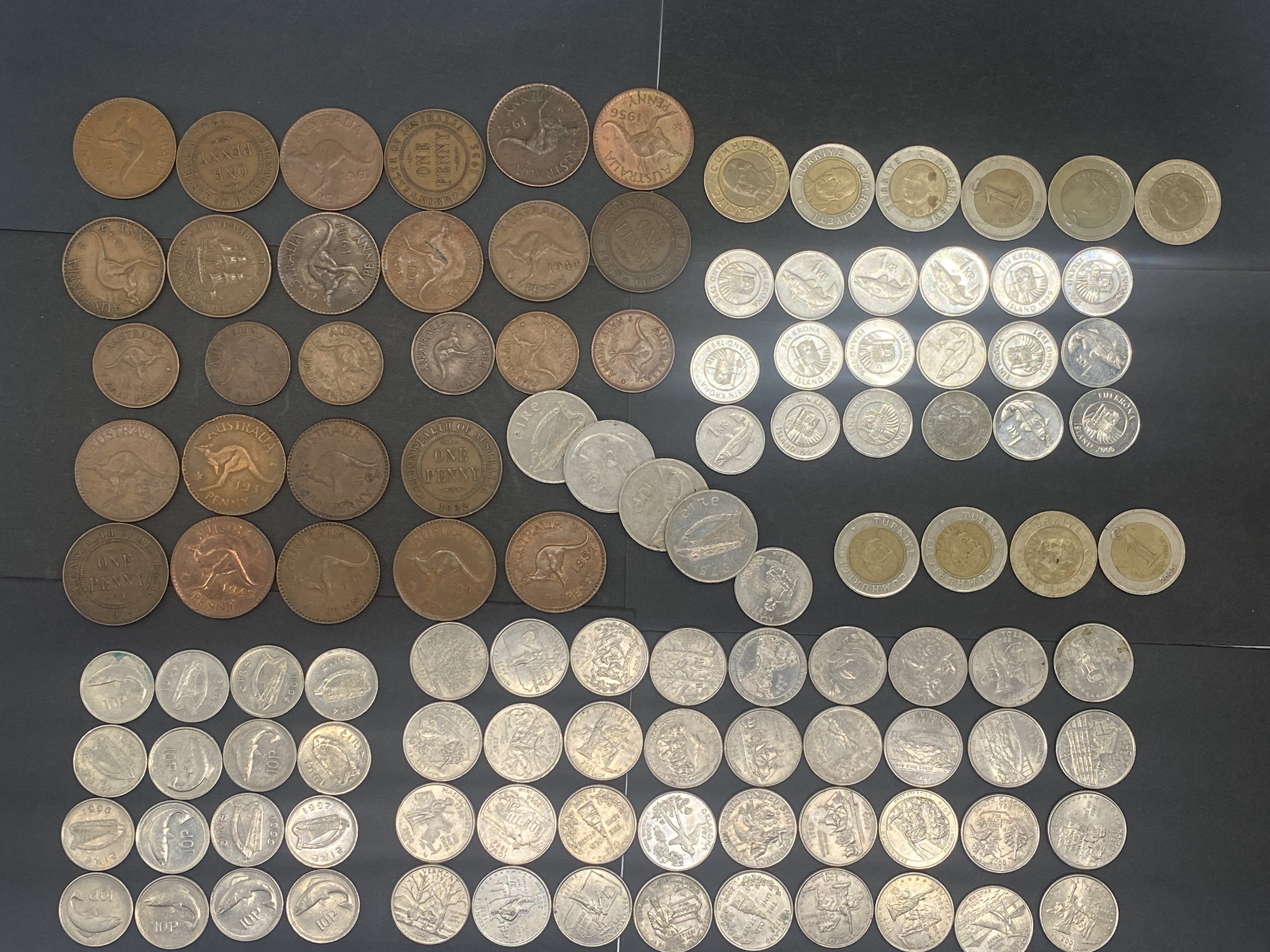 A collection of assorted bronze and silver coins including Australian, Irish, and other world coins.