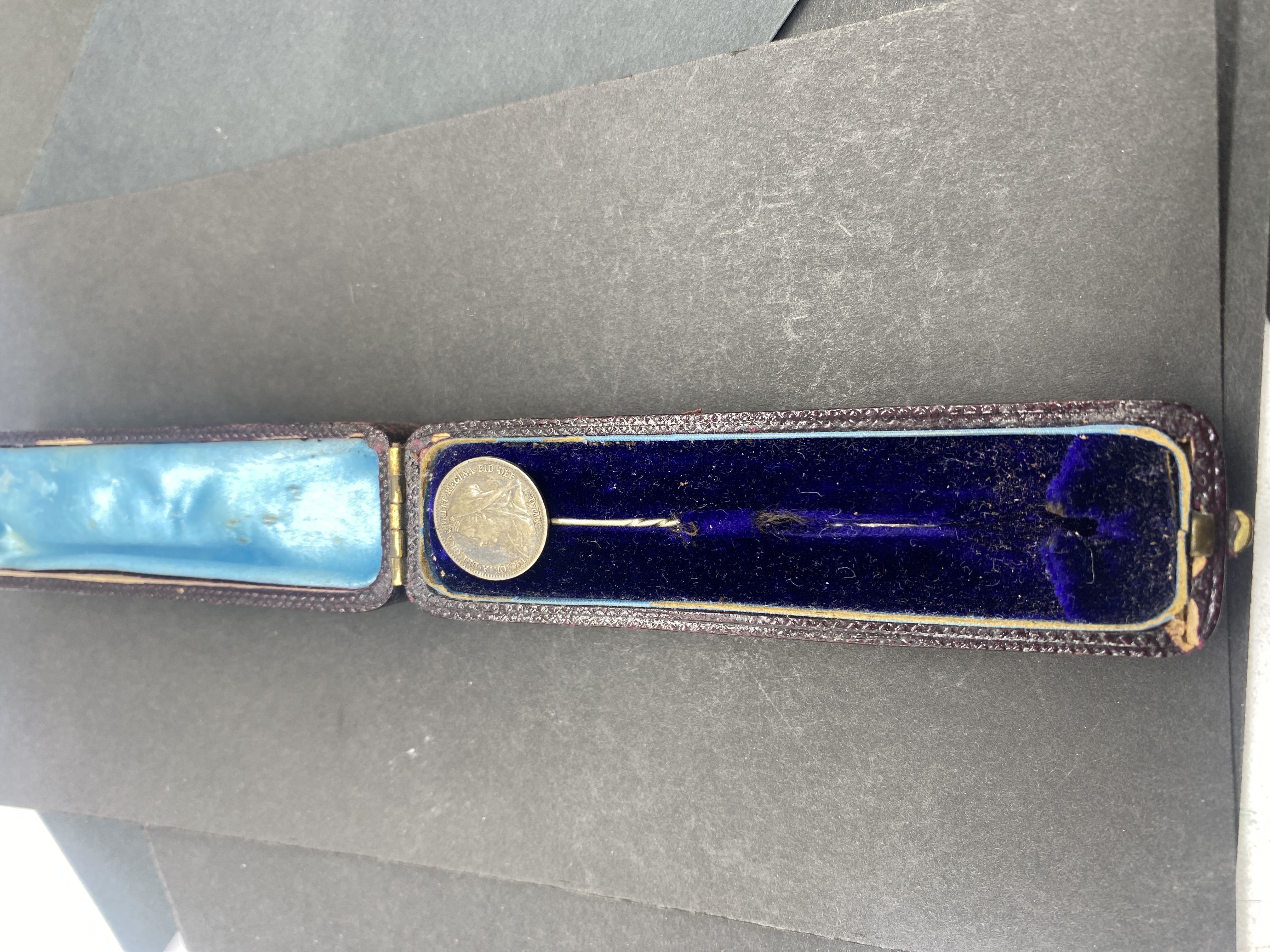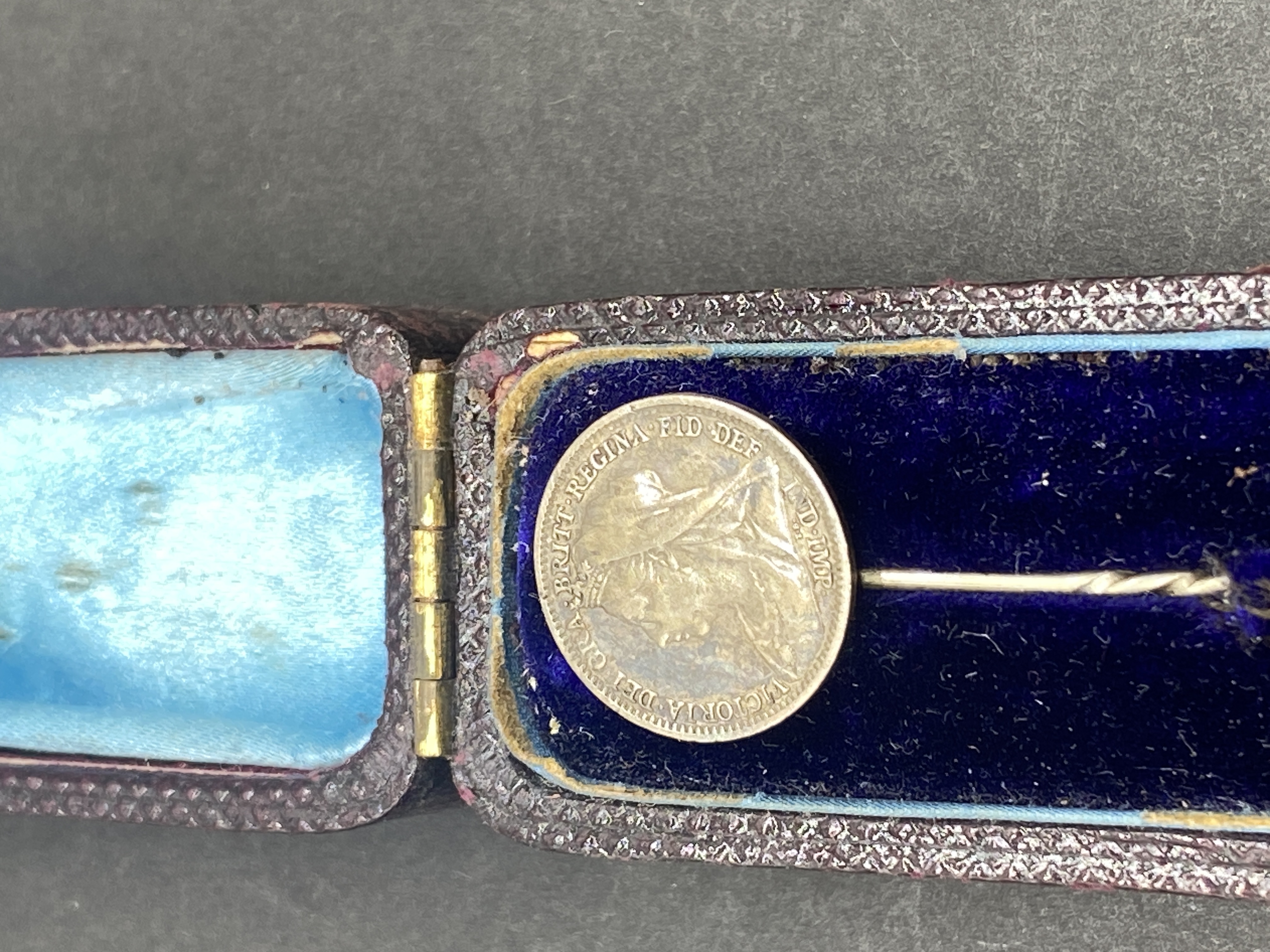 Silver Victorian coin lapel pin in a velvet and leatherette box.