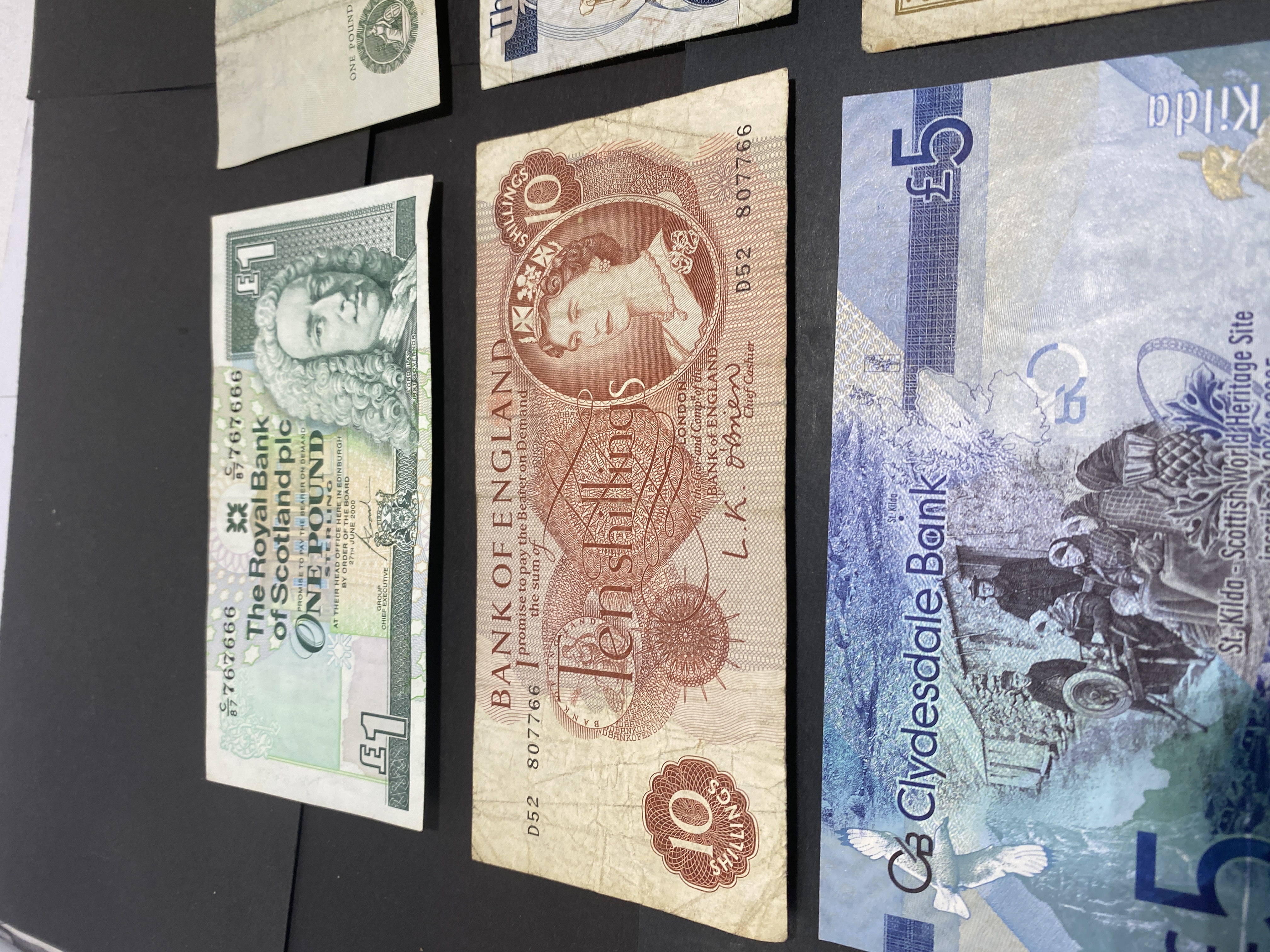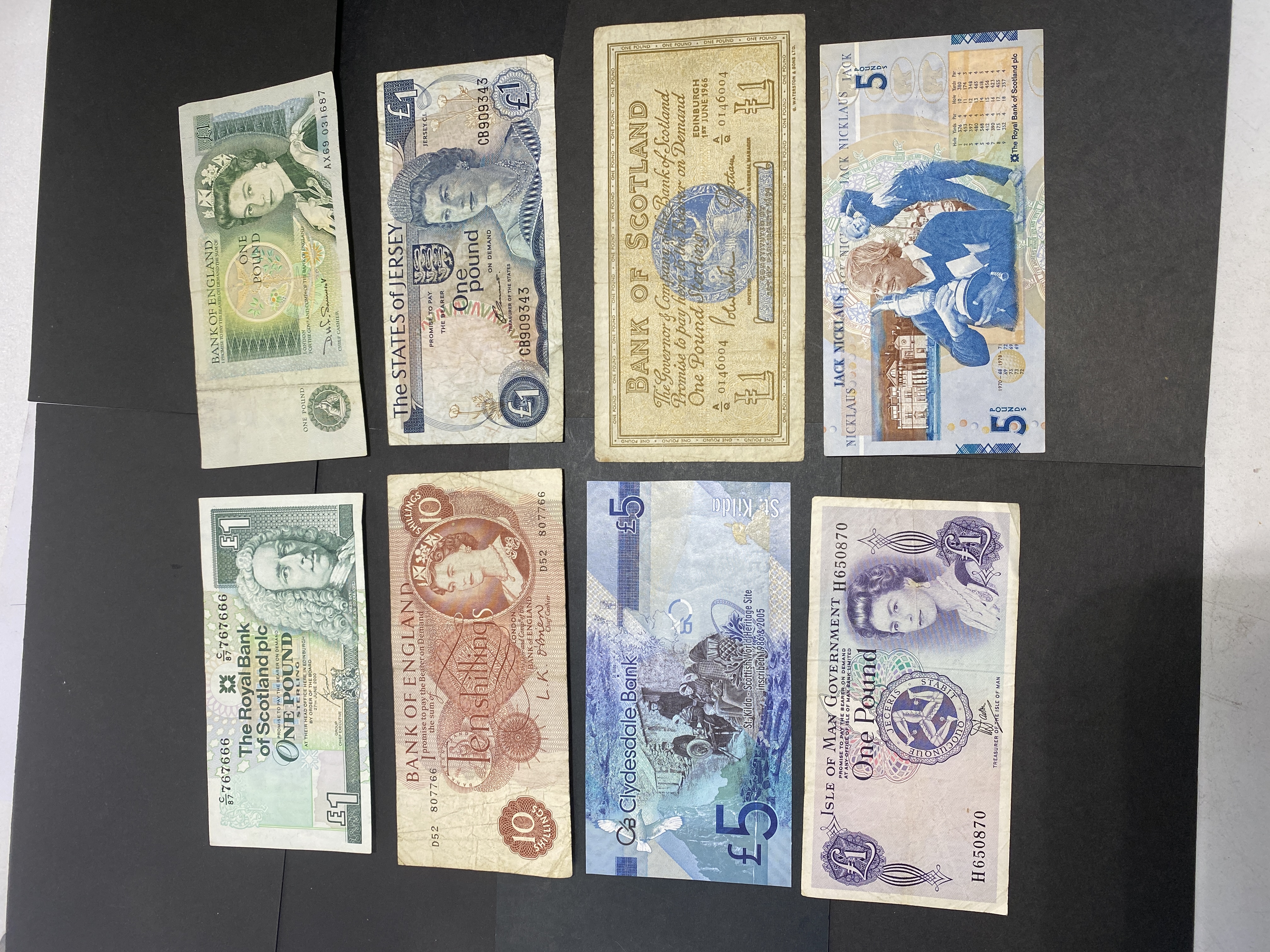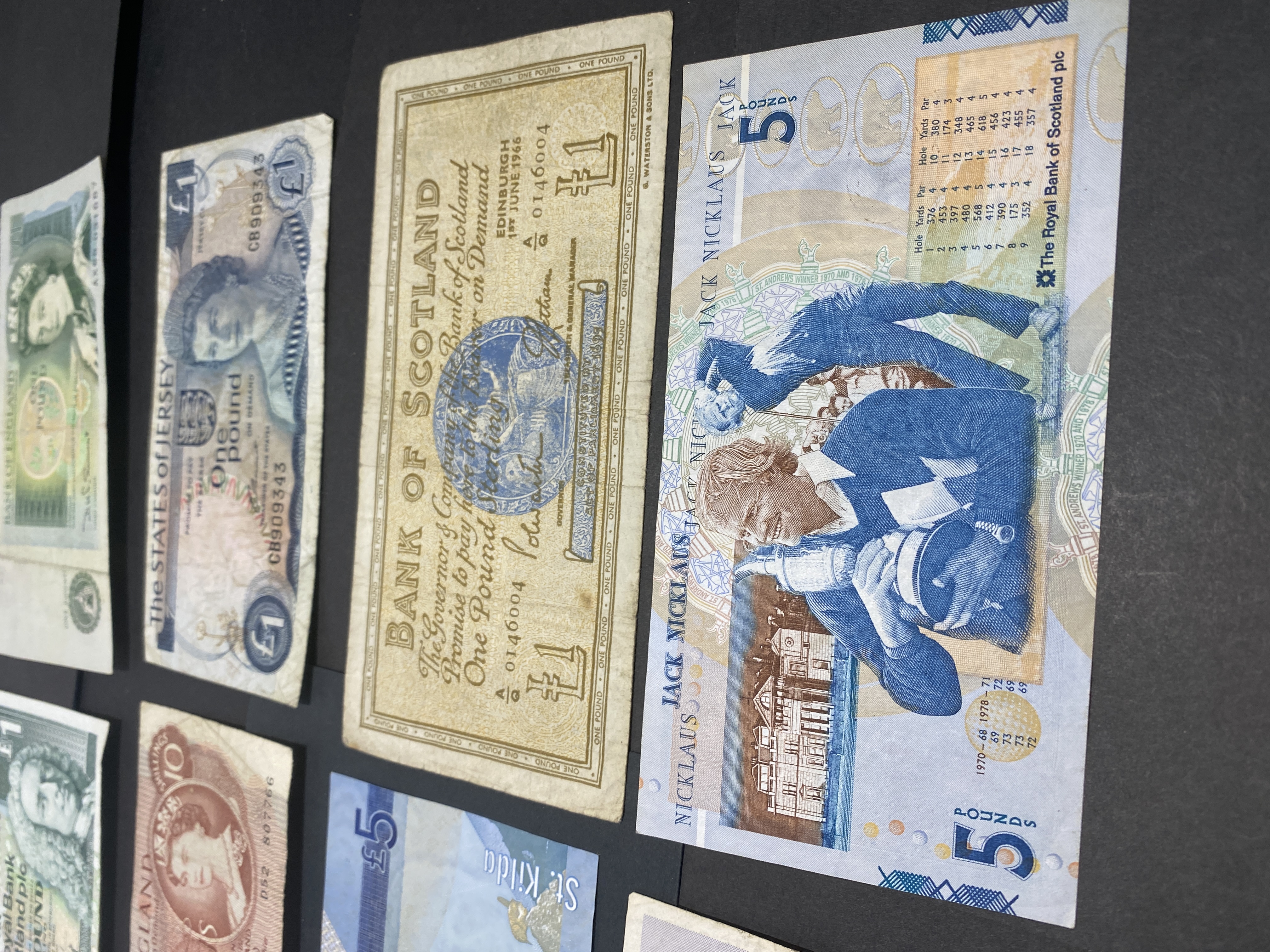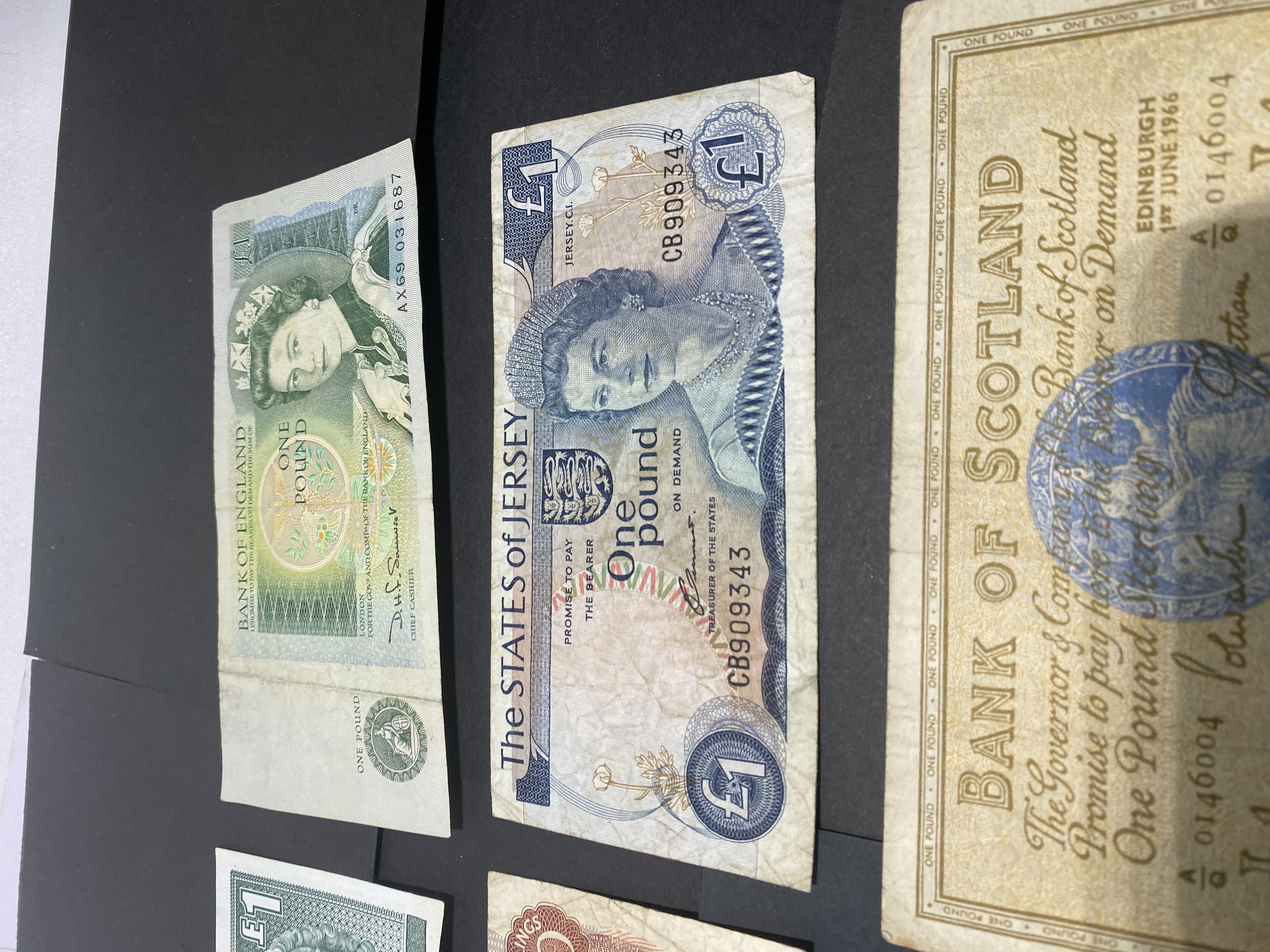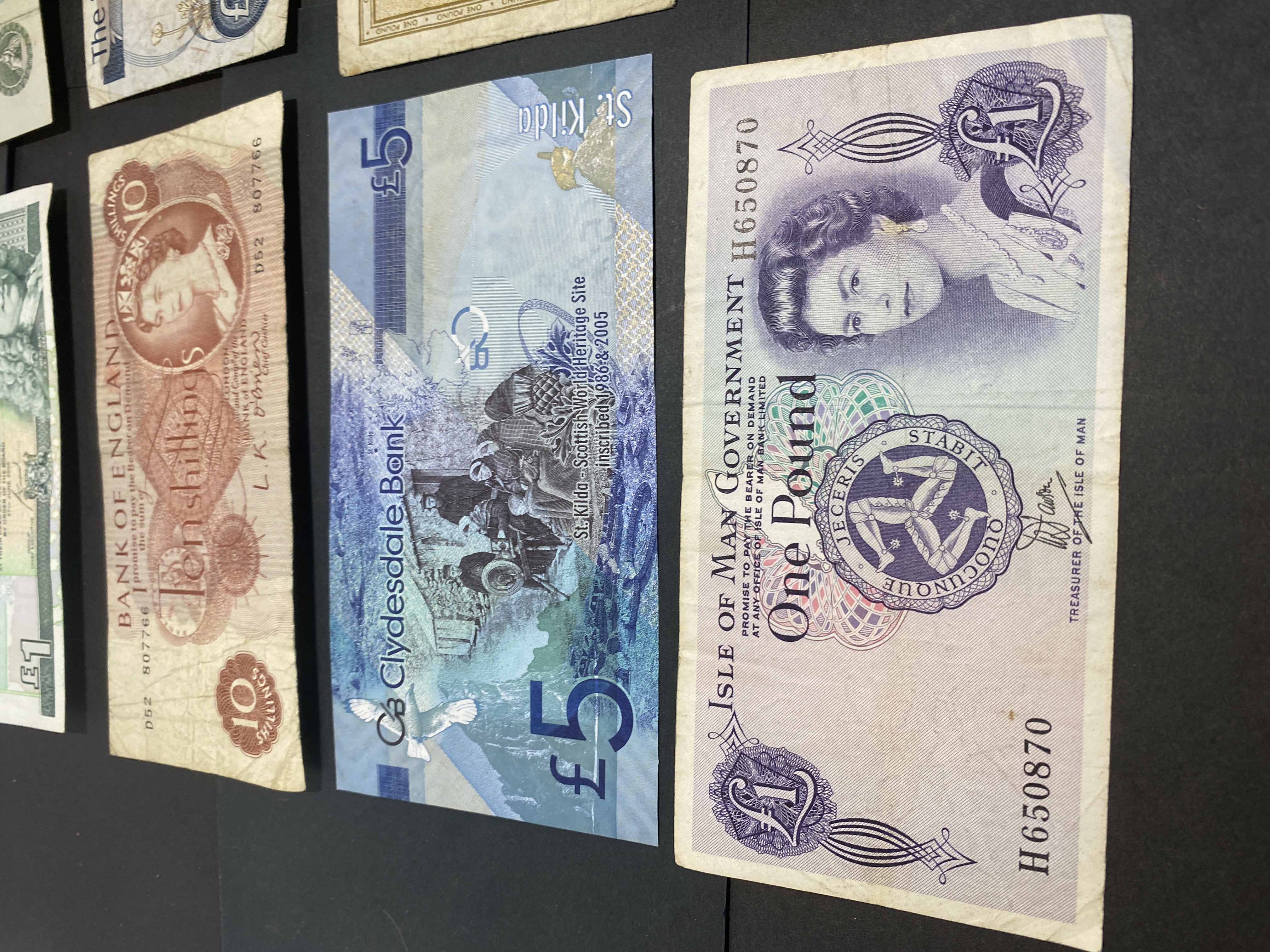 A collection of vintage banknotes from England, Scotland, Jersey, and the Isle of Man, including various denominations.
