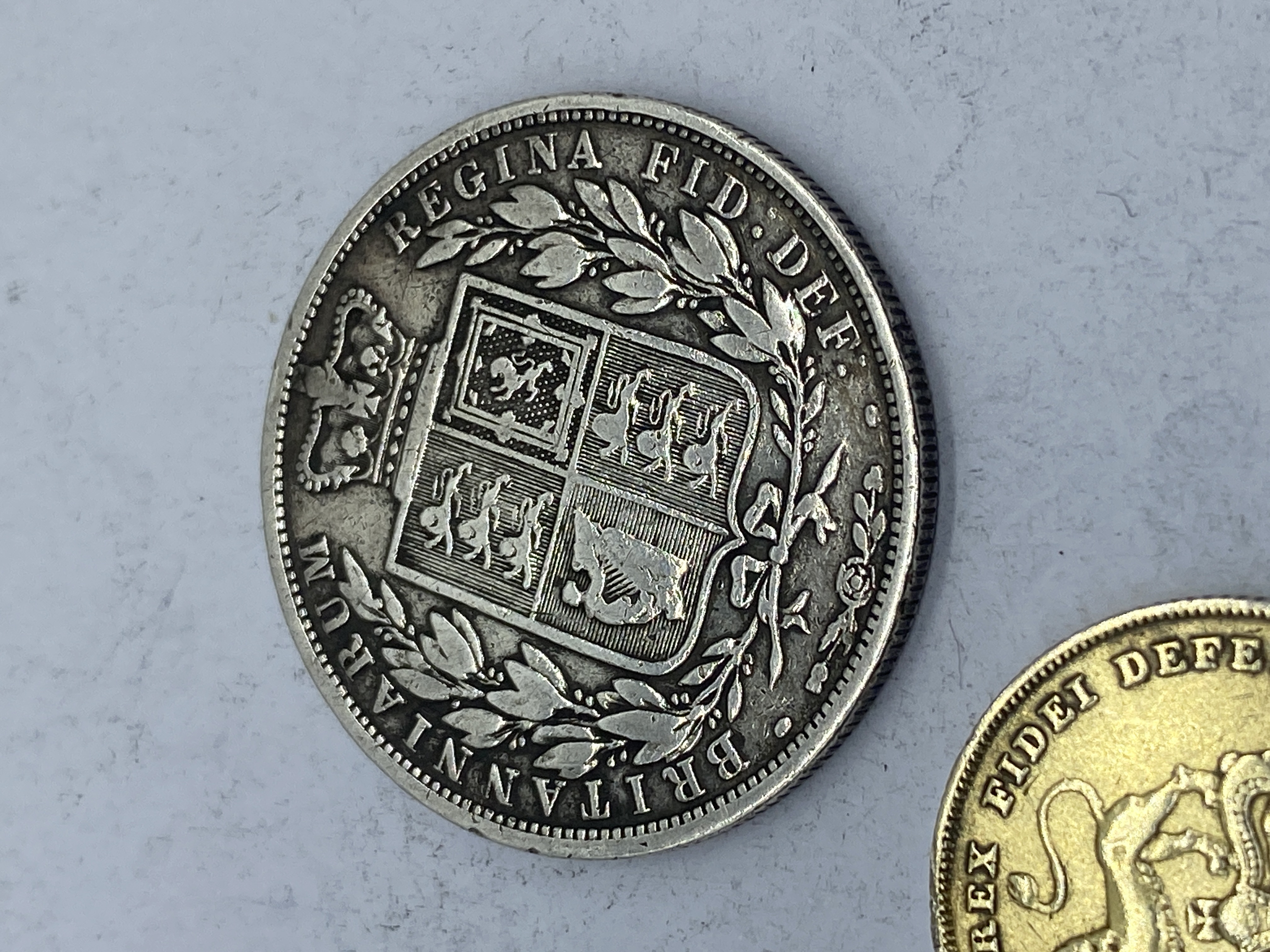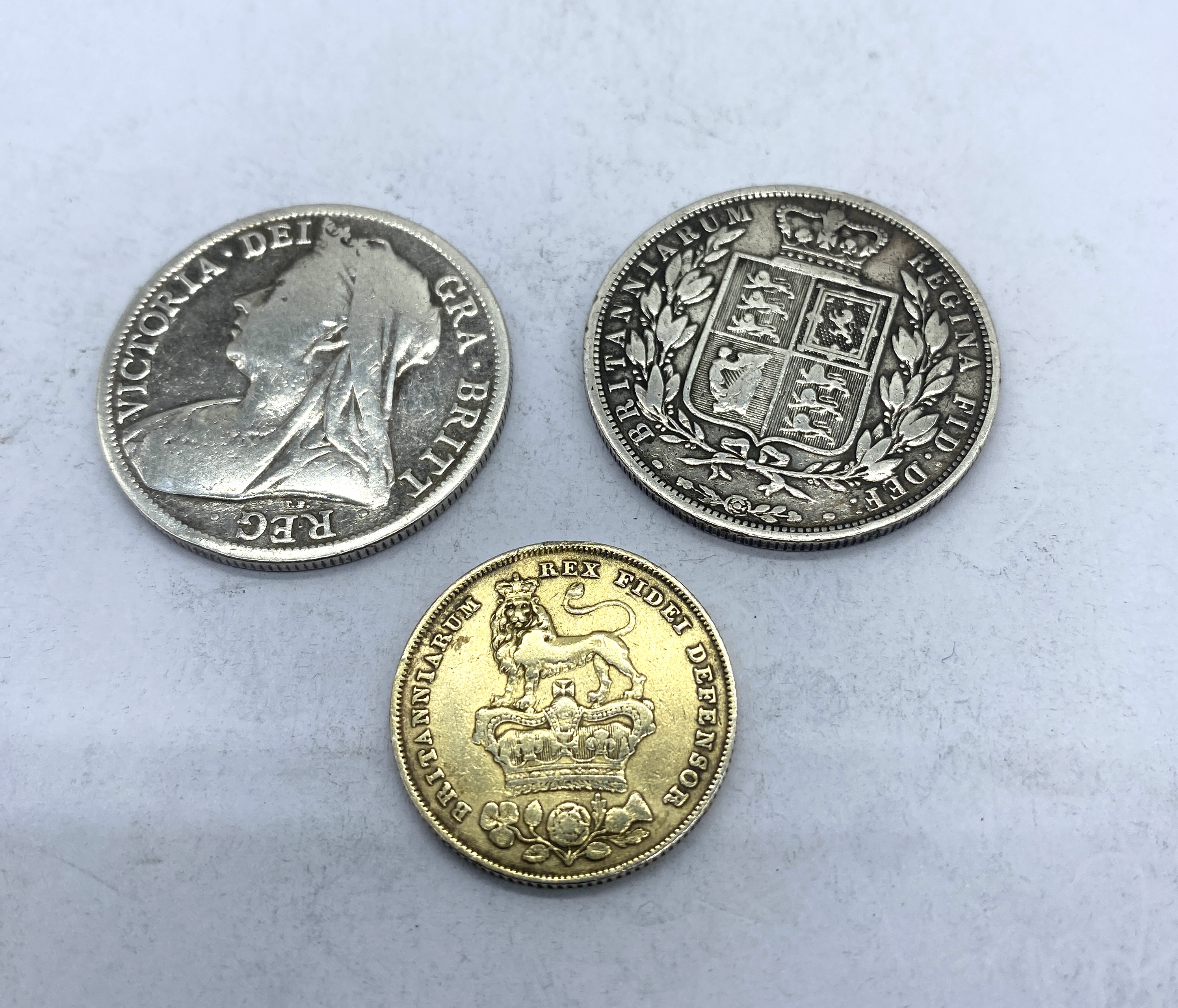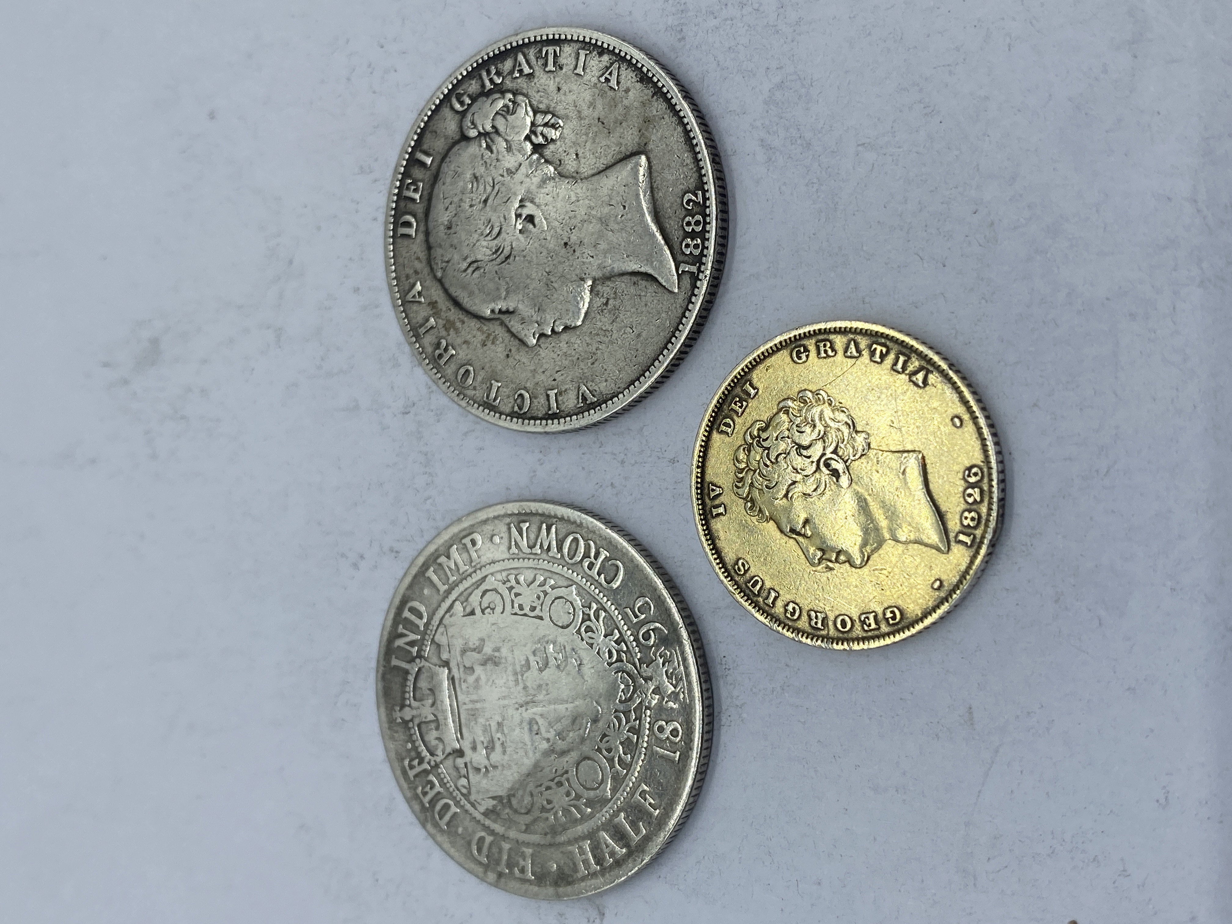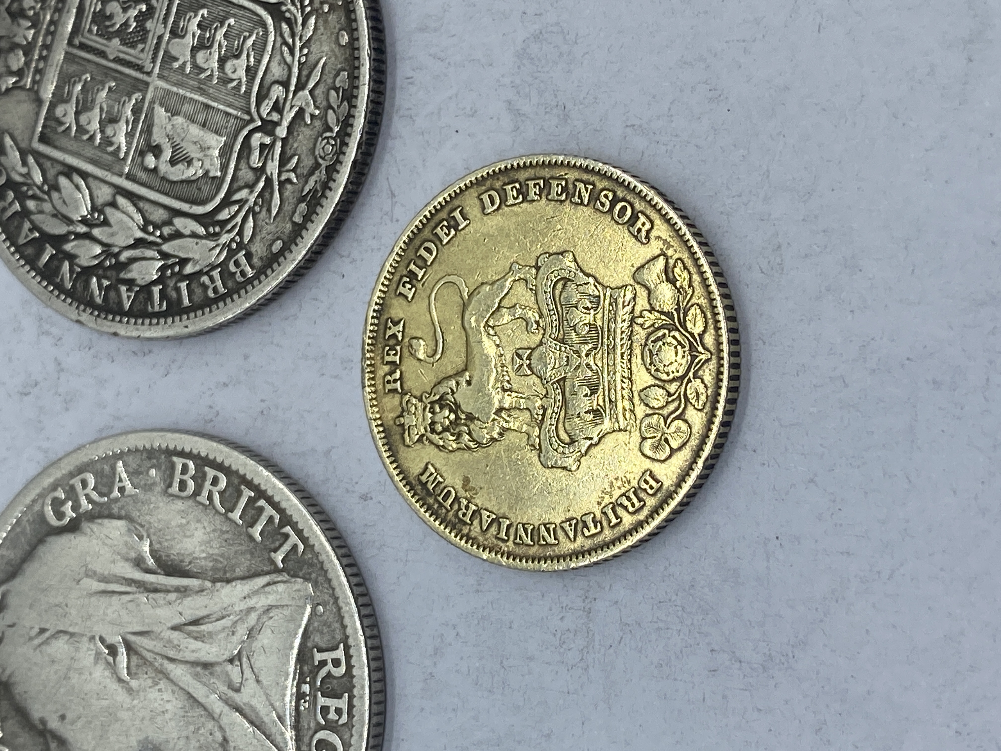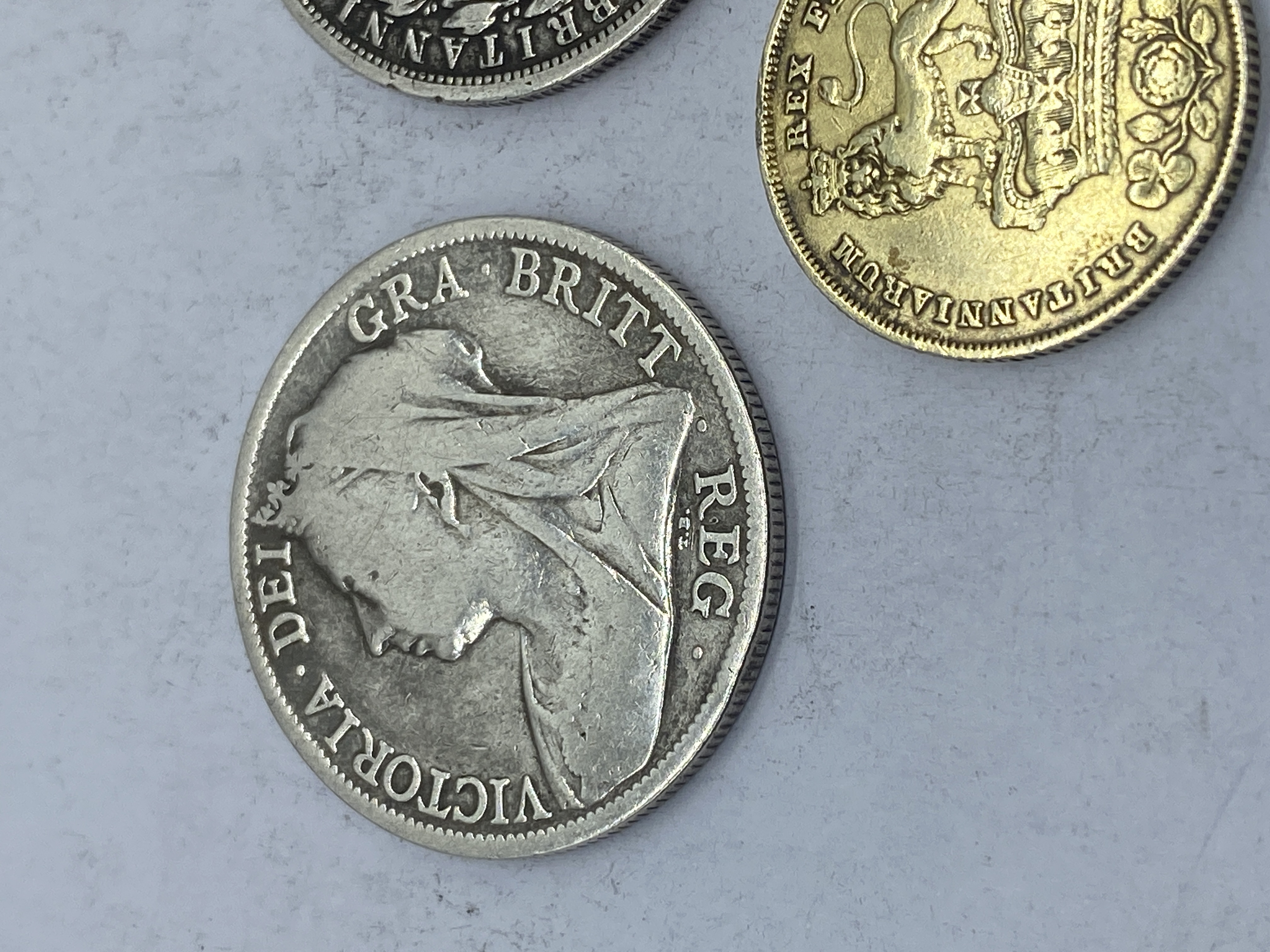 A collection of British coins, including silver half crowns and at least one gold coin.