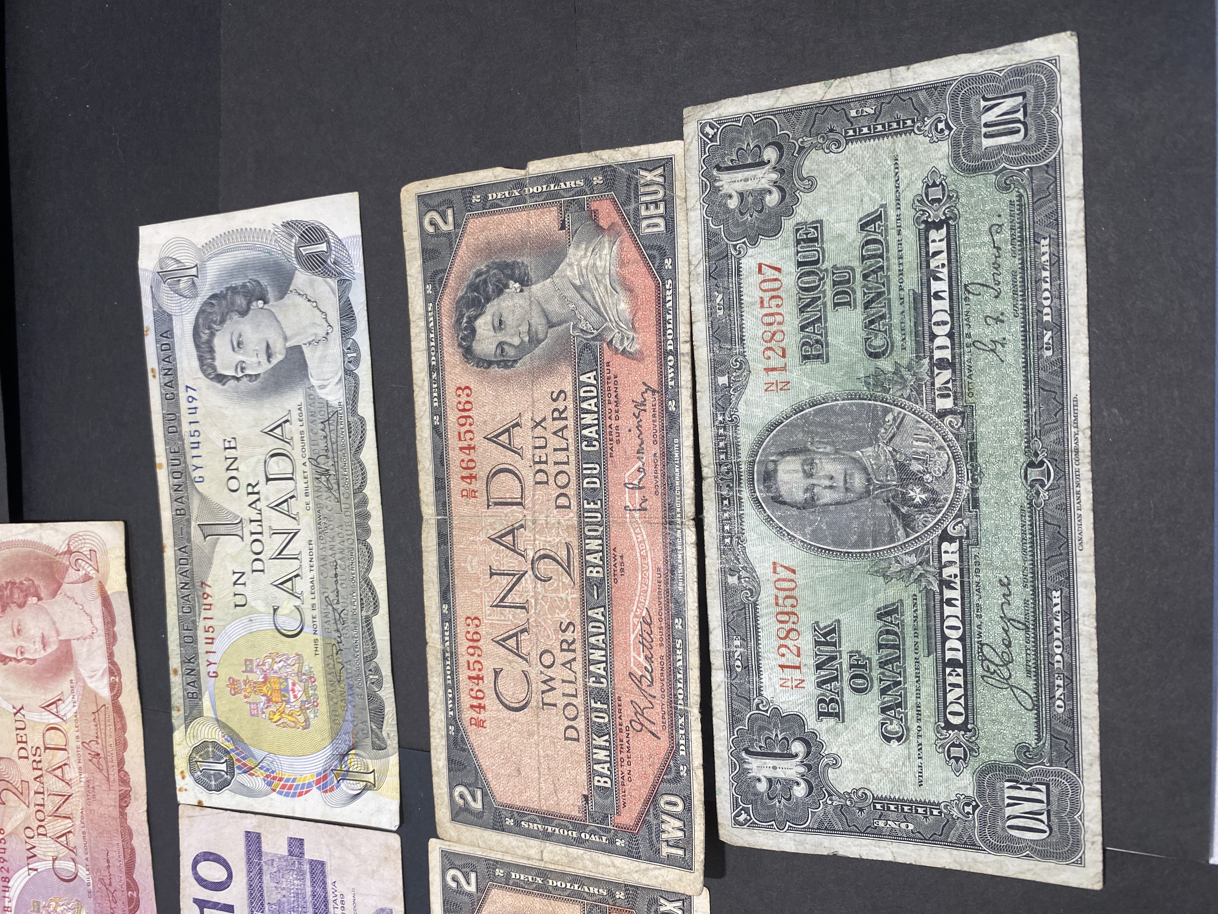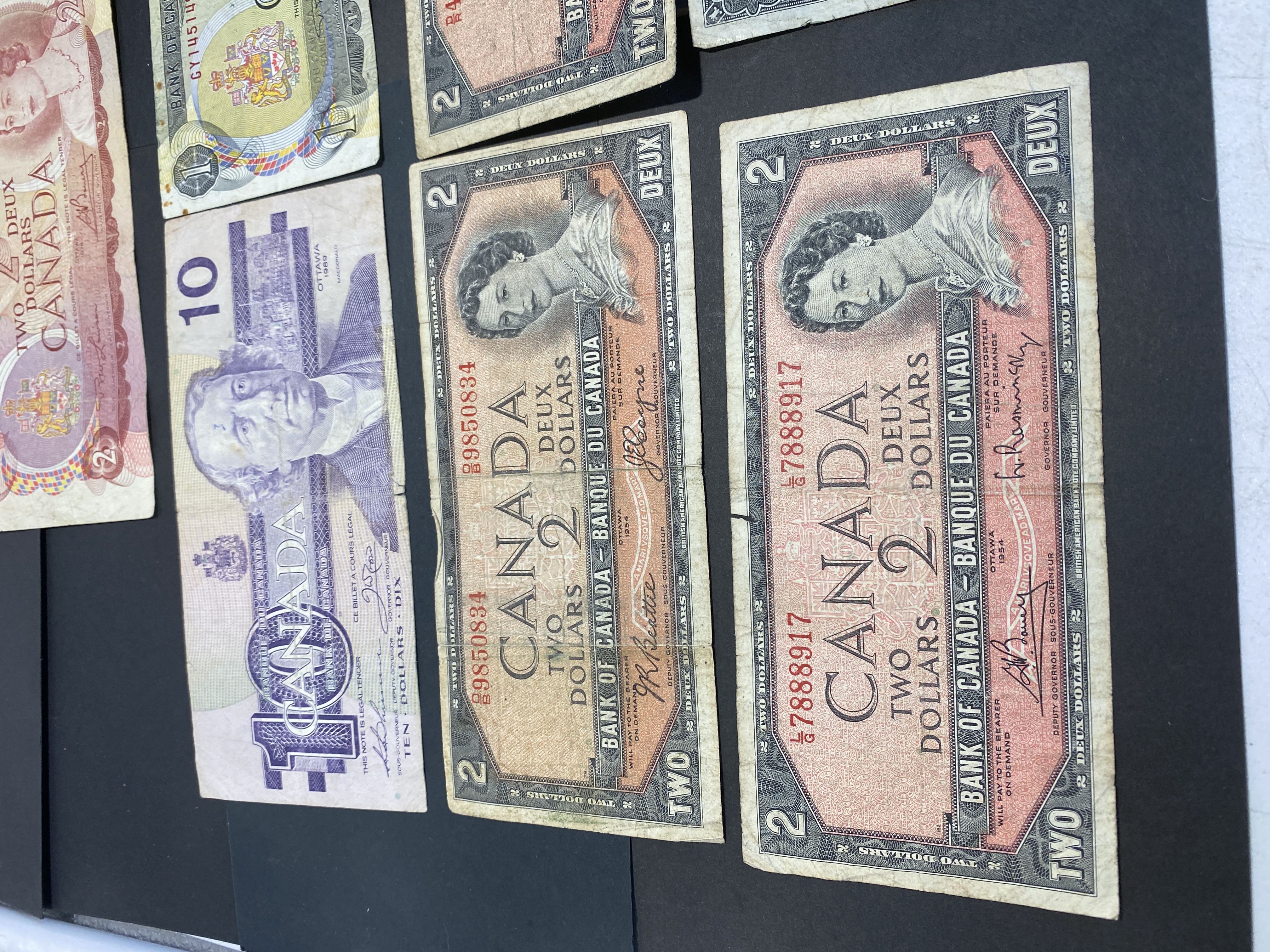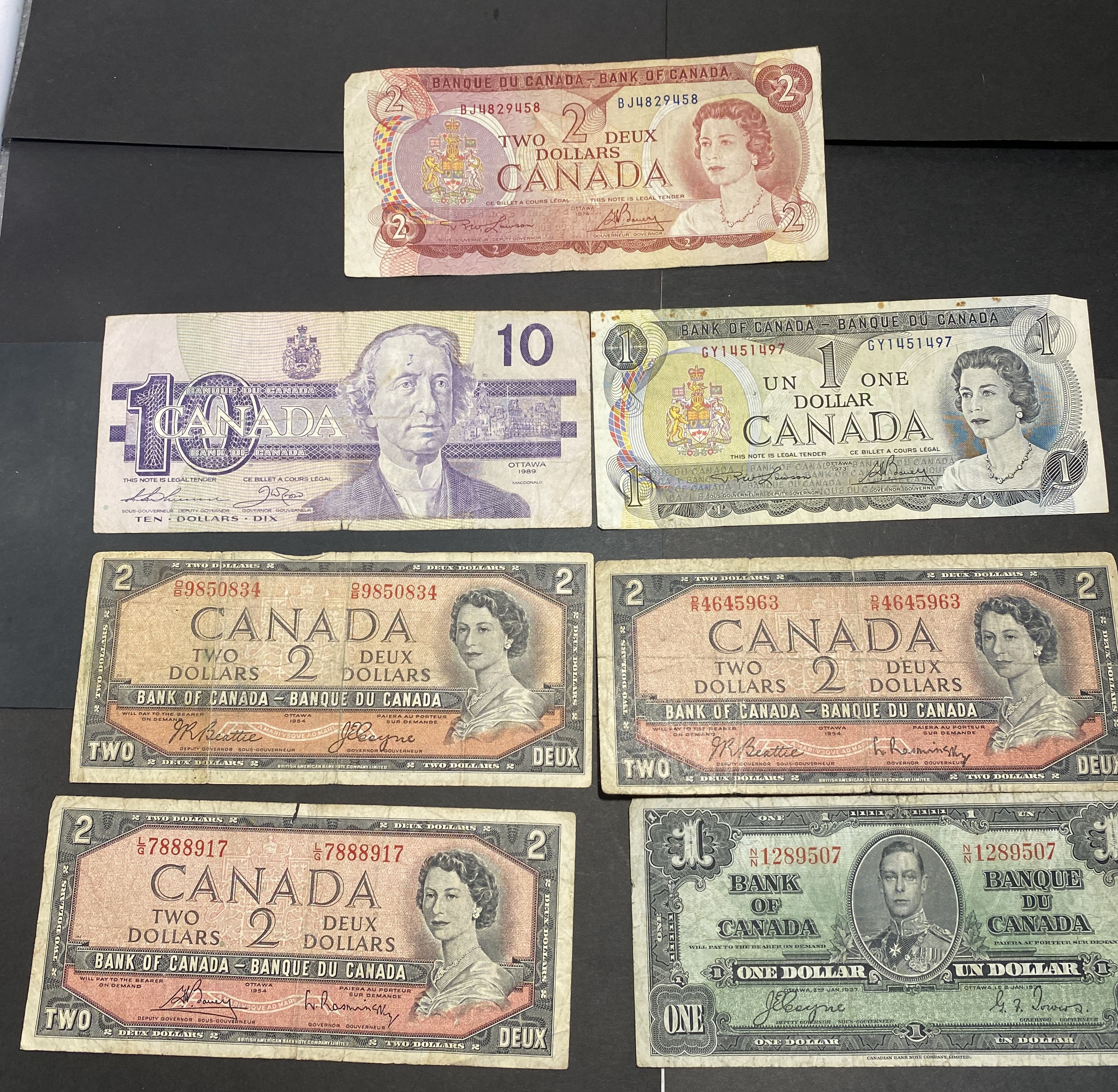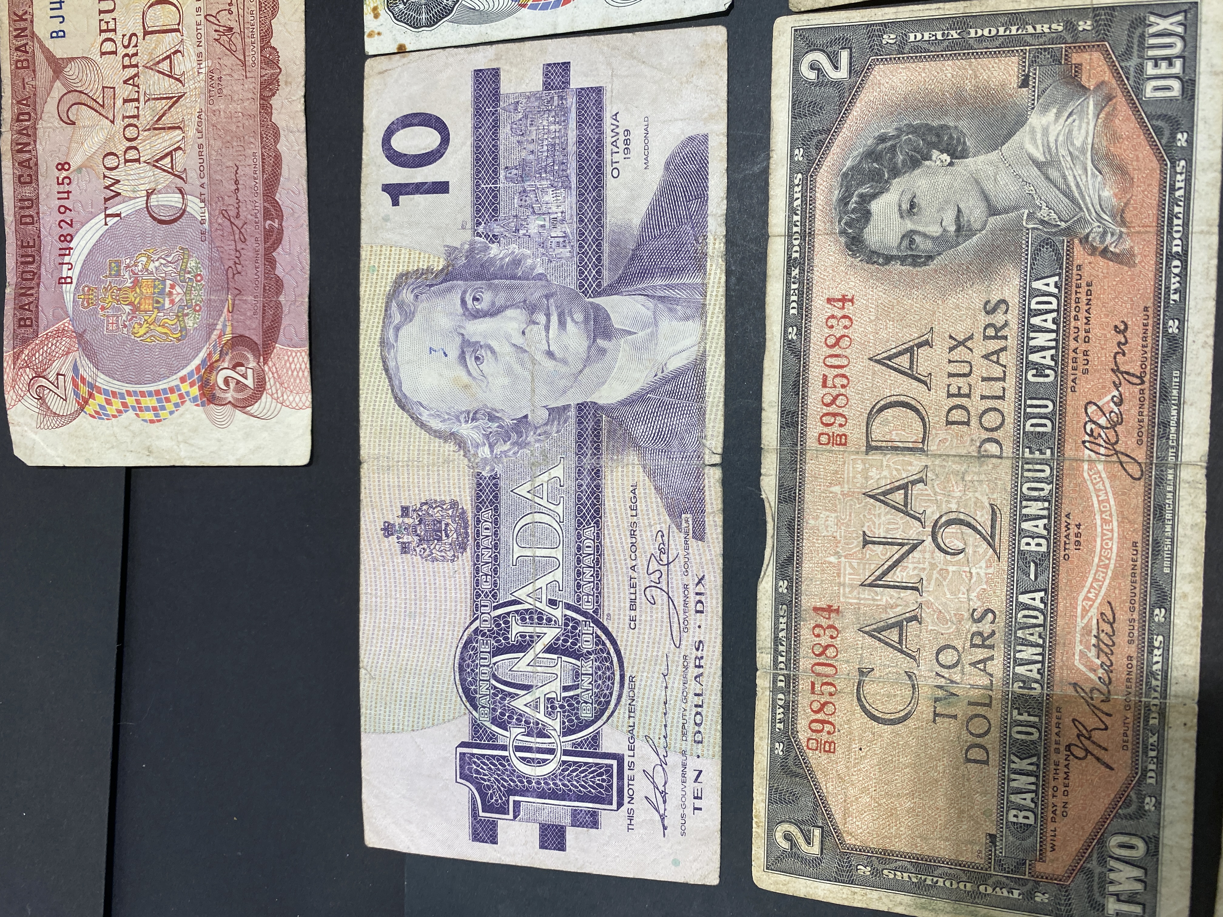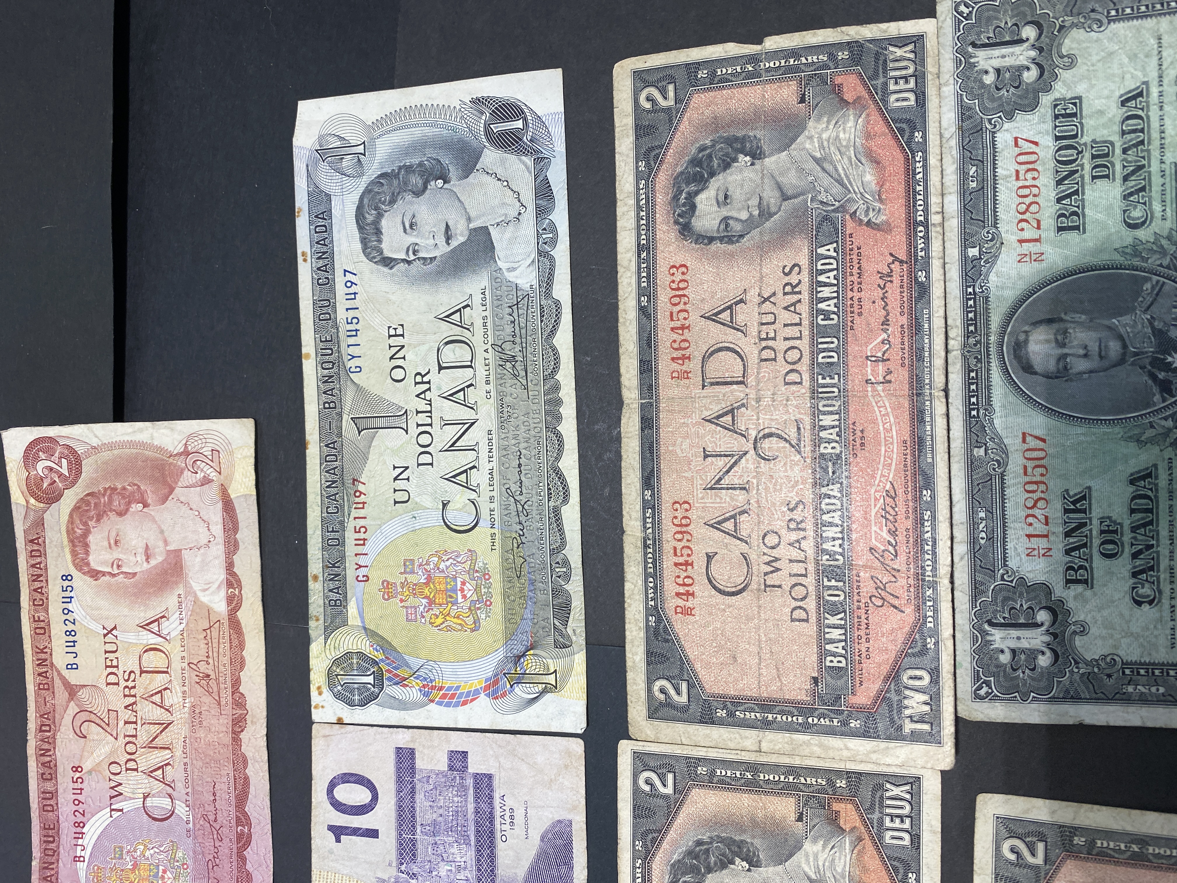 A collection of circulated Canadian banknotes featuring Queen Elizabeth II in $1, $2, and $10 denominations.