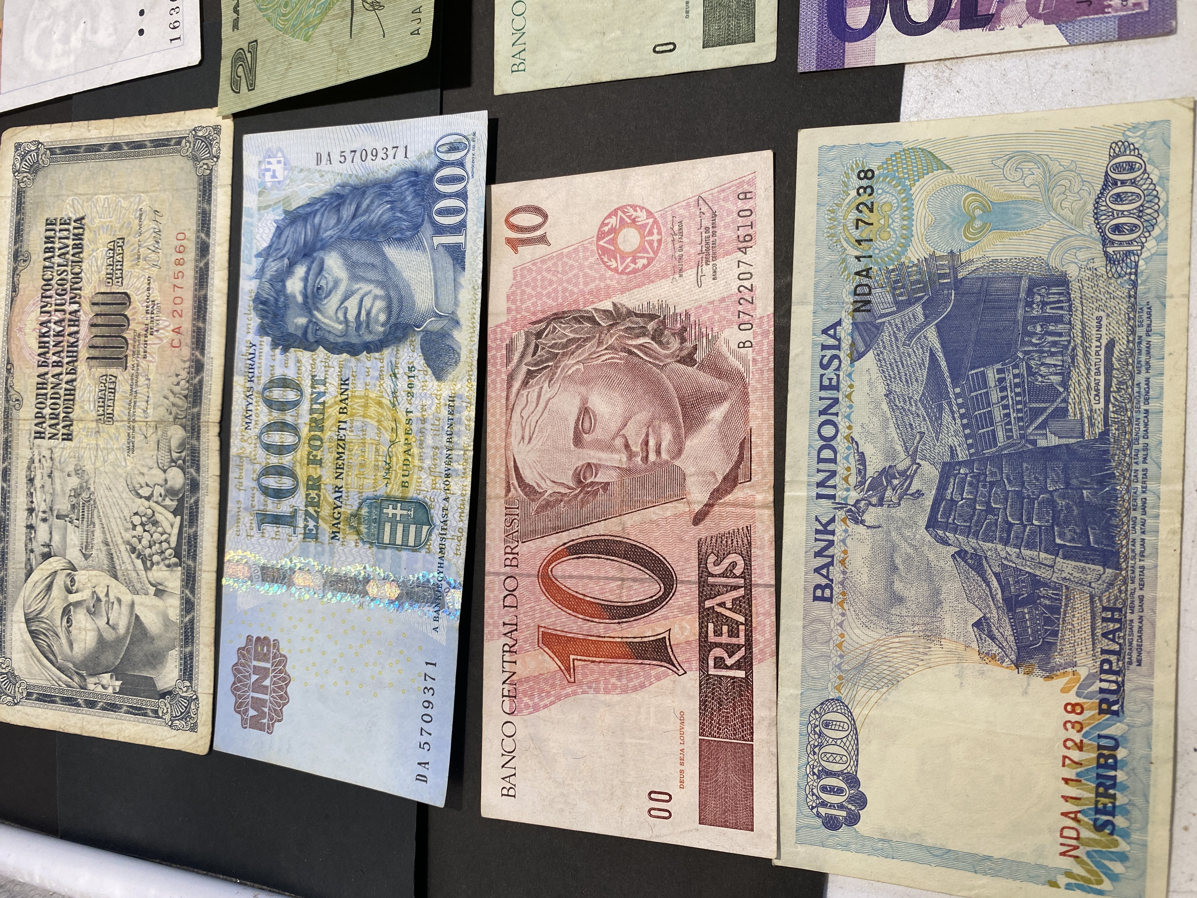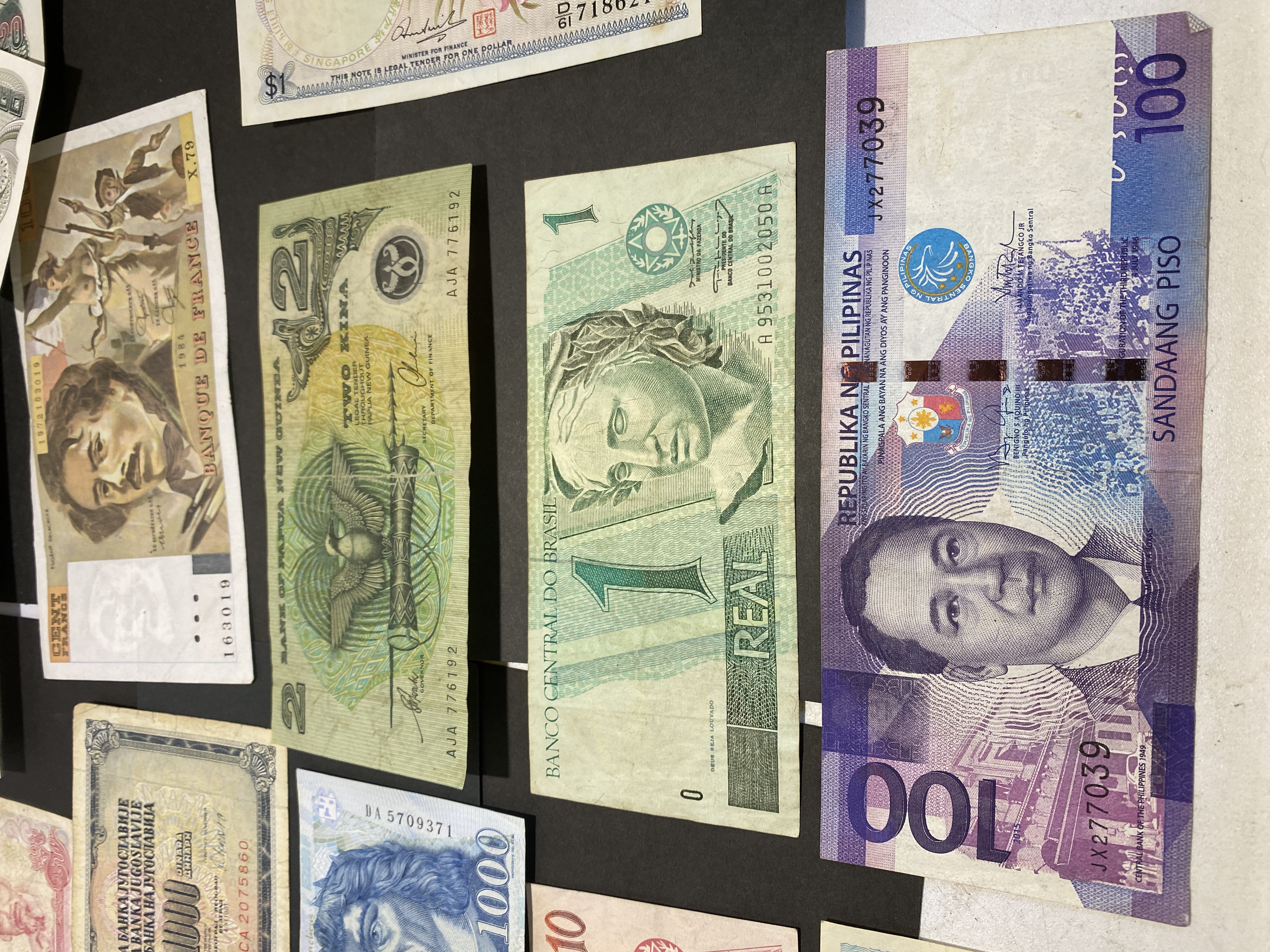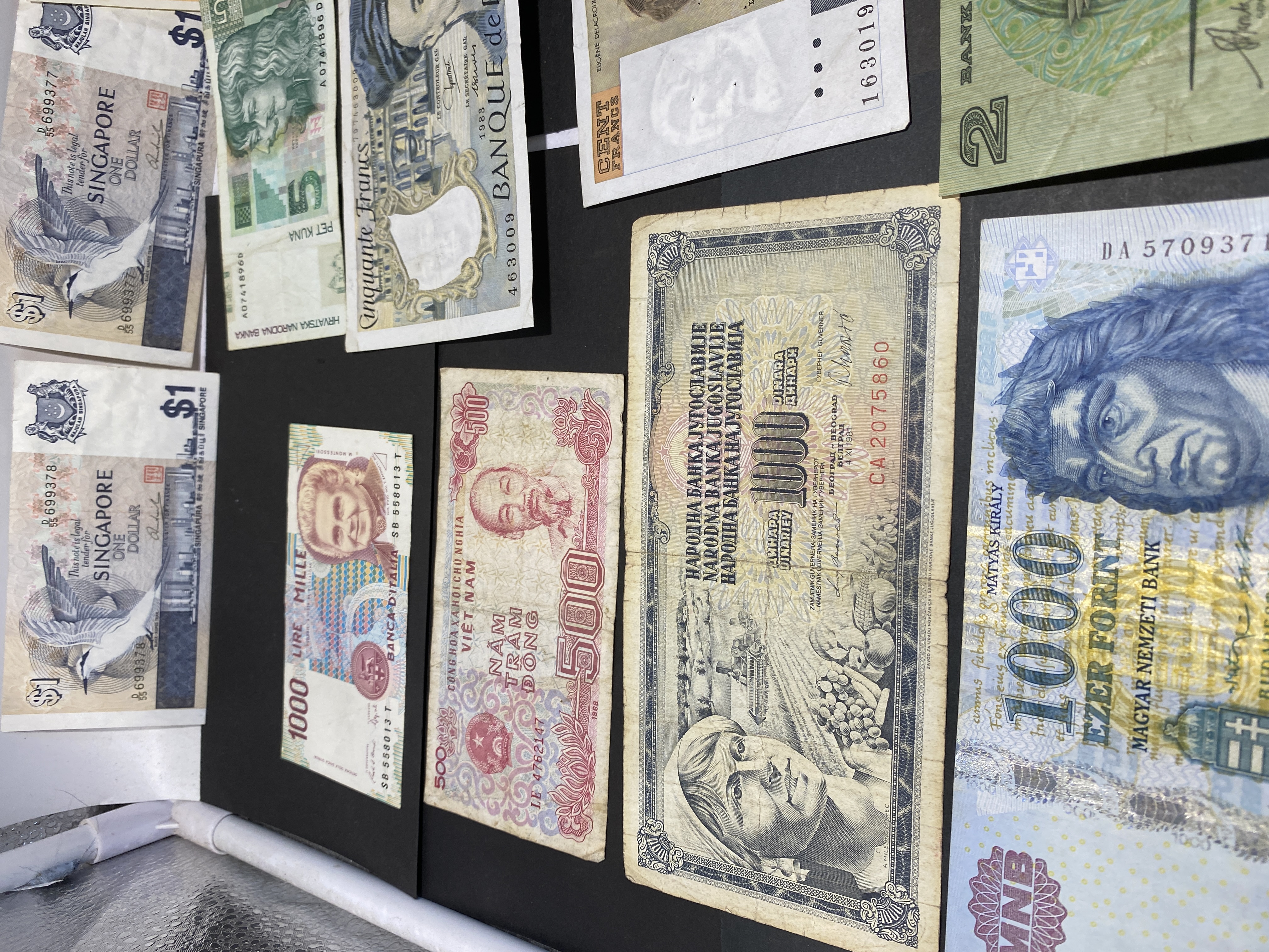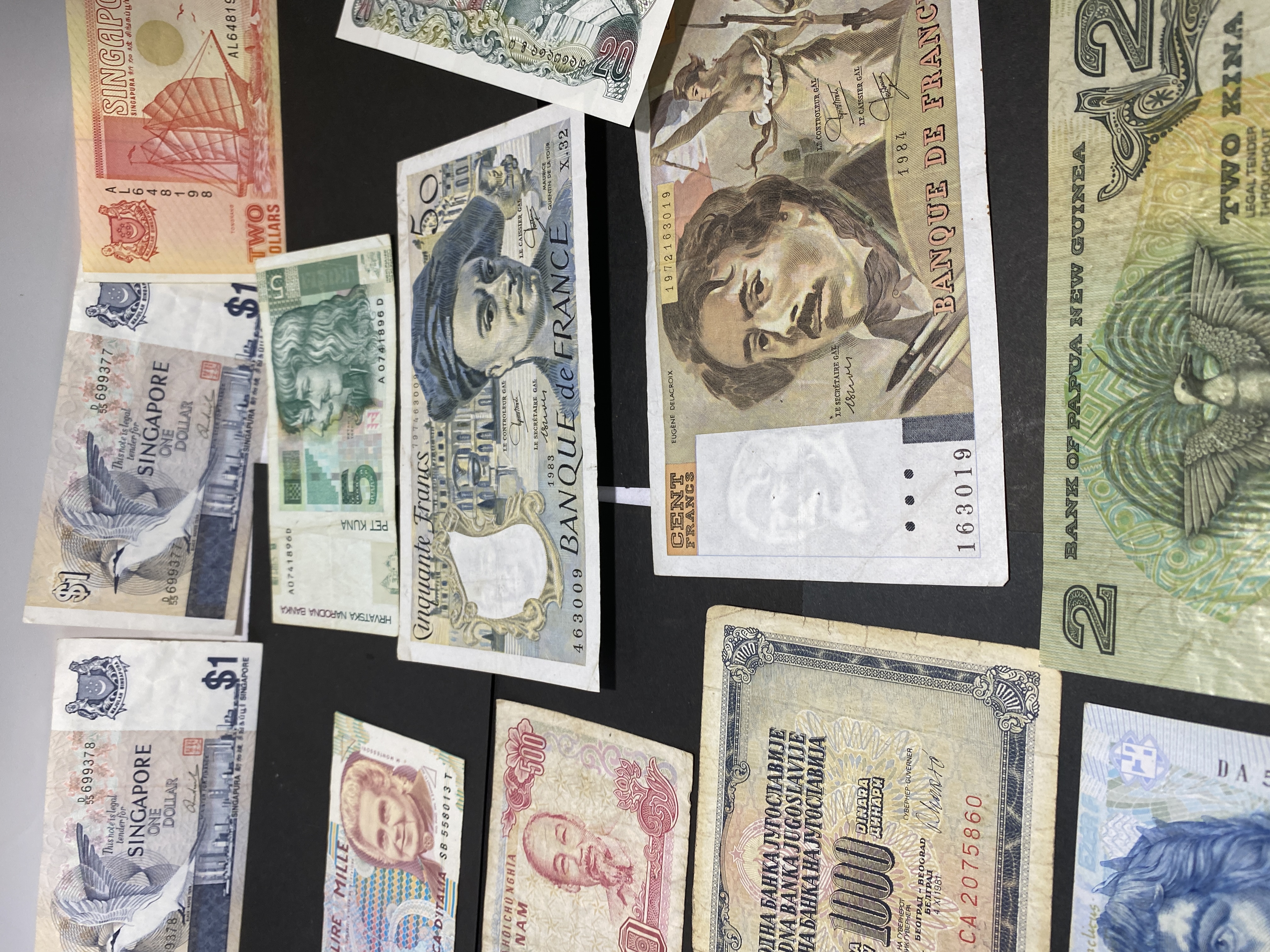 A collection of assorted banknotes from various countries including Yugoslavia, Singapore, France, and others.