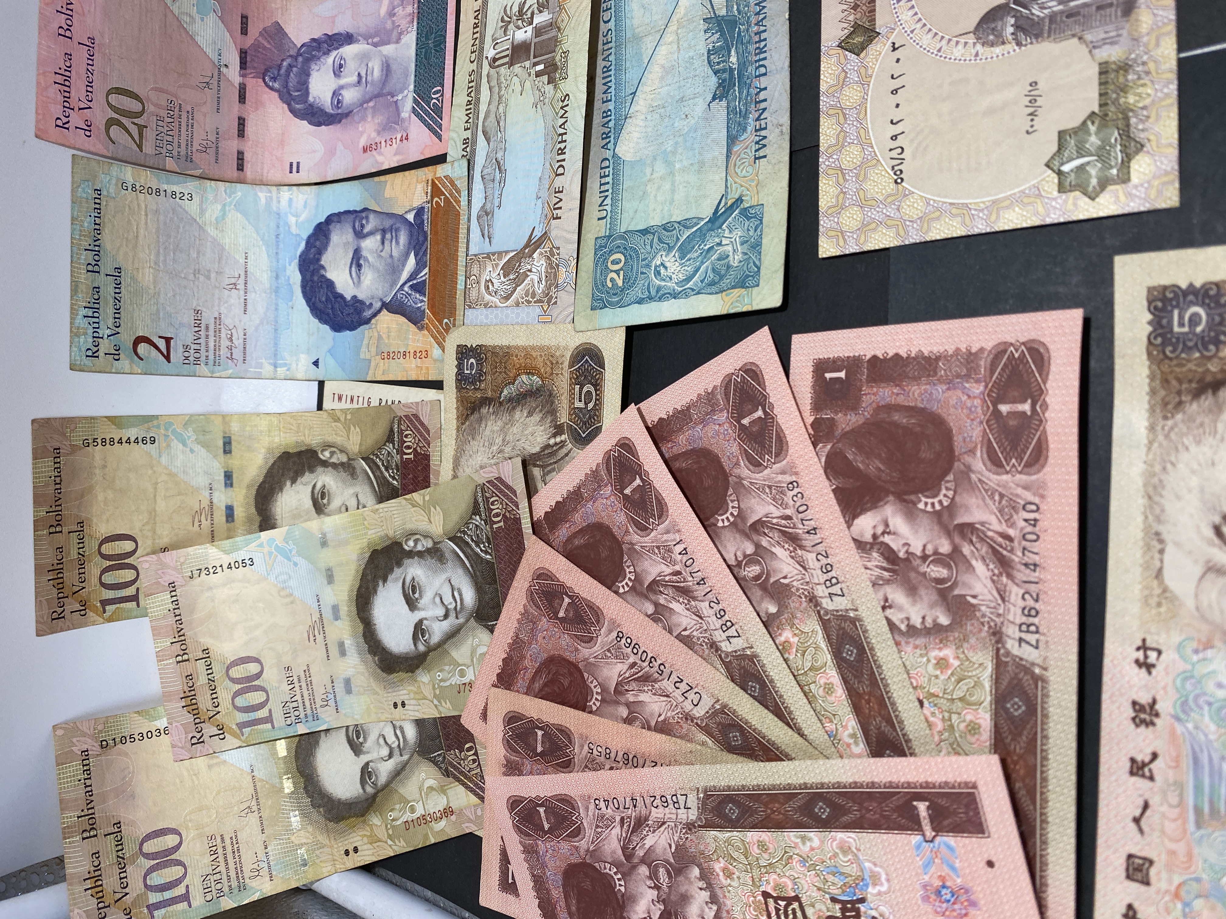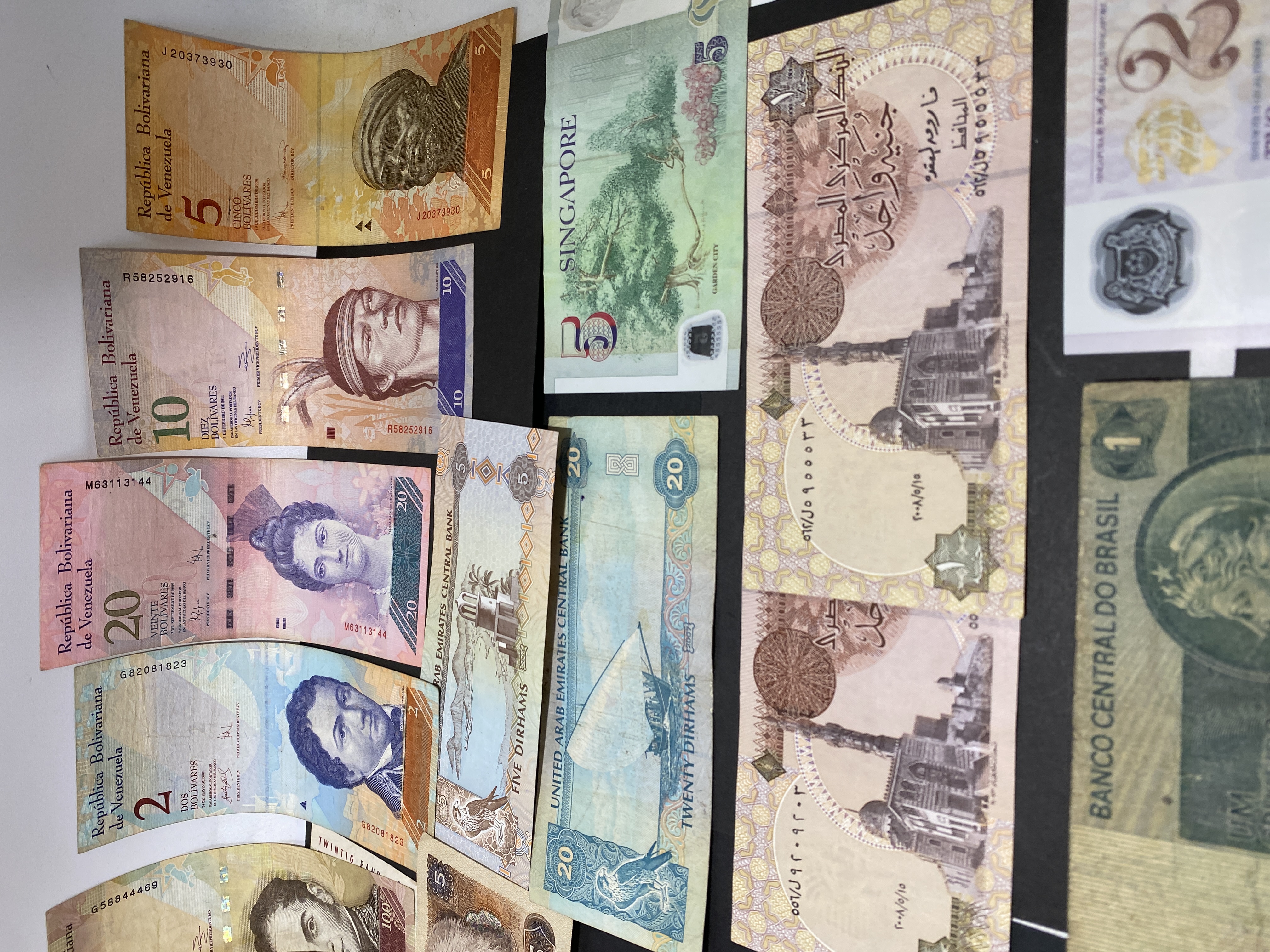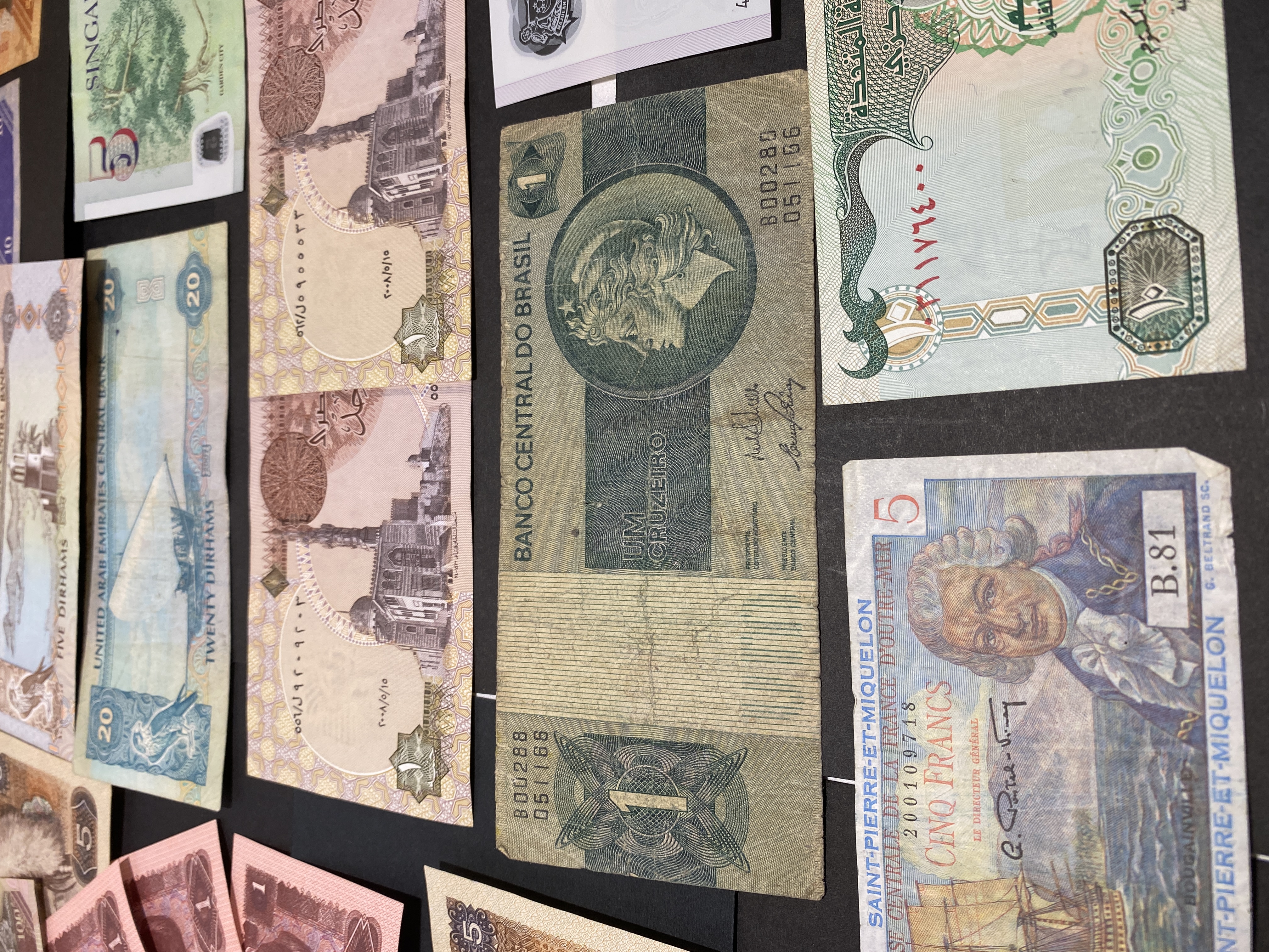 A collection of various international banknotes.