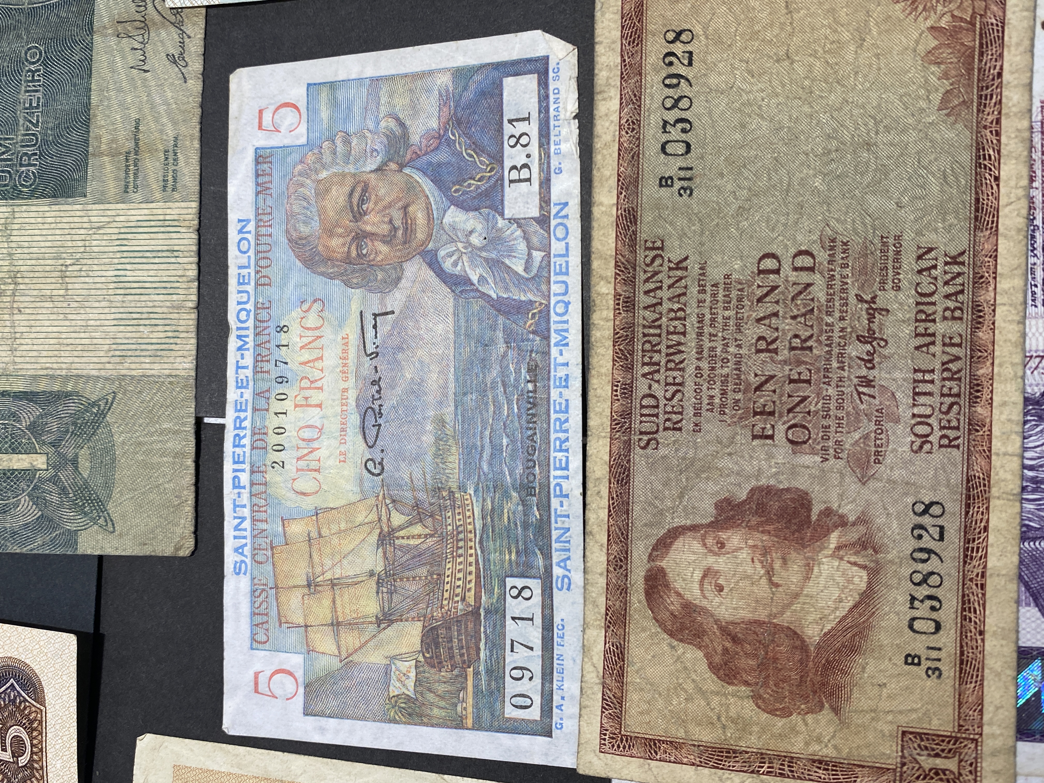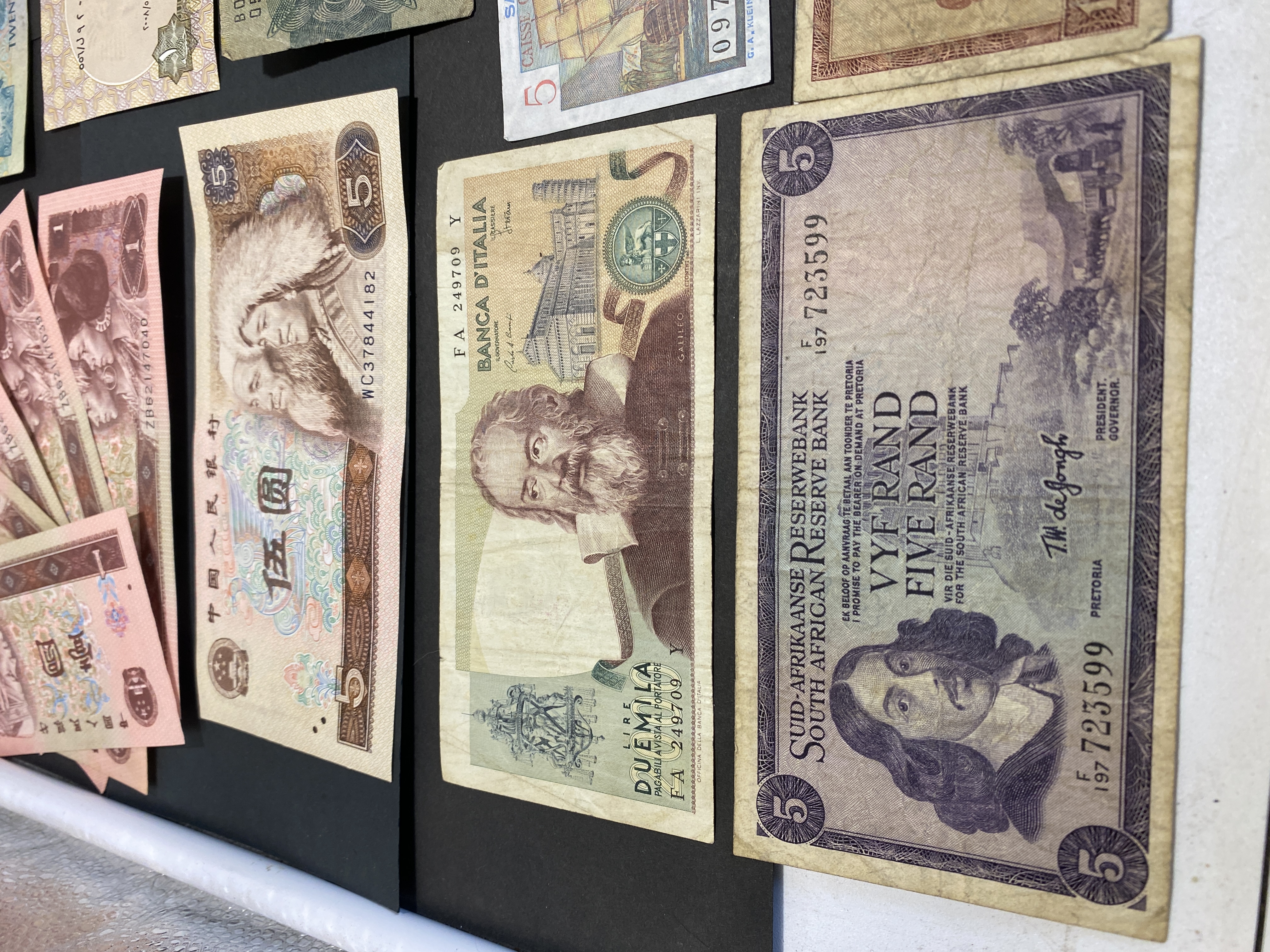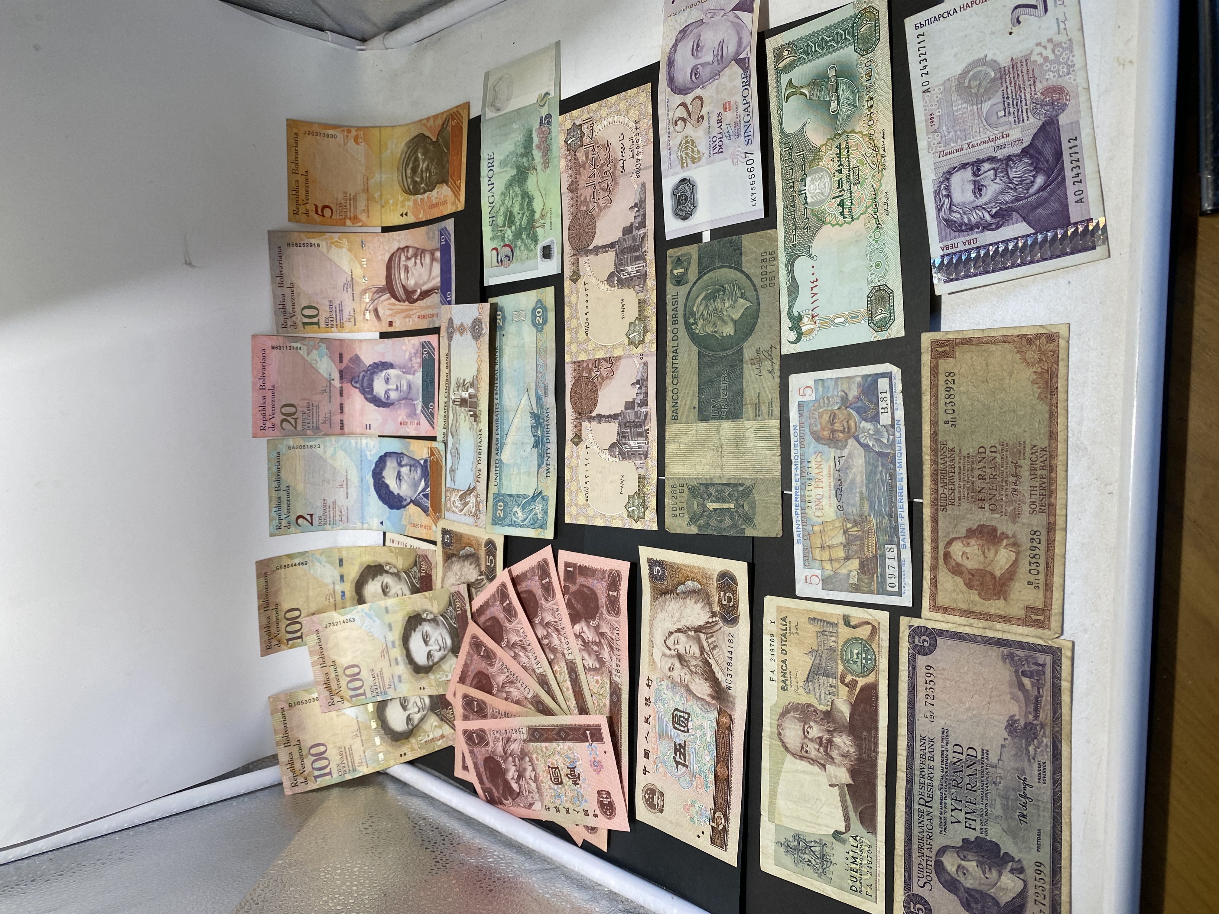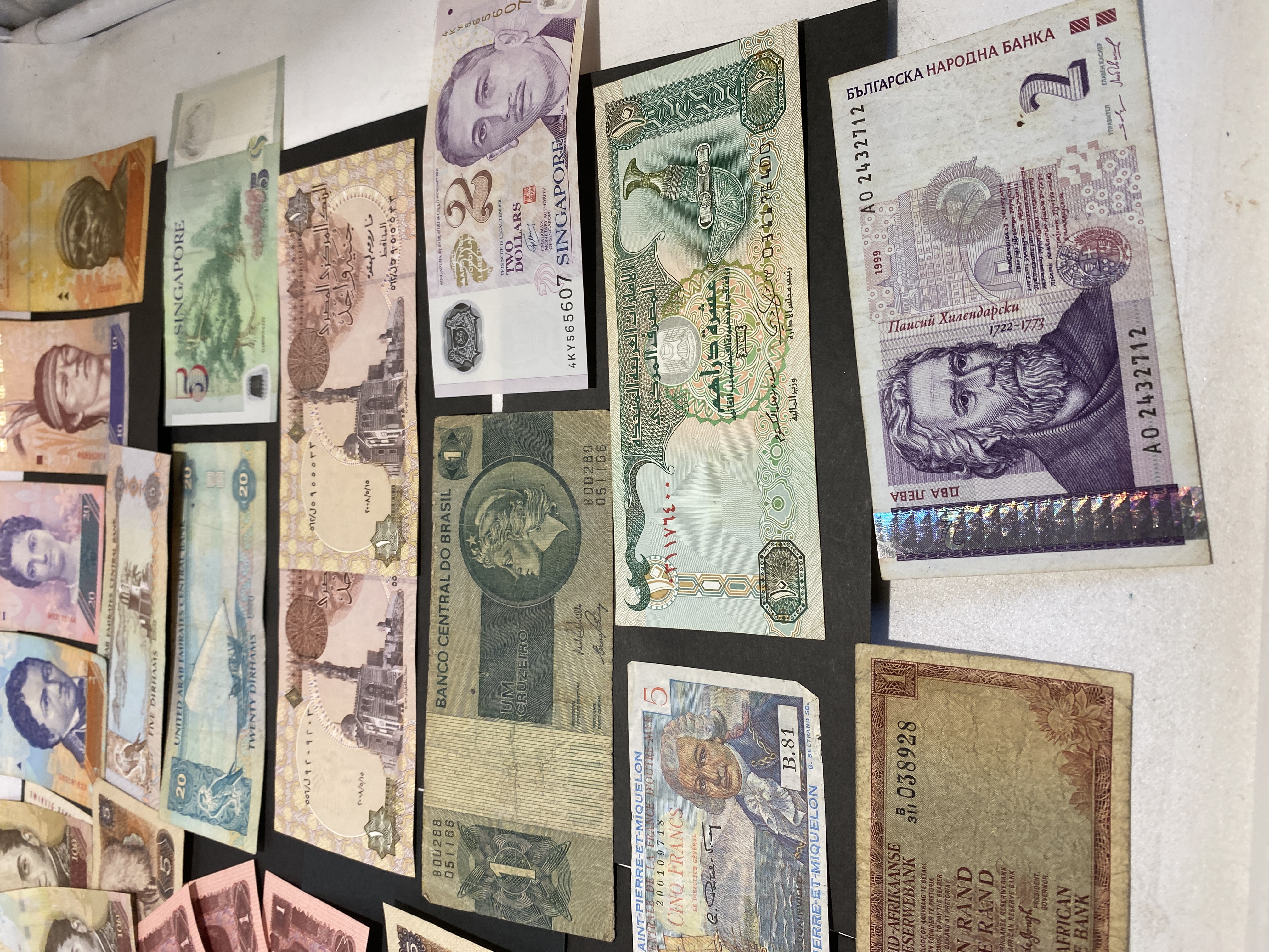 A collection of various international banknotes.
