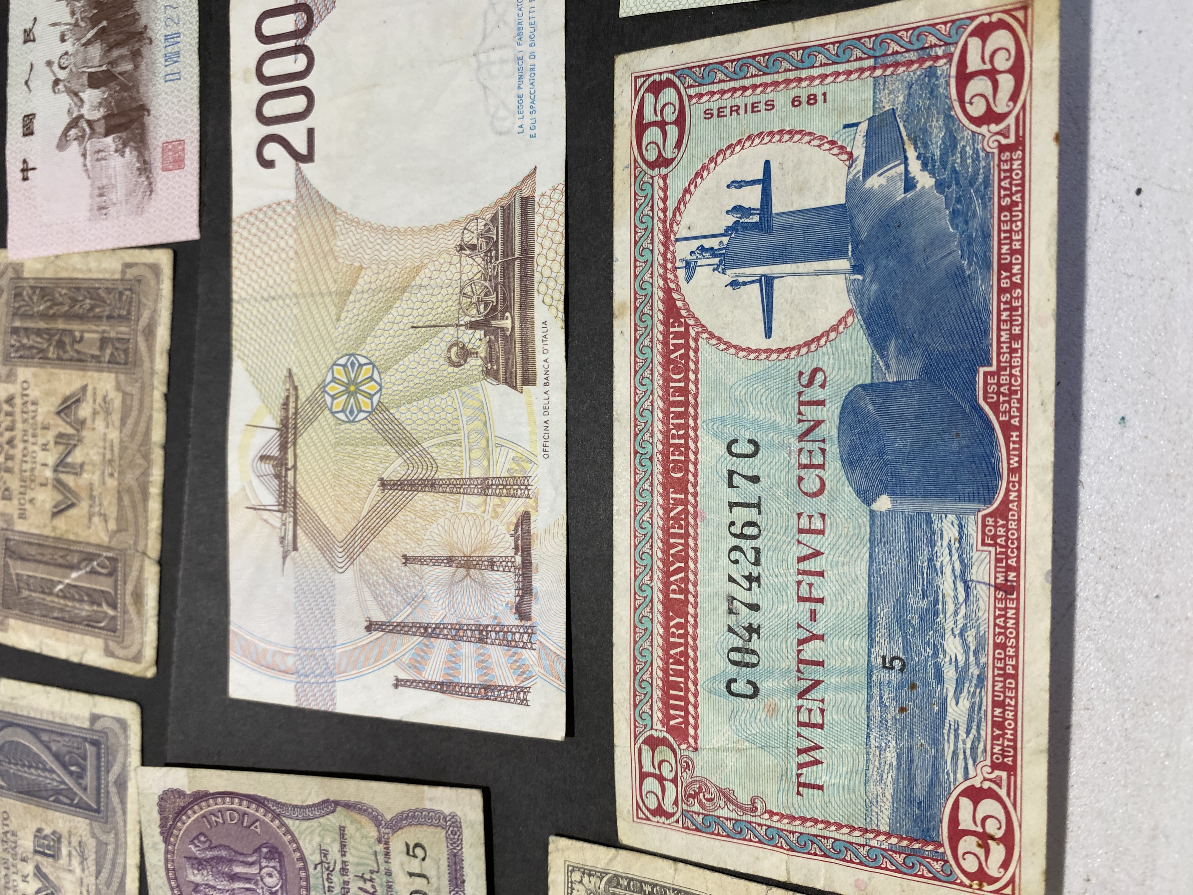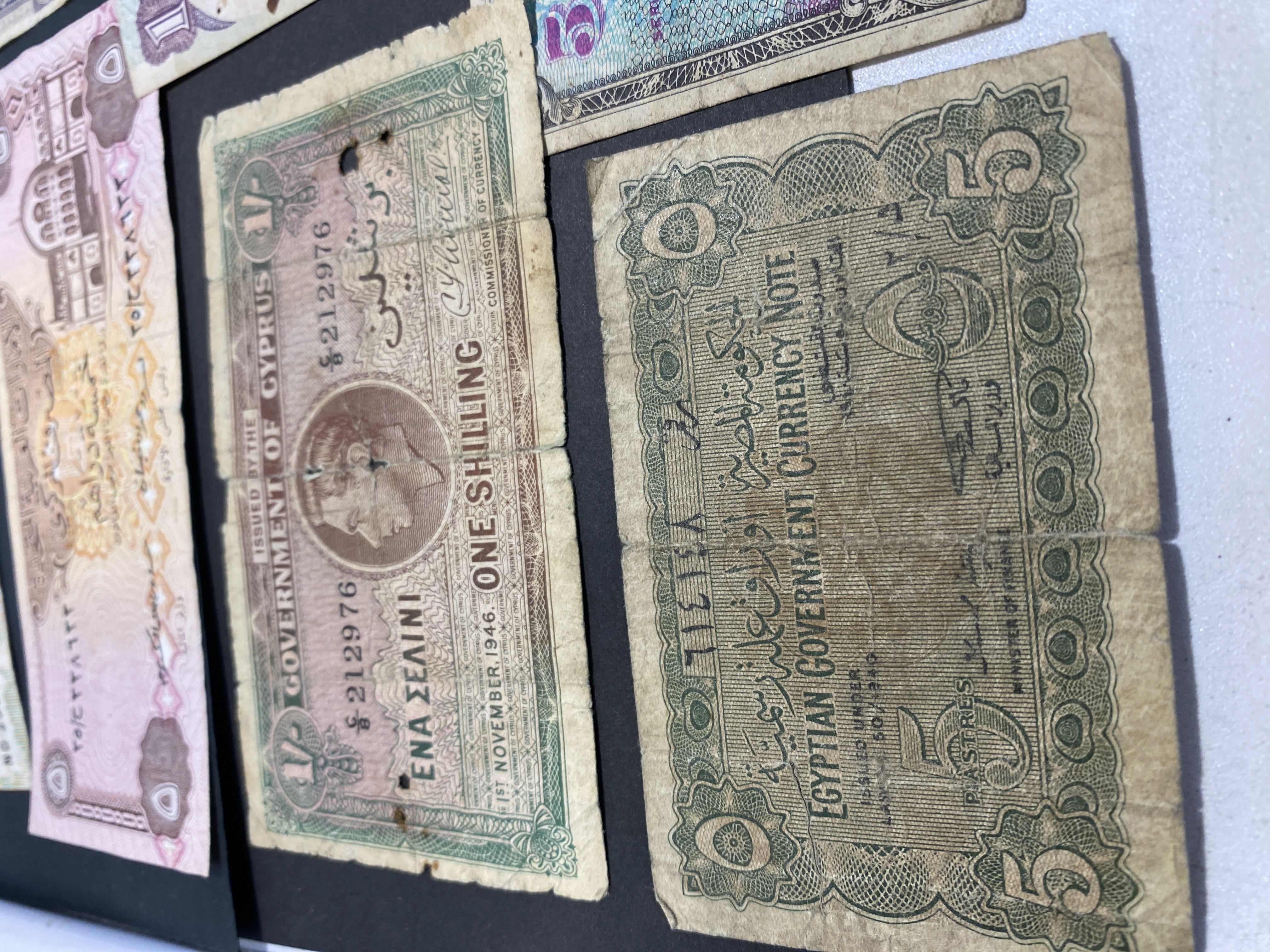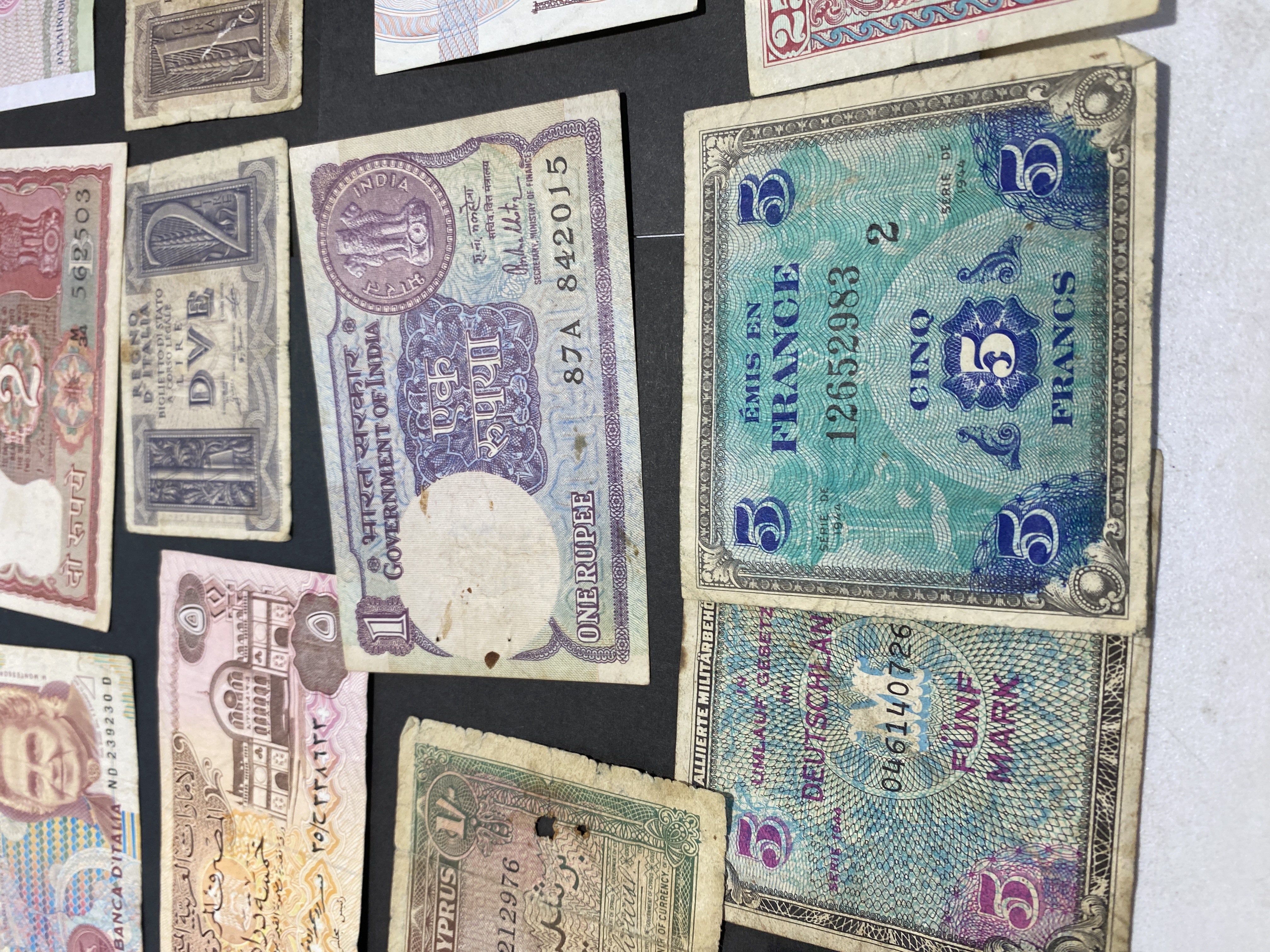 A collection of various international banknotes in mixed condition.