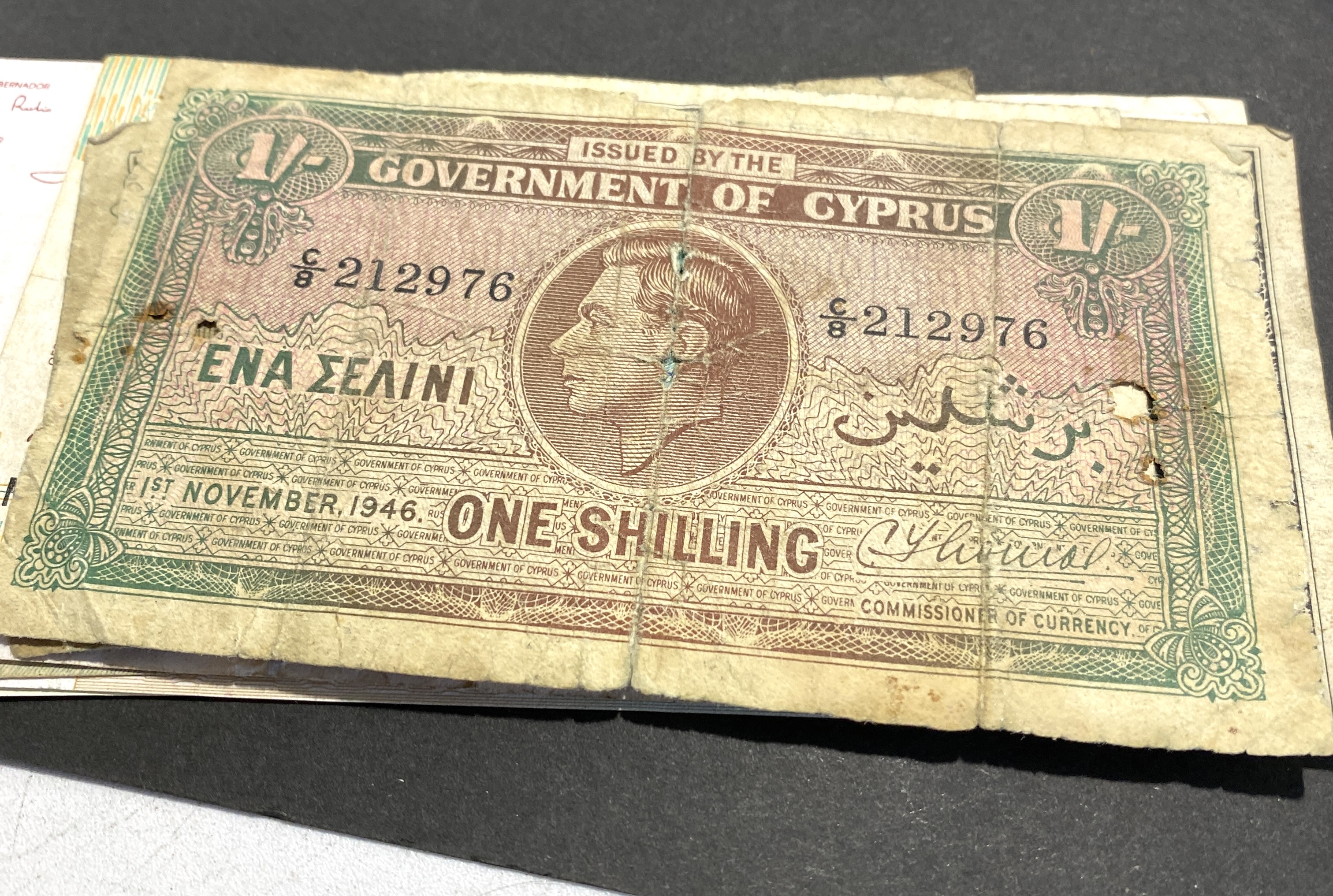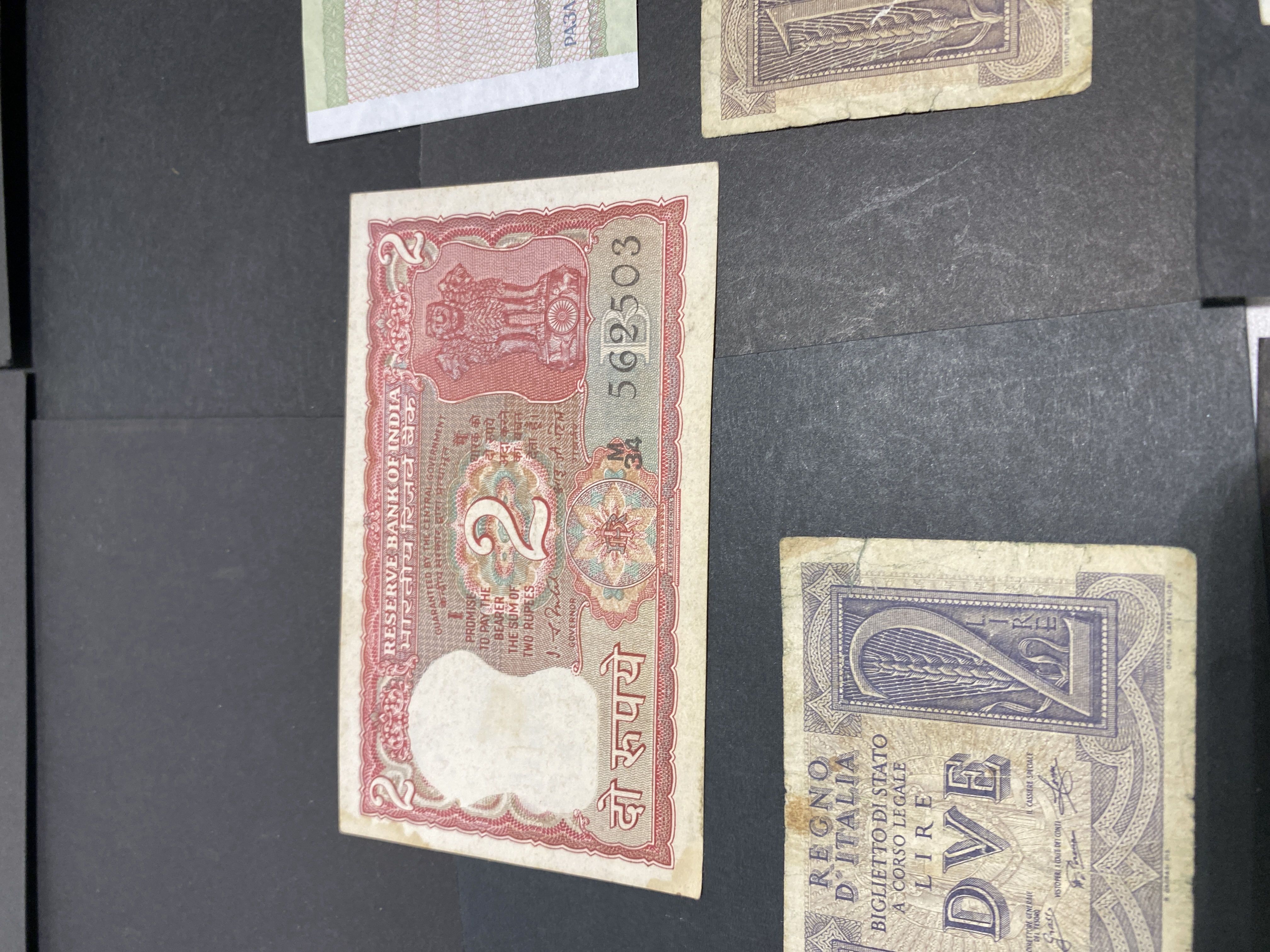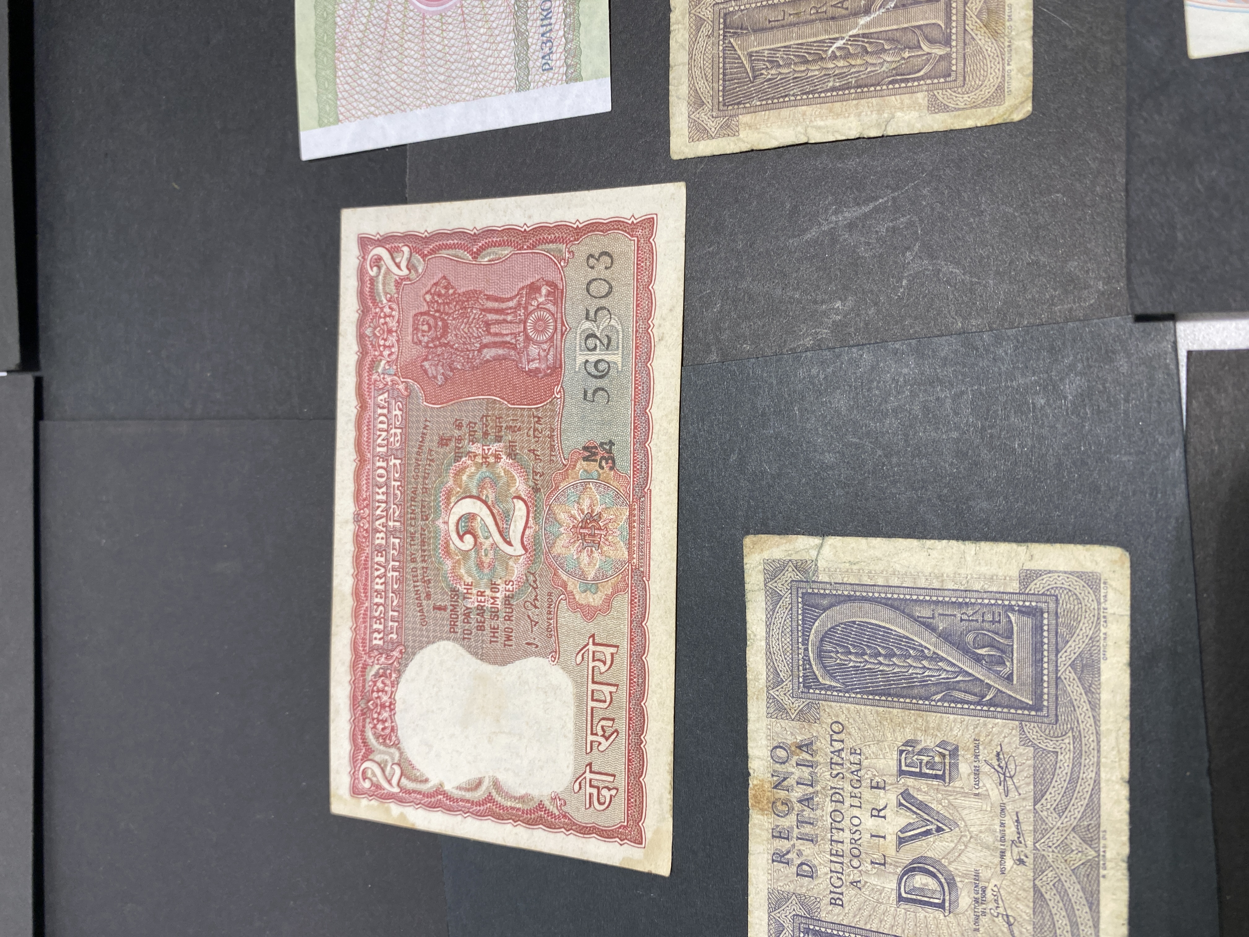 A collection of various international banknotes in mixed condition.