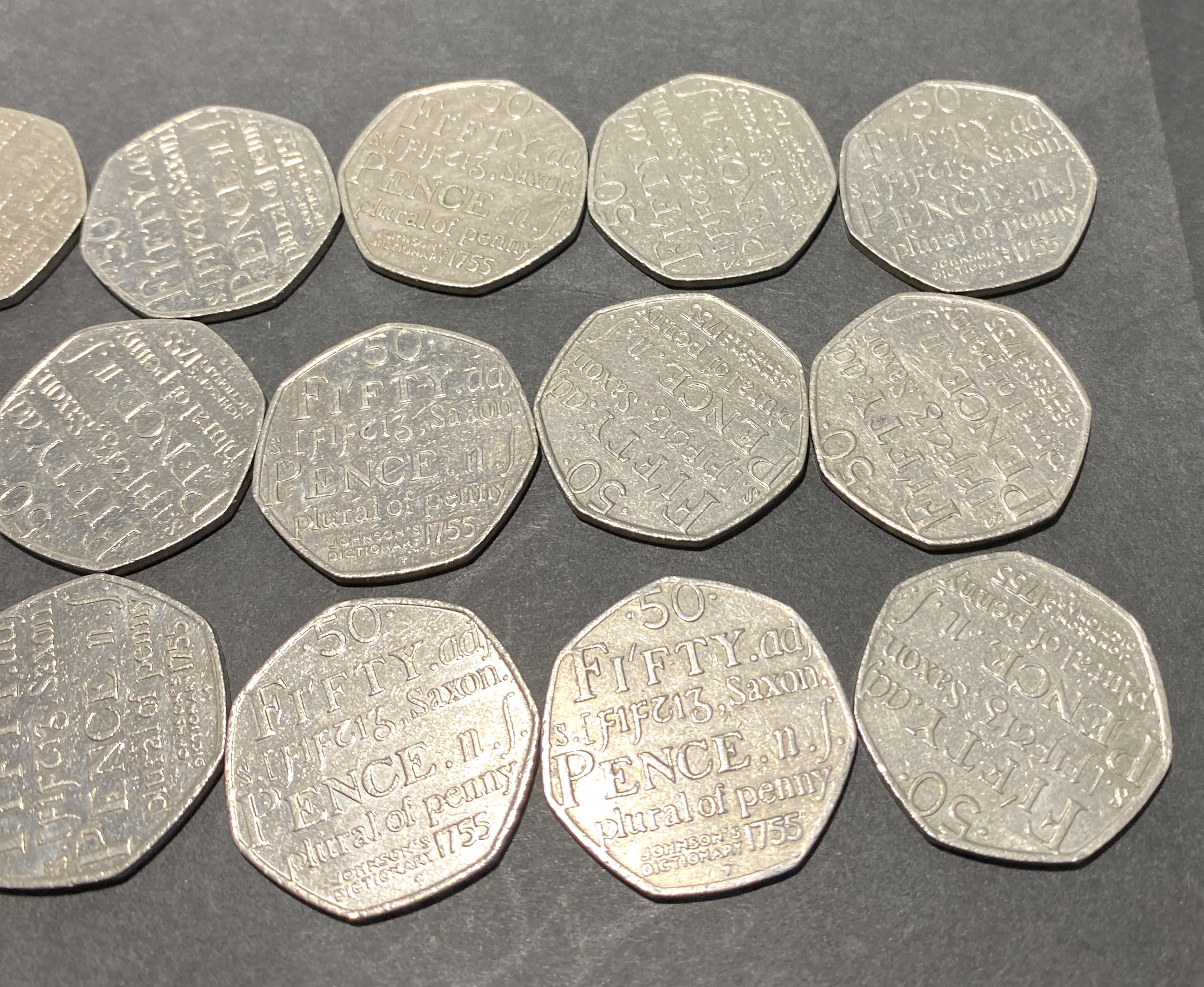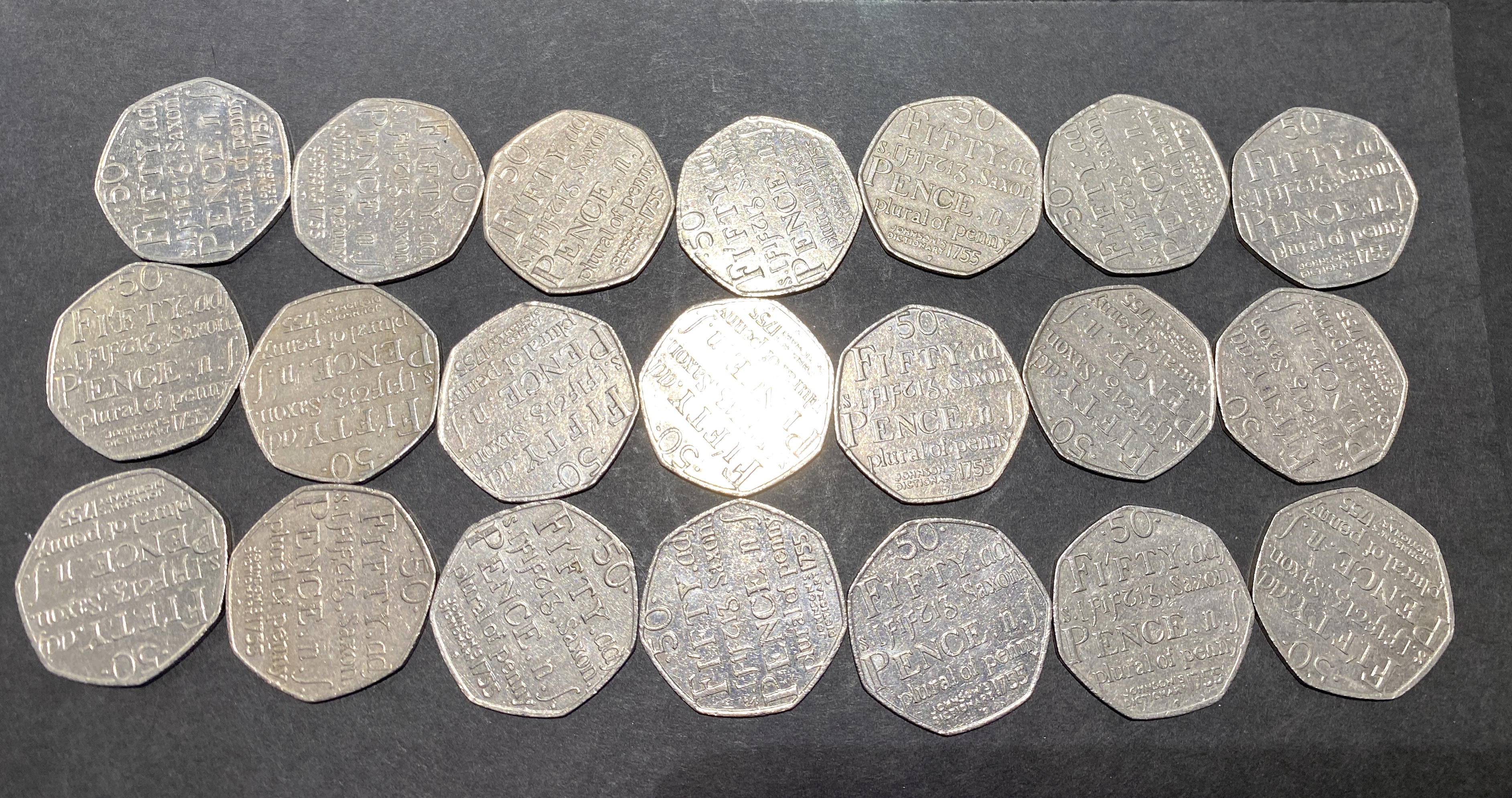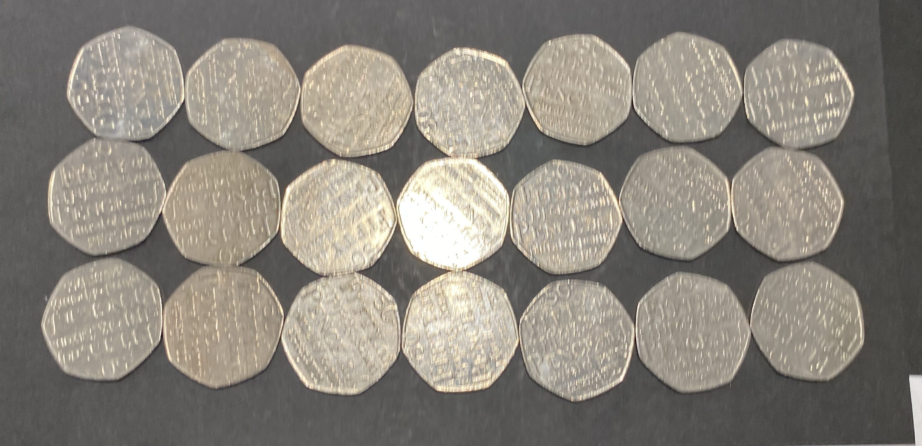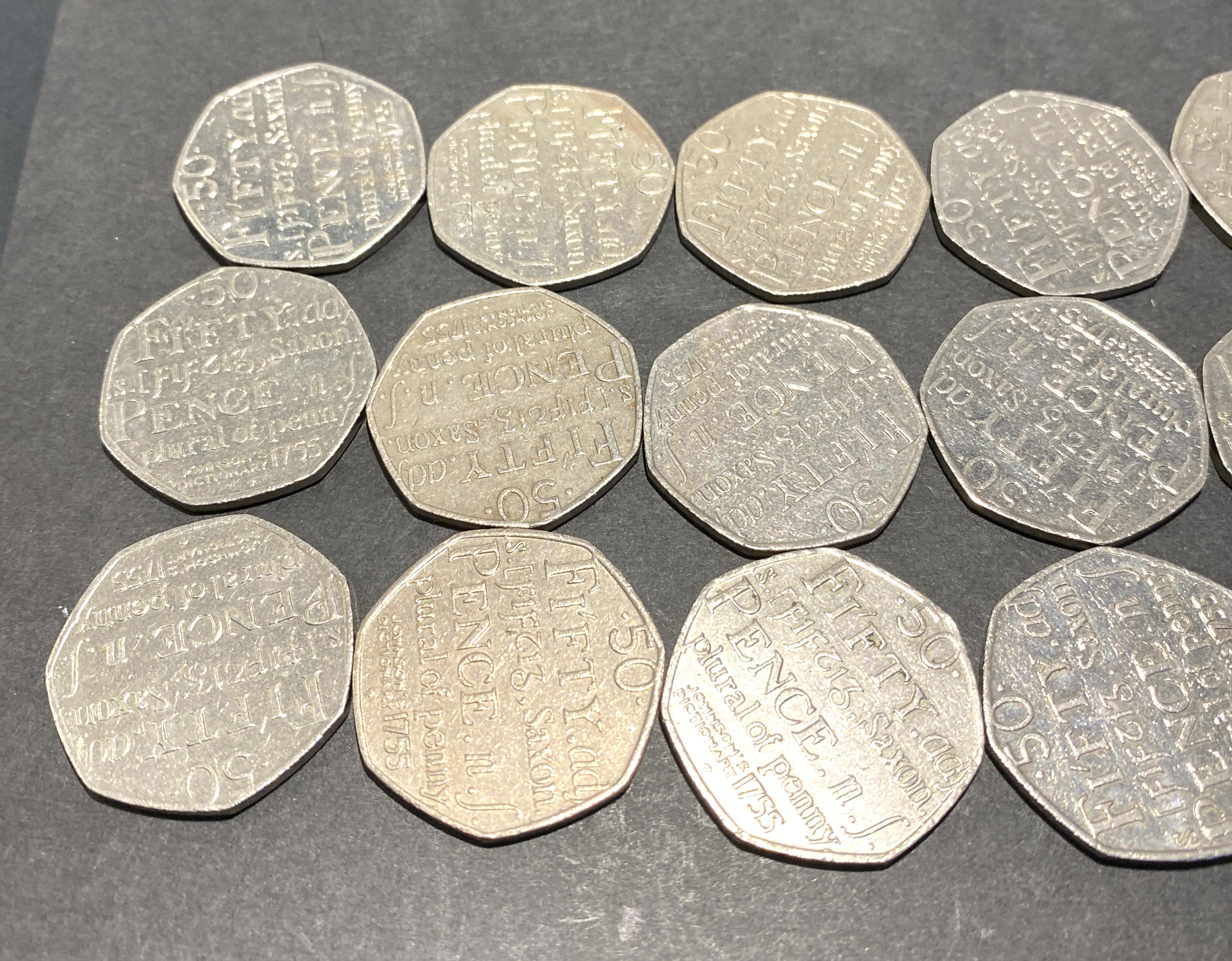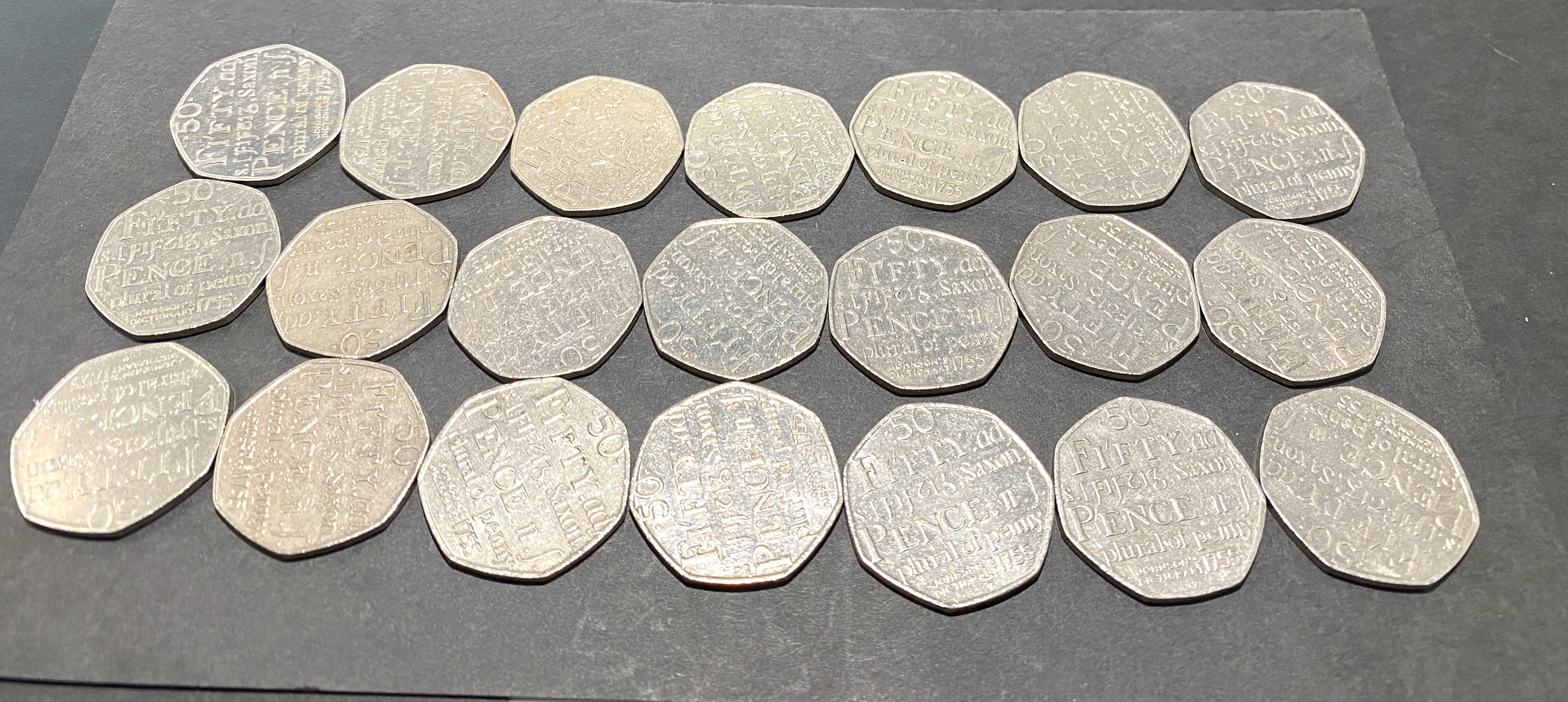 Twenty silver-colored fifty pence coins featuring text.