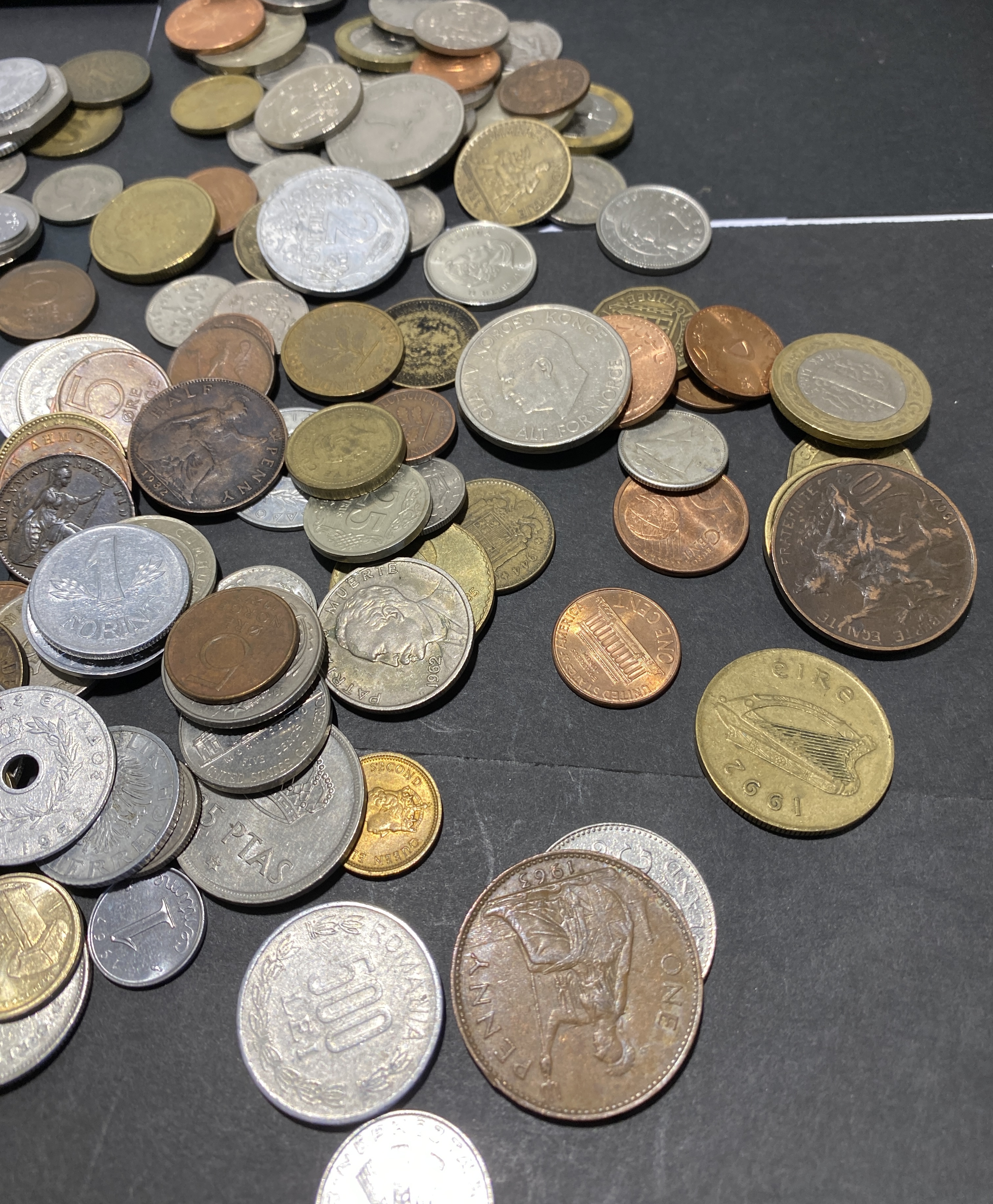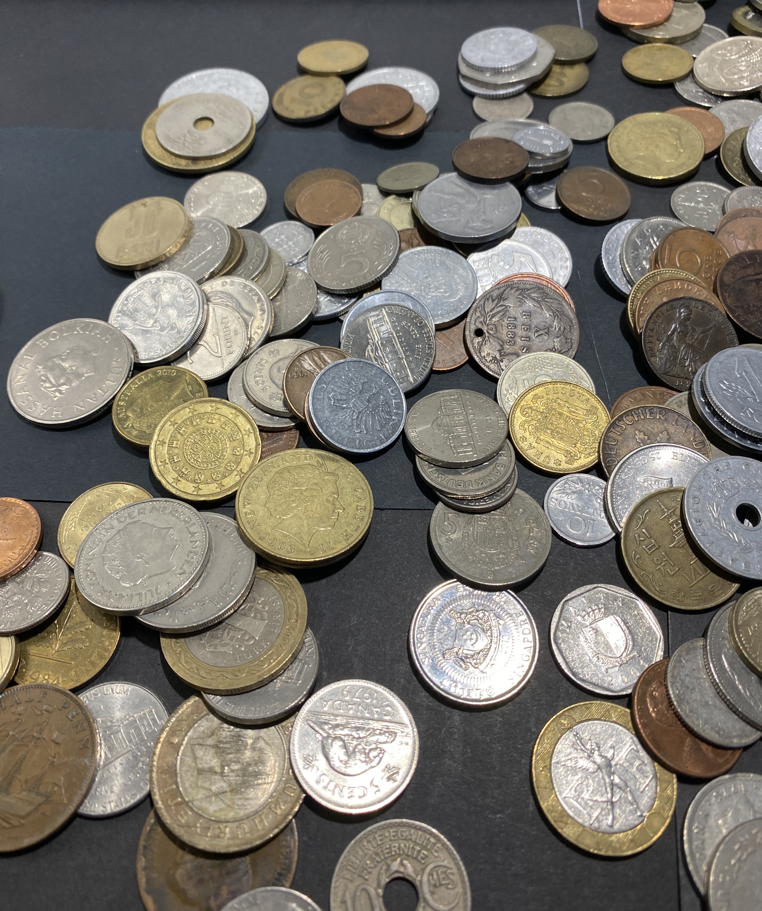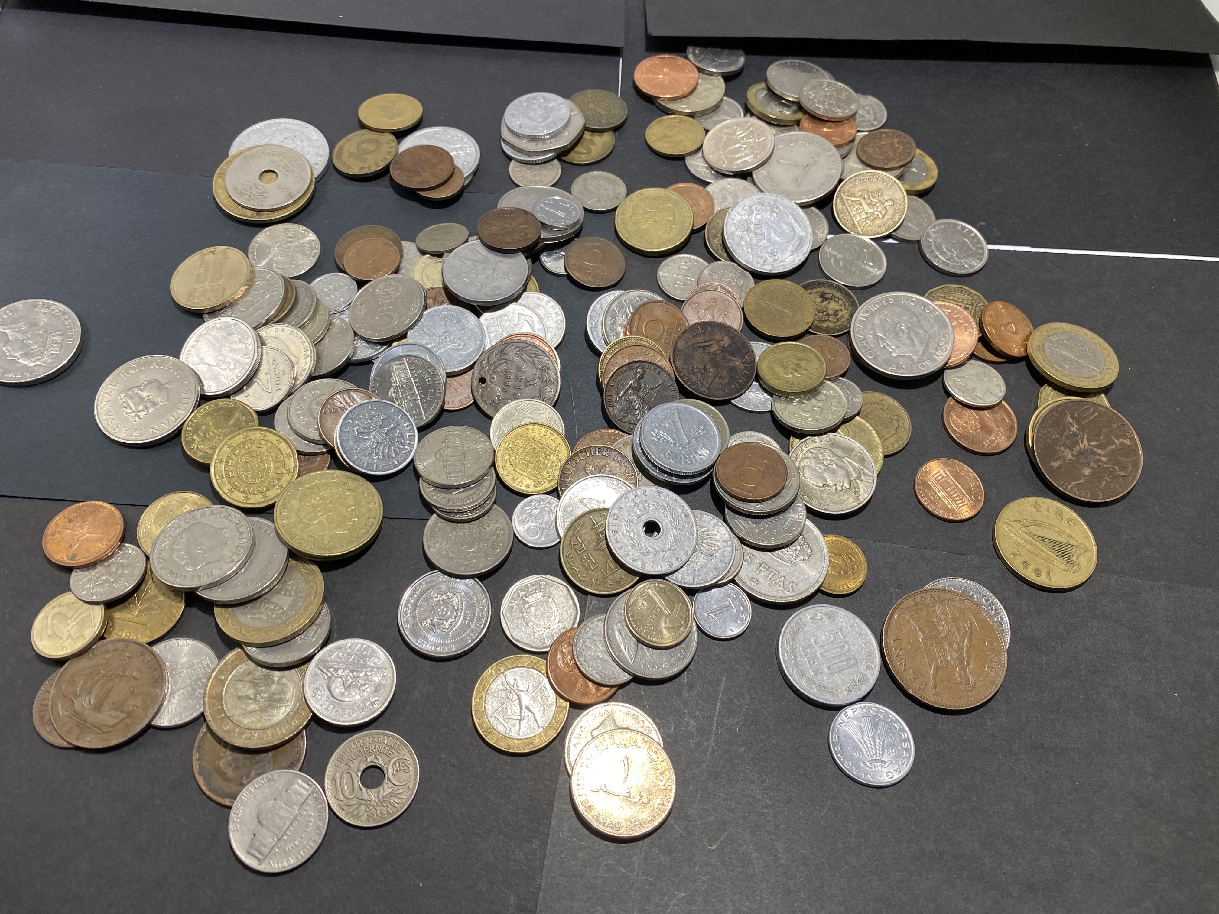 A collection of various silver and bronze-colored foreign coins.