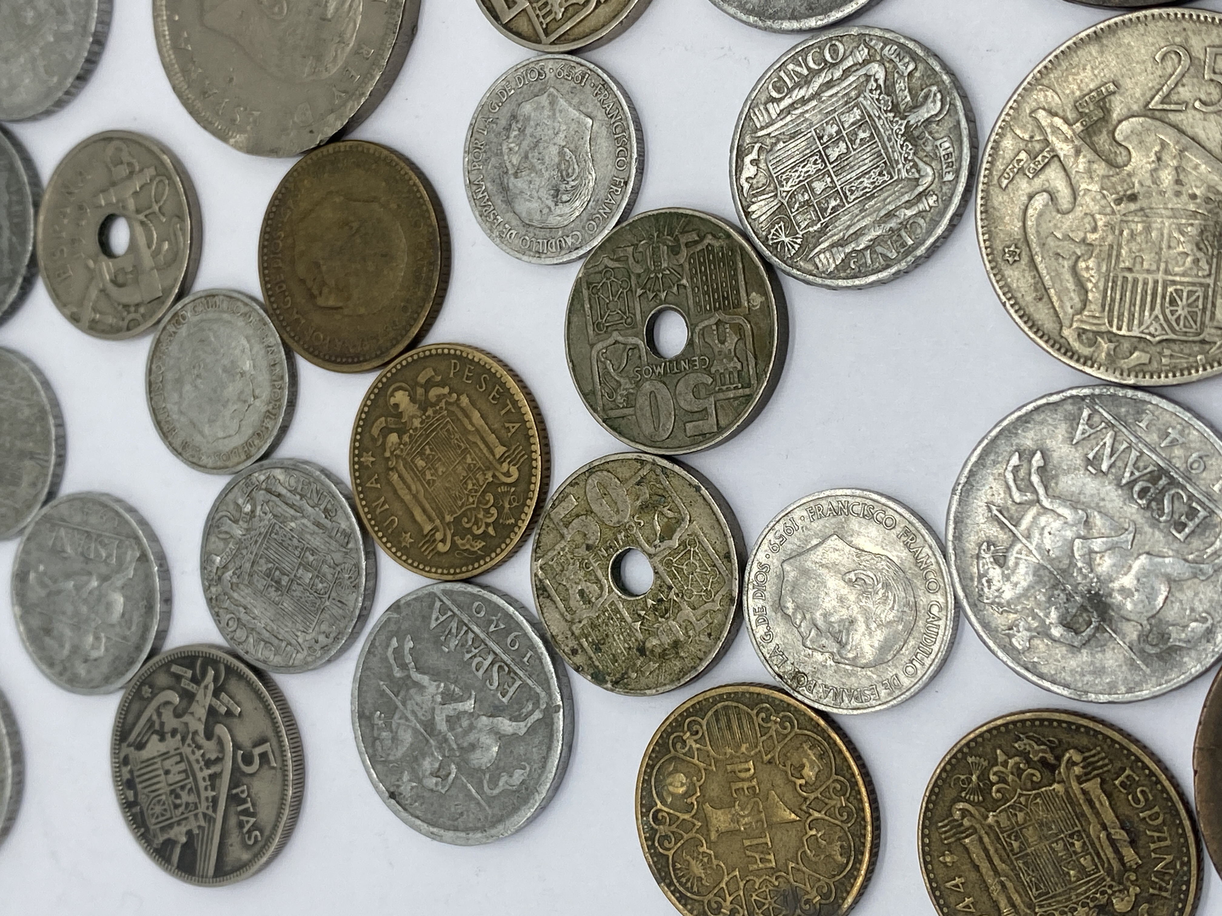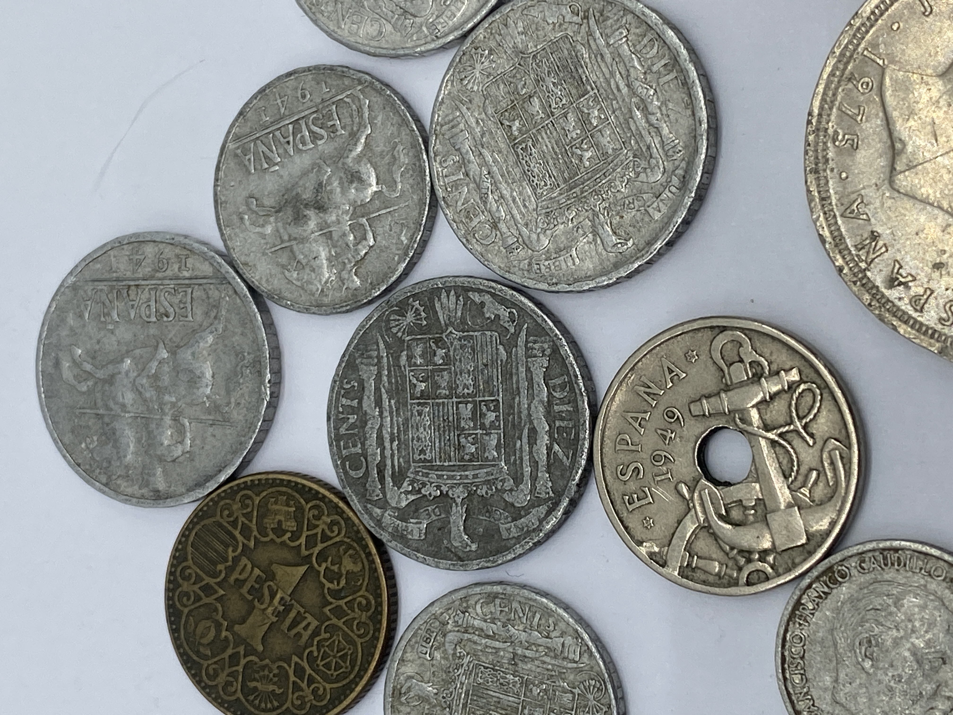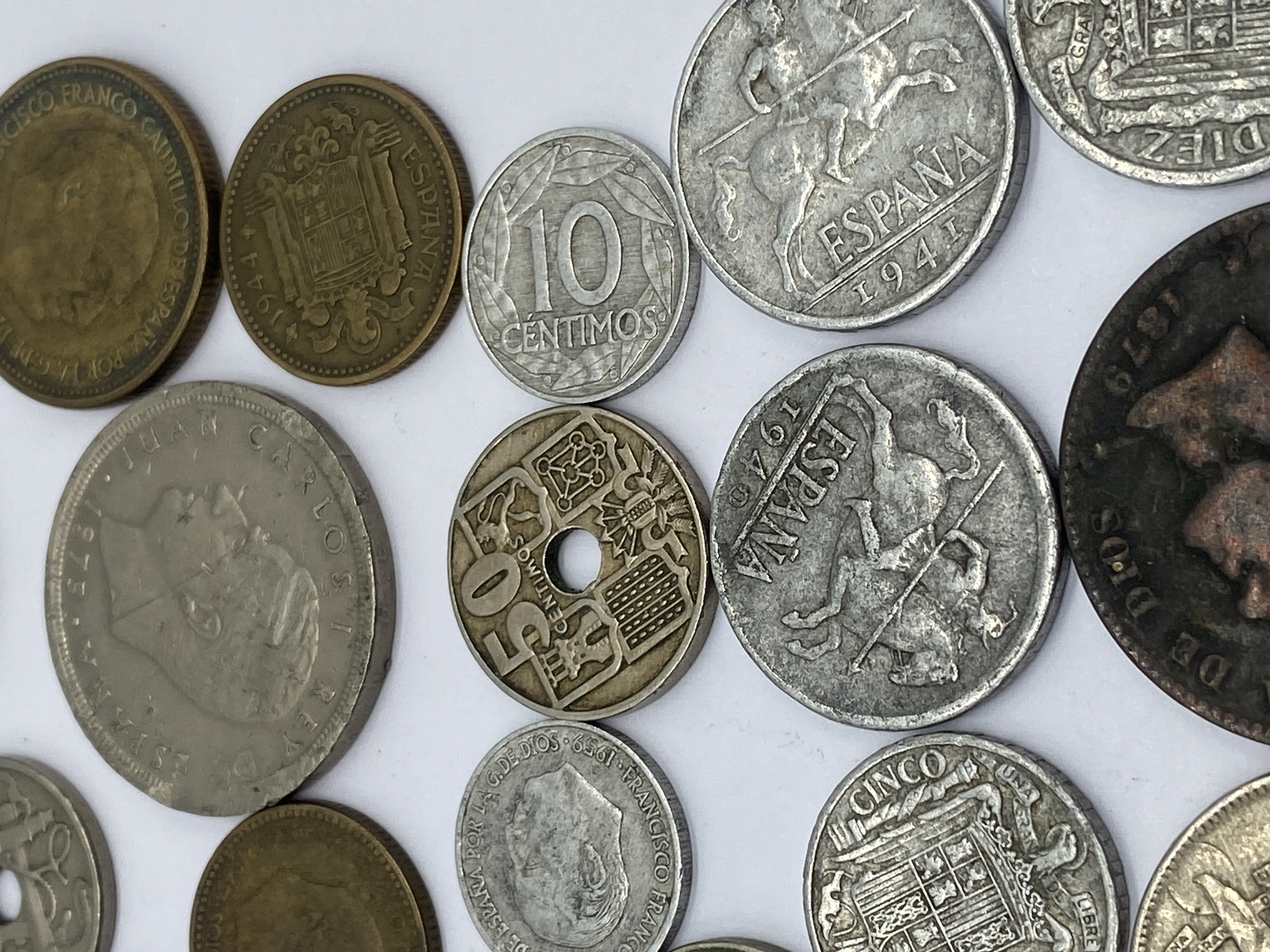 A collection of various Spanish coins, mostly silver and bronze, featuring different denominations and designs.