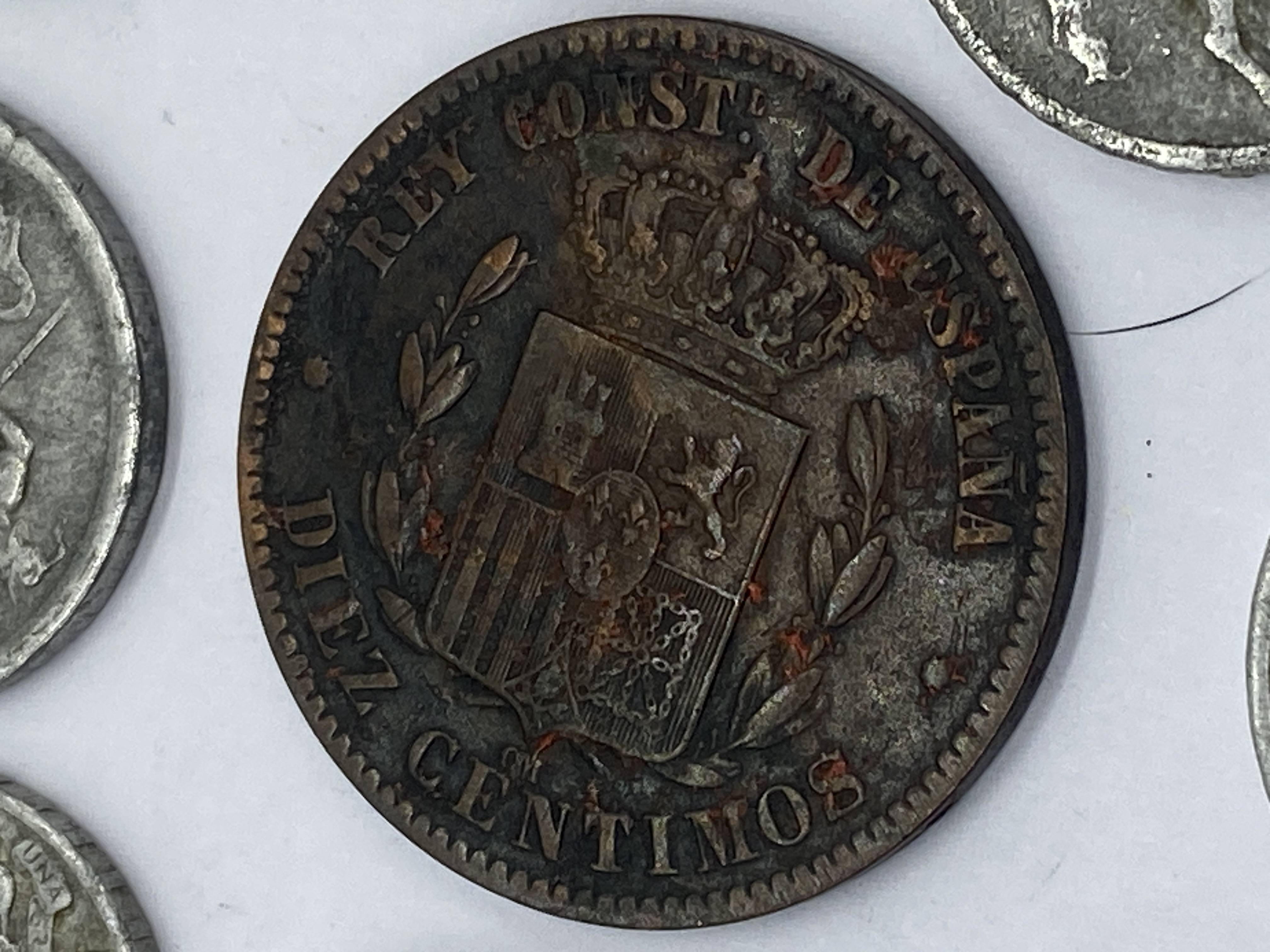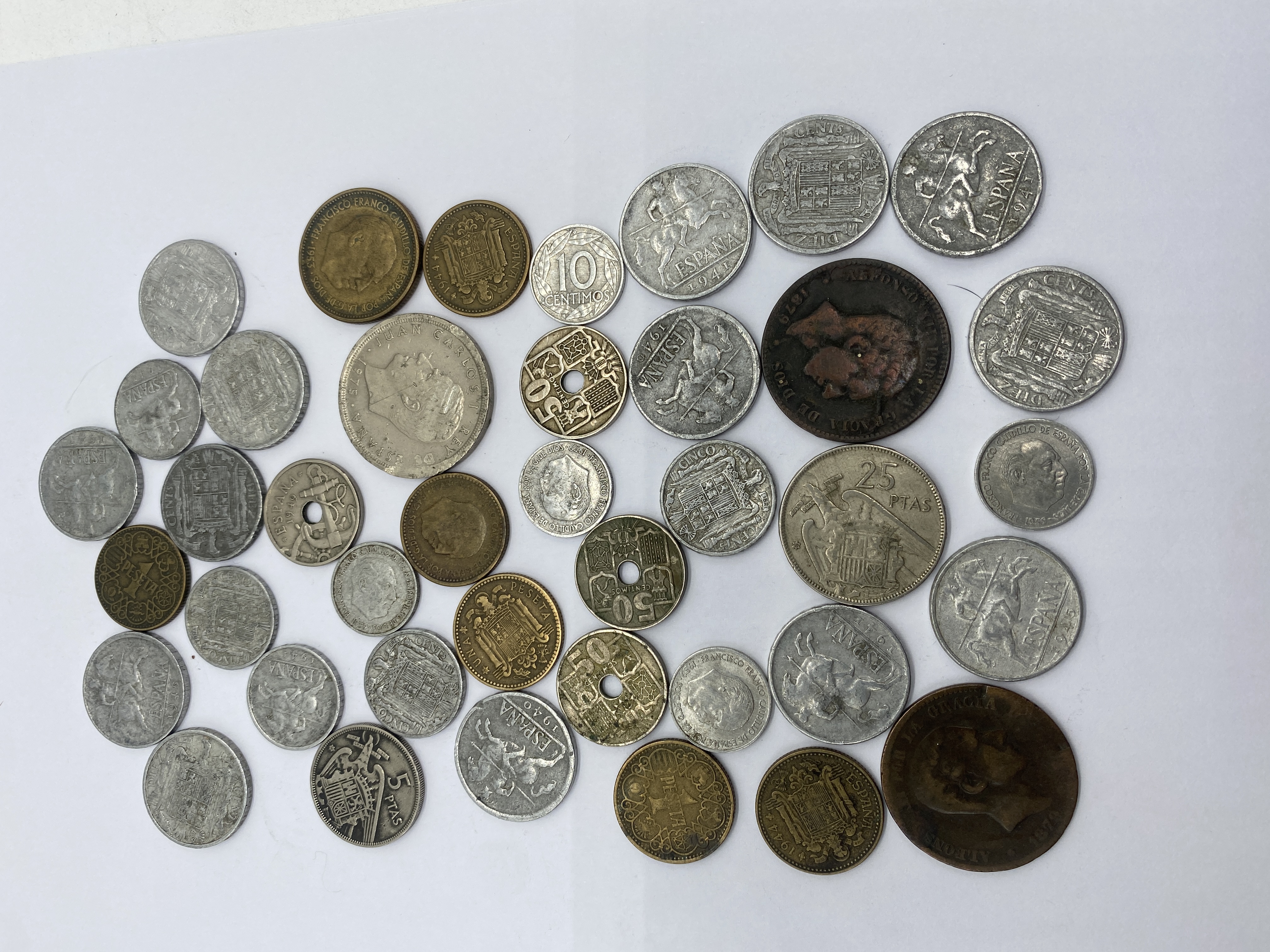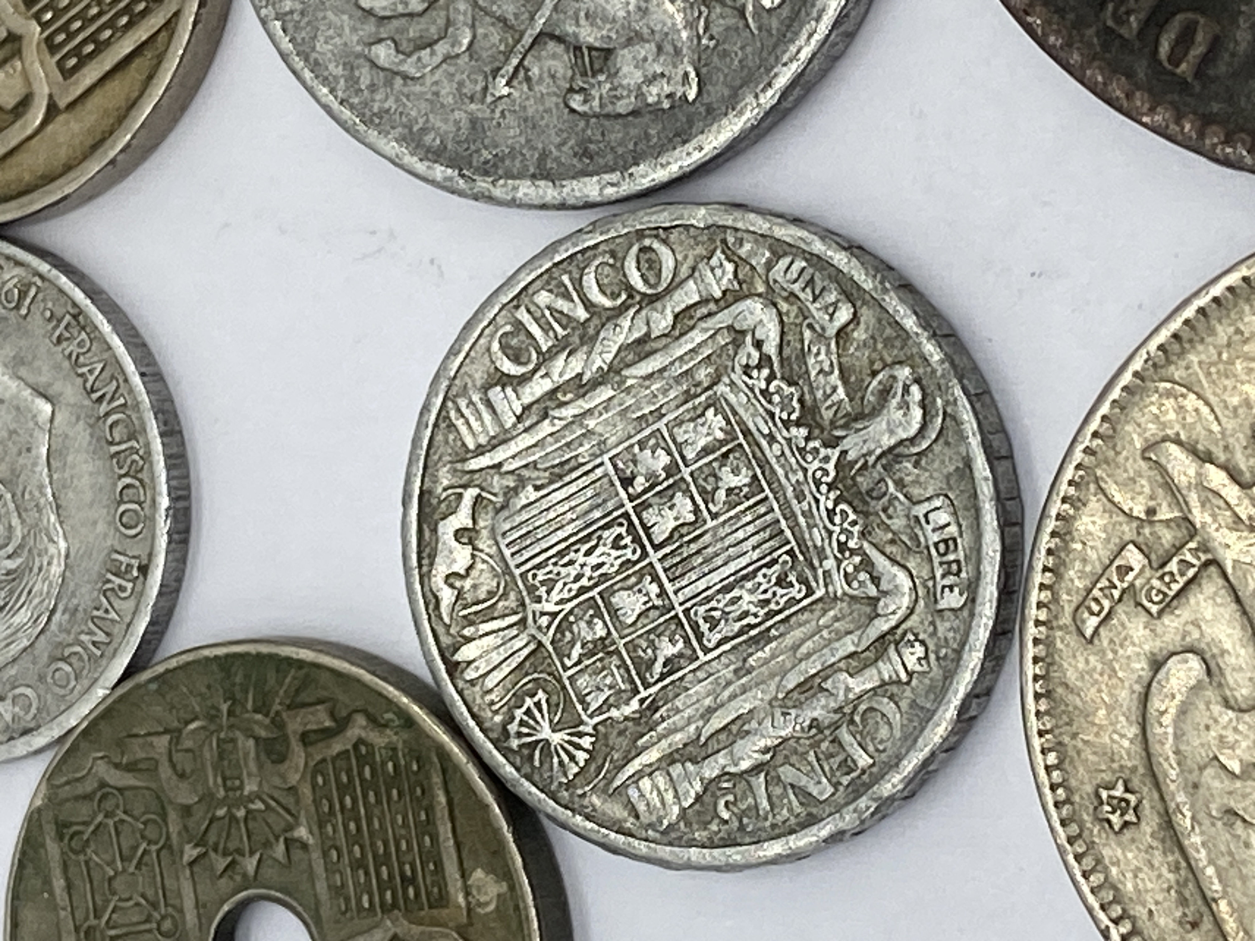 A collection of various Spanish coins, mostly silver and bronze, featuring different denominations and designs.