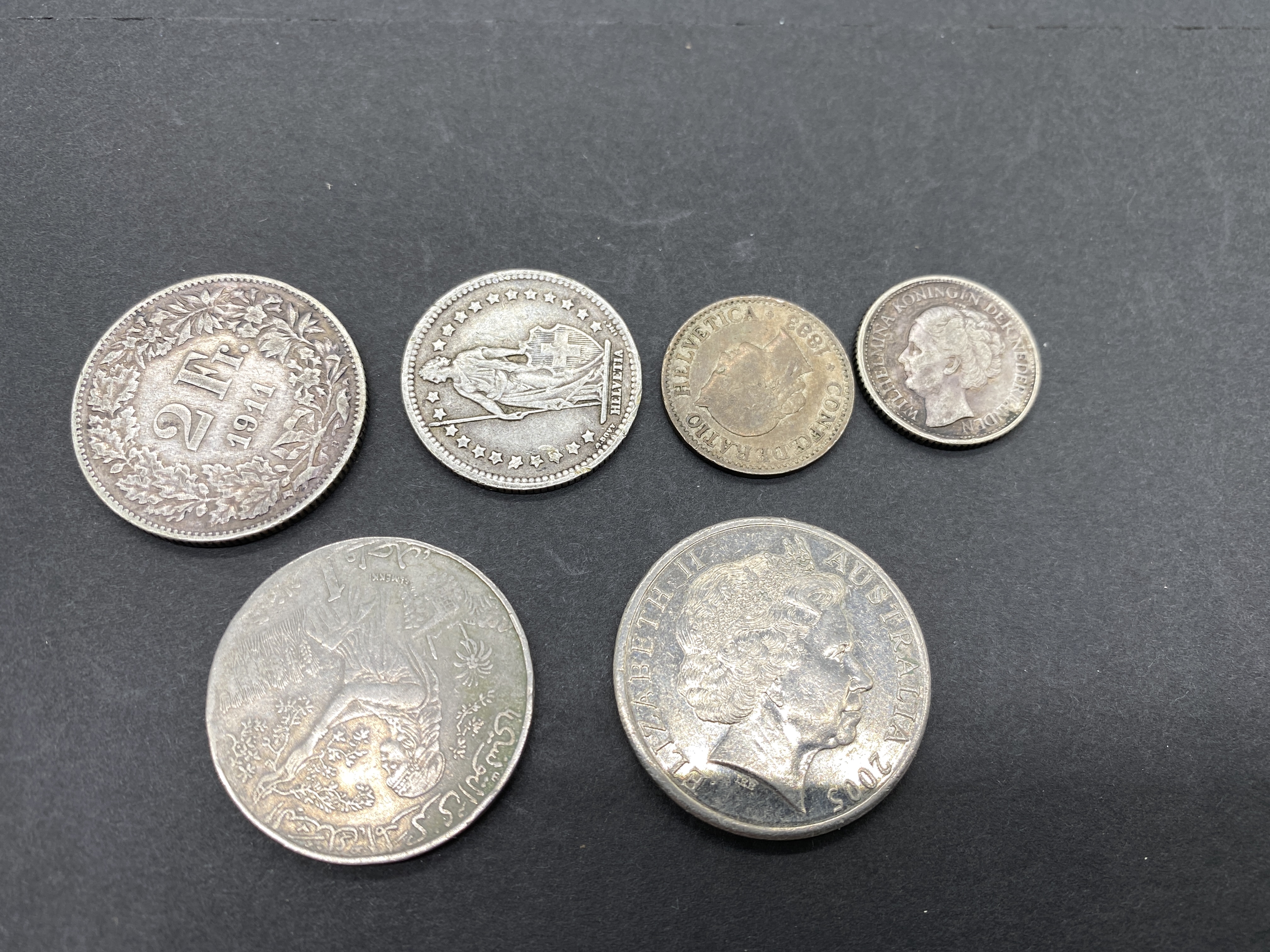 A collection of various silver-colored coins from different countries including Australia.