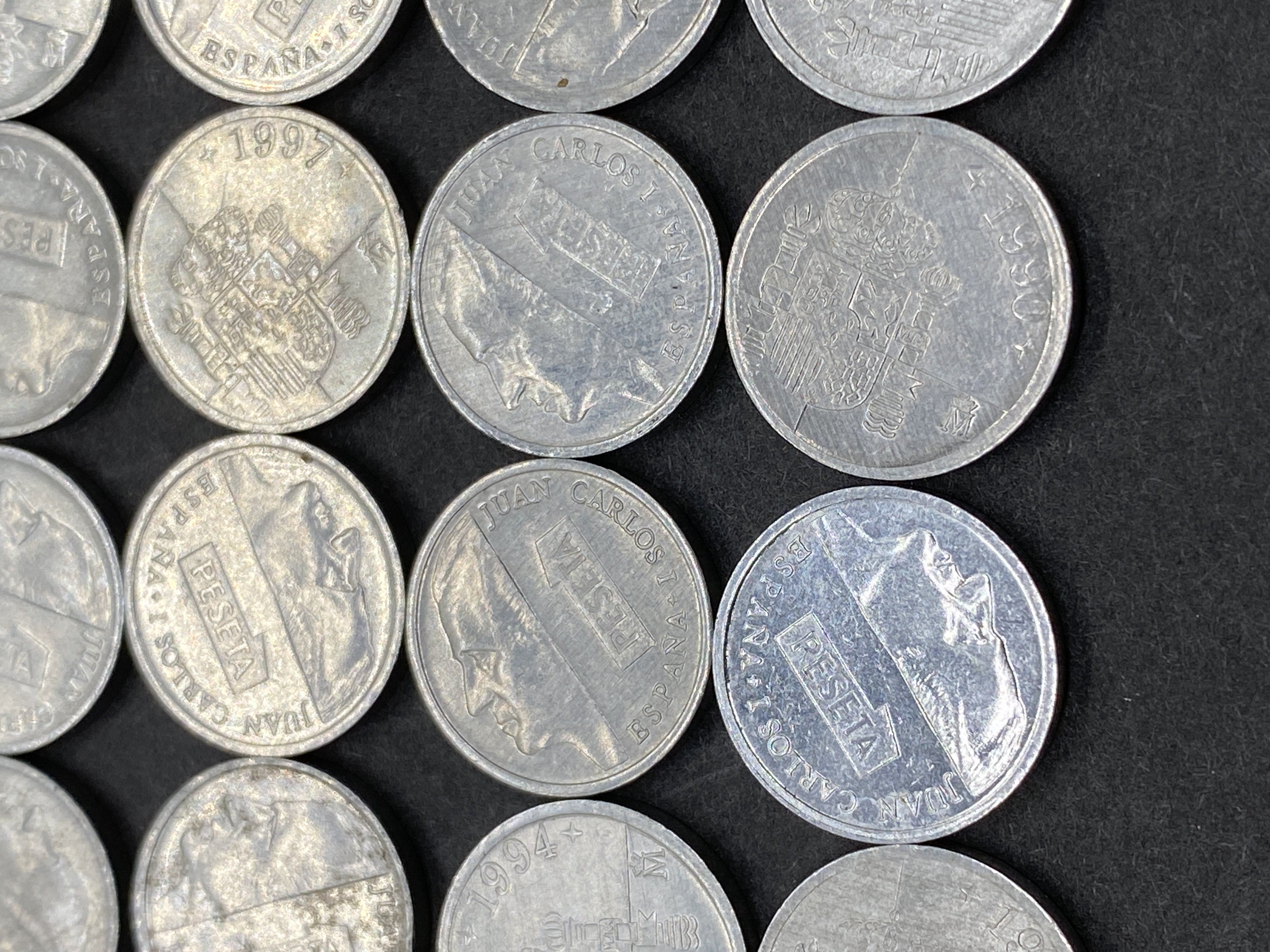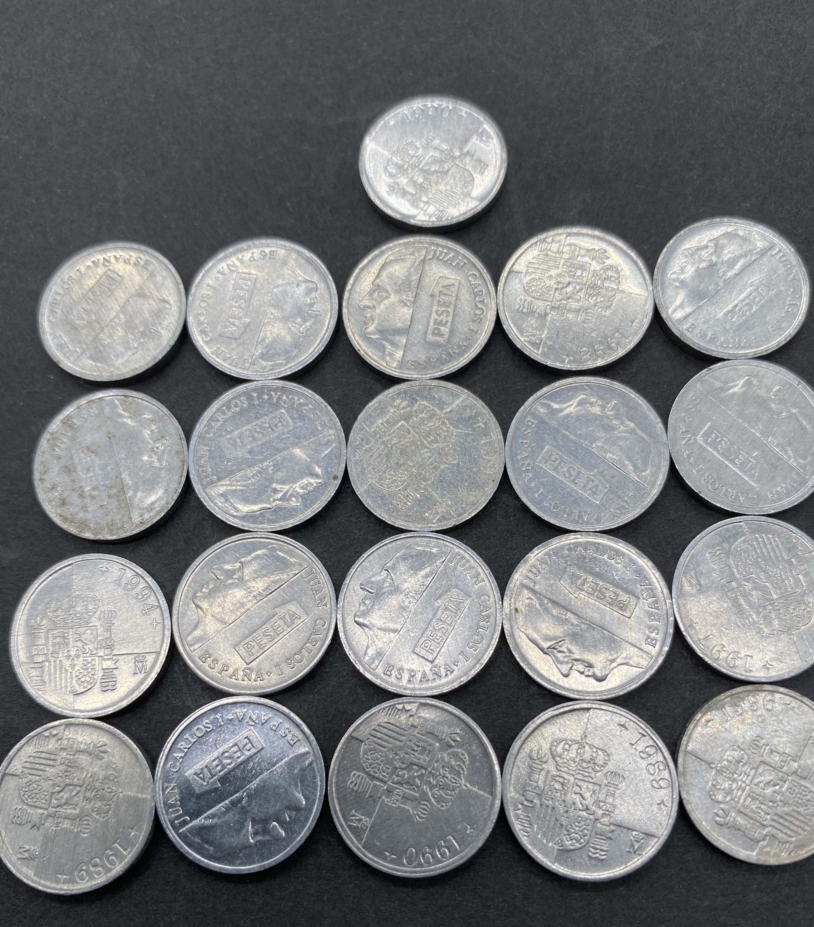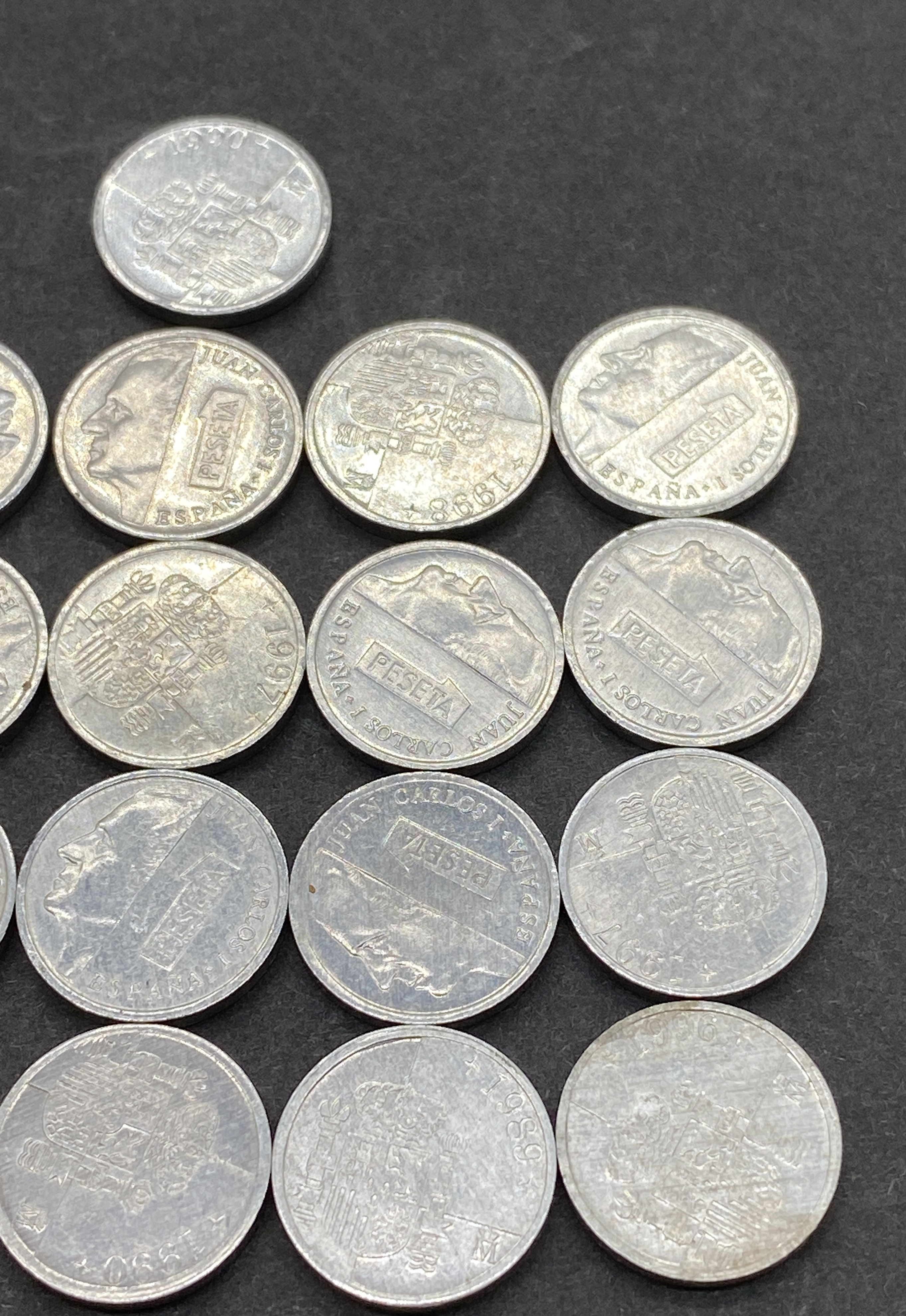 A collection of various Spanish peseta coins.